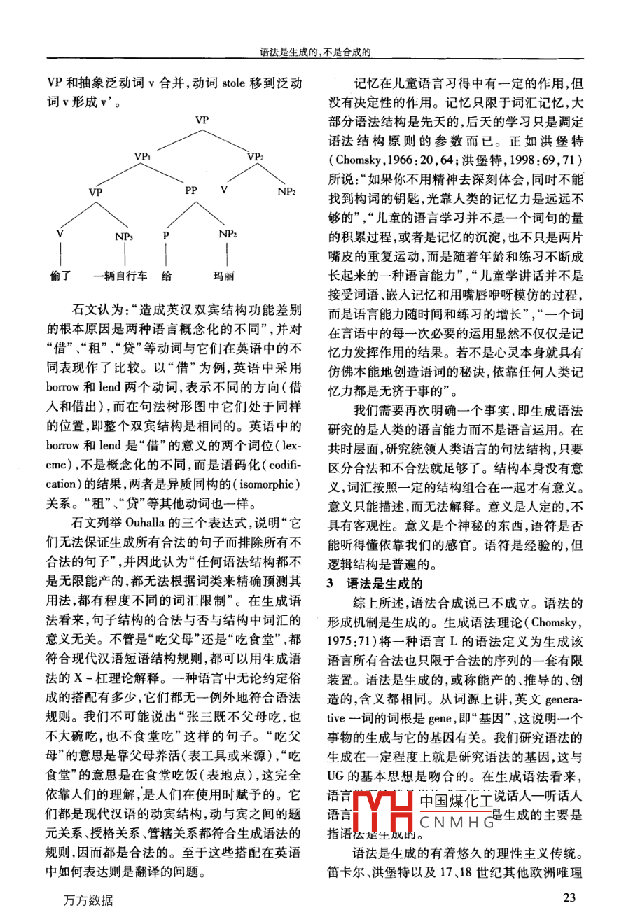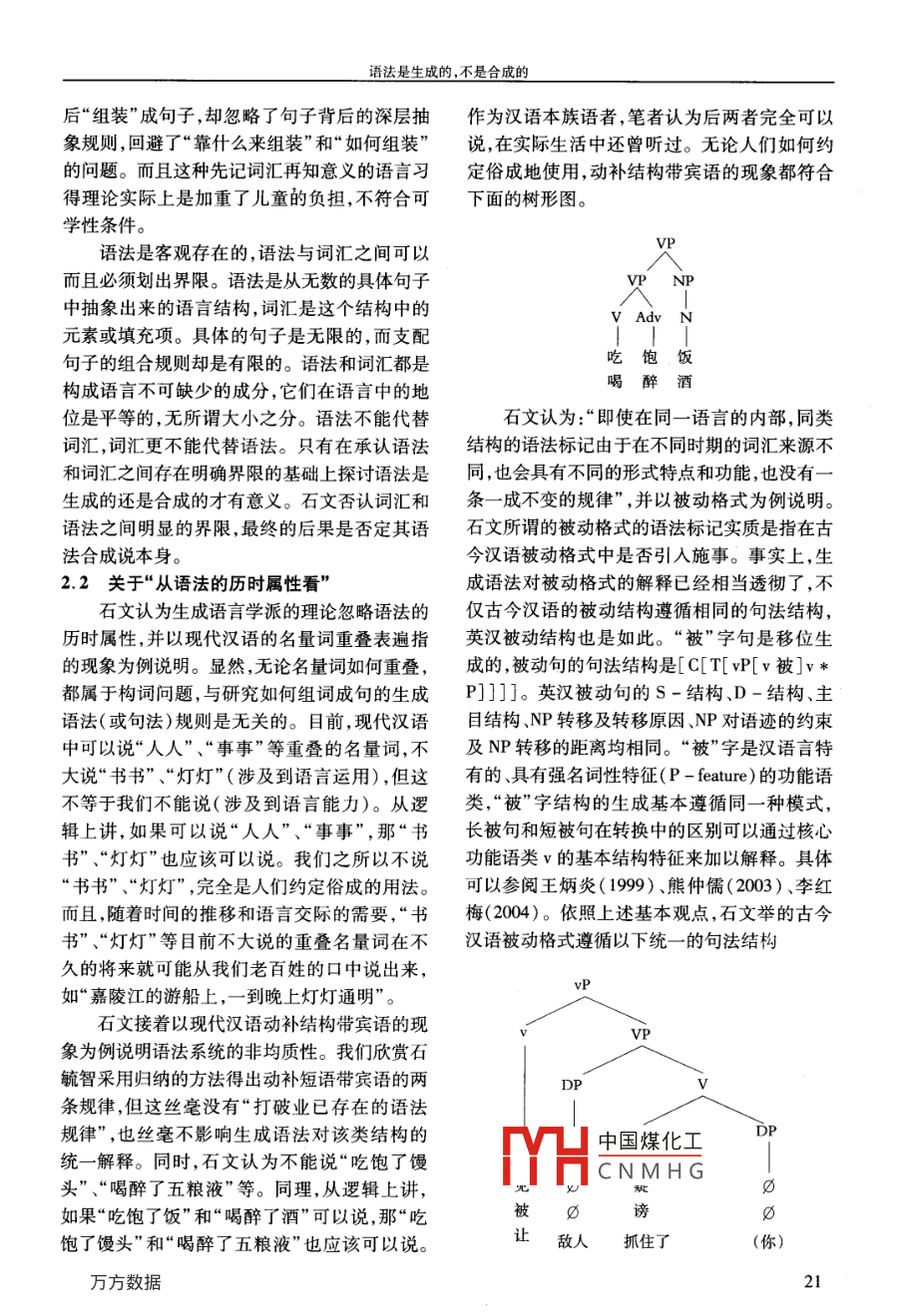 2008年1月天津外國語學(xué)院學(xué)報第15卷第1期.Jan. 2008Joumal of Tianjin Foreign Studies UniversityVo1.15 No. 1語法是生成的,不是合成的王強(重慶郵電大學(xué)外國語學(xué)院,重慶400065)摘要:語法合成說的 致命缺陷在于,它認(rèn)為詞匯和語法之間沒有明顯的界限,從而否定語法的獨立存在及其在句子生成過程中的作用,而這與其認(rèn)為語法獨立存在的預(yù)設(shè)相矛盾。以邏輯和語言事實為根據(jù),對語法合成說進(jìn)行證偽,證明兒童語言習(xí)得的階段性特征、語法演變、語法標(biāo)記的差異、雙賓結(jié)構(gòu)中動詞的方向性等問題均不構(gòu)成對生成語法的任何挑戰(zhàn)。語法總體上是一個離散的、遞歸的、層級的系統(tǒng),因而必然是生成的。兒童句法獲得的特點為語法生成說提供了進(jìn)一步的佐證。關(guān)鍵詞:語法;生成;合成;離散的、遞歸的、層級的系統(tǒng);兒童句法獲得Abstract:This article points out that the deadly defect of the proposal of“grammar is integrative"lies inthe fact that it blurs the distinction between lexicon and grammar , therefore,, in turm denies the independ-ent existence of grammar and its role in the generation of sentences , contradicting its presupposition thatgrammar exists independently. The article attempts to falsify the proposal of “grammar is integrativethrough logic and empirical evidence and verify that the phase features of children ' s first language acqui-sition , grammatical changes , differences of grammatical marks across languages and directionality of verbsin double object constructions pose no challenge at all to generative grammar. It holds that grammnar is adiscrete , recursive and hierarchical system in general , hence must be generative. And the features of chil-dren’s acquisition of syntax provide further evidence.Key words: grammar; generation ; integration ; discrete , recursive and hierarchical system ; children's ac-quisition of syntax中圖分類號:H314文獻(xiàn)標(biāo)識碼:A 文 章編號:1008 - 65x(2008)01 -0019 -081引言符號單位。語法結(jié)構(gòu)是單層的,其符號結(jié)構(gòu)直石毓智的《語法是“生成的”還是“合成接對應(yīng)于外在世界的事理結(jié)構(gòu);(2)生成語言的"?》(2006)從兒童語言習(xí)得、語法的歷時屬學(xué)忽略語法的歷時屬性,不能推出過去的語法性和共時屬性三個方面試圖彌補Langacker認(rèn)現(xiàn)象,也不能解釋同類結(jié)構(gòu)在不同時期的語法知語言學(xué)的缺憾,回答“一個人何以擁有理解標(biāo)記現(xiàn)象;(3)不同語言的概念結(jié)構(gòu)差別導(dǎo)致和說出自己母語中無限新句子的能力”這一問語法結(jié)構(gòu)的本質(zhì)差別,任何語法結(jié)構(gòu)都有程度題。其主要觀點為:(1)兒童的單詞語階段反不同的詞匯限制。合乎語法的句子不能靠簡單映詞匯和語法不可分,雙詞語階段的特征表明的規(guī)中國煤化工的組合限制,才能兒童首先習(xí)得詞,再把詞臨時“組裝”成更大的正確YHCNMHG成的。本文以邏收稿日期:2007-05 -08作者簡介:王強( 1979-) ,男,講師,研究方向:生成語法9天津外國語學(xué)院學(xué)報2008年第1期輯和語言事實為根據(jù),通過對語法合成說的討的問題上違反了邏輯同一律(既為A又為非論,試圖證明兒童語言習(xí)得的階段性特征、語法A) ,這是石文語法合成說的致命缺陷。演變、語法標(biāo)記的差異、雙賓結(jié)構(gòu)中動詞的方向石文認(rèn)為:“兒童在雙詞語階段表現(xiàn)出了性等問題均不構(gòu)成對生成語法的任何挑戰(zhàn),并高度的一致性,爾后就開始逐漸分化,掌握越來在證偽語法合成說的基礎(chǔ)上論述語法生成說的越多的自己母語的語法特點?!边@正是生成語理論淵源及其理據(jù)。法的觀點,兒童在雙詞語階段表現(xiàn)出的高度一2語法不是合 成的致性正說明UG的存在。石文在不經(jīng)意間用另2.1關(guān)于“來 自兒童語言習(xí)得的啟示"- -種表達(dá)方式說明了試圖反對的生成語法認(rèn)為石文認(rèn)為:“兒童的單詞語跟成人語言中UG必然存在的觀點,而這與石毓智(2005)否的單個詞匯的性質(zhì)很不一樣,往往包含豐富的定UG存在的觀點相矛盾,石文再次違反了邏信息,具有一個句子的作用”,并因此得出“詞輯同一律?!皟和挥姓莆樟艘欢康脑~匯之匯和語法混沌不分”的結(jié)論。這顯然是以偏概后,明白詞匯的所指對象,才能把它們組裝成更全的。如果兒童的單詞語階段能夠得出這樣的大的語言單位一-語法結(jié)構(gòu)?!?我們反對這種結(jié)論,那與其性質(zhì)不同的成人語言是否也能得觀點。首先,靠什么來“組裝”?如何“組裝”?出同樣的結(jié)論呢?回答是否定的。兒童雙詞語如果不靠天賦的語法規(guī)則,能組裝起來嗎?第階段的詞匯和語法也是混沌不分的嗎?回答也二,語法結(jié)構(gòu)并不是比詞匯更大的語言單位。是否定的,因為如果也不分的話,石文舉的那些語言單位包括詞素、詞、句子等單位。如果詞匯例子,如“媽媽吻”、“坐椅子”等不都包含著主和語法像石文所說的混沌不分,作為語言單位,謂結(jié)構(gòu)和動賓結(jié)構(gòu)的語法關(guān)系嗎?詞匯和語法之間就無所謂大小之分。的確,兒童單詞語階段只會說單個的詞語,“語法結(jié)構(gòu)是單層的,其符號結(jié)構(gòu)直接對應(yīng)盡管如此,我們?nèi)圆荒苷J(rèn)為此時不存在語法,也于外在世界的事理結(jié)構(gòu)?!闭Z言是單層或單向的不能說