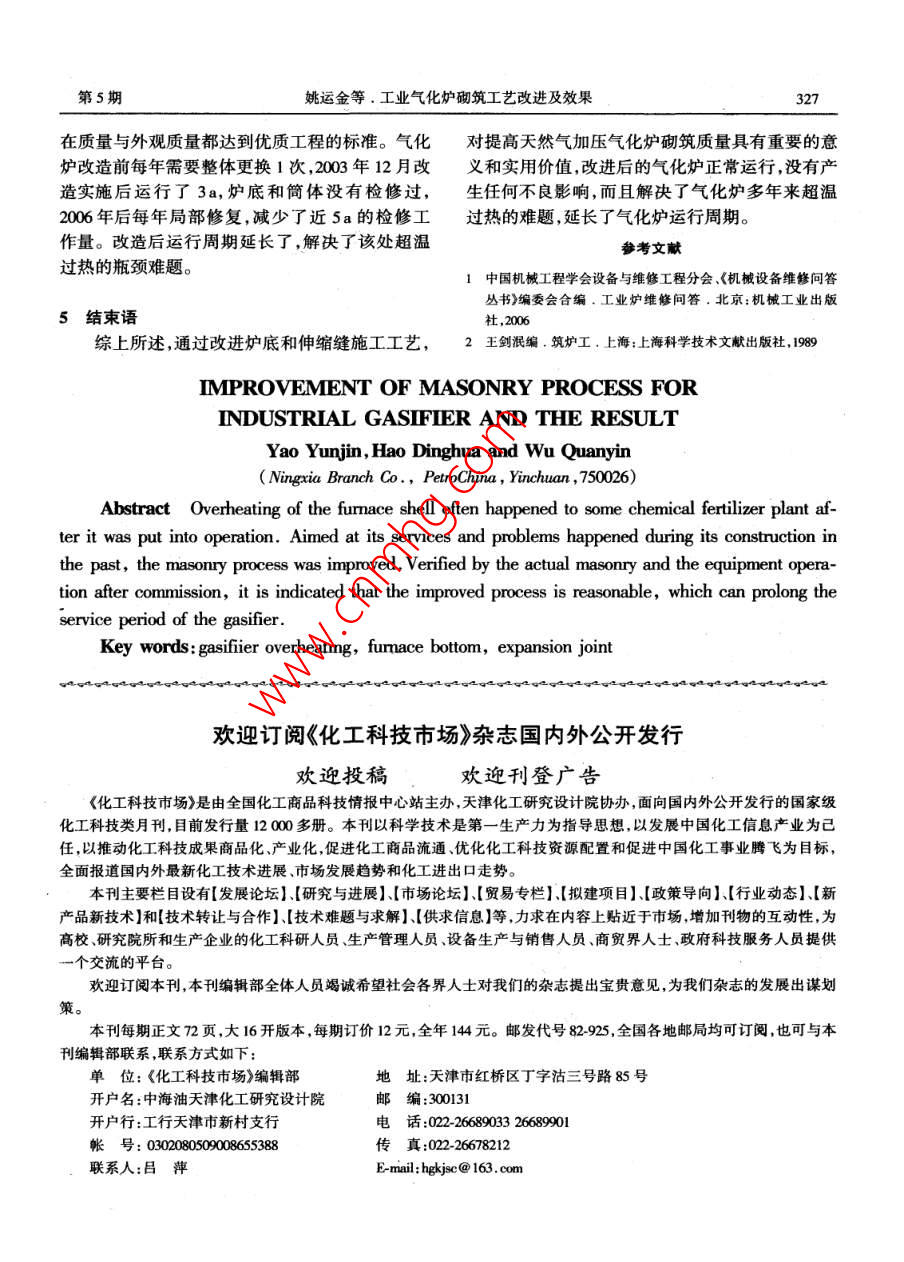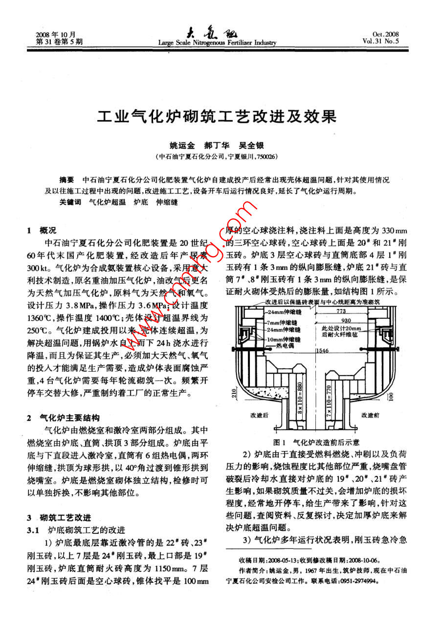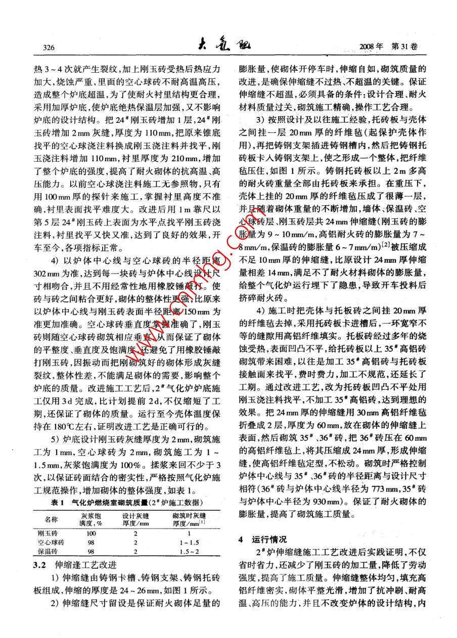 2008年10月大氛限Oct.2008第31卷第5期Lange Scale Nitrogenous Fertilizer IndustryVol.31 No.5工業(yè)氣化爐砌筑工藝改進(jìn)及效果姚運(yùn)金郝丁華吳全銀(中石油寧夏石化分公間,寧夏銀川,750026)摘要中石油寧夏石化分公司化肥裝置氣化爐自建成投產(chǎn)后經(jīng)常出現(xiàn)殼體超溫問題,針對其使用情況及以往施工過程中出現(xiàn)的問題,改進(jìn)施工工藝,設(shè)備開車后運(yùn)行情況良好,延長了氣化爐運(yùn)行周期。關(guān)鍵詞氣化爐超溫 爐底伸縮縫1概況厚的空心球澆注料,澆注料上面是高度為330mm中石油寧夏石化分公司化肥裝置是20世紀(jì)的三環(huán)空心球磚,空心球磚上面是20*和21#*剛60年代末國產(chǎn)化肥裝置,經(jīng)改造后年產(chǎn)尿素玉磚。爐底3層空心球磚與直筒底部4層1#剛300kt。氣化爐為合成氨裝置核心設(shè)備,采用意大玉磚有1條3mm的縱向膨脹縫,爐底21"磚與直利技術(shù)制造,原名重油加壓氣化爐,油改氣后更名簡7#、8#剛玉磚有1條3 mm的縱向膨脹縫,是保為天然氣加壓氣化爐,原料氣為天然氣和氧氣。證耐火砌體 受熱后的膨脹量,如結(jié)構(gòu)圖1所示。設(shè)計(jì)壓力3.8MPa, 操作壓力3.6MPa;設(shè)計(jì)溫度改進(jìn)后以保溫磚表再與中心線距離為準(zhǔn)南筑- 24mm伸縮縫773 .1360C,操作溫度1400C;殼體設(shè)計(jì)超溫界線為-7mm伸編縫930250C。氣化爐建成投用以來,殼體連續(xù)超溫,為24mm伸縮縫此處設(shè)計(jì)20mm-10mm伸縮縫后耐火纖維氈解決超溫問題,用鍋爐水自上而下24h澆水進(jìn)行,熬電偶1546降溫,而且為保證其生產(chǎn),必須加大天然氣、氧氣的投人才能滿足生產(chǎn)需要,造成爐體表面腐蝕嚴(yán)重,4臺氣化爐需要每年輪流砌筑一次。頻繁開停車交替大修,嚴(yán)重制約著工廠的正常生產(chǎn)。2氣化爐主要結(jié)構(gòu)改避后改遣前氣化爐由燃燒室和激冷室兩部分組成。其中燃燒室由爐底直簡、拱頂3部分組成。爐底由平圖1氣化爐改造前后示意底與下直段進(jìn)人激冷室,直簡有6組熱電偶,兩環(huán)2)爐底由于直接受燃料燃燒、沖刷以及負(fù)荷伸縮縫,拱頂為球形拱,以40°角過渡到錐形拱到壓力的影響,燒蝕程度比其他部位嚴(yán)重,燒嘴盤管燒嘴室。爐底是燃燒室砌體獨(dú)立結(jié)構(gòu),檢修時可破裂后冷卻水直接對爐底的19#、20#、21#磚產(chǎn)以單獨(dú)拆換,不影響其他部位。生影響,如果砌筑質(zhì)量不過關(guān),會增加爐底的損壞程度,經(jīng)常地開停車,給生產(chǎn)帶來了影響,針對這3. 砌筑工藝改進(jìn)些問題,查閱資料、反復(fù)探討,決定加厚爐底來解3.1爐底砌筑工藝的改進(jìn)決爐底超溫問題。1)爐底最底層靠近激冷管的是22#磚、23*3)氣化爐多年運(yùn)行狀況表明,剛玉磚急冷急剛玉磚,以上7層是24*剛玉磚,最上口部是19*收稿日期:2008-05-13;收到修改稿日期:2008 10-06。剛玉磚,爐底直簡耐火磚高度為1150mm。7層作者簡介:姚運(yùn)金,男,1967 年出生,筑爐技師.現(xiàn)在中石油24#剛玉磚后面是空心球磚,錐體找平是100mm寧夏石化公 司安檢公司工作。聯(lián)系電話:91-297993262008年第31卷熱3~4次就產(chǎn)生裂紋,加上剛玉磚受熱后熱應(yīng)力膨脹量,使砌體開停車時,伸縮自如,砌筑質(zhì)量的加大,燒蝕嚴(yán)重,里面的空心球磚不耐高溫高壓,改進(jìn),是確保伸縮縫不過熱、不超溫的關(guān)鍵。保證造成整個爐底超溫,為了使耐火襯里結(jié)構(gòu)更合理,伸縮縫不超溫,必須具備的條件:設(shè)計(jì)合理、耐火采用加厚爐底,使?fàn)t底絕熱保溫層加強(qiáng),又不影響材料質(zhì)量過關(guān),砌筑施工精確,操作工藝合理。爐底的設(shè)計(jì)結(jié)構(gòu)。把24*剛玉磚增加1層,24"剛3)按照設(shè)計(jì)及以往施工經(jīng)驗(yàn),托磚板與殼體玉磚增加2mm灰縫,厚度為110mm,把原來錐底之間掛一層20mm厚的纖維氈(起保護(hù)殼體作找平的空心球澆注料換成剛玉澆注料并找平,剛用),再把鑄鋼支架插進(jìn)鑄鋼槽內(nèi),然后把鑄鋼托玉澆注料增加110mm,襯里厚度為210mm,增加磚板卡人鑄鋼支架上,使之形成-一個整體,把纖維了整個爐底的強(qiáng)度,提高了耐火砌體的抗高溫、高氈壓住,如圖1所示。鑄鋼托磚板以上2m多高壓能力。以前空心球澆注料施工無參照物,只有的耐火磚重量全部由托磚板來承擔(dān)。在重壓下,用100mm厚的探針來施工,掌握襯里高度不準(zhǔn)殼體上掛的20mm厚的纖維氈壓成了很薄- - 層,確襯里表面找平難度大。改進(jìn)后用1m靠尺以并且隨著砌體重量的不斷增加,墻體:保溫磚.空第5層24#剛玉磚上表面為水平點(diǎn)找平剛玉磚澆心球磚層、剛玉磚層共24 mm伸縮縫(剛玉磚的膨注料,襯里找平又快又準(zhǔn),達(dá)到了良好的效果,開脹量為9 ~ 10mm/m,高鋁耐火磚的膨脹量為7~車至今,各項(xiàng)指標(biāo)正常。8mm/m,保溫磚的膨脹量6~7mm/m)[2]被壓縮成4)以爐體中心線與空心球磚的半徑距離不足10mm厚的伸縮縫,比原設(shè)計(jì)24mm厚伸縮302 mm為準(zhǔn),達(dá)到每一塊磚 與爐體中心線設(shè)計(jì)尺量相差14mm,滿足不了耐火材料砌體的膨脹量,寸相吻合,并且不用經(jīng)常性地用橡膠錘敲打。使給整個氣化爐運(yùn)行埋下了隱患,導(dǎo)致開車投料后磚與磚之間粘合更好,砌體的整體性更強(qiáng),比原來擠碎耐火磚。以爐體中心線與剛玉磚表面半徑距離150mm為4)施工時把殼體與托板磚之間掛20mm厚準(zhǔn)更加準(zhǔn)確。