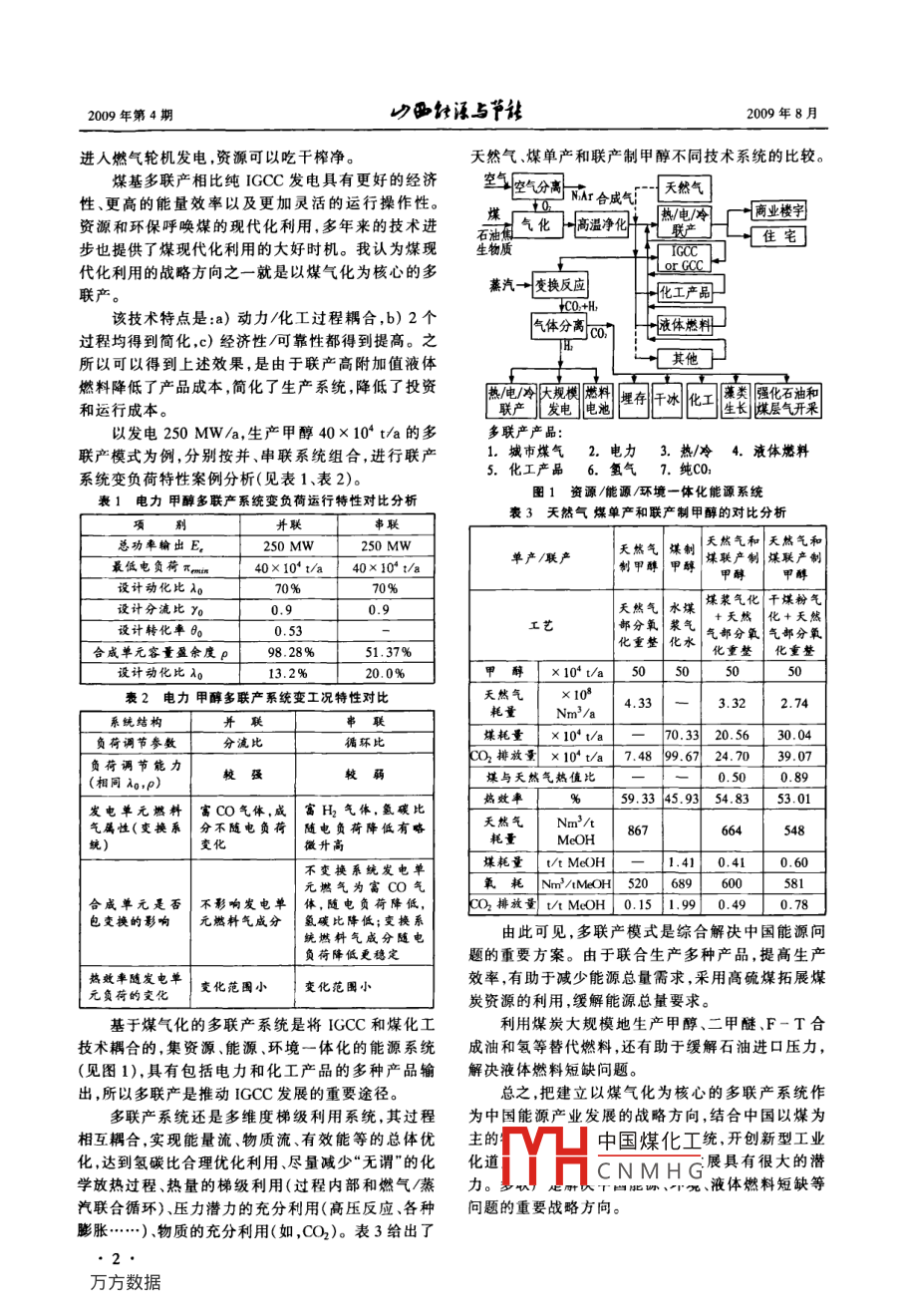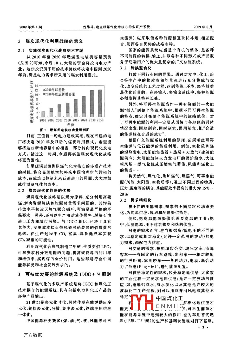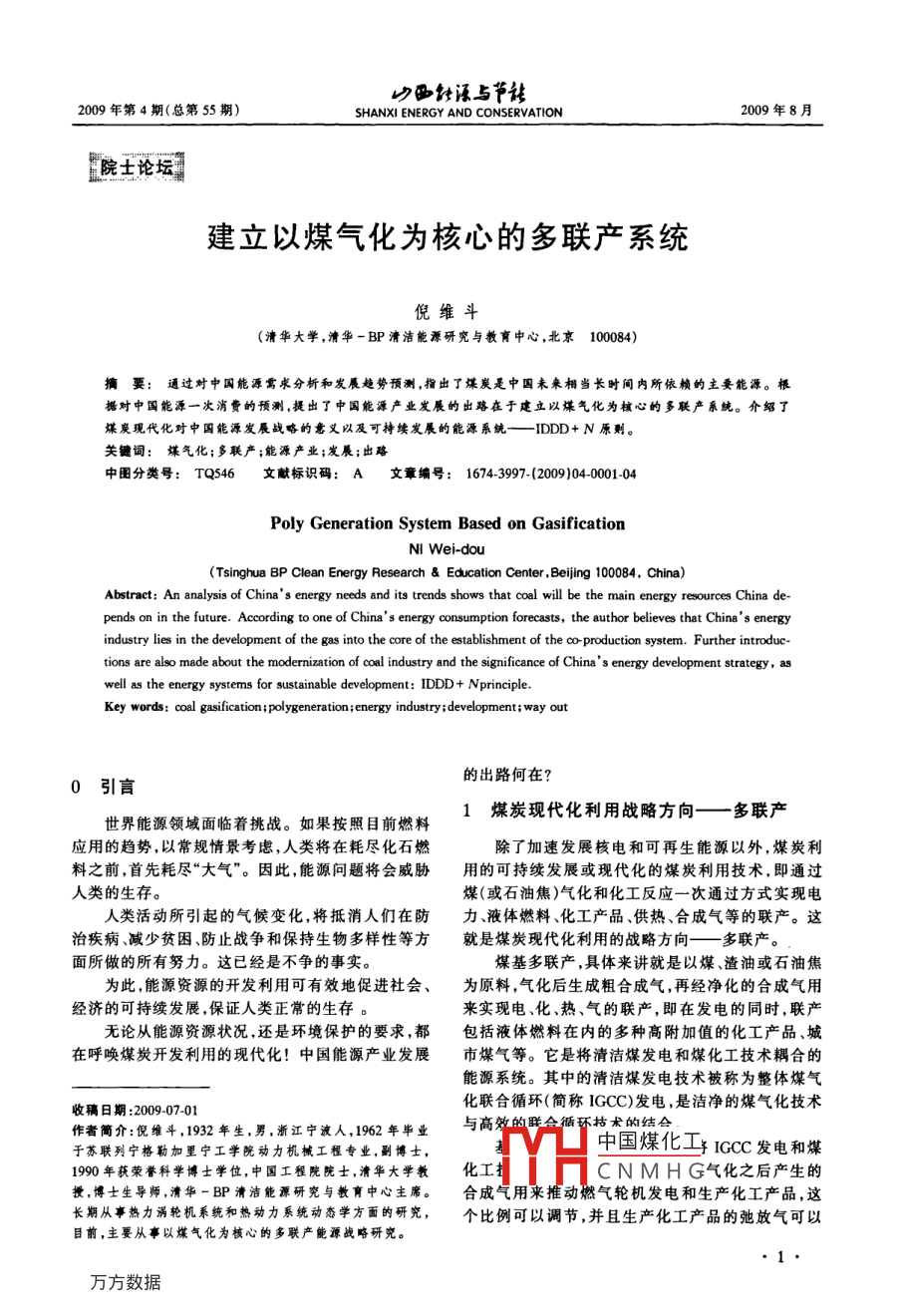 山西能源與節(jié)站2009年第4期(總第55期)SHANXI ENERGY AND CONSERVATION2009年8月.院士論壇1建立以煤氣化為核心的多聯(lián)產(chǎn)系統(tǒng)倪維斗(清華大學(xué),清華-BP清潔能源研究與教育中心,北京100084)摘要:通過(guò)對(duì)中國(guó)能源需求分析和發(fā)展趨勢(shì)預(yù)測(cè),指出了煤炭是中國(guó)未來(lái)相當(dāng)長(zhǎng)時(shí)間內(nèi)所依賴的主要能源。根據(jù)對(duì)中國(guó)能源- -次消費(fèi)的預(yù)測(cè),提出了中國(guó)能源產(chǎn)業(yè)發(fā)展的出路在于建立以煤氣化為核心的多聯(lián)產(chǎn)系統(tǒng)。介紹了煤炭現(xiàn)代化對(duì)中國(guó)能源發(fā)展戰(zhàn)略的意義以及可持續(xù)發(fā)展的能源系統(tǒng)一IDDD+ N原則。關(guān)鍵詞:煤氣化;多聯(lián)產(chǎn);能源產(chǎn)業(yè);發(fā)展;出路中圈分類號(hào): TQ546文獻(xiàn)標(biāo)識(shí)碼: A文章編號(hào): 1674-3997- (200)04-0001-04Poly Generation System Based on GasificationNI Wei-dou(Tsinghua BP Clean Energy Research & Education Center , Beijing 100084, China)Abstract: An analysis of China ' s energy needs and its trends shows that coal will be the main energy resources China de-pends on in the future. According to one of China' s energy consumption forecasts, the author believes that China' s energyindustry lies in the development of the gas into the core of the establishment of the∞production system. Further introduc-tions are also made about the modernization of coal industry and the significance of China's energy development strategy, aswell as the energy systems for sustainable development: IDDD + Nprinciple.Key words: coal gasification;polygeneration;energy industry;development;way out的出路何在?0引言世界能源領(lǐng)域面臨著挑戰(zhàn)。如果按照目前燃料1煤炭現(xiàn)代化利用戰(zhàn)略方向一 多聯(lián)產(chǎn)應(yīng)用的趨勢(shì),以常規(guī)情景考慮,人類將在耗盡化石燃除了加速發(fā)展核電和可再生能源以外,煤炭利料之前,首先耗盡“大氣”。因此,能源問(wèn)題將會(huì)威脅用的可持續(xù)發(fā)展或現(xiàn)代化的煤炭利用技術(shù),即通過(guò).人類的生存。煤(或石油焦)氣化和化工反應(yīng)一次通過(guò)方式實(shí)現(xiàn)電人類活動(dòng)所引起的氣候變化,將抵消人們?cè)诜懒Α⒁后w燃料、化工產(chǎn)品供熱、合成氣等的聯(lián)產(chǎn)。這治疾病、減少貧困、防止戰(zhàn)爭(zhēng)和保持生物多樣性等方就是煤炭現(xiàn)代化利用的戰(zhàn)略方向一多 聯(lián)產(chǎn)。面所做的所有努力。這已經(jīng)是不爭(zhēng)的事實(shí)。煤基多聯(lián)產(chǎn),具體來(lái)講就是以煤、渣油或石油焦為此,能源資源的開(kāi)發(fā)利用可有效地促進(jìn)社會(huì)、為原料,氣化后生成粗合成氣,再經(jīng)凈化的合成氣用經(jīng)濟(jì)的可持續(xù)發(fā)展,保證人類正常的生存。來(lái)實(shí)現(xiàn)電、化、熱、氣的聯(lián)產(chǎn),即在發(fā)電的同時(shí),聯(lián)產(chǎn)無(wú)論從能源資源狀況,還是環(huán)境保護(hù)的要求,都包括液體燃料在內(nèi)的多種高附加值的化工產(chǎn)品、城在呼喚煤炭開(kāi)發(fā)利用的現(xiàn)代化!中國(guó)能源產(chǎn)業(yè)發(fā)展市煤氣等。它是將清潔煤發(fā)電和煤化工技術(shù)耦合的能源系統(tǒng)。其中的清潔煤發(fā)電技術(shù)被稱為整體煤氣收稿日期:009.07-0化聯(lián)合循環(huán)(簡(jiǎn)稱IGCC)發(fā)電,是潔凈的煤氣化技術(shù)作者簡(jiǎn)介:倪維斗,1932年生,男,浙江寧波人,1962年畢業(yè)與高效的聯(lián)合循環(huán)枯術(shù)的結(jié)會(huì)于蘇聯(lián)列寧格勒加里寧工學(xué)院動(dòng)力機(jī)械工程專業(yè),副博士,中國(guó)煤化工Iccc發(fā)電和煤1990年獲榮譽(yù)科學(xué)博士學(xué)位,中國(guó)工程院院士,清華大學(xué)教化工CN M H G氣化之后產(chǎn)生的授,博士生導(dǎo)師,清華一BP清潔能源研究與教育中心主席。合成 氣用來(lái)推動(dòng)燃?xì)廨啓C(jī)發(fā)電和生產(chǎn)化工產(chǎn)品,這長(zhǎng)期從事熱力渦輪機(jī)系統(tǒng)和熱動(dòng)力系統(tǒng)動(dòng)態(tài)學(xué)方面的研究,個(gè)比例可以調(diào)節(jié),并且生產(chǎn)化工產(chǎn)品的弛放氣可以目前,主要從事以煤氣化為核心的多聯(lián)產(chǎn)能源戰(zhàn)略研究。2009年第4期山西能源與節(jié)能2009年8月進(jìn)人燃?xì)廨啓C(jī)發(fā)電,資源可以吃干榨凈。天然氣、煤?jiǎn)萎a(chǎn)和聯(lián)產(chǎn)制甲醇不同技術(shù)系統(tǒng)的比較。煤基多聯(lián)產(chǎn)相比純IGCC發(fā)電具有更好的經(jīng)濟(jì)年空氣分寓,成r合成氣[{天然氣性、更高的能量效率以及更加靈活的運(yùn)行操作性。熱/電/冷商業(yè)樓字資源和環(huán)保呼喚煤的現(xiàn)代化利用,多年來(lái)的技術(shù)進(jìn)動(dòng)在氣化了-高溫凈化十一七聯(lián)產(chǎn)[住宅石油焦步也提供了煤現(xiàn)代化利用的大好時(shí)機(jī)。我認(rèn)為煤現(xiàn)生物質(zhì)TCCC代化利用的戰(zhàn)略方向之一-就是以煤氣化為核心的多蒸汽→變換反應(yīng)+化工產(chǎn)品一L or CCC聯(lián)產(chǎn)。LCO:+H,該技術(shù)特點(diǎn)是:a)動(dòng)力/化工過(guò)程耦合,b) 2個(gè)氣體分離00;7過(guò)程均得到簡(jiǎn)化,c)經(jīng)濟(jì)性/可靠性都得到提高。之TH所以可以得到上述效果,是由于聯(lián)產(chǎn)高附加值液體燃料降低了產(chǎn)品成本,簡(jiǎn)化了生