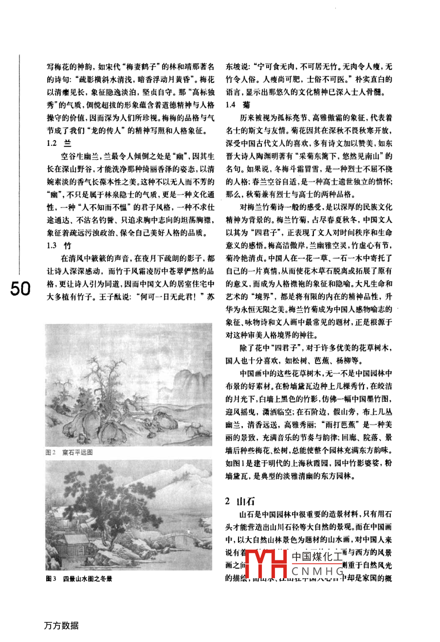 上海秋霞園中國(guó)畫(huà)與中國(guó)園林的關(guān)系張招旺1,李強(qiáng)華2,賴(lài)尚海3(1廣東省深圳市蛇口育才二中,518067;2廣東省深圳市四季青園林花卉有限公司518026;3廣東省深圳市地景園林綠化有限公司,51802949摘要:中國(guó)畫(huà)與中國(guó)園林都是中國(guó)傳統(tǒng)藝術(shù),兩者之間有著緊密的聯(lián)系。中國(guó)畫(huà)是平面的“園林”,采用毛筆和墨汁,在中國(guó)特色的宣紙或絹上繪制平面藝術(shù)品;中國(guó)園林則是釆用山石、水體、植物、建筑營(yíng)造成的立體的“畫(huà)”。這兩種藝術(shù)追求的意境是一致的,都體現(xiàn)了中國(guó)人謙虛內(nèi)斂的品性,崇尚自然追求個(gè)性和自由的精神。關(guān)鍵詞:中國(guó)畫(huà);中國(guó)園林;關(guān)系中華民族是世界上歷史最悠久著千絲萬(wàn)縷的關(guān)系。種寂寞中的自足,一種“凌寒獨(dú)自的民族之一,在悠遠(yuǎn)漫長(zhǎng)的歷史長(zhǎng)開(kāi)”的孤傲。它不屑與凡桃俗李在河中,中國(guó)人奮勇直前生生不息,1花草樹(shù)木春光中爭(zhēng)艷,而是在天寒地凍、萬(wàn)用勤勞的雙手、聰慧的大腦推動(dòng)著國(guó)人歷來(lái)愛(ài)種花,對(duì)花草樹(shù)木不禁寒風(fēng)時(shí),獨(dú)自傲然挺立,在世界文明不斷向前發(fā)展。中國(guó)人創(chuàng)木有著特殊的感情。其中花中四大雪中開(kāi)出繁花滿樹(shù),幽幽冷香,造的藝術(shù)在世界上獨(dú)樹(shù)一幟有著君子更是受到歷朝歷代文人雅士隨風(fēng)襲人。從梅花的這一品性中,獨(dú)特的東方魅力,而中國(guó)畫(huà)和中國(guó)的喜愛(ài)。了白己的哩想人格模式,園林,無(wú)疑又是東方藝術(shù)園中兩朵1.1梅中國(guó)煤化不求識(shí)賞瑰麗的奇葩。中國(guó)畫(huà)與中國(guó)園林有梅花最令人傾倒的氣厲CNMHG用“清逸”來(lái)寫(xiě)梅花的神韻,如宋代“梅妻鶴子”的林和靖那著名東坡說(shuō):“寧可食無(wú)肉,不可居無(wú)竹。無(wú)肉令人瘦,無(wú)的詩(shī)句:“疏彰橫斜水清淺,暗香浮動(dòng)月黃昏”。梅花竹令人俗。人瘦尚可肥,士俗不可醫(yī)?!睒銓?shí)直白的以清癯見(jiàn)長(zhǎng),象征隱逸淡泊,堅(jiān)貞自守。那“高標(biāo)獨(dú)語(yǔ)言,顯示出那悠久的文化精神已深入土人骨髓秀”的氣質(zhì),倜儻超拔的形象蘊(yùn)含著道德精神與人格14菊操守的價(jià)值,因而深為人們所珍視。梅梅的品格與氣歷來(lái)被視為孤標(biāo)亮節(jié)、高雅傲霜的象征,代表著節(jié)成了我們“龍的傳人”的精神寫(xiě)照和人格象征。名士的斯文與友情。菊花因其在深秋不畏秋寒開(kāi)放,1.2深受中國(guó)古代文人的喜歡,多有詩(shī)文加以贊美,如東空谷生幽蘭,蘭最令人傾倒之處是“幽”,因其生晉大詩(shī)人陶淵明著有“采菊東籬下,悠然見(jiàn)南山”的長(zhǎng)在深山野谷,才能洗凈那種綺麗香澤的姿態(tài),以清名句。如果說(shuō),冬梅斗霜冒雪,是一種烈士不屈不撓婉素淡的香氣長(zhǎng)葆本性之美。這種不以無(wú)人而不芳的的人格,春蘭空谷自適,是一種高士遺世獨(dú)立的情懷幽”,不只是屬于林泉隱士的氣質(zhì),更是一種文化通那么,秋菊兼有烈士與高士的兩種品格。性,一種“人不知而不慍”的君子風(fēng)格,一種不求仕對(duì)梅蘭竹菊詩(shī)一般的感受,是以深厚的民族文化途通達(dá)、不沾名釣譽(yù)、只追求胸中志向的坦蕩胸襟,精神為背景的。梅蘭竹菊,占盡春夏秋冬,中國(guó)文人象征著疏遠(yuǎn)污濁政治、保全自己美好人格的品質(zhì)。以其為“四君子”,正表現(xiàn)了文人對(duì)時(shí)間秩序和生命13竹意義的感悟。梅高潔傲岸,蘭幽雅空靈,竹虛心有節(jié),在清風(fēng)中簌簌的聲音,在夜月下疏朗的影子,都菊冷艷清貞。中國(guó)人在一花一草、一石一木中寄托了讓詩(shī)人深深感動(dòng),而竹于風(fēng)霜凌厲中蒼翠儼然的品自己的一片真情,從而使花木草石脫離或拓展了原有50格更讓詩(shī)人引為同道,圖面中國(guó)文的屠室宅中的意,而成為人格燃袍的象征和險(xiǎn)喻大凡生命華為永恒無(wú)限之美。梅蘭竹菊成為中國(guó)人感物喻志的象征、詠物詩(shī)和文人畫(huà)中最常見(jiàn)的題材,正是根源于對(duì)這種審美人格境界的神往除了花中“四君子”,對(duì)于許多優(yōu)美的花草樹(shù)木國(guó)人也十分喜歡,如松樹(shù)、芭蕉、楊柳等。中國(guó)畫(huà)中的這些花草樹(shù)木,無(wú)一不是中國(guó)園林中布景的好素材。在粉墻黛瓦邊種上幾棵秀竹,在皎潔的月光下,白墻上黑色的竹影,仿佛一幅中國(guó)墨竹迎風(fēng)搖曳,瀟灑臨空;在石階邊,假山旁,布上幾叢幽蘭,清香遠(yuǎn)送,高雅秀麗;“雨打芭蕉”是一種美麗的景致,充滿音樂(lè)的節(jié)奏與韻律;回廊、院落、景圖2窠石平遠(yuǎn)圖墻后種些梅花、松樹(shù),總能使整個(gè)園林充滿東方韻味如圖1是建于明代的上海秋霞園,園中竹影婆娑,粉墻黛瓦,是典型的淡雅清幽的東方園林。2山石山石是中國(guó)園林中很重要的造景材料,只有用石頭才能營(yíng)造出山川石徑等大自然的景觀。而在中國(guó)畫(huà)中,以大自然山林景色為題材的山水畫(huà),對(duì)中國(guó)人來(lái)說(shuō)有著中國(guó)煤化工與西方的風(fēng)景畫(huà)之CNMHG則重于自然風(fēng)光圖3四景山水圖之冬景的描繪八心日中卻是家國(guó
