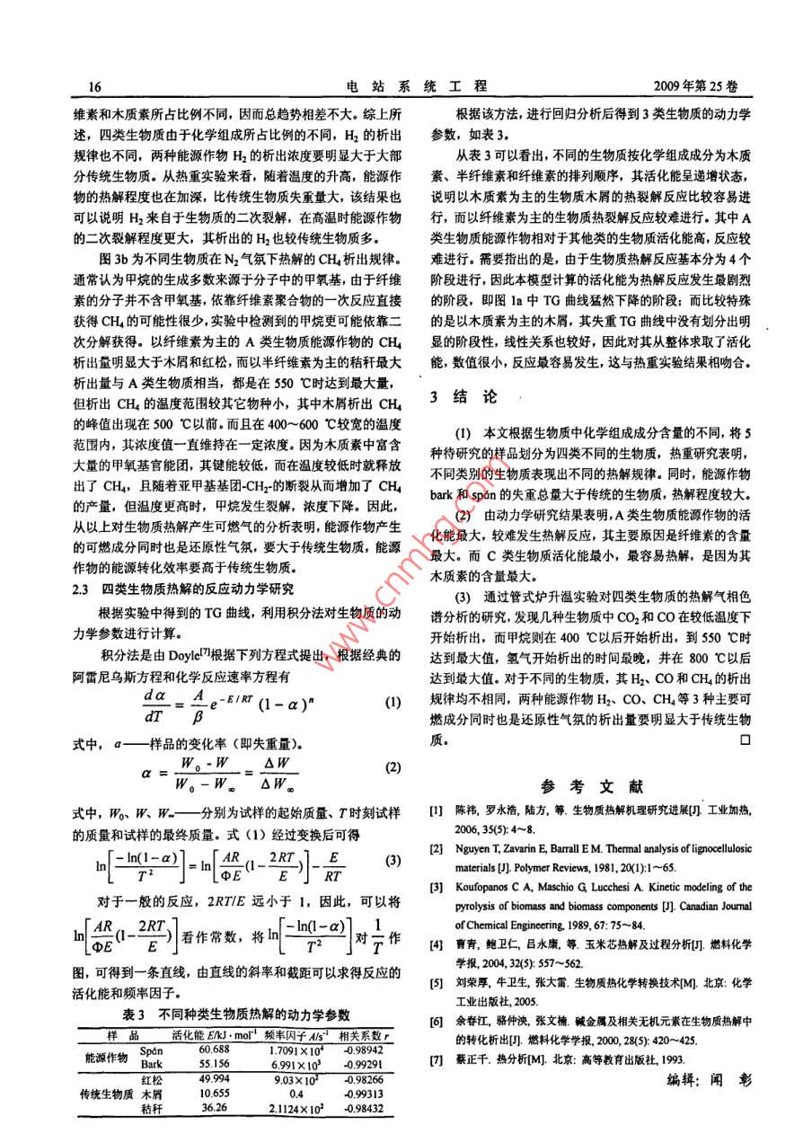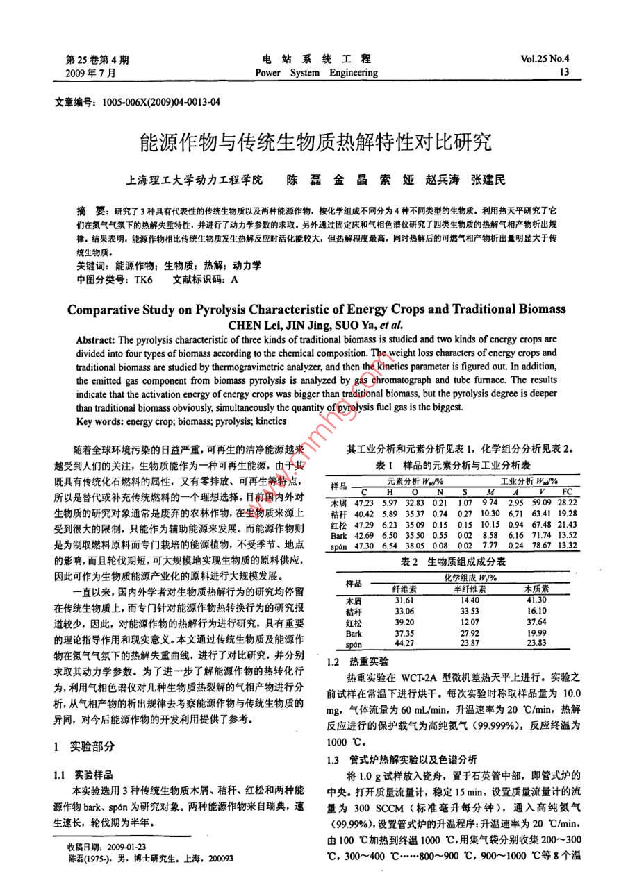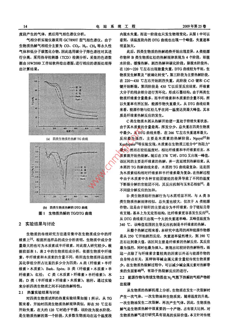 第25卷第4期電站系統(tǒng)工程Vol 25 No 42009年7月13文章編號:100500X(2009)040013-04能源作物與傳統(tǒng)生物質(zhì)熱解特性對比研究上海理工大學動力工程學院陳磊金晶索婭趙兵濤張建民摘要:研究了3種具有代表性的傳統(tǒng)生物質(zhì)以及兩種能源作物,按化學組成不同分為4種不同類型的生物質(zhì),利用熱天平研究了它們在氮氣氣氛下的熱解失重特性,并進行了動力學參數(shù)的求取.另外通過固定床和氣相色譜儀研究了四類生物質(zhì)的熱解氣相產(chǎn)物析出規(guī)律,結果表明,能源作物相比傳統(tǒng)生物質(zhì)發(fā)生熱解反應時活化能較大,但熱解程度最高,同時熱解后的可燃氣相產(chǎn)物析出量明顯大于傳統(tǒng)生物質(zhì)關鍵詞:能源作物;生物質(zhì):熱解;動力學中圖分類號:TK6文獻標識碼:AComparative Study on Pyrolysis Characteristic of Energy Crops and Traditional BiomassCHEN Lei, JIN Jing, SUO Ya, et alAbstract: The pyrolysis characteristic of three kinds of traditional biomass is studied and two kinds of energy crops aredivided into four types of biomass according to the chemical composition. The weight loss characters of energy crops andtraditional biomass are studied by thermogravimetric analyzer, and then the kinetics parameter is figured out. In addition,the emitted gas component from biomass pyrolysis is analyzed by gas chromatograph and tube furnace. The resultsindicate that the activation energy of energy crops was bigger than traditional biomass, but the pyrolysis degree is deeperthan traditional biomass obviously, simultaneously the quantity of pyrolysis fuel gas is the biggest.Key words: energy crop; biomass; pyrolysis; kinetics隨著全球環(huán)境污染的日益嚴重,可再生的潔凈能源越來其工業(yè)分析和元素分析見表1,化學組分分析見表2越受到人們的關注,生物質(zhì)能作為一種可再生能源,由于其表1樣品的元素分析與工業(yè)分析表既具有傳統(tǒng)化石燃料的屬性,又有零排放、可再生等特點元素分析Wd%工業(yè)分析W所以是替代或補充傳統(tǒng)燃料的一個理想選擇,目前國內(nèi)外對末47259732830152.9559.09生物質(zhì)的研究對象通常是廢棄的農(nóng)林作物,在生物質(zhì)來源上秸稈404258935370.74027103067163411928受到很大的限制,只能作為輔助能源來發(fā)展。而能源作物則紅松4729623350901501510509467482143Bak426965035500.550028.5861671.7413.52是為制取燃料原料而專門栽培的能源植物,不受季節(jié)、地點spn473065438050080027702478671332的影響,而且輪伐期短,可大規(guī)模地實現(xiàn)生物質(zhì)的原料供應,表2生物質(zhì)組成成分表因此可作為生物質(zhì)能源產(chǎn)業(yè)化的原料進行大規(guī)模發(fā)展。直以來,國內(nèi)外學者對生物質(zhì)熱解行為的研究均停留纖維素半纖維素1440在傳統(tǒng)生物質(zhì)上,而專門針對能源作物熱轉(zhuǎn)換行為的研究報33063353道較少,因此,對能源作物的熱解行為進行研究,具有重要紅松的理論指導作用和現(xiàn)實意義。本文通過傳統(tǒng)生物質(zhì)及能源作37352792物在氮氣氣氛下的熱解失重曲線,進行了對比研究,并分別12熱重實驗求取其動力學參數(shù)。為了進一步了解能源作物的熱轉(zhuǎn)化行熱重實驗在WCT2A型微機差熱天平上進行。實驗之為,利用氣相色譜儀對幾種生物質(zhì)熱裂解的氣相產(chǎn)物進行分前試樣在常溫下進行烘干。每次實驗時稱取樣品量為100析,從氣相產(chǎn)物的析出規(guī)律去考察能源作物與傳統(tǒng)生物質(zhì)的mg,氣體流量為60mL/mi,升溫速率為20℃/min,熱解異同,對今后能源作物的開發(fā)利用提供了參考反應進行的保護載氣為高純氮氣(99999%),溫為1實驗部分1000℃13管式爐熱解實驗以及色譜分析11實驗樣品將10g試樣放入瓷舟,置于石英管中部,即管式爐的本實驗選用3種傳統(tǒng)生物質(zhì)木屑、秸稈、紅松和兩種能中央。打開質(zhì)量流量計,穩(wěn)定5min。設置質(zhì)量流量計的流源作物bak、spon為研究對象。兩種能源作物來自瑞典,速量為300SccM(標準毫升每分鐘),通入高純氮氣生速長,輪伐期為半年。(9999%,設置管式爐的升溫程序:升溫速率為20℃min,收稿日期:200901-23由100℃加熱到終溫1000℃用集氣袋分別收集200~300陳磊(1975-)男,博士研究生,上海,200093℃,300~400℃……800~900℃,900~1000℃等8個溫電站系統(tǒng)工程2009年第25卷度段產(chǎn)生的氣體,然后用氣相色譜儀分析。內(nèi)脫水失重,而這一階段也只發(fā)生物理變化。從圖1中可以氣相分析實驗儀器采用GC7890T型氣相色譜儀。由于看到,該溫度段內(nèi)的DTG曲線也出現(xiàn)一個峰值,失重速率生物質(zhì)熱解氣相組分主要為co、CO2、H2、CH等永久性明顯加大氣體和低分子碳氫化合物,因此選用碳分子篩色譜柱對其進此后,四類生物質(zhì)的熱解趨勢開始出現(xiàn)差異,A類能源行分離,采用熱導檢測器(TCD)檢測分析。采集的色譜數(shù)作物和B類生物質(zhì)紅松的熱解規(guī)律表現(xiàn)為4個階段,即脫據(jù)由HW2000工作站軟件繪出譜圖,進行相應的譜圖處理得水階段、緩慢熱解、劇烈熱解和碳化階段。除脫水階段外,出計算結果。在120~220℃左右出現(xiàn)微量失重,DTG曲線較為平坦,生物質(zhì)發(fā)生解聚及“玻璃化轉(zhuǎn)變”第三階段為主要熱解階段,在220~430℃左右開始劇烈失重,此階段cO鍵和cC鍵開始斷裂。第四階段是430℃以后至反應結束,纖維素大分子的殘余部分進行芳環(huán)化,形成石墨結構。由于兩類生物質(zhì
