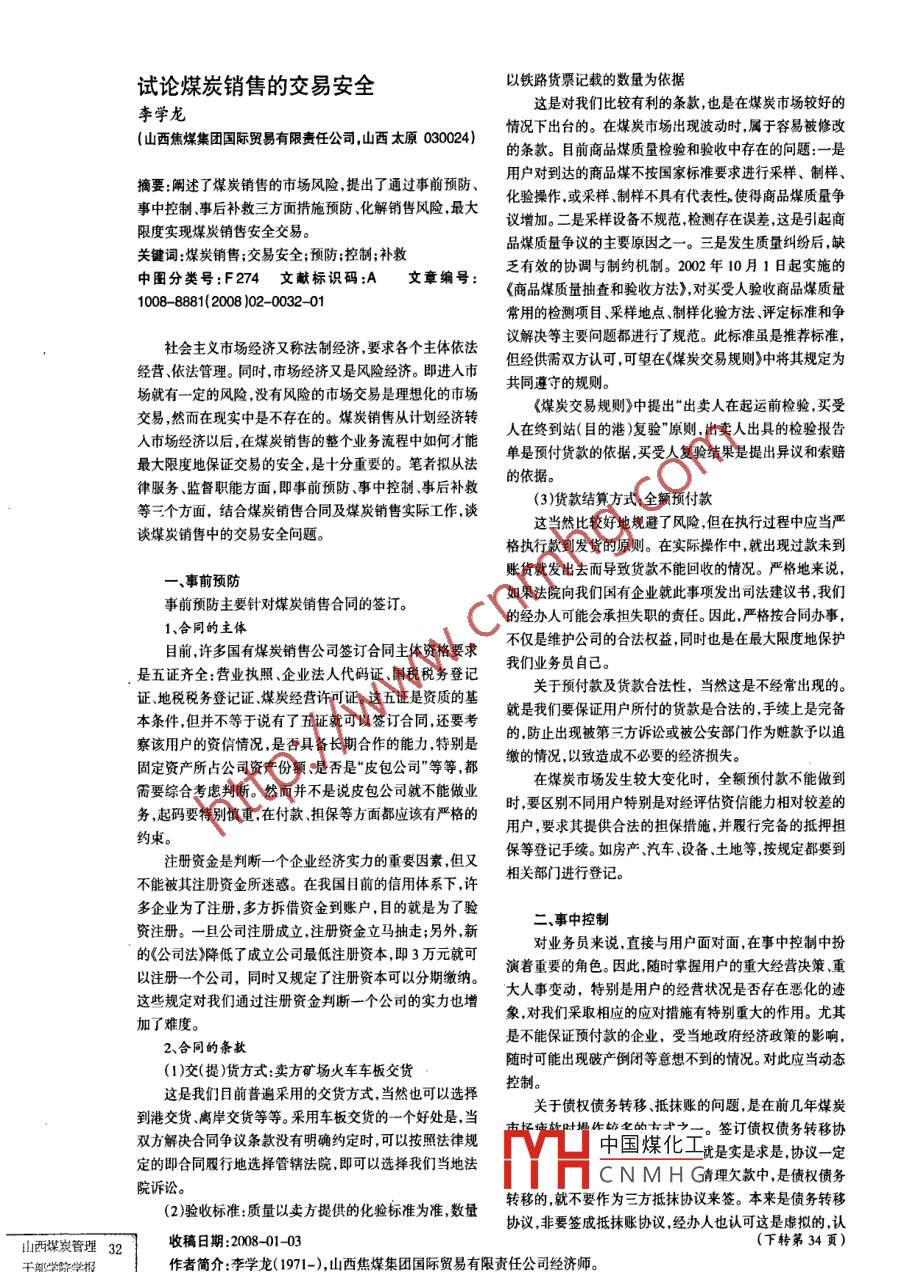 試論煤炭銷售的交易安全以鐵路貨票記載的數(shù)量為依據(jù)李學(xué)龍這是對(duì)我們比較有利的條款,也是在煤炭市場(chǎng)較好的(山西焦煤集團(tuán)國(guó)際貿(mào)易有限責(zé)任公司,山西太原030024)情況下出臺(tái)的。在煤炭市場(chǎng)出現(xiàn)波動(dòng)時(shí),屬于容易被修改的條款。目前商品煤質(zhì)量檢驗(yàn)和驗(yàn)收中存在的問題:一是摘要:闡述了煤炭銷售的市場(chǎng)風(fēng)險(xiǎn),提出了通過事前預(yù)防、用戶對(duì)到達(dá)的商品煤不按國(guó)家標(biāo)準(zhǔn)要求進(jìn)行采樣、制樣、事中控制、事后補(bǔ)救三方面措施預(yù)防、化解銷售風(fēng)險(xiǎn),最大化驗(yàn)操作,或采祥、制樣不具有代表性,使得商品煤質(zhì)量爭(zhēng)限度實(shí)現(xiàn)煤炭銷售安全交易。議增加。二是采樣設(shè)備不規(guī)范,檢測(cè)存在誤差,這是引起商關(guān)鍵詞:煤埃銷售;交易安全;預(yù)防;控制;補(bǔ)教晶煤質(zhì)量爭(zhēng)議的主要原因之一-。 三是發(fā)生質(zhì)量糾紛后,缺中圍分類號(hào):F274文獻(xiàn)標(biāo)識(shí)碼:A文章編號(hào):乏有效的協(xié)調(diào)與制約機(jī)制。2002年10月1日起實(shí)施的1008-8881(2008 )02 -0032 -01《商品煤質(zhì)量抽查和驗(yàn)收方法),對(duì)買受人驗(yàn)收商品煤質(zhì)量常用的檢測(cè)項(xiàng)目、采樣地點(diǎn)、制樣化驗(yàn)方法、評(píng)定標(biāo)準(zhǔn)和爭(zhēng)社會(huì)主義市場(chǎng)經(jīng)濟(jì)又稱法制經(jīng)濟(jì),要求各個(gè)主體依法議解決等主要問題都進(jìn)行了規(guī)范。此標(biāo)準(zhǔn)雖是推薦標(biāo)準(zhǔn),經(jīng)營(yíng)依法管理。同時(shí),市場(chǎng)經(jīng)濟(jì)又是風(fēng)險(xiǎn)經(jīng)濟(jì)。即進(jìn)入市但經(jīng)供需雙方認(rèn)可,可望在(煤炭交易規(guī)則>中將其規(guī)定為場(chǎng)就有一-定的風(fēng)險(xiǎn),沒有風(fēng)險(xiǎn)的市場(chǎng)交易是理想化的市場(chǎng)共同遵守的規(guī)則。交易,然而在現(xiàn)實(shí)中是不存在的。媒炭銷售從計(jì)劃經(jīng)濟(jì)轉(zhuǎn)《煤炭交易規(guī)則)中提出“出賣人在起運(yùn)前檢驗(yàn),買受人市場(chǎng)經(jīng)濟(jì)以后,在煤炎銷售的整個(gè)業(yè)務(wù)流程中如何才能人在終到站(目的港)復(fù)驗(yàn)”原則,出賣人出具的檢驗(yàn)報(bào)告最大限度地保證交易的安全,是十分重要的。筆者擬從法單是預(yù)付貨款的依據(jù),買受人復(fù)驗(yàn)結(jié)果是提出異議和索賠律服務(wù)、監(jiān)督職能方面,即事前預(yù)防、事中控制.事后補(bǔ)救的依據(jù)。等三個(gè)方面,結(jié)合煤炭銷售合同及煤炭銷售實(shí)際工作,談(3)貨款結(jié)算方式:全額預(yù)付款談煤炭銷售中的交易安全問題。這當(dāng)然比較好地規(guī)避了風(fēng)險(xiǎn),但在執(zhí)行過程中應(yīng)當(dāng)嚴(yán)格執(zhí)行款到發(fā)貨的原則。在實(shí)際操作中,就出現(xiàn)過款未到一、事前預(yù)防賬貨就發(fā)出去而導(dǎo)致貨款不能回收的情況。嚴(yán)格地來說,事前預(yù)防主要針對(duì)煤炭銷售合同的簽訂。如果法院向我們國(guó)有企業(yè)就此事項(xiàng)發(fā)出司法建議書,我們1、合同的主體的經(jīng)辦人可能會(huì)承擔(dān)失職的責(zé)任。因此,嚴(yán)格按同辦事,目前,許多國(guó)有煤炭銷售公司簽訂合同主體資格要求不僅是維護(hù)公司的合法權(quán)益,同時(shí)也是在最大限度地保護(hù)是五證齊全:營(yíng)業(yè)執(zhí)照、企業(yè)法人代碼證、國(guó)稅稅務(wù)登記我們業(yè)務(wù)員自己。關(guān)于預(yù)付款及貨款合法性,當(dāng)然這是不經(jīng)常出現(xiàn)的。證、地稅稅務(wù)登記證.媒炭經(jīng)營(yíng)許可證。這五證是資質(zhì)的基本條件,但并不等于說有了五證就可以簽訂合同,還要考就是我們要保證用戶所付的貨款是合法的,手續(xù) 上是完備察該用戶的資信情況.是否具備長(zhǎng)期合作的能力,特別是的.防止出現(xiàn)被第三方訴訟或被公安部門作為贓教予以追固定資產(chǎn)所占公司資產(chǎn)份額、是否是“皮包公司”等等,都繳的情況,以致造成不必要的經(jīng)濟(jì)損失。需要綜合考慮判斷。然而并不是說皮包公司就不能做業(yè)在煤炭市場(chǎng)發(fā)生較大變化時(shí),全額預(yù)付款不能做到務(wù),起碼要特別慎重,在付款、擔(dān)保等方面都應(yīng)該有嚴(yán)格的時(shí),要區(qū)別不同用戶特別是對(duì)經(jīng)評(píng)估資信能力相對(duì)較差的約束。用戶,要求其提供合法的擔(dān)保措施,并履行完備的抵押擔(dān)注冊(cè)資金是判斷一個(gè)企業(yè)經(jīng)濟(jì)實(shí)力的重要因素,但又,保等登記手續(xù)。如房產(chǎn)、汽車、設(shè)備.土地等,按規(guī)定都要到不能被其注冊(cè)資金所迷惑。在我國(guó)目前的信用體系下,許相關(guān)部門進(jìn)行登記。多企業(yè)為了注冊(cè),多方拆借資金到賬戶,目的就是為了驗(yàn)資注冊(cè)。-旦公司注冊(cè)成立,注冊(cè)資金立馬抽走;另外,新二.事中控制的《公司法)降低了成立公司最低注冊(cè)資本,即3萬元就可對(duì)業(yè)務(wù)員來說,直接與用戶面對(duì)面,在事中控制中扮以注冊(cè)一個(gè)公司,同時(shí)又規(guī)定了注冊(cè)資本可以分期繳納。演者 重要的角色。因此,隨時(shí)掌握用戶