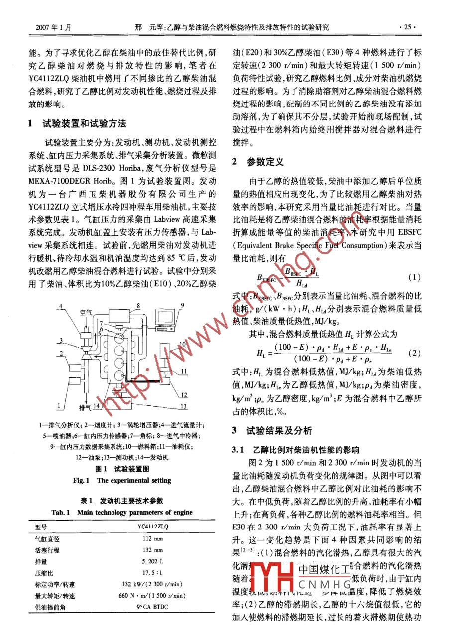 第25卷(2007)第1期Vol.25(2007)No.1Transactions of CSICE文章編號(hào):1000-0909(2007)01-0024-0625004乙醇與柴油混合燃料燃燒特性及排放特性的試驗(yàn)研究邢元,堯命發(fā)!,張福根2,鄭尊清(1.天津大學(xué)內(nèi)燃機(jī)燃燒學(xué)國(guó)家重點(diǎn)實(shí)驗(yàn)室,大津30002;2.廣西大學(xué)機(jī)械工程學(xué)院,廣西南寧530004)摘要:在一臺(tái)YC4112ZLQ增壓柴油機(jī)上進(jìn)行了不加任何助溶劑和著火改進(jìn)劑的情況下,無(wú)水乙醇與柴油混合對(duì)柴油機(jī)燃燒過(guò)程影響的研究。試驗(yàn)結(jié)果表明,隨著混合燃料中乙醇比例的提高滯燃期延長(zhǎng),放熱峰值增大,缸內(nèi)最大爆發(fā)壓力和最大壓力升高率升高。與柴油相比,E10和E20有效熱效率與原機(jī)相當(dāng),E30在高速大負(fù)荷工況熱效率降低,NO,和碳煙排放明顯降低;但HC和CO排放隨著混合燃料中乙醇比例的增大發(fā)動(dòng)機(jī)轉(zhuǎn)速為1500r/min時(shí),HC排放和CO排放均降低,發(fā)動(dòng)機(jī)轉(zhuǎn)速為2300r/min時(shí),HC排放和CO排放均有所升高。關(guān)鍵詞;乙醇;柴油;燃燒過(guò)程;發(fā)動(dòng)機(jī)性能;發(fā)動(dòng)機(jī)排放中圖分類(lèi)號(hào):TK421.2文獻(xiàn)標(biāo)志碼:AExperimental Investigation on Combustion and Emission Characteristics ofEngine Fuelled with Ethanol-Diesel BlendsXING Yuan, YAO Ming.fa, ZHANG Fu-gen", ZHENG Zun-ging(1. Stated Key laboratory of Engines, Tianjin University, Tianjin 300072, China;2. School of Mechanical Engineering, Guangxi University, Nanning 530004, China)Abstract The effects of ethanol-diesel blends on engine combustion and emission characteristics were in-estigated. Experiments were carried out on a turbo-charged inter-cooled YC4112ZLQ diesel engine. Theresults show that, with the increase of ethanol ratio, the ignition timing is delayed, and the maximum value of heat release rate is increased, leading to the increase in peak cylinder pressure and maximum rate ofrise, The effective thermal efficiencies of E10 and E20 are almost the same as that of the dieselfuel, while thermal efficiency of E30 decreases at high speed and heavy load. Compared with the dieselengine, both NO, emission and smoke are reduced, while HC and Co emission are related to the ethanolratio and engine speed. With the increase of ethanol ratio, HC and CO emissions decrease at engine speedof 1 500 r/min, but they give the increase at engine speed of 2 300 r/minKeywords: Ethanol; Diesel; Combustion process; Performance; Emission引言加混合氣中氧的濃度,減少局部過(guò)濃區(qū)的范圍,從而降低發(fā)動(dòng)機(jī)碳煙的排放。但由于乙醇的十六烷值很能源短缺和環(huán)境保護(hù)是今后內(nèi)燃機(jī)發(fā)展所面臨著低(10左右),與柴油的十六烷值(大于45)相差較大的兩大挑戰(zhàn),在這種形勢(shì)下,各種石油替代燃料的研究著火能力比較差,難以在柴油機(jī)上直接使用。隨著低得到了廣泛的重視。乙醇是含氧燃料,在內(nèi)燃機(jī)的燃成本添加劑出現(xiàn),乙醇與柴油很難直接互溶的問(wèn)題得燒過(guò)程中具有自供氧功能,在擴(kuò)散燃燒模式中可以增到了中國(guó)煤化工的大量應(yīng)用成為可CNMHG收稿日期:2006-04-25;修回日期:2006-08-05基金項(xiàng)目:廣西科技攻關(guān)項(xiàng)目(06300044A)。作者簡(jiǎn)介:邢元,碩士研究生,Email;smileinsun@eyou.com。2007年1月邢元等:乙醇與柴油混合燃料燃燒特性及排放特性的試驗(yàn)研究能。為了尋求優(yōu)化乙醇在柴油中的最佳替代比例,研油(E20)和30%乙醇柴油(E30)等4種燃料進(jìn)行了標(biāo)究乙醇柴油對(duì)燃燒與排放特性的影響,筆者在定轉(zhuǎn)速(2300r/min)和最大轉(zhuǎn)矩轉(zhuǎn)速(1500r/minYC41ZLQ柴油機(jī)中燃用了不同摻比的乙醇柴油混負(fù)荷特性試驗(yàn),研究乙醇燃料比例、成分對(duì)柴油機(jī)燃燒合燃料,研究了乙醇比例對(duì)發(fā)動(dòng)機(jī)性能、燃燒過(guò)程及排過(guò)程的影響。為了消除助溶劑對(duì)乙醇柴油混合燃料燃放的影響。燒過(guò)程的影響配制的不同比例的乙醇柴油沒(méi)有添加1試驗(yàn)裝置和試驗(yàn)方法助溶劑,為了確保其不分層,試驗(yàn)開(kāi)始前現(xiàn)場(chǎng)配制,試驗(yàn)過(guò)程中在燃料箱內(nèi)始終用攪拌器對(duì)混合燃料進(jìn)行試驗(yàn)裝置主要分為:發(fā)動(dòng)機(jī)、測(cè)功機(jī)、發(fā)動(dòng)機(jī)測(cè)控?cái)嚢柘到y(tǒng)缸內(nèi)壓力采集系統(tǒng)、排氣采集分析裝置。微粒測(cè)試系統(tǒng)型號(hào)是DLS2300 Horiba,廢氣分析儀型號(hào)是2參數(shù)定義MEXA-7100 DEGR Horib。圖1為試驗(yàn)裝置圖。發(fā)動(dòng)由于乙醇的熱值較低,柴油中添加乙醇后單位質(zhì)機(jī)為一臺(tái)廣西玉柴機(jī)器股份有限公司生產(chǎn)的量的熱值相應(yīng)出現(xiàn)變化,為了比較燃用乙醇柴油對(duì)熱YC412Q立式增壓水冷四沖程車(chē)用柴油機(jī),主要技效率的影響,本研究采用當(dāng)量比油耗進(jìn)行對(duì)比。當(dāng)量術(shù)參數(shù)見(jiàn)表I。氣缸壓力的采集由 Labview高速采集比油耗是將乙醇柴油混合燃料的油耗率根據(jù)能量消耗系統(tǒng)完成。發(fā)動(dòng)機(jī)缸蓋上安裝有壓力傳感器,與Lab-折算成能量等值的柴油消耗率,本研究中用 EBSFCview采集系統(tǒng)相連。試驗(yàn)前,先燃用柴油對(duì)發(fā)動(dòng)機(jī)進(jìn)( Equivalent Brake Specific Fuel Consumption)來(lái)表示當(dāng)行暖機(jī)待冷卻水溫和機(jī)油溫度均達(dá)到