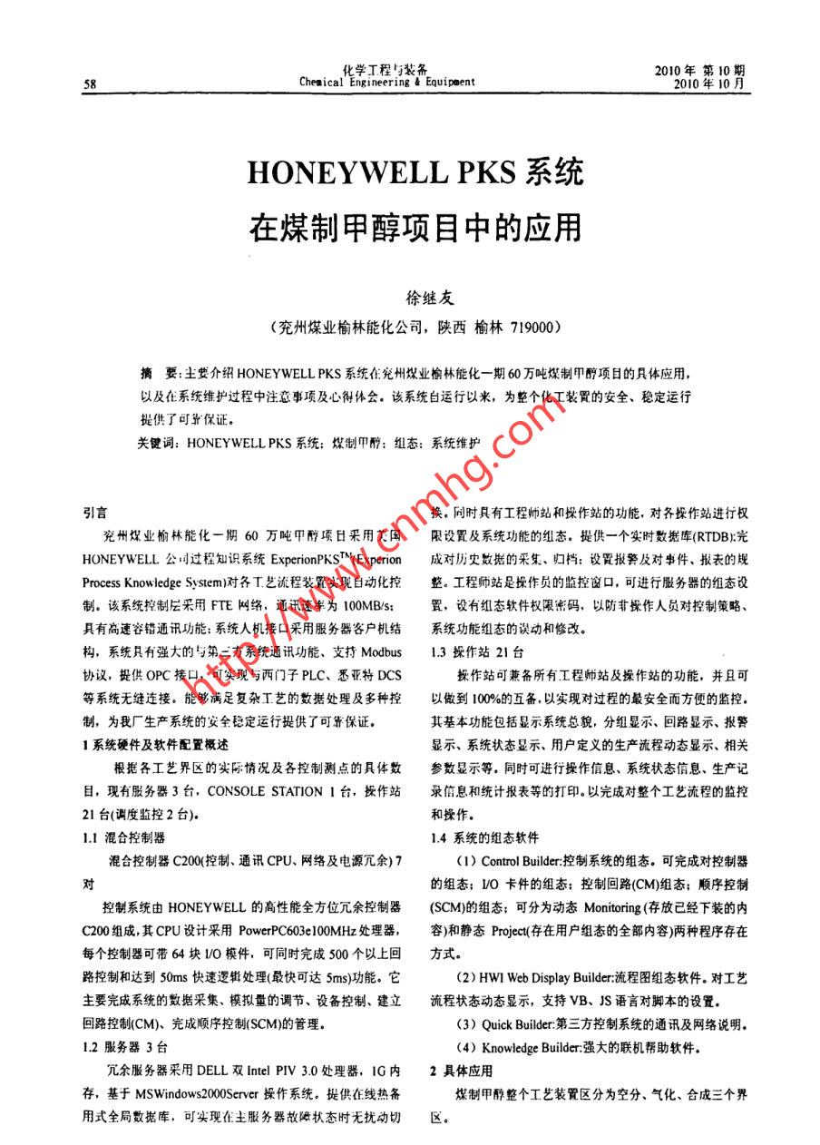 HONEYWELL PKS系統(tǒng)在煤制甲醇項(xiàng)目中的應(yīng)用