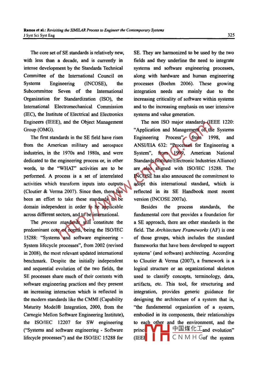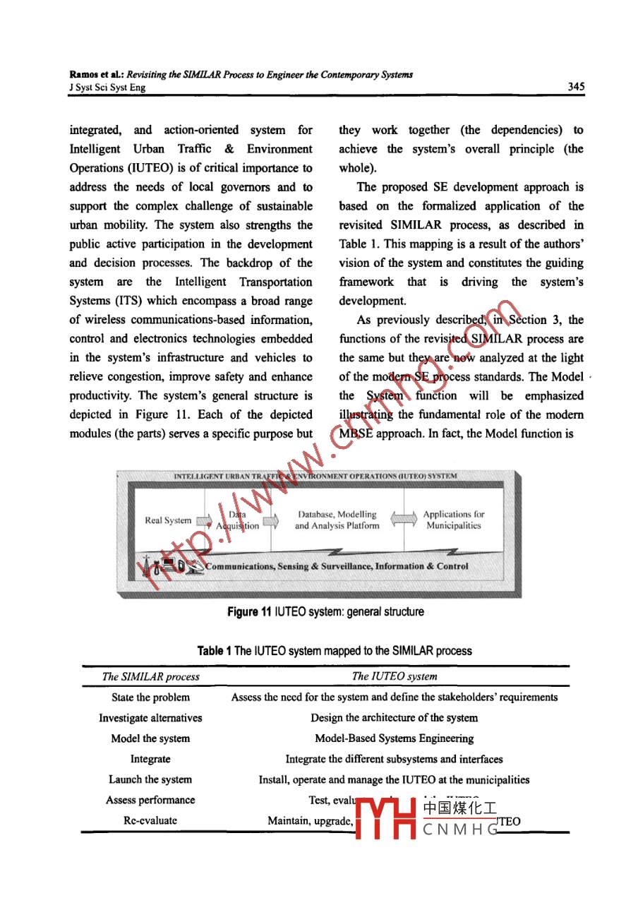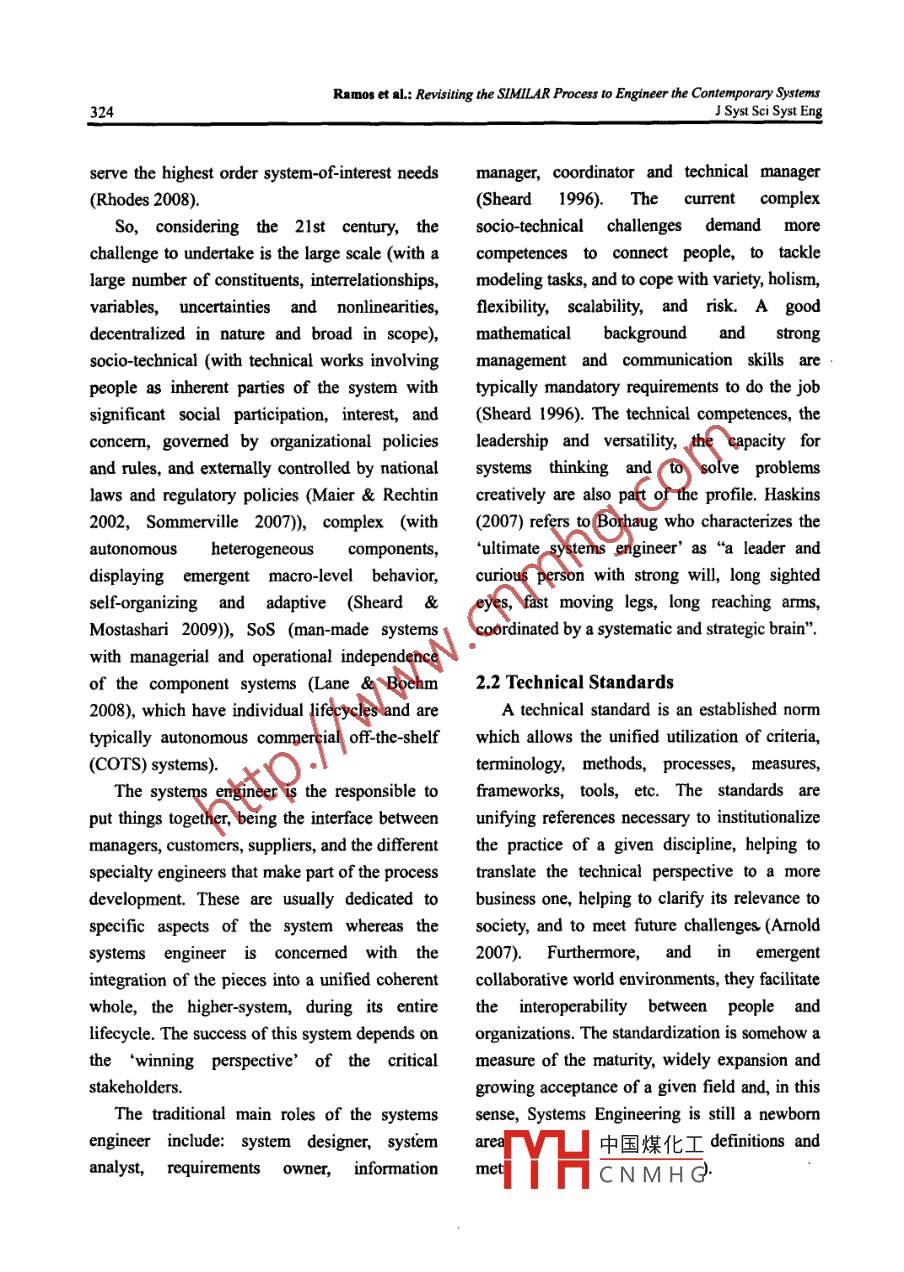 J Syst Sci Syst Eng (Sep 2010) 19(3): 321-350ISSN: 1004-3756 (Paper) 1861-9576 (Online)DOI: 10.1007/s11518-010-5144-8CN11-2983/NREVISITING THE SIMILAR PROCESS TO ENCINEER THECONTEMPORARY SYSTEMS*Ana Luisa RAMOS'Jose Vasconcelos FERREIRA'Jaume BARCELO2'GOVCOPP- Department of Economics, Management and Industral Engineering, Universiy ofAveir, Portugalaramos@ua.pt (8)josev@ua.pt'Department of Statistics and Operations Research, Technical University ofCatalonia, Barcelona, Spainjaume.barcelo@upc.eduAbstractThis paper addresses the present-day context of Systems Engineering, revisiting and setting up anupdated framework for the SIMILAR process in order to use it to engineer the contemporary systems.The contemporary world is crowded of large interdisciplinary complex systems made of other systems,personnel, hardware, software, information, processes, and facilities. An integrated holistic approach iscrucial to develop these systems and take proper account of their multifaceted nature and numerousinterrelationships. As the system's complexity and extent grow, the number of parties involved(stakeholders and shareholders) usually also raises, bringing to the interaction a considerable amountof points of view, skills, responsibilities, and interests. The Systems Engineering approach aims totackle the complex and interdisciplinary whole of those socio-technical systems, providing the meansto enable their successful realization. Its exploitation in our modern world is assuming an increasingrelevance noticeable by emergent standards, academic papers, international conferences, andpost-graduate programmes in the field. This work aims to provide“the picture" of modern SystemsEngineering, and to update the context of the SIMILAR process model in order to use this renewedframework to engineer the challenging contemporary systems. The emerging trends in the field are alsopointed-out with particular reference to the Model-Based Systems Engineering approach.Keywords: SIMILAR process, systems engineering, standards, MBSE1. Introductionemergent properties, the lifecycle, and theSystems Engineering (SE) is concerned withrequirements of the system. The SIMILARthe“big picture", the whole, the interrelation-process model (Bahill & Gissing 1998)ships, the synthesis, the interdisciplinarity, thedescribes the 'recipe' or the set of interacting SE中國(guó)煤化工*This work was partially supported by the Portuguese Foundal.MYHCN M H G&Y (FCD, DoctralGrant SFRH/BD/43892/2008.⑥Systems Engineering Society of China and Springer-Verlag Berlin Heidelberg 2010Ramos et aL: Revisiting the SIMILAR Process to Engineer the Contemporary Systems322J Syst Sci Syst Engactivities which transform the inputs into outputsenvironments, facilitate the interoperabilitythat is, which generate a successful system. Thebetween people and organizations, the sectionSIMILAR acronym stands for State the problem,three revisits the SIMILAR process model,Investigate altermatives, Model the system,describing its key characteristics and proposingIntegrate, Launchthesystem, Assessan updated integrative framework to use thisperformance, and Re-evaluate.universal process, based on the ISO SEIn 1998, Bahill and Gissing had suggest thisprocesses standard, the fourth section provides ageneral process as a universal way of planningdescription of the SE foremost emerging trendsand problem solving closely related to humanwith particular emphasis on the Model-Basedthinking. After a decade, the process stillsSystems Engineering (MBSE) approach. Thisextensive and straightforward but must beemerging paradigm relies on the application ofcontextualized in the framework of themodeling principles, methods, languages andintermational SE process standards that havetools to the entire lifecycle of large, complex,emerged since then. Furthermore, its adequacyinterdisciplinary, socio-technical systems and itto tackle the development of the contemporaryis expected to play, in the next decade, ansystems, which are typically large, complex,increasing role in the practice of systemssocio-technical, interdisciplinary Systems-of-engineering. The last section describes theSystems (SoS), has to be evaluated.on-going work related with the IUTEO systemThis work constitutes an attempt todevelopment and points out some majorrediscover this simple, intuitive, and integratedconclusions.process model at the light of the modermintermational ISO/IEC 15288 standard (“Systems2. Systems Engineering Essentialsand software engineering - System lifecycleThe system is the essence of SE. Despite theprocesses") that suffers from some excess ofinnumerous definitions of system (Bahill et al.flexibility and some lack of“glue".2002, Hitchins 2003, Meadows 2008), all theIn order to test the adequacy of the proposedauthors share the same key idea: elements +framework to develop the moderm, large,interactions = whole. The elements or parts cancomplex,interdisciplinary SoS, it is beinginclude people, software, hardware, facilities ordeveloped the Intelligent Urban Traffic 8documents, and are the relationships among theEnvironment Operations (IUTEO) system thatparts that impel unique emergent properties.the authors believe being representative of theThis principle of emergence, along with thesystems-of-interest for the field of Systemsprinciples of organismic analogy, holism andEngineering.synthesis, constitute the basic tenets of theThis paper is organized as follows: thesystems approach or systems thinking (Hitchinssecond section describes the essentials of SE2007). This philosophy, opposite to the classicalproviding a brief review on its main issues, andanalytical Cartesian reductionism, has guide theemphasizing the evolving technical standards inway 1中國(guó)煤化I eneral Systemsthe field that, in emerging collaborative worldTheot|YHC NMH G the SystemsRamos et aL: Revisiting the SIMILAR Process to Engineer the Contemporany SystemsJ Syst Sci Syst Eng323Science.old Systems Engineering" (o