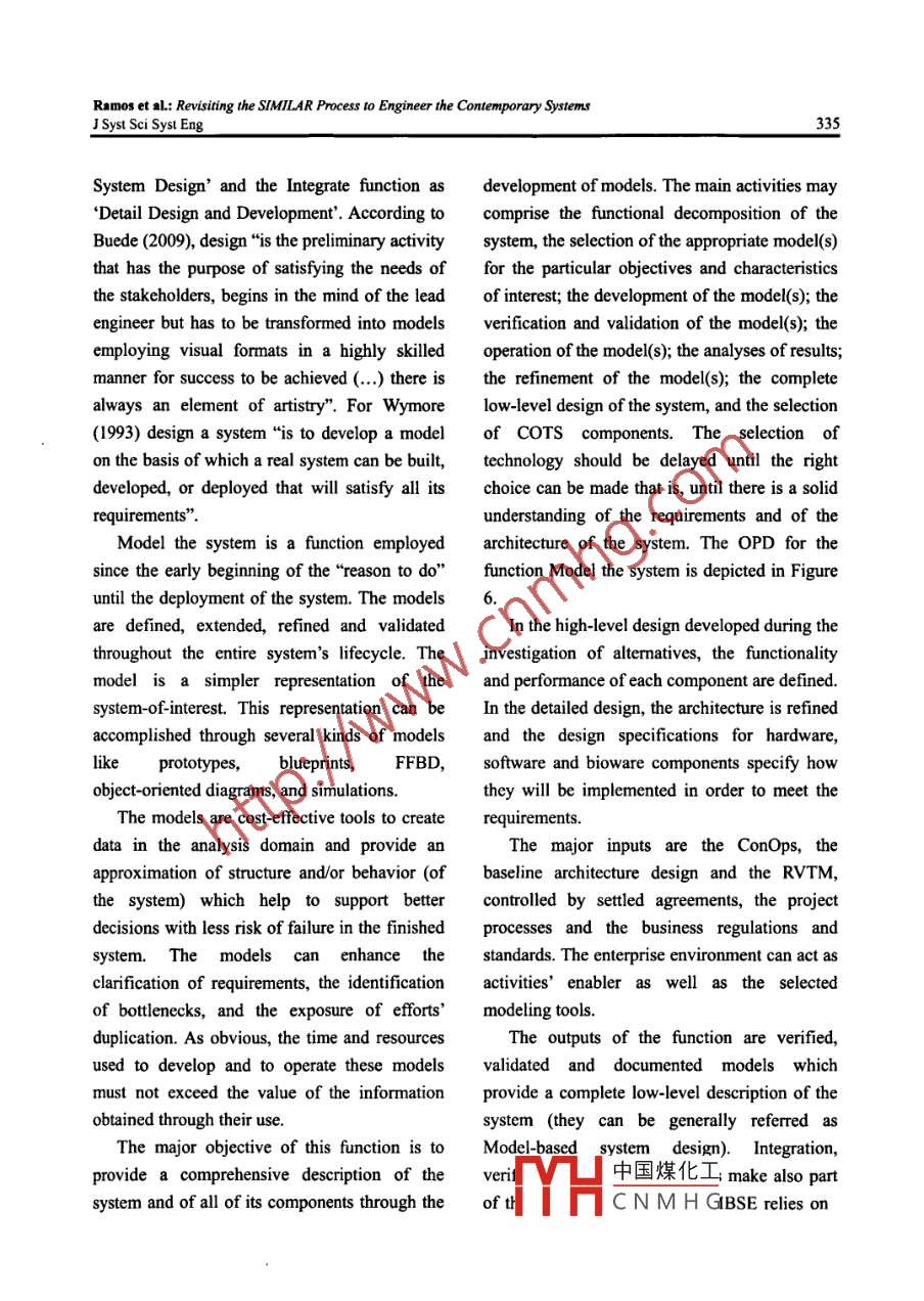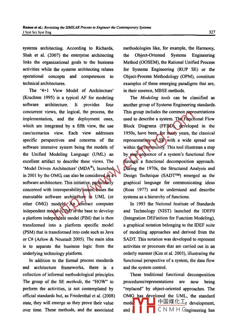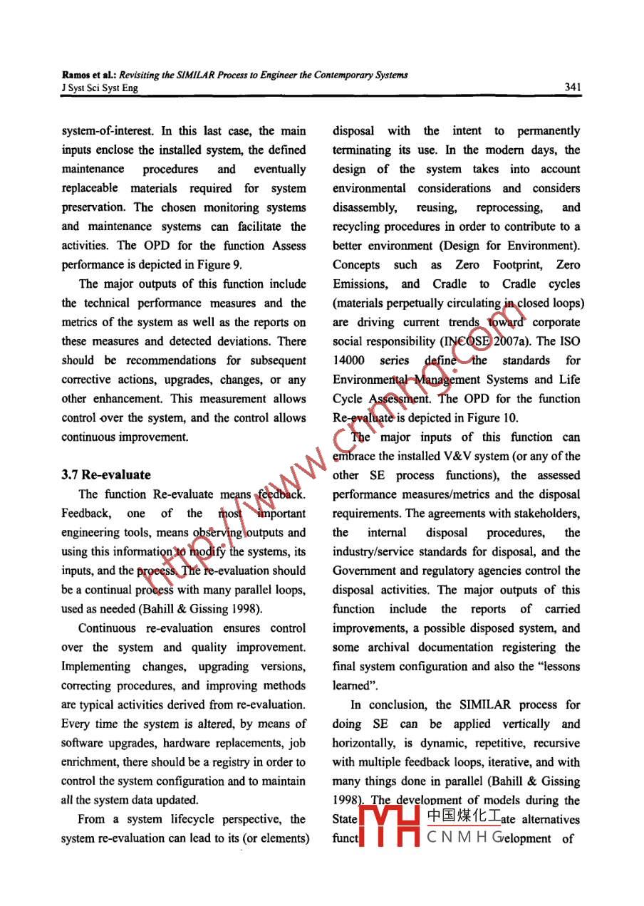 J Syst Sci Syst Eng (Sep 2010) 19(3): 321-350ISSN: 1004-3756 (Paper) 1861-9576 (Online)DOI: 10.1007/s11518-010-5144-8CN11-2983/NREVISITING THE SIMILAR PROCESS TO ENCINEER THECONTEMPORARY SYSTEMS*Ana Luisa RAMOS'Jose Vasconcelos FERREIRA'Jaume BARCELO2'GOVCOPP- Department of Economics, Management and Industral Engineering, Universiy ofAveir, Portugalaramos@ua.pt (8)josev@ua.pt'Department of Statistics and Operations Research, Technical University ofCatalonia, Barcelona, Spainjaume.barcelo@upc.eduAbstractThis paper addresses the present-day context of Systems Engineering, revisiting and setting up anupdated framework for the SIMILAR process in order to use it to engineer the contemporary systems.The contemporary world is crowded of large interdisciplinary complex systems made of other systems,personnel, hardware, software, information, processes, and facilities. An integrated holistic approach iscrucial to develop these systems and take proper account of their multifaceted nature and numerousinterrelationships. As the system's complexity and extent grow, the number of parties involved(stakeholders and shareholders) usually also raises, bringing to the interaction a considerable amountof points of view, skills, responsibilities, and interests. The Systems Engineering approach aims totackle the complex and interdisciplinary whole of those socio-technical systems, providing the meansto enable their successful realization. Its exploitation in our modern world is assuming an increasingrelevance noticeable by emergent standards, academic papers, international conferences, andpost-graduate programmes in the field. This work aims to provide“the picture" of modern SystemsEngineering, and to update the context of the SIMILAR process model in order to use this renewedframework to engineer the challenging contemporary systems. The emerging trends in the field are alsopointed-out with particular reference to the Model-Based Systems Engineering approach.Keywords: SIMILAR process, systems engineering, standards, MBSE1. Introductionemergent properties, the lifecycle, and theSystems Engineering (SE) is concerned withrequirements of the system. The SIMILARthe“big picture", the whole, the interrelation-process model (Bahill & Gissing 1998)ships, the synthesis, the interdisciplinarity, thedescribes the 'recipe' or the set of interacting SE中國(guó)煤化工*This work was partially supported by the Portuguese Foundal.MYHCN M H G&Y (FCD, DoctralGrant SFRH/BD/43892/2008.⑥Systems Engineering Society of China and Springer-Verlag Berlin Heidelberg 2010Ramos et aL: Revisiting the SIMILAR Process to Engineer the Contemporary Systems322J Syst Sci Syst Engactivities which transform the inputs into outputsenvironments, facilitate the interoperabilitythat is, which generate a successful system. Thebetween people and organizations, the sectionSIMILAR acronym stands for State the problem,three revisits the SIMILAR process model,Investigate altermatives, Model the system,describing its key characteristics and proposingIntegrate, Launchthesystem, Assessan updated integrative framework to use thisperformance, and Re-evaluate.universal process, based on the ISO SEIn 1998, Bahill and Gissing had suggest thisprocesses standard, the fourth section provides ageneral process as a universal way of planningdescription of the SE foremost emerging trendsand problem solving closely related to humanwith particular emphasis on the Model-Basedthinking. After a decade, the process stillsSystems Engineering (MBSE) approach. Thisextensive and straightforward but must beemerging paradigm relies on the application ofcontextualized in the framework of themodeling principles, methods, languages andintermational SE process standards that havetools to the entire lifecycle of large, complex,emerged since then. Furthermore, its adequacyinterdisciplinary, socio-technical systems and itto tackle the development of the contemporaryis expected to play, in the next decade, ansystems, which are typically large, complex,increasing role in the practice of systemssocio-technical, interdisciplinary Systems-of-engineering. The last section describes theSystems (SoS), has to be evaluated.on-going work related with the IUTEO systemThis work constitutes an attempt todevelopment and points out some majorrediscover this simple, intuitive, and integratedconclusions.process model at the light of the modermintermational ISO/IEC 15288 standard (“Systems2. Systems Engineering Essentialsand software engineering - System lifecycleThe system is the essence of SE. Despite theprocesses") that suffers from some excess ofinnumerous definitions of system (Bahill et al.flexibility and some lack of“glue".2002, Hitchins 2003, Meadows 2008), all theIn order to test the adequacy of the proposedauthors share the same key idea: elements +framework to develop the moderm, large,interactions = whole. The elements or parts cancomplex,interdisciplinary SoS, it is beinginclude people, software, hardware, facilities ordeveloped the Intelligent Urban Traffic 8documents, and are the relationships among theEnvironment Operations (IUTEO) system thatparts that impel unique emergent properties.the authors believe being representative of theThis principle of emergence, along with thesystems-of-interest for the field of Systemsprinciples of organismic analogy, holism andEngineering.synthesis, constitute the basic tenets of theThis paper is organized as follows: thesystems approach or systems thinking (Hitchinssecond section describes the essentials of SE2007). This philosophy, opposite to the classicalproviding a brief review on its main issues, andanalytical Cartesian reductionism, has guide theemphasizing the evolving technical standards inway 1中國(guó)煤化I eneral Systemsthe field that, in emerging collaborative worldTheot|YHC NMH G the SystemsRamos et aL: Revisiting the SIMILAR Process to Engineer the Contemporany SystemsJ Syst Sci Syst Eng323Science.old Systems Engineering" (o