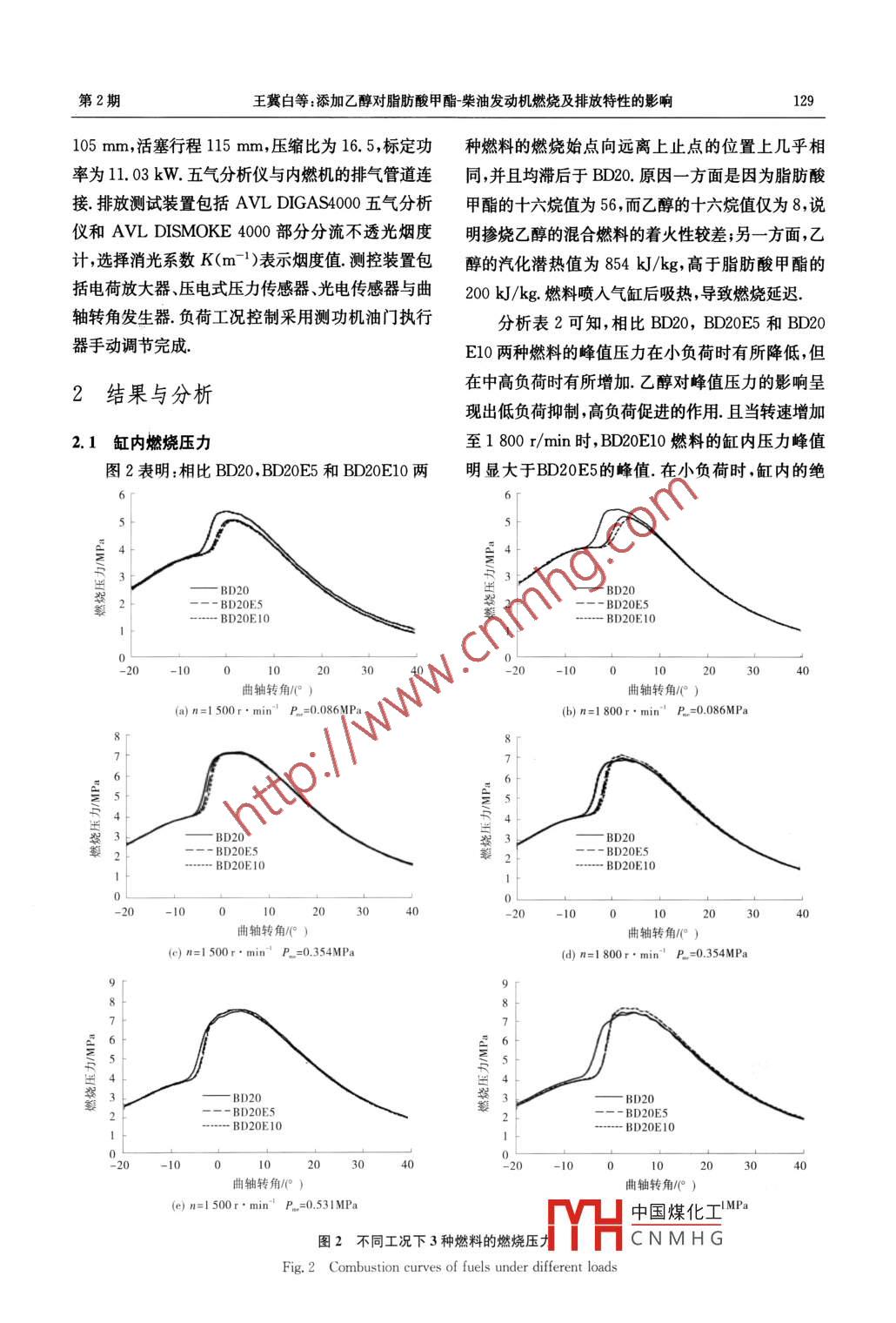 2016年4月甘肅農(nóng)業(yè)大學(xué)學(xué)報(bào)第51卷第2期127~133JOURNAL OF GANSU AGRICULTURAL UNIVERSITY雙月刊添加乙醇對(duì)脂肪酸甲酯柴油混合燃料的燃燒及排放特性的影響王冀白,邊耀璋',張哲林2,陳昊2(1.長安大學(xué)汽車學(xué)院,交通新能源開發(fā)、應(yīng)用與汽車節(jié)能陜西省重點(diǎn)實(shí)驗(yàn)室陜西西安710064;2.博格華納汽車零部件有限公司,浙江寧波315000摘要:【目的】研究添加乙醇對(duì)脂肪酸甲酯柴油混合燃料性能的影響.【方法】在一臺(tái)單缸柴油機(jī)上對(duì)BD2O(脂肪酸甲酯20%)、BD2E5(脂肪酸甲脂20%,乙醇5%)、BD20E0(脂肪酸甲脂20%,乙醇10%)3種燃料的燃燒和排放特性進(jìn)行對(duì)比試驗(yàn)研究?!窘Y(jié)果】與BD20相比,BD20E5,BD20E10的滯燃期要長對(duì)于BD20燃料而言低溫放熱發(fā)生的時(shí)間早,反應(yīng)劇烈,聚集了大量熱量從而越過了負(fù)溫度系數(shù)區(qū),迅速開啟了高溫放熱;BD20E5和BD2oE02種燃料的高溫放熱發(fā)生時(shí)間較晚;峰值壓力和峰值放熱率增加,但對(duì)應(yīng)的曲軸轉(zhuǎn)角相同負(fù)荷特性下,BD20E10和BD0E5的OO排放在1500r時(shí)隨著乙醇比例的增加分別降低49.3%和332%;碳煙分別降低47.1%和29.4%;NOx排放幾乎相同,且總體均處于較低值;BD20E0和BD20E5的HC排放在1500r時(shí)相比BD20有所增加,并且隨著轉(zhuǎn)速的提高排放值呈現(xiàn)波動(dòng)變化?!窘Y(jié)論】添加乙醇可以改善脂肪酸甲脂柴油混合燃料的燃燒和排放特性關(guān)鍵詞:脂肪酸甲酯;乙醇瞬時(shí)放熱率;燃燒壓力;排放特性中圖分類號(hào):TK46+4文獻(xiàn)標(biāo)志碼:A文章編號(hào):1003-4315(2016)020127-07Combustion and emissions properties of fatty acidmethylester diesel adding ethanolWANG Ji-bai, BiAn Yao-zhang, ZHANG Zhe-lin, CHEN Hao.2(1. College of Automobile, Chang an University, Xi an 710064, China; 2. Shanxi Province Key laboratory ofNew Energy Development, Utilization and Vehicle Energy Conservation, Xi'an 710064, China;3. Borg Warner Automotive Components Co Ltd, Ningbo 315000, China)Abstract: Objective] This study is to investigate the influence of alcohol on the emission and combustion properties of fatty acid methyl ester diesel fuel blends. [Method] Using a single cylinder diesel, a com-parison test on emission and combustion properties of the three fuels including BD20(20% volume fractionof acid methyl ester), BD20E5(volume fraction of ethanol is 5%)and BE20E10(volume fraction of ethanolwas 10%)were studied. [Results] The ignition delay period of BD20E5 and BD20E10 was longer than thatof BD20 The occurrence of low temperature exotherm of BD20 occurred earlier with drastic action, accu-mulated a lot of heat which exceeded the negative temperature coefficient(ntc)region and started heat release immediately. The heat release of BD20E5 and BD20E10 occurred later and the peak pressure and peakheat release rate increased but the corresponding crank angle was the same. The CO emission of BD20E10and BD20E5 reduce by 49. 3% and 33. 2%, respectively with the increase of alcohol proportion when the第一作者:王冀白(1987-),男,博土研究生,研究方向?yàn)樘娲剂霞芭欧趴刂? E-mail: eaglH中國煤化工CNMHG基金項(xiàng)目:陜西省自然科學(xué)基礎(chǔ)研究計(jì)劃資助項(xiàng)目(2014JQ7268)收稿日期:2015-06-16;修回日期:2015-09-17128甘肅農(nóng)業(yè)大學(xué)學(xué)報(bào)2016年turbine speed was 1 500 r, the soot decreased by 47. 1% and 29.4%, respectively, NOx emission was almostthe same while the general average level was low Compared with BD20, the HC emission of BD20E10 andBD20E5 increased when the turbine spec1 500 r and flued with the[Conclusion] Alcohol used as an additive will improve the combustion and emission properties of the blended fuelKey words: fatty acid methylester; alcohol; instantaneous heat release rate; combustion pressure; emis-Sion propertiesASTM標(biāo)準(zhǔn)中,生物柴油定義為用于壓燃式發(fā)表1不同溫度和比例下的脂肪酸甲酯和柴油動(dòng)機(jī)的、來自可再生的酯類,如植物油和動(dòng)物脂肪的的混合物溶解乙醇的最大體積長鏈脂肪酸單酯.生物柴油的閃點(diǎn)高,揮發(fā)性較Tab 1 Maximum volume of dissolved ethanol in diesel小,在運(yùn)輸與儲(chǔ)存中的安全性較柴油好2.生物柴油and fatty acid methylester mixture with different具環(huán)境友好、可再生、原料來源廣泛、貯存和使用temperature and proportion較安全沒有毒性等優(yōu)點(diǎn)許多研究表明,生物柴試樣編號(hào)10℃時(shí)溶解0℃時(shí)溶解的乙醇/mL的乙醇/mL油57和醇類燃料適合作為柴油機(jī)的替代燃料.燃BDO0.451.50用生物柴油可以降低柴油機(jī)的PM和未燃碳?xì)浠螧D20.502.90BD5物的排放,但是NO3的排放會(huì)略有上升.張志強(qiáng)BD8等對(duì)乙醇和柴油的混合燃料進(jìn)行了模擬,結(jié)果表BIO15.0023.00明乙醇可以改善燃油的霧化效果王建昕等0研究BDI5完全互溶BD20完全互溶完全互溶結(jié)果表明,乙醇作為柴油的添加劑可以降低排氣煙數(shù),從表1看出,對(duì)于同一種編號(hào)的樣品,隨著溫度度,但是NO排放明顯增加由于生物柴油運(yùn)動(dòng)黏度的提高,混合物能夠溶解的乙醇最大體積增加,說明大,其與柴油的混合燃料的流動(dòng)性差1,可能會(huì)影響溫度對(duì)提高乙醇在混合物中的溶解度有影響.隨著內(nèi)燃機(jī)的熱效率另外,柴油乙醇摻燒混合燃料由于混合物中脂肪酸甲酯體積分?jǐn)?shù)的增加,脂肪酸甲酯自身化學(xué)結(jié)構(gòu)在混合時(shí)會(huì)出現(xiàn)分層現(xiàn)象酯類是柴油的助溶