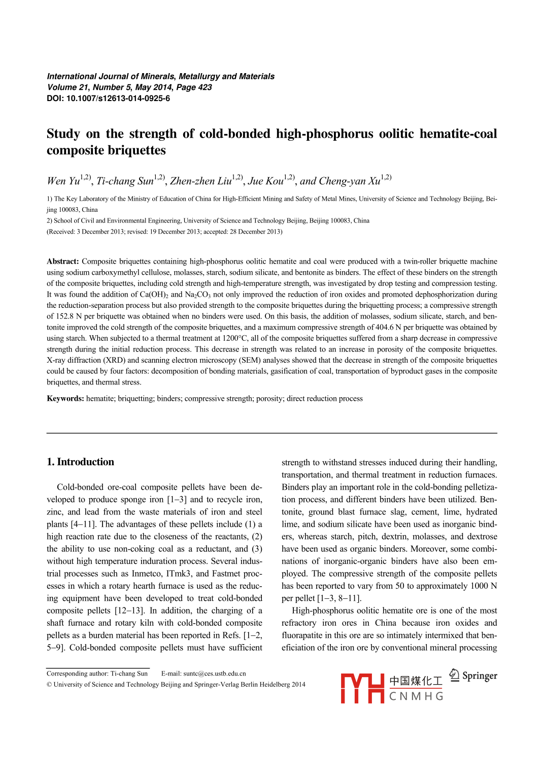 International Journal of Minerals, Metallurgy and MaterialsVolume 21, Number 5, May 2014, Page 423Do:10.1007/s12613-01409256Study on the strength of cold-bonded high-phosphorus oolitic hematite-coalcomposite briquettesWen Yu2), Ti-chang Sun2), Zhen-zhen Liu2),Jue Kou2), and Cheng-yan Xu.2)1)The Key Laboratory of the Ministry of Education of China for High-Efficient Mining and Safety of Metal Mines, University of Science and Technology Beijing, Bei-2)School of Civil and Environmental Engineering, University of Science and Technology Beijing, Beijing 100083, China(Received: 3 December 2013; revised: 19 December 2013; accepted: 28 December 2013)Abstract: Composite briquettes containing high-phosphorus oolitic hematite and coal were produced with a twin-roller briquette machineusing sodium carboxymethyl cellulose, molasses, starch, sodium silicate, and bentonite as binders. The effect of these binders on the strengthof the composite briquettes, including cold strength and high-temperature strength, was investigated by drop testing and compression testingIt was found the addition of Ca(OH)2 and Na2 CO3 not only improved the reduction of iron oxides and promoted dephosphorization duringthe reduction-separation process but also provided strength to the composite briquettes during the briquetting process; a compressive strengthof 152. 8 N per briquette was obtained when no binders were used. On this basis, the addition of molasses, sodium silicate, starch, and betonite improved the cold strength of the composite briquettes, and a maximum compressive strength of 4046n per briquette was obtained byusing starch. When subjected to a thermal treatment at 1200 C, all of the composite briquettes suffered from a sharp decrease in compressivestrength during the initial reduction process. This decrease in strength was related to an increase in porosity of the composite briquettesX-ray diffraction(XRD)and scanning electron microscopy(SEM) analyses showed that the decrease in strength of the composite briquettecould be caused by four factors: decomposition of bonding materials, gasification of coal, transportation of byproduct gases in the compositebriquettes, and thermal stressKeywords: hematite; briquetting; binders; compressive strength; porosity; direct reduction proces1. Introductionstrength to withstand stresses induced during their handling,trCold-bonded ore-coal composite pellets have been de- Binders play an important role in the cold-bonding pelletizato[1-3] and to redtion process, and different binders have been utilized. Benzinc, and lead from the waste materials of iron and steel tonite, ground blast furnace slag, cement, lime, hydratedplants [4-11]. The advantages of these pellets include (1)a lime, and sodium silicate have been used as inorganic bind-high reaction rate due to the closeness of the reactants, (2) ers, whereas starch, pitch, dextrin, molasses, and dextrosethe ability to use non-coking coal as a reductant, and(3) have been used as organic binders. Moreover, some combiwithout high temperature induration process. Several indus- nations of inorganic-organic binders have also been em-trial processes such as Inmetco, ITmk3, and Fastmet proc- ployed. The compressive strength of the composite pelletsesses in which a rotary hearth furnace is used as the reduc- has been reported to vary from 50 to approximately 1000 Ning equipment have been developed to treat cold-bonded per pellet [1-3,8-11]composite pellets [12-13]. In addition, the charging of aHigh-phosphorus oolitic hematite ore is one of the mostshaft furnace and rotary kiln with cold-bonded composite refractory iron ores in China because iron oxides andpellets as a burden material has been reported in Refs. [1-2, fluorapatite in this ore are so intimately intermixed that ben-5-9]. Cold-bonded composite pellets must have sufficient eficiation of the iron ore by conventional mineral processino University of Science and Technology Beijing and Springer-Verlag Berlin Heidelberg 2014中國(guó)煤化工≌prgrCNMHG424Int J. Miner. Metall. Mater, VoL. 21, No 5, May 2014methods is unfeasible [14. A new process known asTable 1. Particle size distribution of raw materials wt%coal-based direct reduction and the magnetic0.074+method have been developed to produce direct reductionlaterial0.074mm0.045mm0.045mmiron(DRI) from high-phosphorus oolitic hematite ore472275813.39[15-20]. In this process, hematite is reduced to metallic iron23.3847.001105by coal and then the roasted product is ground to liberatemetallic iron, which is subsequently separated by magnetic Experimental procedureseparation. Most investigations related to this method have 2.2.1. Preparation of composite briquetteshe composite briqueffects of the reduction and separation parameters as well as laboratory-scale twin-roller briquette machine.First,finehe effects of different additives and coals on dephosphoripowders of iron ore, coal and additives were mixed with anzation and the recovery of iron. Few researches have fo- appropriate amount of water(8wt%-12wt%); the mixturescused on the pelletization of the mixtures of iron ore, coal, were subsequently briquetted in the briquette machine.Thend additives. Zhou et al. [15] have conducted experiments dosages of coal, Ca(OH)2, and Na, CO, were 25wt%, 15wt%with composite briquettes, but they did not investigate the and 3wt%, respectively; these dosages were determined inour previous study [20]. The dosages of binders were deter-In our previous work [20], we studied the function of mined by referring to Refs. [1, 10, 21]. The coCa(OH)2 and Na2CO3 as additives in the reduction of the briquettes are shown in Table 2. a piece of briquetteligh-phosphorus oolitic hematite-coal composite briquettes; weighed 8-10 g and had an almond shape with the dimerthe results showed that the additives can promote the reduc- sion of 14 mm x 25 mm x 25 mm. The wet briquettes weretion of hematite and decrease the P content of DRI. We ob- cured naturally for 
