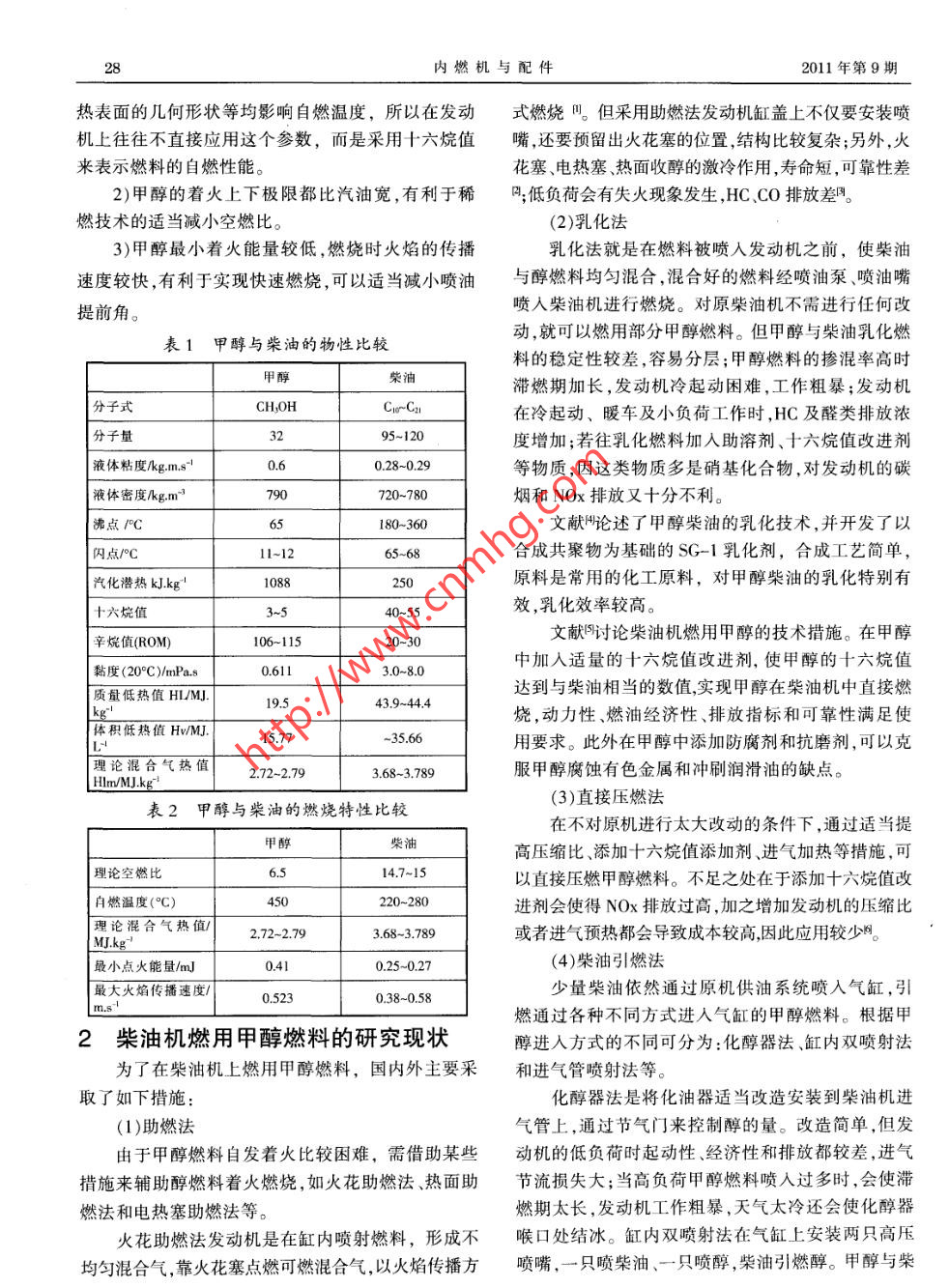 28內(nèi)燃機(jī)與配件2011年第9期熱表面的幾何形狀等均影響自燃溫度,所以在發(fā)動式燃燒"。但采用助燃法發(fā)動機(jī)缸蓋上不僅要安裝噴機(jī)上往往不直接應(yīng)用這個參數(shù),而是采用十六烷值嘴,還要預(yù)留出火花塞的位置,結(jié)構(gòu)比較復(fù)雜;另外,火來表示燃料的自燃性能?;ㄈ?、電熱塞熱面收醇的激冷作用,壽命短,可靠性差2)甲醇的著火上下極限都比汽油寬,有利于稀A;低負(fù)荷會有失火現(xiàn)象發(fā)生, HC .CO排放差園。燃技術(shù)的適當(dāng)減小空燃比。(2)乳化法3)甲醇最小著火能量較低,燃燒時火焰的傳播乳化法就是在燃料被噴人發(fā)動機(jī)之前,使柴油速度較快,有利于實(shí)現(xiàn)快速燃燒,可以適當(dāng)減小噴油與醇燃料均勻混合,混合好的燃料經(jīng)噴油泵、噴油嘴噴人柴油機(jī)進(jìn)行燃燒。對原柴油機(jī)不需進(jìn)行任何改提前角。動,就可以燃用部分甲醇燃料。但甲醇與柴油乳化燃表1甲醇與柴油的物性比較料的穩(wěn)定性較差,容易分層;甲醇燃料的摻混率高時甲醇柴油滯燃期加長,發(fā)動機(jī)冷起動困難,工作粗暴;發(fā)動機(jī)分子式CHOHCr-C21在冷起動、暖車及小負(fù)荷工作時,HC及醛類排放濃分子量3295-120度增加;若往乳化燃料加人助溶劑、十六烷值改進(jìn)劑液體粘度/kg.m.s-'0.60.28-0.29等物質(zhì),因這類物質(zhì)多是硝基化合物,對發(fā)動機(jī)的碳液體密度/kg.m"790720-780煙和NOx排放又十分不利。沸點(diǎn)PC65180-360文獻(xiàn)論述了甲醇柴油的乳化技術(shù),并開發(fā)了以閃點(diǎn)/°C11-1265-68合成共聚物為基礎(chǔ)的SG-1乳化劑,合成工藝簡單,汽化潛熱kJkg+1088250原料是常用的化工原料,對甲醇柴油的乳化特別有十六燒值3~540~55效,乳化效率較高。文獻(xiàn)9討論柴油機(jī)燃用甲醇的技術(shù)措施。在甲醇辛烷值(ROM)106-11520-30中加入適量的十六烷值改進(jìn)劑,使甲醇的十六烷值黏度(20°C)/mPa.s3.0~8.0達(dá)到與柴油相當(dāng)?shù)臄?shù)值,實(shí)現(xiàn)甲醇在柴油機(jī)中直接燃I質(zhì)量低熱值HLMJ19.543.9-44.4燒,動力性、燃油經(jīng)濟(jì)性、排放指標(biāo)和可靠性滿足使I體積低熱值Hv/MJ.15.77-35.66用要求。此外在甲醇中添加防腐劑和抗磨劑,可以克理論混合氣熱值2.72-2.793.68~3.789服甲醇腐蝕有色金屬和沖刷潤滑油的缺點(diǎn)。HIm/MJ.kg-t(3)直接壓燃法表2甲醇與柴油的燃燒特性比較在不對原機(jī)進(jìn)行太大改動的條件下,通過適當(dāng)提高壓縮比、添加十六烷值添加劑、進(jìn)氣加熱等措施,可理論空燃比6.514.7-15以直接壓燃甲醇燃料。不足之處在于添加十六烷值改自燃溫度(C)450220~280進(jìn)劑會使得NOx排放過高,加之增加發(fā)動機(jī)的壓縮比理論混合氣熱值/2.72- 2.793.68-3.789或者進(jìn)氣預(yù)熱都會導(dǎo)致成本較高,因此應(yīng)用較少間。MJkg'|最小點(diǎn)火能量/mJ0.410.25-0.27(4)柴油引燃法最大火焰?zhèn)鞑ニ俣?0.5230.38-0.58少量柴油依然通過原機(jī)供油系統(tǒng)噴人氣缸,引| m.s'_燃通過各種不同方式進(jìn)人氣缸的甲醇燃料。根據(jù)甲2柴油機(jī)燃用甲醇燃料的研究現(xiàn)狀醇進(jìn)人方式的不同可分為:化醇器法、缸內(nèi)雙噴射法為了在柴油機(jī)上燃用甲醇燃料,國內(nèi)外主要采和進(jìn)氣管噴射法等。取了如下措施:化醇器法是將化油器適當(dāng)改造安裝到柴油機(jī)進(jìn)(1)助燃法氣管上,通過節(jié)氣門來控制醇的量。改造簡單,但發(fā)由于甲醇燃料自發(fā)著火比較困難,需借助某些動機(jī)的低負(fù)荷時起動性.經(jīng)濟(jì)性和排放都較差,進(jìn)氣措施來輔助醇燃料著火燃燒,如火花助燃法、熱面助節(jié)流損失大;當(dāng)高負(fù)荷甲醇燃料噴人過多時,會使滯燃法和電熱塞助燃法等。燃期太長,發(fā)動機(jī)工作粗暴,天氣太冷還會使化醇器火花助燃法發(fā)動機(jī)是在缸內(nèi)噴射燃料,形成不喉口處結(jié)冰。缸內(nèi)雙噴射法在氣缸.上安裝兩只高壓均勻混合氣,靠火花塞點(diǎn)燃可燃混合氣,以火焰?zhèn)鞑シ絿娮?-只噴柴油一只噴醇,柴油引燃醇。甲醇與柴裴玉姣:甲醇在柴油機(jī)上應(yīng)用的技術(shù)進(jìn)展.29油比化醇器法容易控制,甲醇的摻燒率高,可以避免找代用燃料是國家經(jīng)濟(jì)發(fā)展的必然之路。經(jīng)專家長進(jìn)氣節(jié)流損失。氣缸蓋上安裝兩只高壓噴嘴,還要安期探索,目前認(rèn)為最有希望的柴油代用燃料是甲醇裝電熱塞,結(jié)構(gòu)復(fù)雜;高壓供給醇的系統(tǒng)偶件磨損嚴(yán)燃料,甲醇是現(xiàn)今唯一可以用煤及天然氣等作原料重;電控進(jìn)氣管噴射法在進(jìn)氣管安裝低壓噴嘴,噴人的大規(guī)模生產(chǎn)的經(jīng)濟(jì)的液體燃料,生產(chǎn)工藝成熟,儲醇形成預(yù)混合氣,進(jìn)入氣缸由柴油引燃??梢员苊饣媸褂梅奖恪N覈庇蜕贇?,煤炭和伴生與衍生碳?xì)浯计鞣ǖ墓?jié)流損失,可以精確控制醇的量,但小負(fù)荷氣體資源相對豐富,是替代石油的可靠資源。甲醇燃噴醇時,HC和醛類排放劇增,冷起動性能差”。料適合我國的燃料發(fā)展,對人體健康和生態(tài)環(huán)境安(5)甲醇/柴油組合燃料方式全已具有-定的生產(chǎn)和使用經(jīng)驗(yàn),綜合成本低。未來天津大學(xué)提出了柴油-甲醇組合燃燒(DMCC)系甲醇柴油燃料的發(fā)展趨勢主要是:統(tǒng)。DMCC發(fā)動機(jī)通過安裝在進(jìn