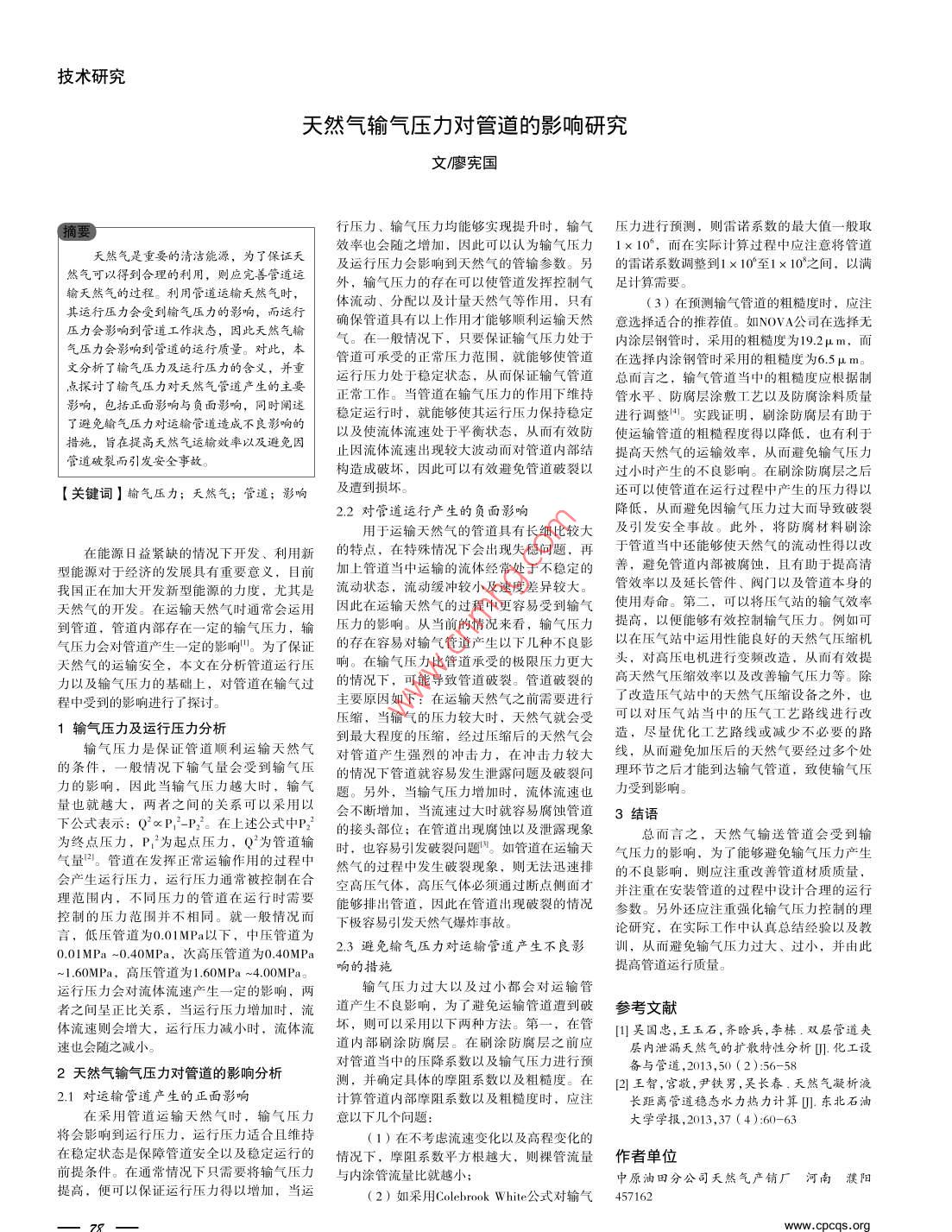 技術(shù)研究.天然氣輸氣壓力對管道的影響研究文廖憲國行壓力、輸氣壓力均能夠?qū)崿F(xiàn)提升時(shí),輸氣壓力進(jìn)行預(yù)測, 則雷諾系數(shù)的最大值一般取摘要天然氣是重要的清潔能源,為了保證天效率也會隨之增加,因此可以認(rèn)為輸氣壓力1x 10”,而在實(shí)際計(jì)算過程中應(yīng)注意將管道然氣可以得到合理的利用,則應(yīng)完善管道遠(yuǎn)及運(yùn)行壓力會影響到天然氣的管輸參數(shù)。另的雷諾系數(shù)調(diào)整到1x10^至1x10之間. 以滿輸天然氣的過程。利用管道運(yùn)輸天然氣時(shí),外,輸氣壓力的存在可以使管道發(fā)揮控制氣足計(jì)算需要。(3)在預(yù)測輸氣管道的粗糙度時(shí),應(yīng)注其運(yùn)行壓力會受到輸氣壓力的影響,而運(yùn)行體流動、分配以及計(jì)量天然氣等作用,只有壓力會影響到管道工作狀態(tài),因此天然氣輸確保管道具有以上作用才能夠順利運(yùn)輸天然意選擇適 合的推薦值。如NOV A公司在選擇無氣壓力會影響到管道的運(yùn)行質(zhì)量。對此,本氣。在一般情況下,只要保證輸氣壓力處于內(nèi)涂層鋼管時(shí), 采用的粗糙度為19.2μm,而文分析了輸氣壓力及運(yùn)行壓力的含義,并重管道可承受的正常壓力范圍,就能夠使管道在 選擇內(nèi)涂鋼管時(shí)采用的粗糙度為6.5μm。點(diǎn)探討了輸氣壓力對天然氣管道產(chǎn)生的主要運(yùn)行壓力處于穩(wěn)定狀態(tài),從而保證輸氣管道總面言之, 輸氣管道當(dāng)中的粗糙度應(yīng)根據(jù)制影響,包括正面影響與負(fù)面影響,同時(shí)闡述正常工作。當(dāng)管道在輸氣壓力的作用下維持管水平、 防腐層涂敷I藝以及防腐涂料質(zhì)量了避免輸氣壓力對運(yùn)輸管道造成不良影響的穩(wěn)定運(yùn)行時(shí),就能夠使其運(yùn)行壓力保持穩(wěn)定進(jìn)行調(diào)整"。 實(shí)踐證明,刷涂防腐層有助于措施,旨在提高天然氣運(yùn)輸效率以及避免因以及使流體流速處于平衡狀態(tài),從而有效防使 運(yùn)輸管道的相糙程度得以降低,也有利于止因流體流速出現(xiàn)較大波動而對管道內(nèi)部結(jié)提高 天然氣的運(yùn)輸效率,從而避免輸氣壓力管道破裂而引發(fā)安全事故。構(gòu)造成破壞,因此可以有效避免管道破裂以過 小時(shí)產(chǎn)生的不良影響。在刷涂防腐層之后[關(guān)鍵詞]輸氣壓力;天然氣;管道;影響及遭到損壞。還可以使管道在運(yùn)行過程中產(chǎn)生的壓力得以2.2對管道運(yùn)行產(chǎn)生的負(fù)面影響降低,從而避免因輸氣壓力過大而導(dǎo)致破裂用于運(yùn)輸天然氣的管道具有長細(xì)比較大及引發(fā)安全事故。此外,將防腐材料刷涂在能源日益緊缺的情況下開發(fā)、利用新的特點(diǎn), 在特殊情況F會出現(xiàn)失耀問題,再于管道當(dāng)中還能夠使天然氣的流動性得以改型能源對于經(jīng)濟(jì)的發(fā)展具有重要意義,目前加上管道當(dāng)中運(yùn)輸?shù)牧黧w經(jīng)常處于不穩(wěn)定的善, 避免管道內(nèi)部被腐蝕,且有助于提高清管效率以及延長管件、閥門以及管道本身的我國正在加大開發(fā)新型能源的力度,尤其是流動狀態(tài), 流動緩沖較小及速度差異較大。使用壽命。第二,可以將壓氣站的輸氣效率天然氣的開發(fā)。在運(yùn)輸天然氣時(shí)通常會運(yùn)用因此在運(yùn)輸天然氣的過程中更容易受到輸氣提高,以便能夠有效控制輸氣壓力。例如可到管道.管道內(nèi)部存在一定的輸氣壓力, 輸壓 力的影響。從當(dāng)前的情況來看,輸氣壓力以在壓氣站中運(yùn)用性能良好的天然氣壓縮機(jī)氣壓力會對管道產(chǎn)生- -定的影響"。為了保證的存在容易對輸氣管道產(chǎn)生以下幾種不良影頭,對高壓電機(jī)進(jìn)行變頻改造,從而有效提天然氣的運(yùn)輸安全,本文在分析管道運(yùn)行壓響。在輸氣壓力比管道承受的極限壓力更大高天然氣壓縮效率以及改善輸氣壓力等。除力以及輸氣限力的基礎(chǔ)上,對管道在輸氣過的情況下, 可能導(dǎo)致管道破裂。管道破裂的了改造壓氣站中的天然氣壓縮設(shè)備之外,也主要原因如下:在運(yùn)輸天然氣之前需要進(jìn)行程中受到的影響進(jìn)行了探討。壓縮,當(dāng)輸氣的壓力較大時(shí),天然氣就會受可以 對壓氣站當(dāng)中的壓氣工藝路線進(jìn)行改1輸氣壓力及運(yùn)行壓力分析到最大程度的壓縮,經(jīng)過壓縮后的天然氣會造,盡量優(yōu)化工藝路線或減少不必要的路輸氣壓力是保證管道順利運(yùn)輸天然氣對管道產(chǎn)生強(qiáng)烈的沖擊力,在沖擊力較大線,從而避免加壓后的天然氣要經(jīng)過多個(gè)處理環(huán)節(jié)之后才能到達(dá)輸氣管道,致使輸氣壓的條件,一般情況下輸氣量會受到輸氣壓的情況下管道就容易發(fā)生泄露問題及破裂問力受到影響。力的影響,因此當(dāng)輸氣壓力越大時(shí),輸氣題。 另外,當(dāng)輸氣壓力增加時(shí),流體流速也量也就越大,兩者之間的關(guān)系可以采用以會不斷增加,當(dāng)流速過大時(shí)就容易腐蝕管道3 結(jié)語下公式表示: Q°xP2-P2。 在上述公式中P?”的接頭部位:在管道出現(xiàn)腐蝕以及泄露現(xiàn)象總而言之,天然氣輸送管道會受到輸為終點(diǎn)壓力,P?為起點(diǎn)壓力。 Q為管道輸時(shí),也容易引發(fā)破裂問題"。如管道在運(yùn)輸天氣壓力的影響,為了能夠避