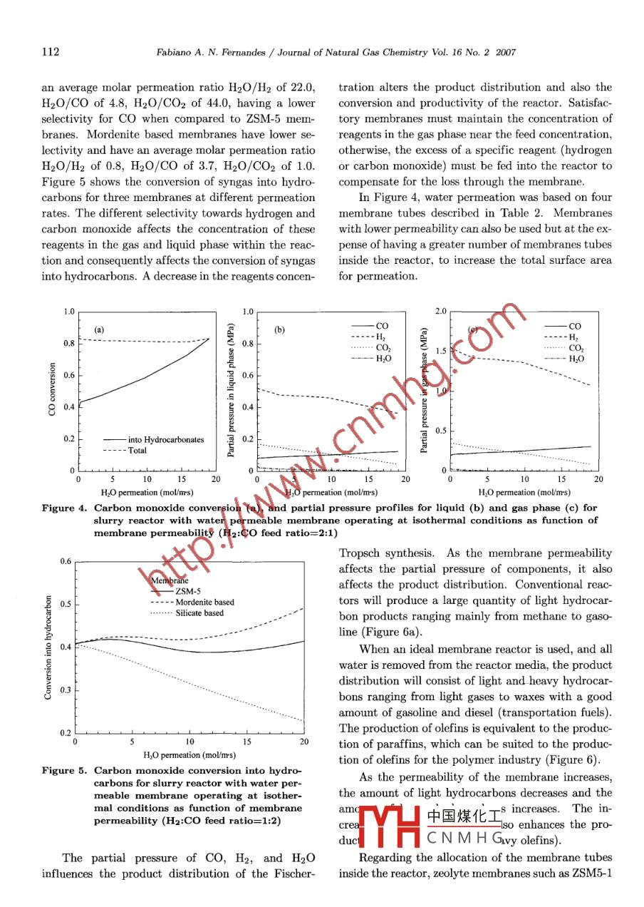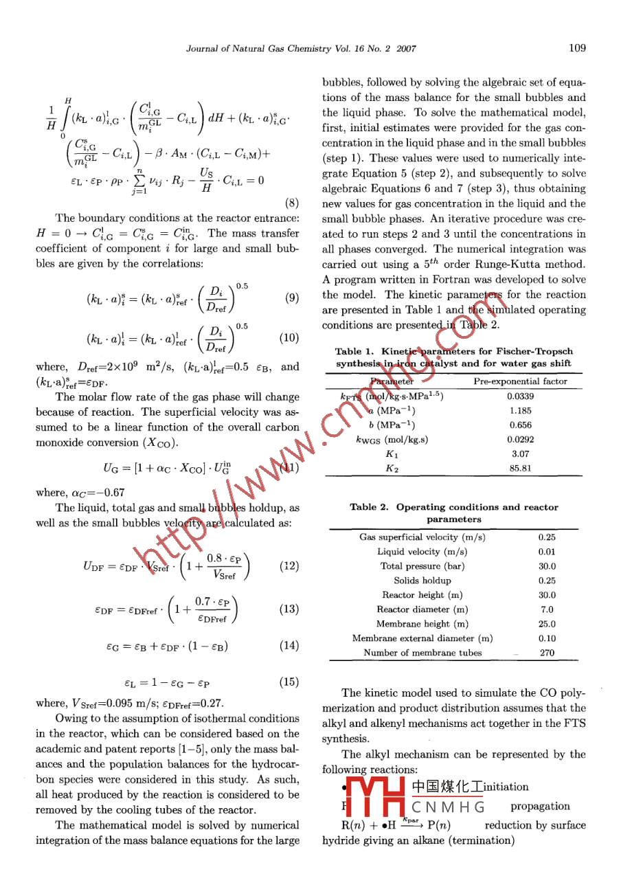 Available online at www.sciencedirect.comScienceDirect罵PJournal of NaturnlGs CemistyJournal of Natural Gas Chemistry 16(2007)107- 114SCIENCE PRESSArticleModeling of Fischer- Tropsch Synthesis in a Slurry Reactorwith Water Permeable MembraneFabiano A. N. Fernandes*Universidade Federal do Ceara, Departamento de Engenharia Quimica, Campus Universitario do Pici,Bloco 709, 60455- 760 Fortaleza- CE, Brazil[ Manuscript received April 25, 2007; revised May 16, 2007 ]Abstract: Fischer -Tropsch synthesis is an important chemical process for the production of liquidfuels and olefins. In recent years, the abundant availability of natural gas and the increasing demandof olefins, diesel, and waxes have led to a high interest to further develop this process. A mathematicalmodel of a slurry membrane reactor used for syngas polymerization was developed to simulate and comparethe maximum yields and operating conditions in the reactor with that in a conventional slurry reactor.The carbon polymerization was studied from a modeling point of view in a slurry reactor with a waterpermeable membrane and a conventional slurry reactor. Simulation results show that different parametersaffect syngas conversion and carbon product distribution, such as the hydrogen to carbon monoxide ratio,and the membrane parameters such as merbrane permeance.Key words: slurry reactor; membrane reactor; Fischer-Tropsch; modeling1. Introductionter gas shift reaction (WGS):CO+H2O←→CO2+H2Fischer-Tropsch synthesis (FTS) was discoverednearly 80 years ago, but until now, its applicationThe WGS reaction consumes part of the carbonin producing liquid fuels and other chemicals has notmonoxide that can be used by the FTS reaction and isbeen fully explored mainly due to economical reasons.therefore undesired. To minimize the WGS reaction,In recent years, FTS has become a subject of renewedthe choices are to reduce the amount of water availableinterest particularly in the context of the conversionin the reactor or to work with an excess of hydrogenof remote natural gas to liquid transportation fuelsto shift the equilibrium towards the reagents. An ex-and due to an escalate in oil price.cess of hydrogen in the reactor is not desired becauseNatural gas can be converted to carbon monox-it directly influences the product distribution and itide and bydrogen (synthesis gas) via the existingwill be difficult to change the product distribution inprocesses, such as steam reforming, carbon dioxidefavor of lower or higher hydrocarbon chains by justreforming, partial oxidation, and catalytic partial ox-changing the H2:CO ratio. The best solution will beidation, followed by the FT synthesis reaction:to eliminate or reduce the amount of water availablein the reactor. thus reducing the amount of carbonCO+(1 + m/2n)H2-→1/nCnHm +H20 (1dioxi中國煤化工action, or in the bestcaseYHC N M H Gtion from ocurring.When iron catalysts are used, the carbon monox-In uls btuy, a lliieliaiucal model of a slurryide polymerization occurs in combination with the wa-membrane reactor used for syngas polymerization was* Corresponding author. E-mail: fabiano@efftech.eng.br108Fabiano A. N. Fernandes / Journal of Natural Gas Chemistry Vol. 16 No.2 2007developed and the carbon monoxide polymerizationvan der Laan et al. [5], Maretto and Krishna [6],was studied from a modeling point of view in a slurryand Krishna and Sie [7]. To this basic mathematicalreactor with a water permeable membrane and in a model, the equations for water permeation throughconventional slury reactor, comparing the maximumthe membrane were added and studied. The basicyields and operating conditions in both reactors.assumptions made for the reactor were: steady-stateoperation, isothermal conditions, large bubbles flow2. Membrane reactorin plug flow regime due to its velocity, constant slurryvelocity, hydrocarbon products in the gas and in theThe bubble column slurry reactor consists of aliquid phases assumed to be in equilibrium at the re-tower where the synthesis gas and liquid phase (liq-actor outlet, negligible mass and heat transfer resis-uid+catalyst) are fed through the bottom of the col-tances between the catalyst and the liquid, the gas-umnn. The liquid phase is fed at very low velocitiesliquid mass transfer limitation located in the liquidso that the liquid products can be continuously with-phase, intrinsic kinetics for Fischer-Tropsch synthesisdrawn. The synthesis gas goes through the reactor asand water-gas shift reactions.bubbles and exchanges mass with the liquid phase. InThe kinetic model for the FTS reaction on an irona commercial process, the velocity of the gas is highcatalyst and for the WGS reaction are given as:enough to produce large and small bubbles, and thereactor operates at a heterogeneous regime or churn-Rprs =k.Pco. PR:5(3)turbulent flow regime. The slurry reactor is also pro-(1 +a. Pco +b. Poo2)2vided with thousands of cooling tubes or cooling coils,with a heat exchange surface that can be as high asPco2 : Pr20 m2 per m3 of the reactor [1]. The cooling tubeshwes. ( Pco : Pr2oK()are used to remove the heat released by the FTS reac-RwGs =.(Pco + K2. PH2o)2tion and to control the reactor temperature, ensuringthe isothermal conditions inside the reactor, in spiteThe gas-phase mass balance for component i inof the high heat of reaction (△H=- 170 kJ/mol CO)the large bubbles and the gas phase balance for com-[2-5].ponent i in the small bubbles are:Water permeable membrane tubes can also be in-serted in the reactor to remove the water produced bythe FTS reaction and to prevent the WGS reactiond(Uc - Upr).C,c+ (kL .a).Cic=(from occurring. A dry sweep gas flows continuouslydH|mei -C.inside the membrane tube and water permeates to the(5)inner tube through the membrane. A schematic rep-resentation of the membrane is provided in Figure 1.UpF「C%.cH(Ct,G -Ci,c)=(kx.a)片mgt -Ci,L(6)The mass balance for component i in the com-pletely mixed liquid phase is:HH2CH (kr.a),c .HI( mGLMembrane