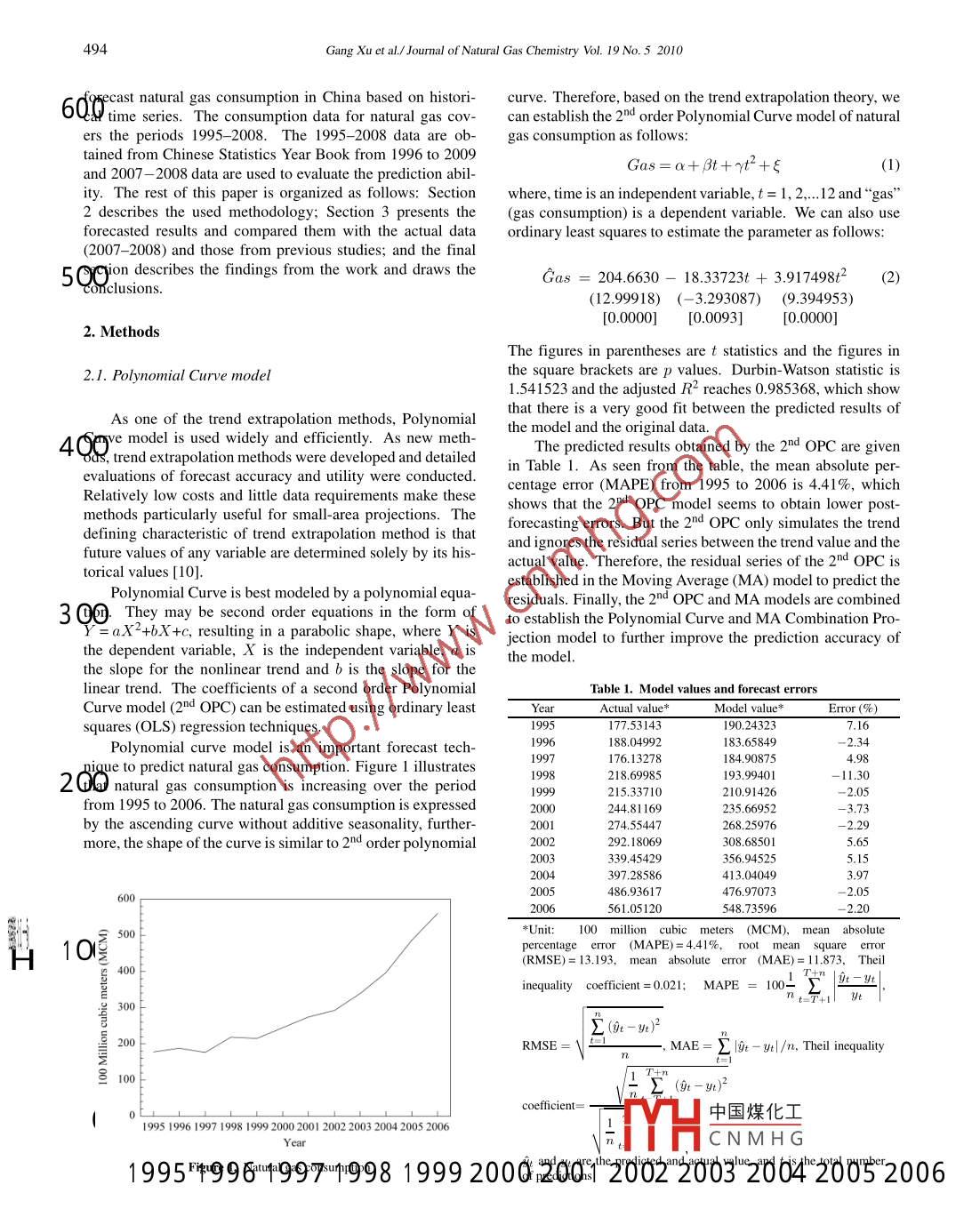 Availableonlineatwww.sciencedirect.comJoumal ofScience DirectNatural GasChemistryELSEVIERJournal of Natural Gas Chemistry 19(2010)493-496Forecasting China's natural gas consumptionbased on a combination modelGang Xu*, Weiguo Wang1. Dalian Institute of Chemical Physics, Chinese Academy of Sciences, Dalian 116023, Liaoning, China.2. College of Quantitative Economics, Dongbei University of Finance Economics, Dalian 116025, Liaoning, ChinaI Manuscript received March 19, 2010: revised April 28, 2010 1AbstractEnsuring a sufficient energy supply is essential to a country. Natural gas constitutes a vital part in energy supply and therefore forecastingnatural gas consumption reliably and accurately is an essential part of a countrys energy policy. Over the years, studies have shown that acombinative model gives better projected resultsed tomodel. Inthis study, we used Polynomial Curve and Moving AverageCombination Projection(PCMACP)model to esturalumption in China from 2009 to 2015. The new proposedPCMACP model shenore reliable and accurateItscentage Error (MAPE) is less than those of anymodels within the investigated range. accordingge annual growth rate will increase for the next 7 yearsthe amount of natural gas consunn will reagh 17 b0'millio2015 in CrKey wordsatural gas consumption; forecasting; combination mydel1. Introductionsearchers to create advanced natural gas consumption modelsto help make reliable and accurate projections of China,s fufossil fuel. The demand for natural gas has a significant im- policy decisione demand so as to provideNatural gas(NG)is the most efficient and clean burninggood governmentpact on national energy production, energy consumption, naThe models developed for forecasting energy consumptional economic growth and people's daily life. Natural gas tion including natural gas consumption can be split into tw:occupies 1/4 in global energy supply, furthermore, it will ex- types: the single method and the combinative method. Goddnaceed coal to become the second biggest sources of energy examples of the single method forecasting are Autoregresin the global economy and social development in 2010 [1]. Integrated Moving Average(ARIMA)model [2], cointegraChina has been paying a lot of attention to the development of tion and error-correction model (ECM)[3], time series modnatural gas. The"11th Five Year Plan"by State Development els [4], and partial Least Square Regression(PLSR)[5]. Theand Reform Committee proposed that the proportion of natu- non-linear nature of natural gas consumption tends to reduceral gas in the primary energy consumption will increase from the reliability of the single method models. For non-linearsys2.8% in 2005 to 5.3% in 2010, which means the demand for tems like natural gas consumption, combinative method fore-natural gas will almost double between 2005 and 2010. The casting gives more accurate results and is therefore more popgrowth in the demand for natural gas in China is now higher ular. Examples of combinative method forecasting are Greythan those for all the other energy sources including coal, oil, model and BP Neural Network combination model [6], dehydropower and other renewable energiesterminate and stochastic time series combination model [71Forecasting natural gas consumption constitutes a vital Bayesian combination model 181, Grey model and Artificialpart of energy policy of a country, and is also one of the most Neutral Network combination model [9],etcimportant policy tools used by the decision makers all overIn this study, we used the Polynomial Curve and Movingthe world. Therefore, it is very valuable for the academic re- Average Combination Projection (PCMACP)model toCorresponding author. Tel: 86-411-84379201; Fax: 86-411-84686597: E-mail: xugang@dicp acThis work was supported by the Youth Fund of Chinese Academy of Sciences Knowledge Innovat中國(guó)煤化工No.S2060andthe Innovation Team Project of Education Department of Liaoning Province(No. 2007T050)CNMHGCopyright@2010, Dalian Institute of Chemical Physics, Chinese Academy of Sciences. All rights reservedoi:10.1016S1003-9953(09)60100-6494Gang Xu et al Journal of Natural Gas Chemistry Vol. 19 No 5 201060enatural gas consumption in China based on histori- curve. Therefore, based on the trend extrapolation theory, weseries. The consumption data for natural gas cov- can establish the 2nd order Polynomial Curve model of naturers the periods 1995-2008. The 1995-2008 data are ob- gas consumption as followstained from Chinese Statistics Year book from 1996 to 2009and 2007-2008 data are used to evaluate the prediction abil-Gas=a+Bt+ot+sity. The rest of this paper is organized as follows: Section where, time is an independent variable, t= 1, 2,12 and"gas2 describes the used methodology; Section 3 presents the(gas consumption) is a dependent variable. We can also useforecasted results and compared them with the actual data ordinary least squares to estimate the parameter as follows(2007-2008)and those from previous studies; and the final5ooon describes the findings from the work and draws theGas=204.6630-18.33723t+3917498t2(2)Onclusions(12.99918)(-3.293087)(9.394953)[0.0000[0.0093]0.00002. MethodsThe figures in parentheses are t statistics and the figures in2. 1. Polynomial Curve modelthe square brackets are p values. Durbin-Watson statistic1.541523 and the adjusted R reaches 0.985368, which showAs one of the trend extrapolation methods, Polynomial that there is a very good fit between the predicted results of4@0e model is used widely and efficiently. As new meththe model and the original datatrend extrapolation methods were developed and detailedThe predicted results obtained by the 2 OPC are givenvaluations of forecast accuracy and utility were conducted. in Table 1. As seen from the table, thebsolute percentage error(MAPE) from 1995 to 2006 is 4.41%0, whichmethods particularly useful for small-area projections. The forecasting errors, But the 2nd opC only simulates the trenddefi