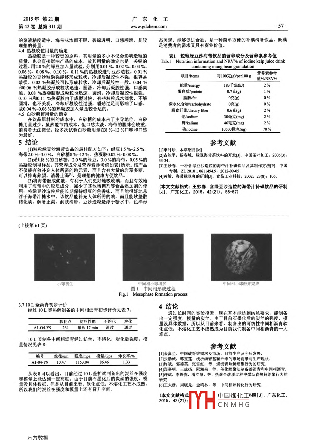 東化工15年第21期www.gdchem.com第42卷總第311期中間相瀝青調(diào)制一熱解楊建波(四川創(chuàng)越炭材料有限公司,四川閬中637400[摘要]文章采用以萘和三氟化硼與氟化氫為原料制備的齊聚物瀝青,研究齊聚物瀝青在中溫條件下通過熱縮聚制備出的低軟化點(diǎn),中間相含量高,紡絲性能良好的中間相瀝青,探討齊聚物瀝青調(diào)制的時(shí)間,熱縮聚反應(yīng)的時(shí)間以及熱縮聚反應(yīng)的溫度對于中間相瀝青的影響[關(guān)鍵詞]恭齊聚物;熱縮聚;中間相瀝青[中圖分類號]TQ[文獻(xiàn)標(biāo)識碼]A[文章編號]1007-1865(2015)21-006002Mesophase Pitch Modulation-pyrolysisYang Jianbo(Sichuan Chuangyue Carbon Materials Co, Ltd.,, Langzhong 637400, China)Abstract: In the paper, based on naphthalene and boron trifluoride oligomer asphalt with hydrogen fluoride as raw material preparation, research oligomerasphalt under the condition of medium temperature was prepared by thermal condensation of the low softening point, high content of mesophase, mesophase pitch,spinning the good performance of oligomer asphalt modulation time, thermal polycondensation reaction time and temperature for thermal polycondensation reactionfor the influence of mesophase pitchKeywords: naphthalene oligomer; pyrocondensation polymerization: mesophase pitch隨著現(xiàn)代科技的發(fā)展,國內(nèi)的復(fù)合材料產(chǎn)出和事業(yè)有海勃2試驗(yàn)部分之一。現(xiàn)如今我國對于炭纖維的需求國內(nèi)至今還無法滿足,還依2.1原料的制備賴于從日本,美國等進(jìn)口。為解決這一現(xiàn)狀,我國從20世紀(jì)70年所用原料:代中期就開始著手研究,經(jīng)過30余年的發(fā)展,從有到無,從研制到生產(chǎn)取得了一定的成績,但總的來說,國內(nèi)的研制和生產(chǎn)水平要原料分子量沸點(diǎn)℃灰分/pm純度還比較低精萘99%以上中間相瀝青是制備多種高級炭材料的優(yōu)質(zhì)原料,在高新材料20領(lǐng)域引起了廣泛關(guān)注。由于其具有較高的純度以及高芳香度所導(dǎo)致的高取向性是制備高性能炭纖維的一種優(yōu)良前驅(qū)體。經(jīng)過熔融BF紡絲工序后形成纖維,由于經(jīng)過噴絲板過程中中間相分子發(fā)生了甲苯9214110.6擇優(yōu)取向,使得分子取向排列方向平行于纖維軸。這種纖維再經(jīng)35.05過進(jìn)一步的氧化、炭化或石墨化處理可以制成具有高模量(>900GPa)和高強(qiáng)度(>4GPa)的纖維狀炭材料。此外,中間相瀝青基炭所用設(shè)備料在纖維軸向高的導(dǎo)電(電阻率僅為113pm)和導(dǎo)熱性能(熱導(dǎo)主要設(shè)備30L蒙乃爾釜水洗罐30L不銹鋼釜真空泵率可高達(dá)1200W(mK)中間相瀝青對原料均一性要求較高,純芳烴是比較滿意的原將一定量精萘和一定配比 BF3/HF催化劑加入30L蒙乃爾釜反料。萘由于具有以上特點(diǎn)我們選用泰為原料制備中間相瀝青。中應(yīng)一定時(shí)間后經(jīng)過水洗,蒸甲苯得到萘瀝青間相瀝青的制備可以分為萘瀝青的制備和熱解縮聚形成中間相的過程。我們利用萘作為原料,用 BF3/HF做催化劑制備萘瀝青。后22中間相瀝青制備所用原料:經(jīng)過熱解縮聚形成中間相瀝青。所以熱解縮聚行為的研究是制備中間相瀝青的步驟中另一個(gè)重要的環(huán)節(jié)。主要原料1熱解定義以及工藝原理1.1定義所用設(shè)備有機(jī)物在受熱時(shí)所發(fā)生的分解或分解和繼續(xù)的重合而生成最終產(chǎn)物的過程主要設(shè)備015L釜2L釜10L釜1.2熱解工藝加熱方式鹽浴加熱鋁瓦加熱鹽浴加熱兼瀝青加壓熱縮聚。熱縮聚瀝青中間相瀝青將一定量萘瀝青裝入熱解釜內(nèi)保壓一定時(shí)間,在保壓正常后升溫,在一定溫度下恒溫?zé)峤庖欢〞r(shí)間后再氮?dú)庾霰Wo(hù)氣下中間1.3熱解原理相轉(zhuǎn)化形成中間相瀝青。萘瀝青熱解主要分為劇烈熱分解階段和中間相形成階段。在劇烈分解阿萘瀝青主要是CH鍵的斷裂,產(chǎn)生輕組分有利于3試驗(yàn)分析和討論聚合成大分子化合物。中間相的形成過程是通過側(cè)鏈和氫脫除進(jìn)31萘瀝青聚合時(shí)間對熱解影響行的聚合為主的化學(xué)反應(yīng),其次是分子的物理重排。在萘瀝青熱對于原料萘瀝青的聚合時(shí)間對于熱解的影響,我們分別做縮聚形成中間相階段的過程中,瀝青的粘度越小,產(chǎn)生的中間相ah,3ah,來驗(yàn)證聚合程度對于萘瀝青熱解中間相轉(zhuǎn)化的影響。如球體較大,有利于中間相球體層片間借范德華力相互插入的物理重排過程,最后形成雜質(zhì)含量和缺陷都比較小的粗流線狀或廣域從表1可以看出,萘瀝青的聚合時(shí)間的長短對于中間相轉(zhuǎn)化在流線狀的中間相結(jié)構(gòu),從顯微照片中可明顯看出,完整的中間相相同時(shí)間內(nèi)的軒河越短,在相同時(shí)間大球體經(jīng)融并變形最后形成廣域流線狀結(jié)構(gòu)內(nèi)中間相轉(zhuǎn)中國煤化工CNMHG收稿日期]201509-02[作者簡介]楊建波(1987-),男,遂寧人,本科畢業(yè),從事瀝青基碳纖維行業(yè)2015年第21期廣東化工第42卷總第311期www.gdchem.com表1萘瀝青時(shí)間程度對于熱解影響Tab 1 Detalt time for pyrol樣品齊聚物聚合時(shí)間h熱解時(shí)間h熱解溫度℃熱解最大壓力Mpa中間相轉(zhuǎn)化時(shí)間hACA1-03-Y785以上Al-03-Y890以上A1-04-Y395以上3.2熱解溫度對于熱解的影響我們我們?nèi)绫?對于同一批次的萘瀝青,其熱解終溫對于其熱解影響的驗(yàn)證表2熱解溫度對于中間相轉(zhuǎn)化的影