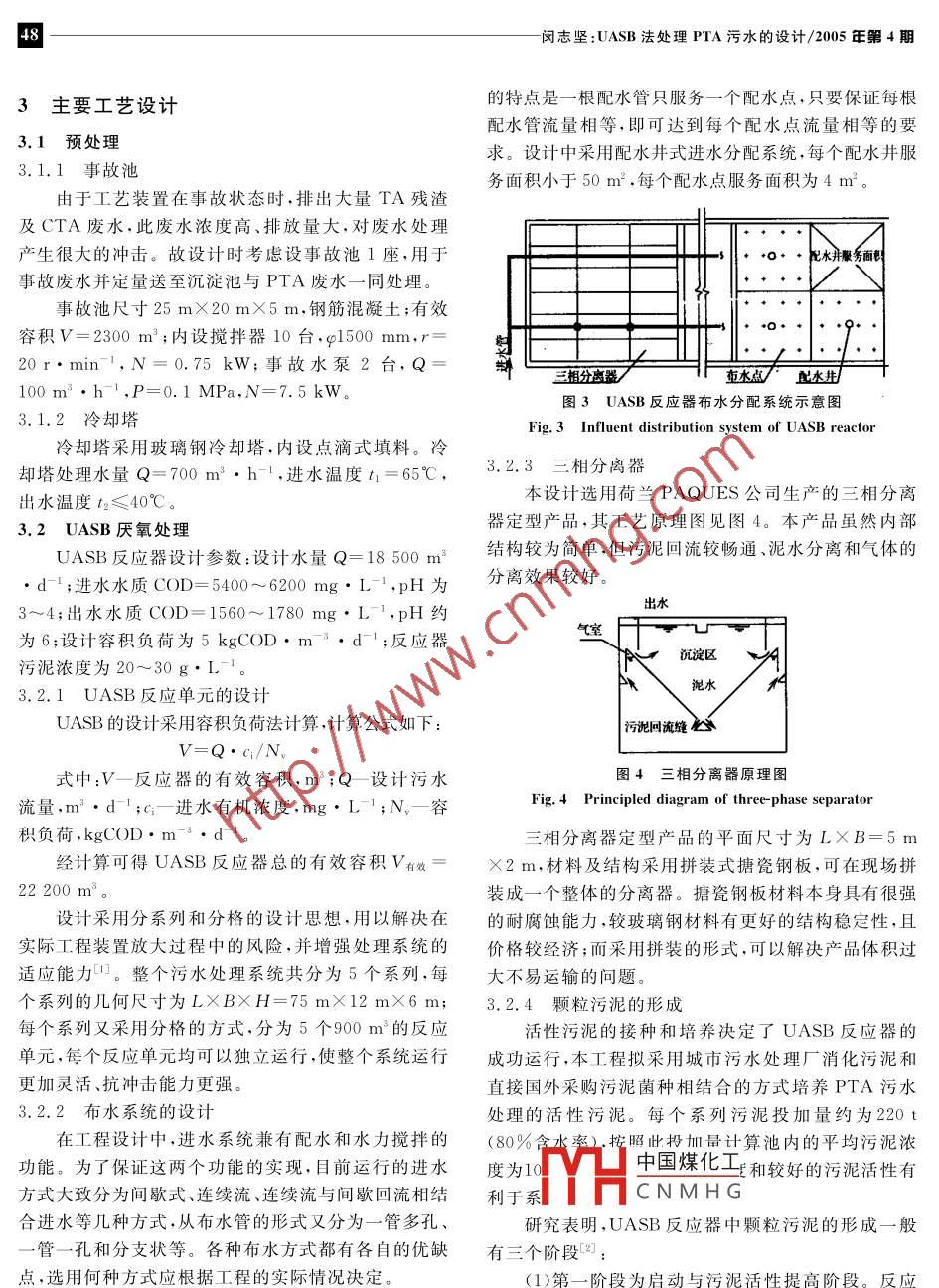 化學(xué)與生物工程2005,No.4-47Chemistry & BioengineeringUASB法處理PTA污水的設(shè)計(jì)閔志堅(jiān)(華中科技大學(xué)環(huán)境科學(xué)與工程系,湖北武漢430074)摘要:上流式厭氧污泥床(UASB)處理PTA污水可取得良好的效果,在工藝設(shè)計(jì)的過程中需要考慮到PTA污水在事故狀態(tài)下的收集和污水的水質(zhì)調(diào)節(jié);UASB厭氧系統(tǒng)的設(shè)計(jì)要注意處理單元的合理劃分、布水系統(tǒng)、三相分離器以及污泥培養(yǎng)四個(gè)方面的司題。關(guān)鍵詞:UASB;精對(duì)苯二甲酸;三相分離器;布水系統(tǒng);顆粒污泥中圖分類號(hào):X 783文獻(xiàn)標(biāo)識(shí)碼:A .文章編號(hào):1672一5425(2005)04一0047-03精對(duì)苯二甲酸(PTA)污水是化工行業(yè)中具有代18500m2●d-',污水處理前后水質(zhì)情況如表3:表性的可生物降解廢水,隨著石油化學(xué)工業(yè)的日益發(fā).表3污水處理指標(biāo).展,PTA廢水的處理已引起國(guó)內(nèi)外廣泛的重視,并作Tab.3Wastewater treatment indexes了大量的研究工作,取得了一定的進(jìn)展。采用預(yù)處.指標(biāo)COD/mg. L-1溫度/°C ss /mg. L-I理一厭氧一好氧技術(shù)工藝處理PTA廢水,可取得良.進(jìn)水水質(zhì)7500~ 83004~545~60好的效果。出水水質(zhì)<3006~9<40< 150PTA污水特性1.2預(yù)處理復(fù)雜由于PTA生產(chǎn)過程均是在高溫高壓的條件下進(jìn)1.1 可生物降解性差PTA生產(chǎn)過程[包括對(duì)苯二甲酸(TA )生產(chǎn)與精制的行,因此需對(duì)PTA污水進(jìn)行冷卻,以保證進(jìn)入生物處.所有過程]排放的廢水,除TA為主要有機(jī)物外,還有相當(dāng)理的污水溫度在40°C以下。污水在進(jìn)人生物處理系濃度的對(duì)二甲苯、苯甲酸、甲苯甲酸以及其它有機(jī)物,這統(tǒng)之前,應(yīng)盡可能地將污水中的TA去除,以減輕后續(xù)些有機(jī)物均為結(jié)構(gòu)較為穩(wěn)定的苯系物,較難生物降解。生物處理的有機(jī)負(fù)荷,提高污水的可生化性。PTA工藝生產(chǎn)排放水質(zhì)及水量、主要組分見表.2污水處理流程1、表2。PTA污水處理工藝流程如圖1.圖2。表1PTA污水水質(zhì)及水量去生化處理Tab.1Quality and flux of PTA wastewaterPTA汽李醫(yī)合集水用+[ 冷卻塔]大平流沉淀泄JTA裝置流量/m3.h-1 COD/mg.L-1 pH 值排放形式CTA汽本$放池+混合反應(yīng)池[ 東縮池]PTA工藝40068003~4連續(xù)CTA工藝200150001~14間斷HPO,國(guó)時(shí)開過濾器水處理2:~ 120000 .2~4圖1PTA污水預(yù)處理流程框圖其它655Fig.1 The process of PTA wastewater注:CTA--對(duì)苯 二甲酸的工藝半成品生活及其它污水傾處理出水表2PTA污水主要組分[調(diào)節(jié)泗- -ASB反應(yīng)器- +級(jí)接觸氧化池Tab.2Main components of PTA wastewater苯甲酸對(duì)甲苯甲酸間苯二甲酸基本酸Ca2+C沉池]←[級(jí)接觸氧化洄一 -中沉池]組分發(fā)%mg.中國(guó)煤化工+出水達(dá)標(biāo)排放含量20~3030~4015~304~15< 1500MYHCNMHG8B-→污泥外排圖2PTA污水生化處理流程框圖綜合以上排水情況可得PTA污水設(shè)計(jì)總水量為Fig.2 The process of PTA wastewater biochemical treatment收稿日期:2005-01- 13作者簡(jiǎn)介:閔志堅(jiān)(1973- ),男,湖北武漢人,高級(jí)工程師,研究生在讀,研究方向:工業(yè)污水處理。48-閔志堅(jiān):UASB法處理PTA污水的設(shè)計(jì)/2005年第4期的特點(diǎn)是一根配水管只服務(wù)一個(gè)配水點(diǎn),只要保證每根3主要工藝設(shè)計(jì)配水管流量相等,即可達(dá)到每個(gè)配水點(diǎn)流量相等的要3.1預(yù)處理求。設(shè)計(jì)中采用配水井式進(jìn)水分配系統(tǒng),每個(gè)配水井服3.1.1事故池務(wù)面積小于50 m2 ,每個(gè)配水點(diǎn)服務(wù)面積為4 m'。由于工藝裝置在事故狀態(tài)時(shí),排出大量TA殘?jiān)癈TA廢水,此廢水濃度高、排放量大,對(duì)廢水處理產(chǎn)生很大的沖擊。故設(shè)計(jì)時(shí)考慮設(shè)事故池1座,用于2水井服務(wù)面糧事故廢水并定量送至沉淀池與PTA廢水一同處理。事故池尺寸25 mX20 mX5 m,鋼筋混凝土;有效容積V=2300 m3 ;內(nèi)設(shè)攪拌器10 臺(tái),p1500 mm,r=20r●min-',N=0.75kW;事故水泵2臺(tái),Q=線三相分離器布水點(diǎn)廠配水井100 m3●h-',P=0. 1 MPa,N=7.5 kW。圖3UASB反應(yīng)器布水分配系統(tǒng)示意圖3.1.2 冷卻塔Fig.3 Influent distribution system of UASB reactor冷卻塔采用玻璃鋼冷卻塔,內(nèi)設(shè)點(diǎn)滴式填料。冷卻塔處理水量Q=700 m’●h-',進(jìn)水溫度t= 65°C,3.2.3三相分離 器本設(shè)計(jì)選用荷蘭PAQUES公司生產(chǎn)的三相分離出水溫度tr≤40°C。器定型產(chǎn)品,其工藝原理圖見圖4。本產(chǎn)品雖然內(nèi)部3.2 UASB 厭氧處理UASB反應(yīng)器設(shè)計(jì)參數(shù):設(shè)計(jì)水量Q=18 500 m2結(jié)構(gòu)較為簡(jiǎn)單,但污泥回流較暢通、泥水分離和氣體的●d-';進(jìn)水水質(zhì)COD= 5400~6200 mg. L-',pH為分離效果較好。出水3~4;出水水質(zhì)COD= 1560~1780 mg●L-',pH約為6;設(shè)計(jì)容積負(fù)荷為5 kgCOD●m3●d-';反應(yīng)器沉淀區(qū)污泥濃度為20~30g. L。淝水3.2.1 UASB 反應(yīng)單元的設(shè)計(jì)UASB的設(shè)計(jì)采用容積負(fù)荷法計(jì)算,計(jì)算公式如下:污淝回流縫公V=Q. c/N,式中:V一反應(yīng)器的有效容積,m2;Q-設(shè)計(jì)污水 .圖4三相分離器原理圖Fig. 4 Principled diagram of threephase separator流量,m’●d~';c;-進(jìn)水有機(jī)濃度,mg●L-1;N,-容積負(fù)荷,kgCOD. m-3●d-'三相分離器定型