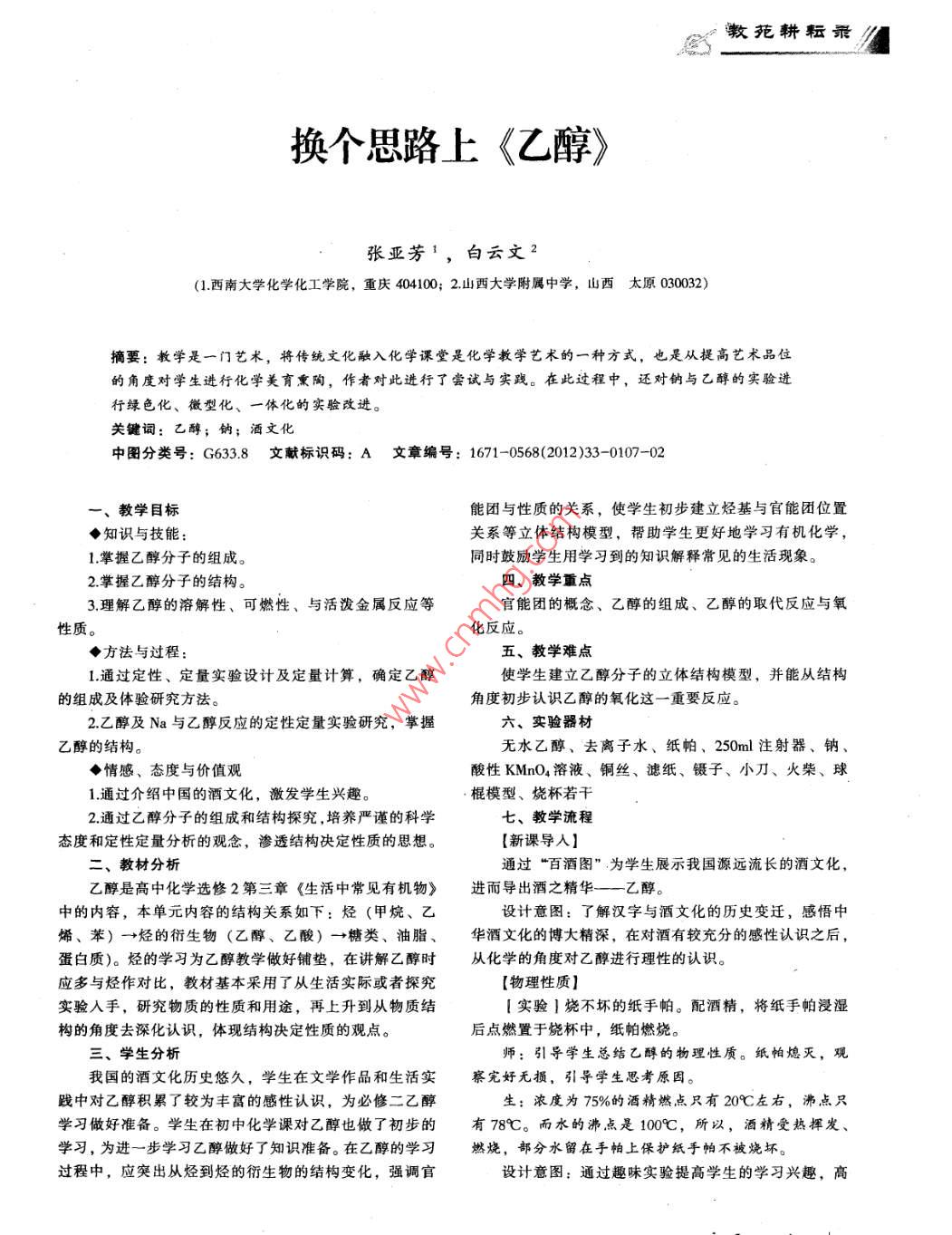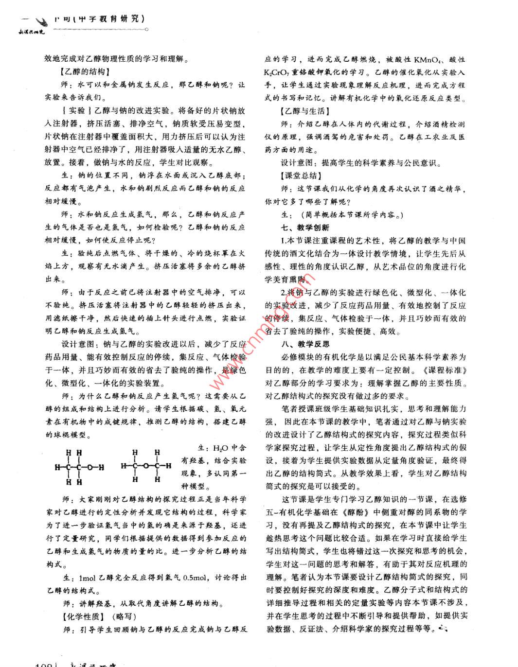 耕耘錄換個思路上《乙醇》張亞芳1,白云文2(1.西南大學(xué)化學(xué)化工學(xué)院,重慶404100;2山西大學(xué)附屬中學(xué),山西太原030032)摘要:教學(xué)是一門藝術(shù),將傳統(tǒng)文化融入化學(xué)課堂是化學(xué)教學(xué)藝術(shù)的一種方式,也是從提高藝術(shù)品位的角度對學(xué)生進(jìn)行化學(xué)美育熏陶,作者對此進(jìn)行了嘗試與實踐。在此過程中,還對鈉與乙醇的實驗進(jìn)行綠色化、微型化、一體化的實驗改進(jìn)。關(guān)鍵詞:乙醇;鈉;酒文化中圖分類號:G633.8文獻(xiàn)標(biāo)識碼:A文章編號:1671-0568(201233-0107-02一、教學(xué)目標(biāo)能團(tuán)與性質(zhì)的關(guān)系,使學(xué)生初步建立烴基與官能團(tuán)位置◆知識與技能:關(guān)系等立體結(jié)構(gòu)模型,幫助學(xué)生更好地學(xué)習(xí)有機化學(xué),1掌握乙醇分子的組成。同時鼓勵學(xué)生用學(xué)習(xí)到的知識解釋常見的生活現(xiàn)象2掌握乙醇分子的結(jié)構(gòu)。四、教學(xué)重點3理解乙醇的溶解性、可燃性、與活潑金屬反應(yīng)等官能團(tuán)的概念、乙醇的組成、乙醇的取代反應(yīng)與氧性質(zhì)化反應(yīng)?!舴椒ㄅc過程:五、教學(xué)難點1.通過定性、定量實驗設(shè)計及定量計算,確定乙醇使學(xué)生建立乙醇分子的立體結(jié)構(gòu)模型,并能從結(jié)構(gòu)的組成及體驗研究方法。角度初步認(rèn)識乙醇的氧化這一重要反應(yīng)。2.乙醇及Na與乙醇反應(yīng)的定性定量實驗研究,掌握六實驗器材乙醇的結(jié)構(gòu)。無水乙醇、去離子水、紙帕、250ml注射器、鈉、◆情感、態(tài)度與價值觀酸性KMnO4溶液、銅絲、濾紙、鑷子、小刀、火柴、球1通過介紹中國的酒文化,激發(fā)學(xué)生興趣。棍模型、燒杯若干2通過乙醇分子的組成和結(jié)構(gòu)探究,培養(yǎng)嚴(yán)謹(jǐn)?shù)目茖W(xué)七、教學(xué)流程態(tài)度和定性定量分析的觀念,滲透結(jié)構(gòu)決定性質(zhì)的思想?!拘抡n導(dǎo)入】二、教材分析通過“百酒圖”為學(xué)生展示我國源遠(yuǎn)流長的酒文化,乙醇是高中化學(xué)選修2第三章《生活中常見有機物》進(jìn)而導(dǎo)出酒之精華乙醇。中的內(nèi)容,本單元內(nèi)容的結(jié)構(gòu)關(guān)系如下:烴(甲烷、乙設(shè)計意圖:了解漢字與酒文化的歷史變遷,感悟中烯、苯)→烴的衍生物(乙醇、乙酸)→糖類、油脂、華酒文化的博大精深,在對酒有較充分的感性認(rèn)識之后,蛋白質(zhì))。烴的學(xué)習(xí)為乙醇教學(xué)做好鋪墊,在講解乙醇時從化學(xué)的角度對乙醇進(jìn)行理性的認(rèn)識。應(yīng)多與烴作對比,教材基本采用了從生活實際或者探究【物理性質(zhì)】實驗入手,研究物質(zhì)的性質(zhì)和用途,再上升到從物質(zhì)結(jié)實驗】燒不壞的紙手帕。配酒精,將紙手帕浸濕構(gòu)的角度去深化認(rèn)識,體現(xiàn)結(jié)構(gòu)決定性質(zhì)的觀點。后點燃置于燒杯中,紙帕燃燒。三、學(xué)生分析師:引導(dǎo)學(xué)生總結(jié)乙醇的物理性質(zhì)。紙帕熄滅,觀我國的酒文化歷史悠久,學(xué)生在文學(xué)作品和生活實察完好無損,引導(dǎo)學(xué)生思考原因。踐中對乙醇積累了較為豐富的感性認(rèn)識,為必修二乙醇生:濃度為75%的酒精燃點只有20℃左右,沸點學(xué)習(xí)做好準(zhǔn)備。學(xué)生在初中化學(xué)課對乙醇也做了初步的有78℃。而水的沸點是00℃,所以,酒精受熱揮發(fā)、學(xué)習(xí),為進(jìn)一步學(xué)習(xí)乙醇做好了知識準(zhǔn)備。在乙醇的學(xué)習(xí)燃燒,部分水留在手帕上保護(hù)紙手帕不被燒壞過程中,應(yīng)突出從烴到烴的衍生物的結(jié)構(gòu)變化,強調(diào)官設(shè)計意圖:通過趣味實驗提高學(xué)生的學(xué)習(xí)興趣,高子育研究)效地完成對乙醇物理性質(zhì)的學(xué)習(xí)和理解。應(yīng)的學(xué)習(xí),進(jìn)而完成乙醇燃燒,被酸性KMnO4、酸性【乙醇的結(jié)構(gòu)】K2CrO重鉻酸鉀氧化的學(xué)習(xí)。乙醇的催化氧化從實驗入師:水可以和金屬鈉發(fā)生反應(yīng),那乙醇和鈉呢?讓手,讓學(xué)生通過實驗現(xiàn)象理解反應(yīng)機理,進(jìn)而完成方程實驗來告訴我們。式的書寫和記憶。講解有機化學(xué)中的氧化還原反應(yīng)類型?!緦嶒炓掖寂c鈉的改進(jìn)實驗。將備好的片狀鈉放【乙醇與生活】注射器,擠壓活塞、排凈空氣,鈉質(zhì)軟受壓易變型,師:介紹乙醇在人體內(nèi)的代謝過程,介紹酒精檢測片狀鈉在注射器中覆蓋面積大,用力擠壓后可以認(rèn)為注儀的原理,強調(diào)酒駕的危害和處罰乙醇在工農(nóng)業(yè)及醫(yī)射器中空氣已經(jīng)排凈了,用注射器吸入適量的無水乙醇、藥方面的用途放置。接著,做鈉與水的反應(yīng),學(xué)生對比觀察。設(shè)計意圖:提高學(xué)生的科學(xué)素養(yǎng)與公民意識。生:鈉的位置不同,鈉浮在水面或沉入乙醇底部;【課堂總結(jié)】反應(yīng)都有氣泡產(chǎn)生,水和鈉劇烈反應(yīng)而乙醇和鈉的反應(yīng)師:這節(jié)課我們從化學(xué)的角度再次認(rèn)識了酒之精華,相對緩慢。你對它多了哪些了解呢?師:水和鈉反應(yīng)生成氫氣,那么,乙醇和鈉反應(yīng)產(chǎn)生:(簡單概括本節(jié)課所學(xué)內(nèi)容。)生的氣體是否也是氫氣,如何檢驗?zāi)?乙醇和鈉的反應(yīng)七、教學(xué)創(chuàng)