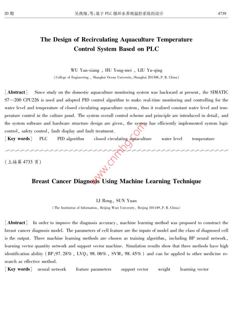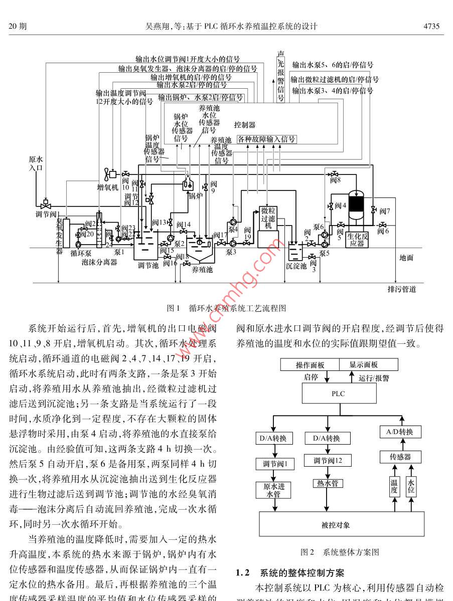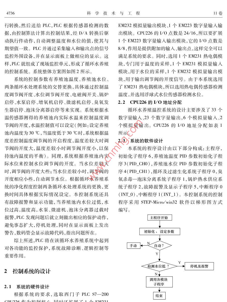 第11卷第20期20l年7月科學(xué)技術(shù)與工程Vol 11 No 20 July 2011671-1815(2011)20-4734-0nce lechnologyngneerInC2011 Sci Tech. Engng農(nóng)業(yè)科學(xué)基于PLC循環(huán)水養(yǎng)殖溫控系統(tǒng)的設(shè)計(jì)吳燕翔胡詠梅劉雨青(上海海洋大學(xué)工程學(xué)院,上海201306)摘要針對(duì)目前國(guó)內(nèi)水產(chǎn)養(yǎng)殖監(jiān)控系統(tǒng)較落后的研究現(xiàn)狀,設(shè)計(jì)了采用西門子7—200PLC的循環(huán)水養(yǎng)殖溫控系統(tǒng),采用PD控制算法,對(duì)養(yǎng)殖池的水位和溫度進(jìn)行實(shí)時(shí)監(jiān)控,實(shí)現(xiàn)養(yǎng)殖池溫度和水位的恒定控制。詳細(xì)介紹了系統(tǒng)的整體控制方案工作原理,并給出了系統(tǒng)的軟、硬件結(jié)構(gòu)設(shè)計(jì),有效地實(shí)現(xiàn)了系統(tǒng)的邏輯控制、安全控制、故障顯示及故障處理。關(guān)健詞 PLC PID算法循環(huán)水養(yǎng)殖系統(tǒng)水位溫度中圖法分類號(hào)S951.41TP273.1;文獻(xiàn)標(biāo)志碼A近年來(lái),國(guó)外水產(chǎn)養(yǎng)殖的技術(shù)發(fā)展較快,在水位進(jìn)行實(shí)時(shí)監(jiān)控,實(shí)現(xiàn)養(yǎng)殖池溫度和水位的恒定體消毒、凈化,池底排污,增氧及控溫方面,幾乎采控制。用了現(xiàn)代所有可以引用的先進(jìn)技術(shù),水產(chǎn)養(yǎng)殖已經(jīng)達(dá)到相當(dāng)高的自動(dòng)化程度1。但我國(guó)漁業(yè)現(xiàn)代化1系統(tǒng)的工藝設(shè)計(jì)和整體控制方案起步較晩,現(xiàn)代化水產(chǎn)養(yǎng)殖應(yīng)具備的高溶氧、控溫水質(zhì)凈化技術(shù)還比較落后,而從國(guó)外直接引進(jìn)現(xiàn)代1.1工藝設(shè)計(jì)化的養(yǎng)殖設(shè)備和控制系統(tǒng)價(jià)格高,運(yùn)行成本高2本系統(tǒng)采用循環(huán)水養(yǎng)殖系統(tǒng)的工藝36,結(jié)合在國(guó)內(nèi)無(wú)法推廣普及。因此,研制一種適合于我國(guó)水處理技術(shù),實(shí)現(xiàn)高密度養(yǎng)殖并節(jié)約水資源,與傳的水產(chǎn)養(yǎng)殖監(jiān)控系統(tǒng)具有十分重要的實(shí)際意義。統(tǒng)養(yǎng)殖模式相比,具有明顯的優(yōu)勢(shì),是一種環(huán)保型在水體循環(huán)的養(yǎng)殖系統(tǒng)中,需要監(jiān)測(cè)或控制的水質(zhì)節(jié)水型、高產(chǎn)值的養(yǎng)殖模式。主要由魚類養(yǎng)殖池、參數(shù)很多,其中溫度會(huì)影響許多其他的水質(zhì)參數(shù),調(diào)節(jié)池、循環(huán)水處理系統(tǒng)(包括微粒過(guò)濾機(jī)、沉淀所以溫度是一個(gè)很重要的參數(shù),也是本系統(tǒng)監(jiān)測(cè)和池水處理生化反應(yīng)器、泡沫分離—臭氧消毒裝控制研究的重點(diǎn)。置、增氧裝置)、鍋爐熱水供應(yīng)系統(tǒng)等功能單元組基于PC在工業(yè)控制系統(tǒng)中的良好應(yīng)用,本文成。該系統(tǒng)有60m2(1.2m×10m×5m)魚池1將S7200C用于水產(chǎn)養(yǎng)殖控制系統(tǒng)中。整個(gè)系個(gè),循環(huán)水處理系統(tǒng)1套,自來(lái)水作為綜合系統(tǒng)的原統(tǒng)的工作原理為:從控制現(xiàn)場(chǎng)傳感器送來(lái)的(4—水;放魚前,系統(tǒng)運(yùn)行2周,采用自然掛膜方法使生20)mA或(05)V的標(biāo)準(zhǔn)信號(hào)經(jīng)過(guò)AD轉(zhuǎn)換模塊化反應(yīng)器內(nèi)的濾料形成凈化功能選擇體質(zhì)健康送到現(xiàn)場(chǎng)控制單元(PC),經(jīng)過(guò)PID運(yùn)算后形成控?zé)o外傷的羅非魚作為研究對(duì)象。工藝流程圖如圖1制信號(hào),控制信號(hào)再經(jīng)過(guò)D/A轉(zhuǎn)換模塊返送到現(xiàn)場(chǎng)所示。執(zhí)行單元(調(diào)節(jié)閥或電磁閥),對(duì)養(yǎng)殖池的溫度和水2011年3月22日收到上海市教育委員會(huì)科研創(chuàng)新項(xiàng)目(09YZ273)資助期吳燕翔,等:基于PC循環(huán)水養(yǎng)殖溫控系統(tǒng)的設(shè)計(jì)4735輸出水位調(diào)節(jié)閥1開度大小的信號(hào)輸出臭氧發(fā)生器、泡沫分離器的啟停的信號(hào)光輸出水泵5、6的啟停信號(hào)出增氧機(jī)的啟停的信號(hào)警輸出微粒過(guò)濾機(jī)的啟停信號(hào)信輸出水泵3、4的啟停信號(hào)開度木小的信號(hào)輸出鍋爐、水泵2后停號(hào)養(yǎng)殖池鍋爐控制器養(yǎng)殖池種故降輸入信號(hào)器原水入口增氧機(jī)閥4調(diào)節(jié)閥閥7目循環(huán)泵泡沫分離器地面調(diào)節(jié)池閥養(yǎng)殖池淀污管道圖1循環(huán)水養(yǎng)殖系統(tǒng)工藝流程圖系統(tǒng)開始運(yùn)行后,首先,增氧機(jī)的岀口電磁閥閥和原水進(jìn)水口調(diào)節(jié)閥的開啟程度,經(jīng)調(diào)節(jié)后使得10、119、8開啟,增氧機(jī)啟動(dòng)。其次,循環(huán)水處理系養(yǎng)殖池的溫度和水位的實(shí)際值跟期望值一致。統(tǒng)啟動(dòng),循環(huán)通道的電磁閥247、14、17、19開啟,作面板顯示面板循環(huán)水系統(tǒng)啟動(dòng),此時(shí)有兩條支路,一條是泵3開始啟停個(gè)運(yùn)行報(bào)警啟動(dòng),將養(yǎng)殖用水從養(yǎng)殖池抽出,經(jīng)微粒過(guò)濾機(jī)過(guò)濾后送到沉淀池;另一條支路是當(dāng)系統(tǒng)運(yùn)行了一段時(shí)間,水質(zhì)凈化到一定程度,不存在大顆粒的固體懸浮物時(shí)采用,由泵4啟動(dòng),將養(yǎng)殖池的水直接泵給AD轉(zhuǎn)換D/A轉(zhuǎn)換沉淀池。由經(jīng)驗(yàn)值可知,這兩條支路4h切換一次。傳感器然后泵5自動(