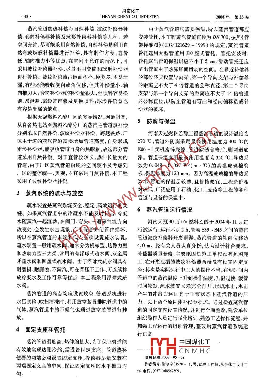 第7期謝曉宇等:30萬a燃料乙醇蒸汽管道的設計4730萬t/a燃料乙醇蒸汽管道的設計謝曉字,張帆,趙國卿(1.河南省化工設計院有限公司,河南鄭州450052;2.鄭州交通運輸管理處,河南鄭州450000摘要:以30萬υ/a燃料乙醇工程為例,探討了蒸汽管道材質的選取、敷設、熱力補償、固定攴座、防腐與保溫部分在實際運行中出現(xiàn)的問題及解決的辦法。關鍵詞:蒸汽管道;熱力補償;疏水裝置中圖分類號:TQ223.122文獻標識碼:B文章編號:1003-3467(20607-0047-02蒸汽作為一種環(huán)保、易控制、高效的熱介質,已蒸汽管道敷設方式一般分為地上敷設和地下敷廣泛應用于石油、化工、冶金、醫(yī)藥等各個工業(yè)領域。設,地上敷設即架空敷設,按高度可分為高(h≥4本文以河南天冠30萬ta燃料乙醇工程為例,對蒸m)、中(h=2~4m)、低(h=0.3~1.0m)支架架空汽管道系統(tǒng)的設計進行探討。敷設形式。如跨越廠區(qū)主干道,則主干道上方管廊與地面的凈距離不得小于5.0m。地下敷設分為地1供熱管道概況溝敷設和直埋敷設,由于地溝敷設投資較高、容易積河南天冠30萬ta燃料乙醇工程供熱干管(介水、蒸汽冷凝水不便排出,直埋敷設管道保溫結構比質為過熱蒸汽)全長2500多米,管道的輸送能力為較復雜、不便維護管理、工程造價較高,目前蒸汽管55-75t/h,設計溫度為270℃,設計壓力為1.0道敷設主要以架空敷設為主。天冠30萬t/a燃料MPa。由于壓力不高,故管道釆用兩根DM00的焊乙醇工程整個廠區(qū)地勢平坦,故蒸汽主管道采取架接鋼管,一用一備。介質為過熱蒸汽,溫度較高,材空敷設,蒸汽管道布置在管廊的最上層,蒸汽支管自質選用推薦使用溫度為-20-430℃的20G碳素主管的上部或水平接出,在蒸汽主管上每隔200m鋼設置了一個分液包。架空敷設具有投資低、運行穩(wěn)2蒸汽管道的敷設和熱補償定可靠、易于冷凝水的回收利用、便于維護管理等優(yōu)點2.1蒸汽管道的敷設2.2蒸汽管道的熱補償表4減二線與減四線100℃下混合實測對數(shù)計算及數(shù)學模型粘度計算對比對數(shù)計算誤差數(shù)學模型誤差誤差減少幅度Z3所占比例粘度/mm2·s實測值對數(shù)計算值優(yōu)化擬合值%1.014.1714.1700.811.6611.30-0.350.64.170.1730.48020.4322.9386.2982.075.3515.351注:對數(shù)計算誤差利用式(1)計算,數(shù)學模型誤差利用式(4)計算。礎油的K值,就可以利用方程(2)進行粘度的計算。比,計算的粘度數(shù)值為1290mm2/s,實際數(shù)值為3工業(yè)應用情況中國煤化竿誤差最大降低8.59%降低4%。以本項目的成果成功用于指導我廠的CD級柴參考文CNMHG油機油的生產(chǎn),各添加劑也按方程式計算粘度計算1]林世雄石油煉制工程[M].第2版,北京;石油工業(yè)采用兩兩計算(將添加劑視為基礎油計算),經(jīng)過對出版社,1990河南化工HENAN CHEMICAL INDUSTRY2006年第23卷蒸汽管道的熱補償有自然補償、波紋補償器補由于蒸汽管道均需要保溫,所以蒸汽管道都應償、套筒補償器補償及球形補償器補償?shù)葞追N。若安裝管托,本工程蒸汽管道直徑為DN700,按照《管空間允許,盡可能采用自然補償,自然補償是利用自架標準圖》(HG/T21629-1999)的規(guī)定,蒸汽管道然彎或矩形補償器進行補償,具有制作方便、造價管托選用大型管道用J10座式管托。管托安裝時低、軸向推力小等優(yōu)點;在空間不允許的情況下,可管托露出管道保溫層應不小于5cm,滑動管托還應采用波紋補償器補償,盡量不用套筒和球形補償器留出管道由于熱膨脹而滑動的空間。在靠近補償器進行補償。波紋補償器占地面積小種類多、不易泄的部位還應設置導向架,第一個導向支架與補償器漏,有些還能吸收橫向或角位移,但其補償量小、軸的距離應不大于4倍管道的公稱直徑,第二個導向向推力大;套筒補償器的補償量很大,但填料容易松支架與第一個導向支架的距離應不大于14倍管道弛、易泄漏、需經(jīng)常維修及更換填料;球形補償器也的公稱直徑,以防止管道有彎曲和徑向偏移造成補有容易泄漏的缺點。償器的破壞。根據(jù)天冠燃料乙醇廠區(qū)的實際情況,因地制宜,從自備熱電站至燃料乙醇分廠的蒸汽主管道熱補償S5防腐與保溫分別采取自然補償、波紋補償器補償??缭借F路、廠河南天冠燃料乙醇工程蒸汽管道的設計溫度為區(qū)主干道的蒸汽管道需要增加管道高度,自身形成270℃,管道外防腐采用最高使用溫度為400℃的矩形補償器,能吸收管道自身的熱膨脹,故這部分管E06-1無機富鋅底漆,管道除銹合格后,刷兩道底道釆用自然補償。對于直管段較長、熱伸長量大的漆。管道保溫選用最高使用溫度為350℃、導熱系管道,由于廠區(qū)蒸汽管道沿線的空間較小及考慮到數(shù)為0.048~0.057W/(m·℃)的高溫玻璃棉管廠區(qū)的整體統(tǒng)一、美觀,不宜采用自然補償,本工程板保溫厚度為120mm。因為高溫玻璃棉的導熱系采用了波紋補償器補償。數(shù)小,管道的保溫層較薄,且價格便宜,工程造價相3蒸汽系統(tǒng)的疏水與放空對較低,廣泛應用于石油、化工、醫(yī)藥等工程的各種管道與設備的保溫中。疏水裝置是蒸汽系統(tǒng)安全、穩(wěn)定、高效運行的關鍵。如果蒸汽管道中的冷凝水不能及時排出冷凝6蒸汽管道運行情況水隨蒸汽一起流動,在閥門、彎頭、三通等氣流方向河南天冠30萬va燃料乙醇于2004年11月進改變處,會發(fā)生水擊現(xiàn)象,產(chǎn)生噪音并使管件損壞,行試運行,運行不到2h,管架S39