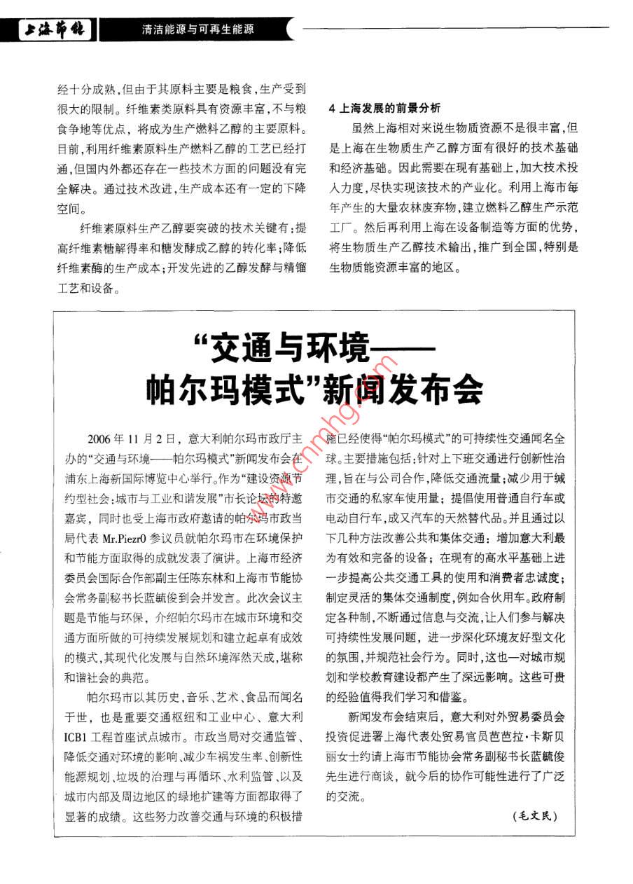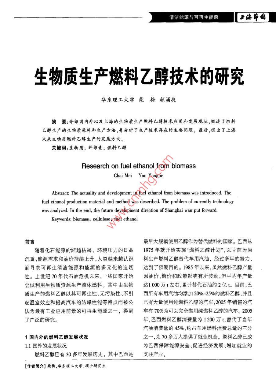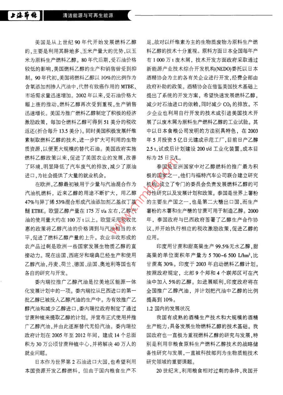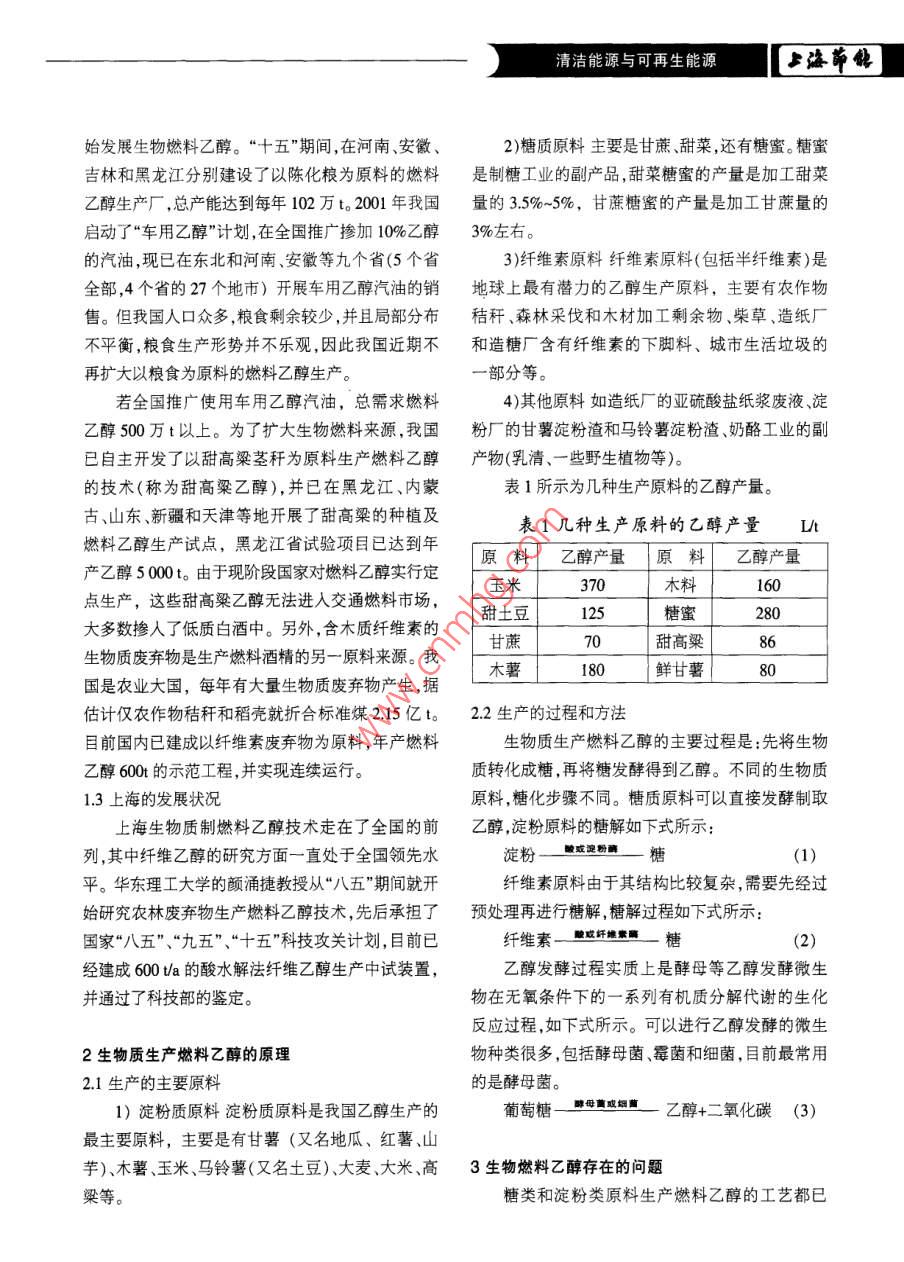 清潔能源與可再生能源上節(jié)林生物質生產(chǎn)燃料乙醇技術的研究華東理工大學柴梅顏涌捷摘要:介紹國內外以及上海的生物質生產(chǎn)燃料乙醇技術應用和發(fā)展現(xiàn)狀,概述了燃料乙醇生產(chǎn)的生物質原料和生產(chǎn)方法,并分析了生產(chǎn)技術存在的主要問題。最后,提出了上海未來生物質燃料乙醇生產(chǎn)的發(fā)展方向。關鍵詞:生物質;纖維素;燃料乙醇 Research on fuel ethanol from biomass Chai Mei Yan Yongjie Abstract: The actuality and development in fuel ethanol from biomass was introduced.The fuel ethanol production material and method was described. The problem of currently technology was analyzed. In the end, the future development direction of Shanghai wan put forward. Keywords: biomass; cellulose; fuel ethanol前言最早大規(guī)模使用乙醇作為替代燃料的國家。巴西從隨著化石能源的漸趨枯竭,環(huán)境壓力的日益1975年就開始實施“燃料乙醇計劃”,以甘蔗為原沉重,能源需求和油價持續(xù)上升,人類越來越認識料生產(chǎn)燃料乙醇替代車用汽油,經(jīng)過多年的努力,到尋求可再生清潔能源和能源的多元化的迫切達到了預期目的。1985年以來,雖然燃料乙醇產(chǎn)量性。上世紀70年代石油危機以來,一些國家開始因油價、糖價和政策影響有所波動,但平均年產(chǎn)量嘗試利用生物質資源生產(chǎn)液體燃料。其中由生物達1000萬t左右,累計替代石油約2億t。目前,巴質生產(chǎn)的燃料乙醇以其可再生性、無污染性、不引西所有車用汽油均添加20%~25%的燃料乙醇,并且起溫室效應和提高汽車的防爆性能等特點而被公已有大量使用純燃料乙醇的汽車,2005年銷售的汽認為最有工業(yè)應用前景的可再生能源之一,得到車有70%為可以完全燃用純燃料乙醇的汽車。2005了廣泛的研究。年,巴西燃料乙醇消費量為1200萬t,替代了當年汽油消費量的45%,約占車用燃料消費總量的三分1國內外的燃料乙醇發(fā)展狀況之一,為70多萬人提供了就業(yè)機會。燃料乙醇已成1.1國外的發(fā)展狀況為巴西保障能源安全、促進經(jīng)濟發(fā)展、增加就業(yè)的燃料乙醇已有30多年發(fā)展歷史,其中巴西是支柱產(chǎn)業(yè)?!咀髡吆喗椤坎衩啡A東理工大學,碩士研究生上海帶能清潔能源與可再生能源美國是從上世紀90年代開始發(fā)展燃料乙醇足故對以纖維素為主的生物質廢物為原料生產(chǎn)燃的,主要是利用其耕地多、玉米產(chǎn)量大的優(yōu)勢,玉料乙醇的技術十分重視。原料方面日本全國每年產(chǎn)米為原料生產(chǎn)燃料乙醇。80年代后期受石油價格有1000萬t廢木屑,技術開發(fā)方面政府采取通過較低的影響,美國燃料乙醇的生產(chǎn)和銷售曾受到抑新能源產(chǎn)業(yè)技術綜合開發(fā)機構(NEDO)委托以日本制。90年代初,美國將燃料乙醇以10%的比例作為酒精協(xié)會為主的各有關企業(yè)進行開發(fā),經(jīng)費全部由含氧添加劑摻人汽油中,代替有致癌作用的MTBE,政府補助的政策。酒精協(xié)會在借鑒美國技術基礎上市場需求量迅速增加。2002年以來,受石油價格大提出了系統(tǒng)的開發(fā)方案,希望快速發(fā)展燃料乙醇,幅上漲的推動,燃料乙醇再次受到重視,生產(chǎn)銷售減少對石油進口的依賴,同時減少CO2的排放。不迅速增長美國為推廣燃料乙醇制定了積極的經(jīng)濟少企業(yè)也利用自行開發(fā)的技術或引進美國技術開激勵政策,每加侖燃料乙醇可得到51美分的稅收展了以廢木屑為原料生產(chǎn)燃料乙醇的工業(yè)試驗。其返還(折合每升13.5美分)同時美國積極發(fā)展纖維中以日本食糧公司發(fā)明的方法別具特色,在2003素制取燃料乙醇的技術,進一步擴大可利用的生物年5月投資5億日元建成示范工廠,目前日產(chǎn)乙醇質資源,以便更大規(guī)模的替代石油。美國政府實施2.5t,試成后計劃建設200td工業(yè)化裝置,成本目燃料乙醇政策以來,促進了美國農業(yè)的發(fā)展,改善標為25日元/L。了環(huán)境,明顯降低了汽車廢氣的排放,減少了原油泰國是亞洲國家中對乙醇燃料的推廣最為積進口,為社會提供了大量的就業(yè)機會。極的國家之一,他們與福特汽車公司聯(lián)合建立研究在歐洲,乙醇最初被用于少量與汽油混合作為機構,成立了專門的委員會負責發(fā)展燃料乙醇的可汽油機燃料,近來乙醇的用途不斷擴大,用乙醇行性研究以及發(fā)展計劃和政策。泰國是世界上薯粉47%與異丁烯53%混合形成汽油添加劑乙基叔丁基的主要生產(chǎn)國之一,也是第二大糖出口國,而生產(chǎn)醚ETBE。歐盟乙醇產(chǎn)量在175萬ta左右,乙醇汽薯粉的木薯和生產(chǎn)糖的甘蔗可用于制造乙醇。2000油的使用量大約在100萬t以上。歐盟采用稅收優(yōu)年,泰國政府與巴西政府簽署了乙醇生產(chǎn)合作協(xié)惠的政策將乙醇汽油的價格調到與汽油相當?shù)乃h,并開始執(zhí)行相應的稅收激勵政策,促進乙醇的平,促進了燃料乙醇產(chǎn)量的上升。農業(yè)豐收形成的應用。農產(chǎn)品過剩是歐洲一些國家發(fā)展生物質乙醇的直印度用甘蔗和甜高粱生產(chǎn)99.5%無水乙醇,甜接動力。現(xiàn)在法國西班牙和瑞典已經(jīng)生產(chǎn)和使用高粱的單位面積年產(chǎn)量為5700-6500L/hm2,比乙醇汽油,丹麥、荷蘭、德國、法國、奧地利等國也有甘蔗高30%印度于2003年啟動燃料乙醇計劃。各自的研究與開發(fā)。按照政府規(guī)定,北部9