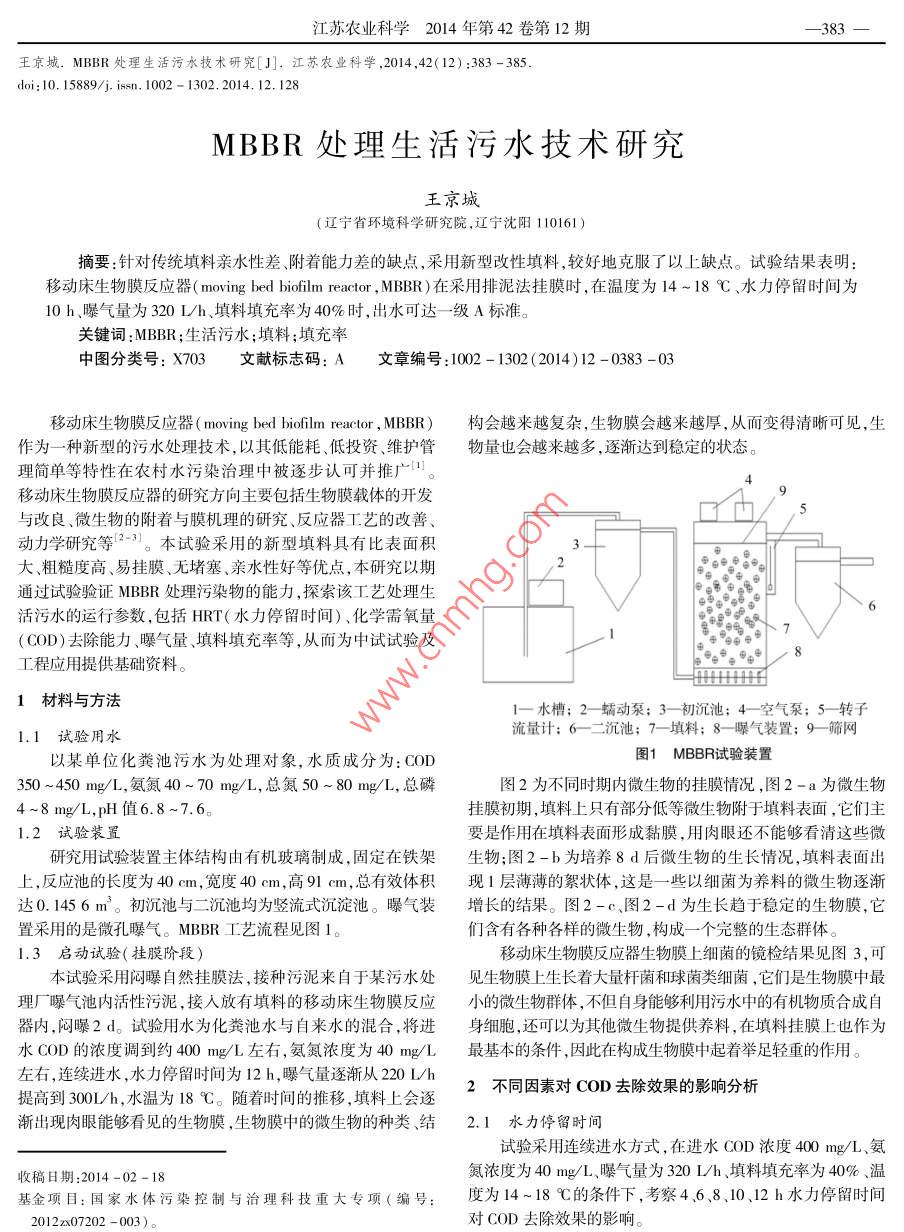 江蘇農(nóng)業(yè)科學(xué)2014 年第42卷第12期-383王京城MBBR處理生活污水技術(shù)研究[J].江蘇農(nóng)業(yè)科學(xué),2014 ,42(12):383 -385.doi: 10.15889/j. isn. 1002 - 1302. 2014.12. 128MBBR處理生活污水技術(shù)研究王京城(遼寧省環(huán)境科學(xué)研究院.遼寧沈陽110161)摘要:針對傳統(tǒng)填料親水性差、附著能力差的缺點,采用新型改性填料,較好地克服了以上缺點。試驗結(jié)果表明:移動床生物膜反應(yīng)器(movingbedbioflmreactor,MBBR)在采用排泥法掛膜時,在溫度為14~18C、水力停留時間為10h .曝氣量為320 L/h填料填充率為40%時,出水可達(dá)一-級A標(biāo)準(zhǔn)。關(guān)鍵詞:MBBR;生活污水;填料;填充率中圖分類號: X703文獻(xiàn)標(biāo)志碼: A文章編號:1002 - 1302 (2014)12 -0383 -03 :移動床生物膜反應(yīng)器( moving bed bioflm reactor , MBBR)構(gòu)會越來越復(fù)雜,生物膜會越來越厚,從而變得清晰可見,生作為一種新型的污水處理技術(shù),以其低能耗、低投資維護(hù)管物量也會越來越多,逐漸達(dá)到穩(wěn)定的狀態(tài)。理簡單等特性在農(nóng)村水污染治理中被逐步認(rèn)可并推廣田。移動床生物膜反應(yīng)器的研究方向主要包括生物膜載體的開發(fā)與改良、微生物的附著與膜機(jī)理的研究、反應(yīng)器工藝的改善、動力學(xué)研究等[2-3]。本試驗采用的新型填料具有比表面積大、粗糙度高、易掛膜、無堵塞、親水性好等優(yōu)點,本研究以期通過試驗驗證MBBR處理污染物的能力,探索該工藝處理生活污水的運(yùn)行參數(shù),包括HRT(水力停留時間)、化學(xué)需氧量( COD)去除能力、曝氣量、填料填充率等,從而為中試試驗及工程應(yīng)用提供基礎(chǔ)資料。1材料與方法1-水槽; 2-蠕動泵; 3-初沉池; 4-空氣泵; 5一轉(zhuǎn)子流量計: 6-二沉池; 7- 一填料; 8- 曝氣裝置; 9- -篩網(wǎng)1.1試驗用水圖1 MBBR試驗裝 置以某單位化糞池污水為處理對象,水質(zhì)成分為:COD350 ~450 mg/L,氨氬40~ 70 mg/L, 總氮50 ~ 80 mg/L,總磷圖2為不同時期內(nèi)微生物的掛膜情況,圖2 -a為微生物4~8 mg/L,pH值6.8~7.6。掛膜初期,填料上只有部分低等微生物附于填料表面,它們主1.2試驗裝置要是作用在填料表面形成黏膜,用肉眼還不能夠看清這些微研究用試驗裝置主體結(jié)構(gòu)由有機(jī)玻璃制成,固定在鐵架生物;圖2-b為培養(yǎng)8d后微生物的生長情況,填料表面出上,反應(yīng)池的長度為40 cm,寬度40 em,高91 cm,總有效體積現(xiàn)1層薄薄的絮狀體,這是--些以細(xì)菌為養(yǎng)料的微生物逐漸達(dá)0.1456 m。初沉池與二沉池均為豎流式沉淀池。曝氣裝增長的結(jié)果。圖2-c、圖2-d為生長趨于穩(wěn)定的生物膜,它置采用的是微孔曝氣。MBBR 工藝流程見圖1。們含有各種各樣的微生物,構(gòu)成--個完整的生態(tài)群體。1.3 啟動試驗(掛膜階段)移動床生物膜反應(yīng)器生物膜上細(xì)菌的鏡檢結(jié)果見圖3,可本試驗采用悶曝自然掛膜法,接種污泥來自于某污水處見生物膜上生長著大量桿菌和球菌類細(xì)菌,它們是生物膜中最理廠曝氣池內(nèi)活性污泥,接人放有填料的移動床生物膜反應(yīng)小的微生物群體,不但自身能夠利用污水中的有機(jī)物質(zhì)合成自器內(nèi),悶曝2 d。試驗用水為化糞池水與自來水的混合,將進(jìn)身細(xì)胞,還可以為其他微生物提供養(yǎng)料,在填料掛膜上也作為水C0D的濃度調(diào)到約400mg/L左右,氨氮濃度為40mg/L最基本的條件,因此在構(gòu)成生物膜中起著舉足輕重的作用。左右,連續(xù)進(jìn)水,水力停留時間為12 h,曝氣量逐漸從220 L/h2不同因素對COD去除效果的影響分析提高到300L/h,水溫為18 C。隨著時間的推移,填料上會逐漸出現(xiàn)肉眼能夠看見的生物膜,生物膜中的微生物的種類、結(jié)2.1水力停 留時間試驗采用連續(xù)進(jìn)水方式,在進(jìn)水C0D濃度400 mg/L、氨收稿日期:2014-02 -18氮濃度為40 mg/L曝氣量為320 I/h、填料填充率為40%、溫基金項目:國家水體污染控制與治理科技重大專項(編號:度為14-18 C的條件下,考察4.6 8、10、12 h水力停留時間2012zx07202 - 003)對C0D去除效果的影響。一384一江蘇農(nóng)業(yè)科學(xué)2014 年第42卷第12期a.微生物掛膜初期b.培養(yǎng)8d后的生物膜c.生長趨于穩(wěn)定的生物膜d.生長趨于穩(wěn)定的生物膜圖2不同時期微生 物的掛膜情況料填滿,由于水的剪切力作用,懸浮的微生物也較多,說明生物膜量達(dá)到穩(wěn)定值;繼續(xù)增加水力停留時間至12h時,COD的去除率變化幅度趨于平緩,水中的有機(jī)物去除達(dá)到平衡,如繼續(xù)增加HRT,勢必會造成微生物的碳源不足而影響整個生物膜系統(tǒng)。因此從COD的去除效果和經(jīng)濟(jì)成本考慮,當(dāng)水力停留時間為10h時最為理想。2.2曝氣量在以上條件不變的基礎(chǔ)上,將水力停留時間設(shè)定為10h,曝氣量分別選定140、200、260、320、380 L/h時,考察溶解氧對C0D去除效果的影響,試驗結(jié)果如圖5所示。5007 100400t 8(30060200◆一去除率+ 40100t 20100 150 200 250 300 350 400圖3生物 膜細(xì)菌的鏡檢結(jié)果曝氣量(L/h)圖5曝氣量對 COD的去除效果400 t80昌由圖5可以看出,溶解氧對C0D的去除率并沒有太大的00 t。進(jìn)李影響。但是在不同的曝氣條件下,去除COD的微生物卻相差士重-去除率神很大:當(dāng)曝氣量維持在200L/h以內(nèi)時,溶解氧很低,池內(nèi)幾乎為缺氧狀態(tài),大量絲狀菌產(chǎn)生,懸浮微生物很