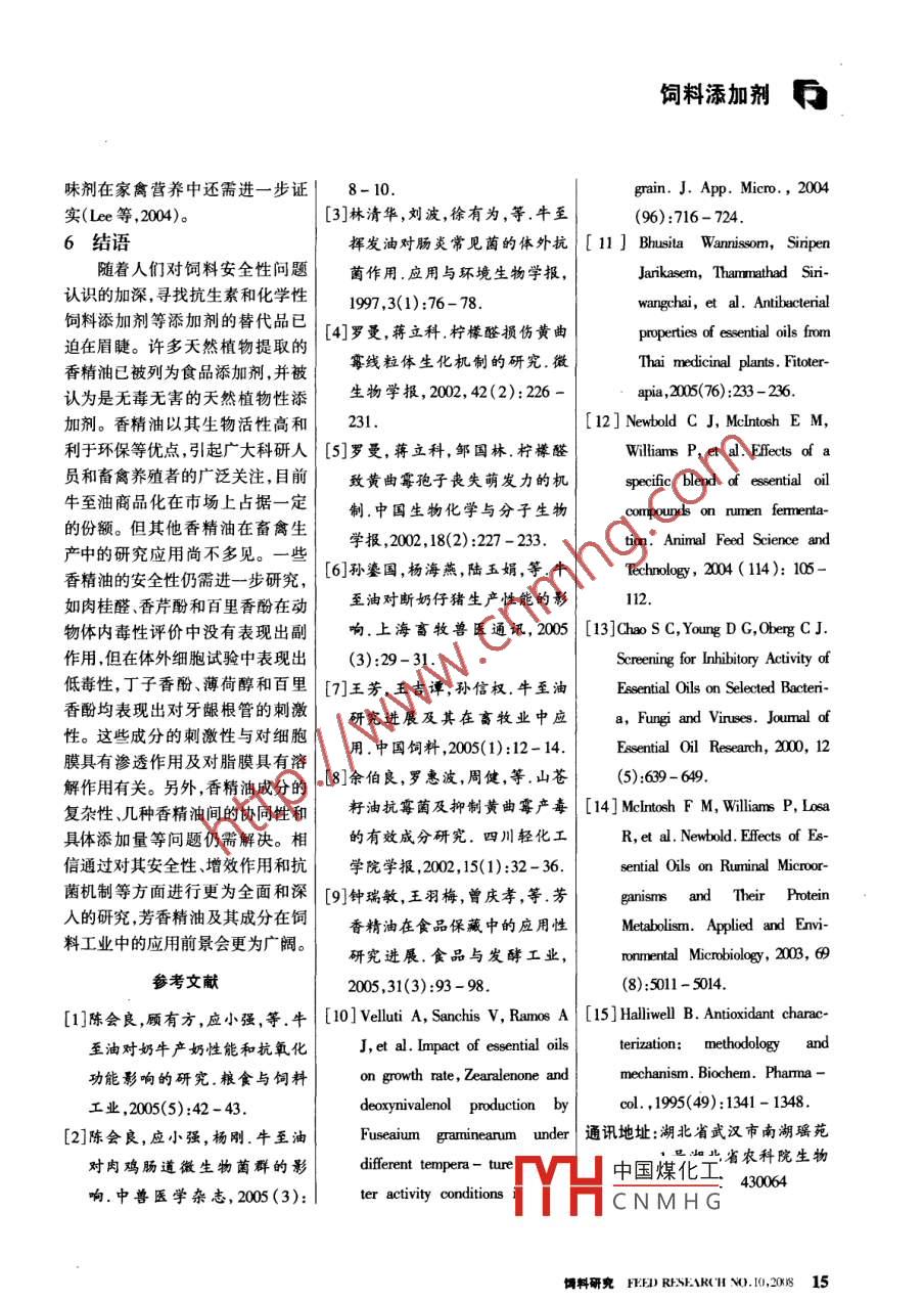 門飼料添加劑IN新型飼料天農(nóng)篙養(yǎng)添加劑一香精油微量營養(yǎng)未應(yīng)用專家魏金濤李紹章黃少文張巍趙娜楊雪海杭中天農(nóng)生物營界技術(shù)有限公司杭州市文二廈212號高年大廈湖北省農(nóng)業(yè)科學(xué)院畜牧獸醫(yī)研究所摘要香精油是植物的次生代謝產(chǎn)物,其主要成分具有一定的生物活性,在食品工業(yè)中被普遍應(yīng)用于抗氧化劑、防霉劑和抗菌劑等用途,而在飼料工業(yè)中的研究尚不多見。在飼料存儲中香精油可作為抗氧化劑和防霉劑,還可作為抗菌促生長劑在畜禽生產(chǎn)和反芻動物飼料中應(yīng)用。關(guān)鍵詞香精油飼料添加劑 應(yīng)用進(jìn)展中圖分類號:S816.7文獻(xiàn)標(biāo)識碼:A文章編號:1002一2813(2008)10-0012-04香精油是從植物中提取的揮|產(chǎn)品受霉菌污染,霉變所造成的糧|引發(fā)人類的食道癌。發(fā)性油類,是植物的次生代謝產(chǎn)食 和飼料經(jīng)濟(jì)損失可達(dá)數(shù)千億美為防止飼料霉變和特菌毒紫物。大多數(shù)香精油是由萜類、半站元。我國一些地區(qū)尤其是南方地|的產(chǎn)生,在飼料生產(chǎn)中常添加防霉類、醇類、醛類酯類、酮類物質(zhì)和區(qū),飼料霉變問題也相當(dāng)嚴(yán)重。劑。但這些化學(xué)物質(zhì)普遍存在致小部分石蠟類物質(zhì)組成的混合物。1996年我國飼料霉變現(xiàn)狀調(diào)查結(jié)畸性、致癌性和殘留毒性,殘留在香精油被用作防腐劑驅(qū)蟲保健劑果表明,配合飼料及飼料原料污染自然界不易分解造成環(huán)境污染。和用于治病藥物的歷史已超過率分別為 100 %和99 %,其中嚴(yán)些香料和中草藥由于含有一些6000年。近年來研究表明,香精重污 染而被禁用的占20 %,而南香精油而具有 一定的抗微生物活油還具有抗氧化抗微生物、抗寄方地區(qū)的飼料霉 變率比北方地區(qū)性。許多研究表明, 牛至、丁香、羅生蟲、抗腫瘤防霉促生長和免疫I高出幾倍甚至幾十倍。霉菌毒素勒胡荽肉桂、百里香、薄荷、迷迭調(diào)節(jié)等生物活性功能。是霉菌的次級代謝產(chǎn)物現(xiàn)在霉菌 |香、芥茉 、芫荽 和紅根草等芳香精用作防需劑毒素的污染問題也已成為對畜禽油及丁 子香酚、香芹酚肉桂酸、己霉變是造成飼料和食品大量養(yǎng)殖業(yè)危害 最大的因素之一。畜醛、草葛腦 、麝香草酚、香芹酮 肉浪費的全世界性危害。近年來,全禽長期采食 低劑量的霉菌毒素會桂醛檸檬醛和香葉醇等單體成分球不規(guī)則的氣候(如暴雨、洪澇災(zāi)導(dǎo)致采食下降、生產(chǎn)性能降低、消具有優(yōu)良的抗食源性腐敗菌和致害、干早和霜凍),加上經(jīng)濟(jì)全球化化系統(tǒng)紊亂和繁殖性能降低,大劑 病活性。余伯良等(2002)采用使谷物和飼料中霉菌和霉南毒素量采食霉菌毒素可直接導(dǎo)致畜禽平板法比較山蒼籽油及其檸檬醛的污染有加重的趨勢。據(jù)聯(lián)合國急性死亡。 黃曲霉毒素B可在雞 等5種主要成分對8種霉 菌的抗糧農(nóng)組織估算,全世界每年有I蛋中殘留,可通過食物鏈傳遞到人|菌效力試驗。結(jié)果表明,在培養(yǎng)基5 %-7 %的糧食和飼料等農(nóng)作物| 體,使入體發(fā)生中毒。玉中國煤化工 效力從強到弱依酮也可殘留在牛奶中通醛、山蒼籽油、香收稿日期:2008 - 06 -03MHCNMHG基庚烯酮。檸檬對人體產(chǎn)生危害。伏馬國家的工街力12飼料研究 FHED RESFARCH NO.10,208飼料添加劑幣醛對5種霉菌的最低抑菌濃度為|鐮刀菌和玉米赤霉烯酮的產(chǎn)生都|起到供氫(H)體的作用,與脂肪酸0.10%,而甲基庚烯酮對6種霉菌有抑制作用,但只有palmarose精油中的游離基結(jié)合而中斷脂肪酸氧的最低抑菌濃度超過0.40 %。同|和丁香精油對抑制玉米赤霉烯酮化的連 鎖反映,能抑制氫過氧化物時,在對上述6種試劑與黃曲霉產(chǎn)|的產(chǎn)生有 顯著影響。Kordali(2005)的形成,起到抗氧化的作用。Hig毒關(guān)系的試驗中還發(fā)現(xiàn),檸檬醛、研究發(fā)現(xiàn),艾屬 植物中提取的香精don 等(2003)研究認(rèn)為,茶多酚極香茅醛和山蒼籽油對黃曲霉產(chǎn)生|油也具有抗真菌的活性,它們只能|易 被氧化成為酯類而提供質(zhì)子,故黃曲霉毒素具有較強的抑制作用,抑制一 部分的真菌種屬。雖然諸|具有 顯著的抗氧化活性,其抗氧化其中以檸檬醛的抑制作用最強,可|多試驗表明 ,香精油對真菌有一定|能力是維生素 E的18 倍,是維生減少85 %的黃曲霉毒素產(chǎn)生。羅|的抑制作用,但不同香精油或組分|素C的3~ 10倍。茶多酚在體內(nèi)曼等(2001 , 2002)在對山蒼籽提取|配合 使用的研究還較少。芳香精|具有顯著 的清除自由基、阻斷N-抗霉有效成分研究時發(fā)現(xiàn),山蒼籽|油組分復(fù)雜,配合使用時可能存在亞硝基化合物的合成、抑制脂氧合油及果渣能抗黃曲霉在于強力破有效組分間的增效作用,這樣可進(jìn)酶活性和脂質(zhì)過氧化的作用,從而壞細(xì)胞璧、質(zhì)膜結(jié)構(gòu)和氧化還原系一- 步減少使用濃度。在防癌抗癌和抗突變等許多方面統(tǒng)而抑制黃曲霉等曲霉的生長,2用作抗氧化劑表現(xiàn)出優(yōu)越的防病治療功效。天并使其孢子失去萌發(fā)能力;隨著飼料中的脂類化合物在儲存|然黃酮類化合物多為結(jié)晶性固體,藥物濃度的增加或致敏濃度( MIC)|過程中不斷進(jìn)行氧化反映 ,嚴(yán)重的少數(shù)為無定形性