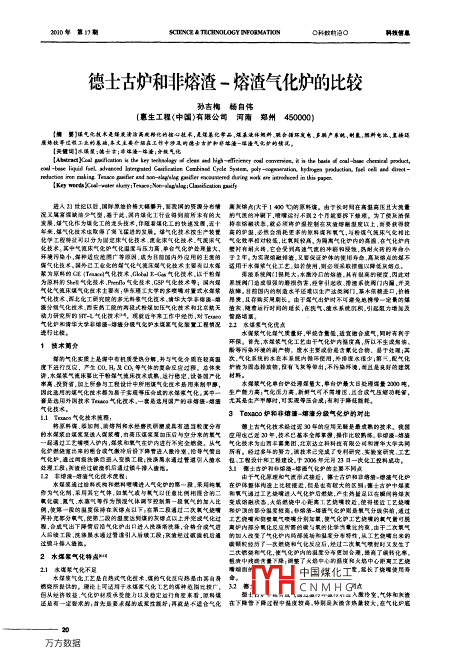 2010年第17期SCIENCE & TECHNOLOGY NFORMATION0科教前沿口科技僧鬼德士古爐和非熔渣-熔渣氣化爐的比較孫吉梅楊自偉(惠生工程<中國>有限公司河南鄭州450000)[擒要]媒氣化技術(shù)是煤炭清潔高效轉(zhuǎn)化的核心技術(shù),是謀基化學(xué)品、煤基液體燃料.聯(lián)合循環(huán)發(fā)電、多聯(lián)產(chǎn)系統(tǒng)、制氫、燃料電池、直接還.原煉鐵等過程工業(yè)的基礎(chǔ),本文主要介紹在工作中涉及的德士古爐和非熔渣-熔渣氣化爐的情況。[關(guān)鍵詞]水堞漿;狒士古;非熔渣-熔渣;分級(jí)氣化lAbstract]Coal gaification is the key technoloy of clean and hifh-fficiency coal conversion, it is the basis of coal- base chernical product,col -base liquid fuel, advanced Intergrated GesificationCombined Cycle System, poly -cogeneration, hydrogen production, fuel cell and diret -reduction iron making. Texaco gsifer and non-slag/slag gasifer encountered during work are introduced in this paper.(Key words)Coal-water slumy;Texaco ;on-slag/lagHasficatioin gasify進(jìn)入21世紀(jì)以后國際原油價(jià)格大幅攀升,而我國的資源分布情高灰熔點(diǎn)(大于 1 400 q)的原料煤。由于長(zhǎng)時(shí)間在高溫高壓且大流量況又屬富煤缺油少氣型基于此.國內(nèi)煤化工行業(yè)得到前所未有的大的氣流的沖刷下 .噴嘴運(yùn)行不到2個(gè)月就要拆下修理。為了使灰渣保發(fā)展,煤氣化作為煤化工的龍頭技術(shù)伴隨著煤化工的快速發(fā)展,近十持 在熔觸狀態(tài).就必須將爐溫控制在灰渣熔融溫度以上,而要獲得較年來.煤氣化技術(shù)也取得了突飛猛進(jìn)的發(fā)展。煤氣化技術(shù)按生產(chǎn)裝置高 的爐溫,必然會(huì)消耗更多的原料煤和氧氣與粉媒氣流床氣化相比化學(xué)工程特征可以分為固定床氣化技術(shù)、流化床氣化技術(shù)氣流床氣氣化效率 相對(duì)較低,比氧耗較高。為隔離氣化爐內(nèi)的高溫,在氣化爐內(nèi)化技術(shù)。其中氣流床氣化爐氣化溫度與壓力高單臺(tái)氣化爐處理量大、壁襯有耐火磚 .它會(huì)受到高速氣流的沖刷和授蝕,熱酣火磚的壽命小環(huán)境污染小,煤種適應(yīng)范圍廣等原因.成為目前國內(nèi)外應(yīng)用的主流的于 2年。為實(shí)現(xiàn)熔融排渣,又要保證爐體的使用壽命.高灰熔點(diǎn)的煤不煤氣化技術(shù)。國外已工業(yè)化的煤氣化氣流床煤氣化技術(shù)主要有以水煤適用于水 煤漿氣化工藝如若使用,則必須采取措施以降低灰熔點(diǎn)。漿為原料的CE (Texaco)氣化技術(shù).ClobalE -Cas氣化技術(shù),以干粉煤排渣系統(tǒng)閥[ ]損耗大:水激冷后的熔渣.具有很高的硬度.因此對(duì)為原料的Shell氣化技術(shù).Prenflo 氣化技術(shù).GSP 氣化技術(shù)等:國內(nèi)煤系繞閥門造 成很強(qiáng)的磨損傷害,經(jīng)常引起收.排渣系統(tǒng)閥門內(nèi)漏、開關(guān)氣化氣流床煤氣化技術(shù)主要有:華東理工大學(xué)的多噴嘴對(duì)置式水煤漿故障。 目前國內(nèi)的制造水平還難以生產(chǎn)這類閥門,基木依賴進(jìn)口,價(jià)格氣化技術(shù)、西北化工研究院的多元料漿氣化技術(shù)、清華大學(xué)非熔流-熔昂 貴,且存購買周期長(zhǎng)。由于煤氣出爐時(shí)不可避免地?cái)y帶- -定最的煤渣分級(jí)氣化技術(shù)西安熱工院的兩段式粉煤加壓氣化技術(shù)和北京航天渣 灰,隨著運(yùn)行時(shí)間的延長(zhǎng),在洗氣、渣水系統(tǒng)饑積,引起阻力增加及動(dòng)力研究所的HT-L氣化技術(shù)間?,F(xiàn)就近年來工作中經(jīng)歷,對(duì)Teaco管路堵塞。氣化爐和清華大學(xué)非熔渣-熔渣分級(jí)氣化爐水煤漿氣化裝置工程情況2.2 水煤漿氣化優(yōu)點(diǎn)進(jìn)行比較。水煤漿氣化煤氣質(zhì)量好,甲烷含量低,適宜做合成氣,同時(shí)有利于環(huán)保。首先,水煤漿氣化工藝由于氣化爐內(nèi)溫度高,所以不生成焦油,1技術(shù)簡(jiǎn)介酚等污染環(huán)境的刷產(chǎn)物,廢水主要成份是含氯化合物,易于處理;其煤的氣化實(shí)質(zhì)上是煤中有機(jī)質(zhì)受熱分解,并與氣化介質(zhì)在較高溫次,氣化系統(tǒng)的水 在本系統(tǒng)內(nèi)循環(huán)使用,外排廢水很少;第三,配氣化度下進(jìn)行反應(yīng),產(chǎn)生co, H2及CO,等氣體的復(fù)雜反應(yīng)過程??傮w來爐渣為 固態(tài)摔放物,沒有飛灰等帶出,不污染環(huán)境,而且是良好的建筑講,水煤漿氣流床要比干粉煤氣流床技術(shù)成熟,運(yùn)行穩(wěn)定,設(shè)備國產(chǎn)化材料。率高投資省,加上所參與工程設(shè)計(jì)中所用煤氣化技術(shù)是用來制甲醇,水煤漿氣化單臺(tái)爐處理煤量大,單臺(tái)爐最大日處理煤量2000噸,因此選用的煤氣化技術(shù)都為易于實(shí)現(xiàn)等壓合成的水煤漿氣化。其中一生產(chǎn)能力高;氣化壓力高 ,新鮮氣可不需增壓、且合成氣壓縮功耗省,套是選用外國技術(shù)Texaco氣化技術(shù),一套是選用國產(chǎn)的非熔渣-熔渣尤其是生產(chǎn) 甲醇時(shí).可實(shí)現(xiàn)等壓合成;有利于降低能耗。氣化技術(shù)。3 Texaco 爐和非媲潼_熔潼分級(jí)氣化爐的對(duì)比1.1 Texaco 氣化技術(shù)流程:將原料 煤、添加劑、助熔劑和水經(jīng)磨機(jī)研磨成具有適當(dāng)粒度分布德上古氣化技術(shù)經(jīng)過近30年的應(yīng)用無疑是最成熟的技術(shù)。我國的水媒漿由煤漿泵送入煤漿槽.由高醫(yī)煤漿泵加壓后與空分來的氧氣應(yīng)