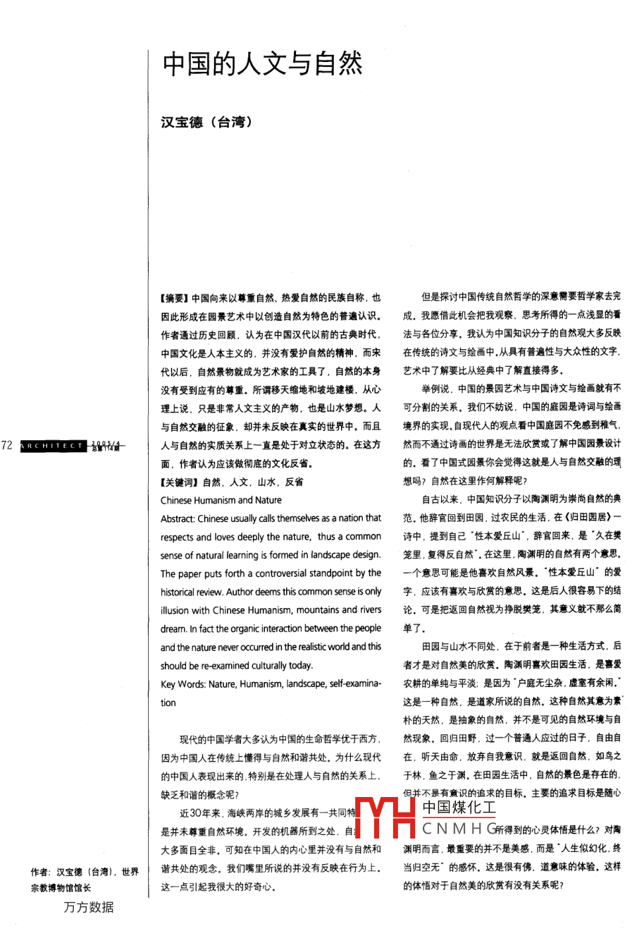 中國(guó)的人文與自然漢寶德(臺(tái)灣)【摘要】中國(guó)向來(lái)以尊重自然熱愛(ài)自然的民族自稱,也但是探討中國(guó)傳統(tǒng)自然哲學(xué)的深意需要哲學(xué)家去完因此形成在園景藝術(shù)中以創(chuàng)造自然為特色的普遍認(rèn)識(shí)。成,我愿借此機(jī)會(huì)把我觀察、思考所得的一點(diǎn)淺顯的看作者通過(guò)歷史回顧,認(rèn)為在中國(guó)漢代以前的古典時(shí)代,法與各位分享,我認(rèn)為中國(guó)知識(shí)分子的自然觀大多反映中國(guó)文化是人本主義的,并沒(méi)有愛(ài)護(hù)自然的精神,而宋在傳統(tǒng)的詩(shī)文與繪畫中,從具有普遍性與大眾性的文字代以后,自然景物就成為藝術(shù)家的工具了,自然的本身藝術(shù)中了解要比從經(jīng)典中了解直接得多沒(méi)有受到應(yīng)有的尊重。所謂移天縮地和坡地建樓.從舉例說(shuō).中國(guó)的景園藝術(shù)與中國(guó)詩(shī)文與繪畫就有不理上說(shuō),只是非常人文主義的產(chǎn)物,也是山水夢(mèng)想。人分割的關(guān)系,我們不妨說(shuō),中國(guó)的庭園是詩(shī)詞與繪畫與自然交融的征象,卻并未反映在真實(shí)的世界中,而且境界的實(shí)現(xiàn)自現(xiàn)代人的觀點(diǎn)看中國(guó)庭園不免感到稚氣2 RCHITECT HA#人與自然的實(shí)質(zhì)關(guān)系上一直是處于對(duì)立狀態(tài)的。在這方然而不通過(guò)詩(shī)畫的世界是無(wú)法欣賞或了解中國(guó)園景設(shè)計(jì)面,作者認(rèn)為應(yīng)該做徹底的文化反省。的.看了中國(guó)式園景你會(huì)覺(jué)得這就是人與自然交融的理【關(guān)鍵詞】自然,人文,山水,反省想嗎?自然在這里作何解釋呢?Chinese humanism and Nature自古以來(lái),中國(guó)知識(shí)分子以陶淵明為崇尚自然的典Abstract: Chinese usually calls themselves as a nation that范.他辭官回到田園過(guò)農(nóng)民的生活在《歸田園居》respects and loves deeply the nature. thus a common詩(shī)中,提到自己性本愛(ài)丘山,辭官回來(lái)是久在樊sense of natural learning is formed in landscape design.籠里復(fù)得反自然在這里陶淵明的自然有兩個(gè)意思The paper puts forth a controversial standpoint by the一個(gè)意思可能是他喜歡自然風(fēng)景,“性本愛(ài)丘山的愛(ài)historical review. Author deems this common sense is only字,應(yīng)該有喜歡與欣賞的意思.這是后人很容易下的結(jié)illusion with Chinese Humanism, mountains and rivers論.可是把返回自然視為掙脫樊籠.其意義就不那么簡(jiǎn)dream. In fact the organic interaction between the people 47and the nature never occurred in the realistic word and this田園與山水不同處,在于前者是一種生活方式,后hould be re examined culturally today者才是對(duì)自然美的欣賞.陶淵明喜歡田園生活.是喜愛(ài)Key Words: Nature, Humanism, landscape. self-examina-農(nóng)耕的單純與平淡:是因?yàn)閼敉o(wú)塵雜虛室有余閑這是一種自然,是道家所說(shuō)的自然,這種自然其意為素樸的天然,是抽象的自然,并不是可見(jiàn)的自然環(huán)境與自現(xiàn)代的中國(guó)學(xué)者大多認(rèn)為中國(guó)的生命哲學(xué)優(yōu)于西方.然現(xiàn)象.回歸田野.過(guò)一個(gè)普通人應(yīng)過(guò)的日子,自由自因?yàn)橹袊?guó)人在傳統(tǒng)上懂得與自然和諧共處,為什么現(xiàn)代在,聽(tīng)天由命.放棄自我意識(shí).就是返回自然,如鳥(niǎo)之的中國(guó)人表現(xiàn)出來(lái)的特別是在處理人與自然的關(guān)系上,于林,魚(yú)之于淵.在田園生活中,自然的景色是存在的缺乏和諧的概念呢并不是有意識(shí)的追求的目標(biāo),主要的追求目標(biāo)是隨心近30年來(lái)海峽兩岸的城鄉(xiāng)發(fā)展有一共同特中國(guó)煤化工是并未尊重自然環(huán)境,開(kāi)發(fā)的機(jī)器所到之處.自CNMHG所得到的心靈體悟是什么?對(duì)陶大多面目全非,可知在中國(guó)人的內(nèi)心里并沒(méi)有與自然和淵明而言,最重要的并不是美感而是人生似幻化終作者:漢寶德(臺(tái)海),世界諧共處的觀念。我們嘴里所說(shuō)的并沒(méi)有反映在行為上,當(dāng)歸空無(wú)的感懷,這是很有佛、道意味的體驗(yàn).這樣宗教博物館館這一點(diǎn)引起我很大的好奇心的體悟?qū)τ谧匀幻赖男蕾p有沒(méi)有關(guān)系呢?其實(shí)沒(méi)有關(guān)系,返回自然的生涯,體悟人生的真諦種變化了的自然,與實(shí)質(zhì)的自然是南轅北轍的.反而并不是一種對(duì)美感的追求,然而勿可諱言的.田園生活比較接近現(xiàn)代藝術(shù)的觀點(diǎn)中求心靈之所安,自然的美景是必要的營(yíng)養(yǎng),陶淵明所試看中國(guó)的庭園藝術(shù),除了使用自然的材料,如夢(mèng)想的桃花源與世隔絕是排除了政治力量的紛擾.與石、如水、如植物之外.有多少自然在內(nèi)?我們可自然和諧共處,過(guò)著怡然自樂(lè)的日子.這需要一個(gè)溫和以說(shuō)中國(guó)的庭園對(duì)自然的人工化,較之西洋的幾何庭園宜人的環(huán)境,人類按自然的韻律,依生命的周期營(yíng)生存實(shí)有過(guò)之而無(wú)不及,所不同者,西人只役用植物.我們之道,就可達(dá)到‘天人合一”的境界.但在桃花源中,陶則仿真山川而已,這樣的庭園比較接近藝術(shù),距離自然淵明使用了美字,足證在這理想的世界中,美是一甚遠(yuǎn)個(gè)必備的條件誠(chéng)然.西方以實(shí)質(zhì)自然為對(duì)象理解
