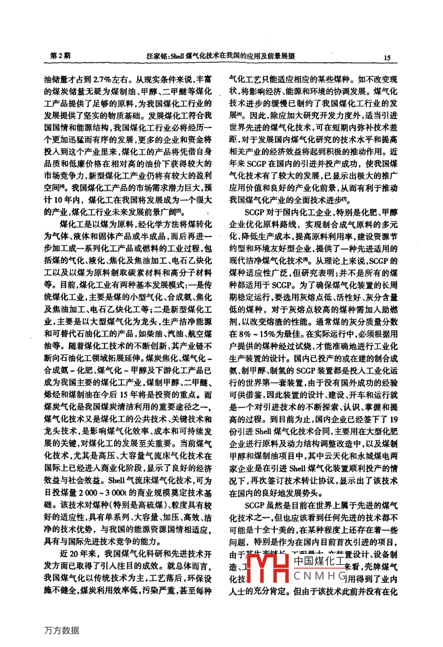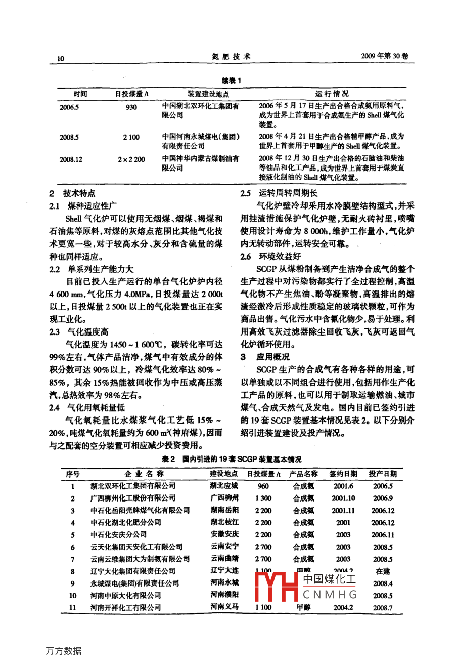 2009年第30卷第2期氨肥技術9Shell煤氣化技術在我國的應用及前景展望汪家銘.(川化集團有限責任公司四川成都610301)摘要簡要介紹Shell煤氣化技術的發(fā)展歷程、技術特點及目前國內引進裝置的建設和投產情況,并對其發(fā)展前景作出關鍵詞bell煤氣化技術 特點應用前景煤氣化技術是一種最潔凈的煤炭綜合利用5%的能量流失,使煤炭得以充分利用。合成氣技術,能夠避免煤炭直接燃燒產生的污染,采用可以用來制造純氫,生產合成氨、甲醇、含氧化合該技術主要是將煤炭轉化為含有H2和Co的粗物,以及尿素、合成氫燃料等衍生物,還可用于電合成氣,然后作為工業(yè)原料,最終加工成各種化廠供熱、蒸汽和發(fā)電的燃料,并可作為城市用氣。工產品。從煤氣化技術發(fā)展進程來看,早期的煤近年來Shell極力開拓中國市場,從2001年氣化都是使用塊煤和小煤粒作為氣化原料制取6月在國內簽訂第-一個技術轉讓協(xié)議起,8年多合成氣,稱為第-代煤氣化技術。來已陸續(xù)與國內17家企業(yè)簽訂了19份技術轉進入20世紀80年代后,隨著潔凈煤氣化工讓協(xié)議。到目前為止,已有11套SCGP裝置,共藝的開發(fā)和研究,采用先進的氣流床反應器,以12臺氣化爐順利建成,投入正常生產運行,并取水煤漿或干粉煤為原料,大規(guī)模、單系列、加壓氣得了良好的經濟效益和社會效益。現(xiàn)介紹SCGP化實現(xiàn)了工業(yè)化應用,稱為第二代煤氣化技術。的發(fā)展歷程技術特點,目前技術轉讓項目的進Shell煤氣化技術(SCGP)是目前世界上較為先進展概況,并展望其今后的發(fā)展前景。的、屬于氣流床氣化的第二代煤氣化技術。其工發(fā)展歷程藝過程為粉煤、氧氣及少量水蒸汽在加壓條件Shell的石化燃料氣化可以追溯到20世紀50下,并流進入氣化爐內,在極為短暫的時間內完年代,當時開發(fā)了以渣油為原料的Shell氣化工藝成升溫揮發(fā)分脫除裂解、燃燒及轉化等-系列(SGP), 隨后20世紀70年代初期,在渣油氣化的物理和化學過程,氣化產物是以H2和CO為主的基礎上,又開發(fā)了Shell粉煤氣化技術。該技術從合成氣,CO2含量很少,典型的SCGP煤氣中各組1972年開始進行中試,到2001年在荷蘭正式投份的體積分數(shù)為:CO65%、H230%、(N2+Ar)入商業(yè)化運行為止,前后共經歷了30多年的技3.1%、CO2 1.6%、(HS+COS)0.3% .CH微量。合術開 發(fā)歷程。在我國,SCGP用于化工生產,從成氣中含有原煤中約80%的能量,另外15%的2006年至今建成了多套合成氨、甲醇制氫裝置有效能量以蒸汽的形式獲得。整個氣化過程只有(見表1)。褒1 Shell煤氣化技術(SCGP )的發(fā)展歷程時間.日投煤量h裝置建設地點運行情況1976殼牌阿姆斯特丹研究中心試驗了30多個不同煤種和工藝原理,試用多種設備材料及氣體處理工藝。1978150殼牌德國哈爾堡煉油廠運行了6 100h,進行操作程序的優(yōu)化工作。19870-330美國休斯頓殼牌石油公司運行15 00,試驗了18種高硫、高灰分、高水分迪爾帕克廠的原料世的試臨中國煤化工1988~-19932000荷蘭發(fā)電局德姆克勒公司二化了12個煤裝置建設1997-1998聯(lián)合循環(huán)發(fā)電廠片C NMH G>9%,氣化示范運行裝置負荷40% ~ 100%變動,運轉率95%以上。1氮肥技術2009年第30卷續(xù)衰1時間日投煤量At裝置建設地點運行情況2006.5930中國湖北雙環(huán)化工集團有2006年5月17日生產出合格合成氨用原料氣,限公司成為世界上首套用于合成氨生產的Shell煤氣化裝置。2008.52100中國河南永城媒電(集團)2008年4月21日生產出合格精甲醇產品,成為有限責任公司世界上首套用于甲醇生產的Shell煤氣化裝置。2008.122x2 200中國神華內蒙古煤制油有2008年12月30日生產出合格的石腦油和柴油等油品和化工產品,成為世界上首套用于煤炭直接液化制油的Shell煤氣化裝置。2技術特點2.5運轉周轉周期長2.1 煤種適應性廣氣化爐壁冷卻采用水冷膜壁結構型式,并采Shell氣化爐可以使用無煙煤、煙煤、褐煤和用掛渣措施保護氣化爐壁,無耐火磚襯里,噴嘴石油焦等原料,對煤的灰熔點范圍比其他氣化技使用設計壽命為8 00h,維護工作量小,氣化爐術更寬一些,對于較高水分、灰分和含硫量的煤內無轉動部件,運轉安全可靠。種也同樣適應。2.6 環(huán)境效益好2.2 單系列生產能力大SCGP從煤粉制備到產生潔凈合成氣的整個目前已投入生產運行的單臺氣化爐爐內徑生產過程中對污 染物都實行了全過程控制,高溫4 600 mm,氣化壓力4.0MPa, 8投煤量達2 000t氣化物不產生焦油、酚等凝聚物,高溫排出的熔以上,日投煤量2500t以上的氣化裝置也正在實渣經激冷后形成性質穩(wěn)定的玻璃狀顆粒,可作為現(xiàn)工業(yè)化。商品出售。氣化污水中含氰化物少,易于處理。利2.3氣化溫度高用高效飛灰過濾器除塵回收飛灰,飛灰可返回氣氣化溫度為1450~1 600C,碳轉化率可達化爐循環(huán)使用。99%左右,氣體產品潔凈,煤氣中有效成分的體3應用概況積分數(shù)可達90%以上,冷煤氣化效率達80% ~SCGP生產的合成氣有各種各樣的用途,可85%,其余15%熱能被回收作為中壓或高壓蒸以單獨或以不同組合進行使用,包括用作生產化汽,總熱效率為98%左右。工產品的原料,也可以用于制取運輸燃油、城市2.4氣化用氧耗量低煤氣、合成天然氣及發(fā)電。國內目前已簽約引進氣化氧耗量比水煤漿氣化工藝低15% ~的19套SCGP裝置基本情況見表2。以下分別介20% ,噸煤氣化氧耗量約為600 m2(神府煤),因而紹引進裝置建