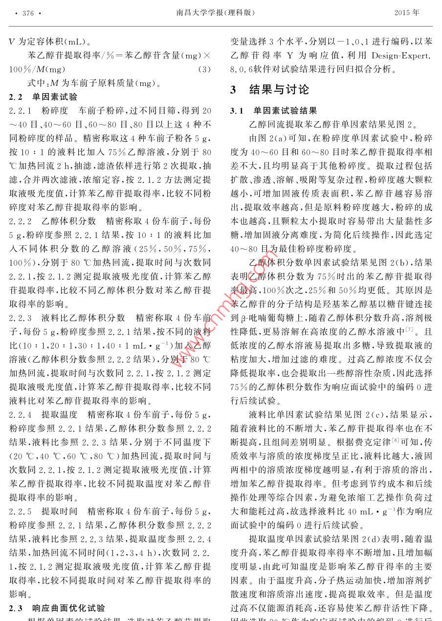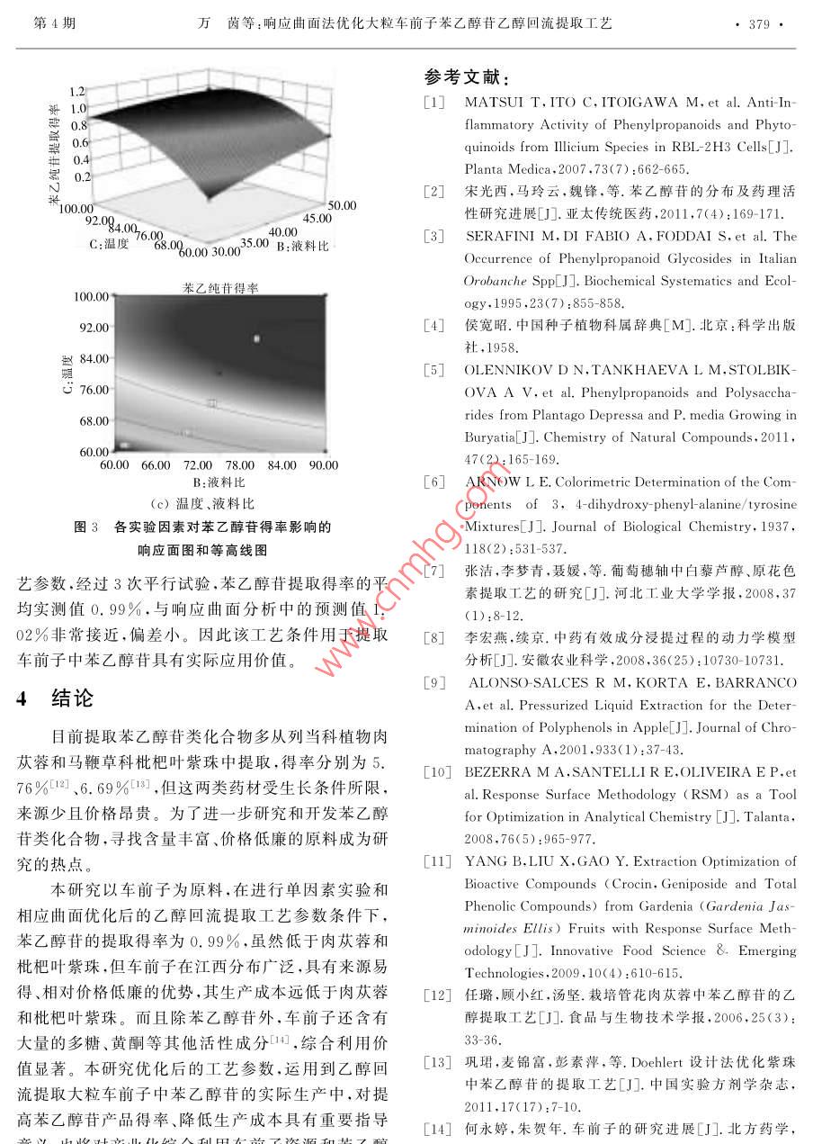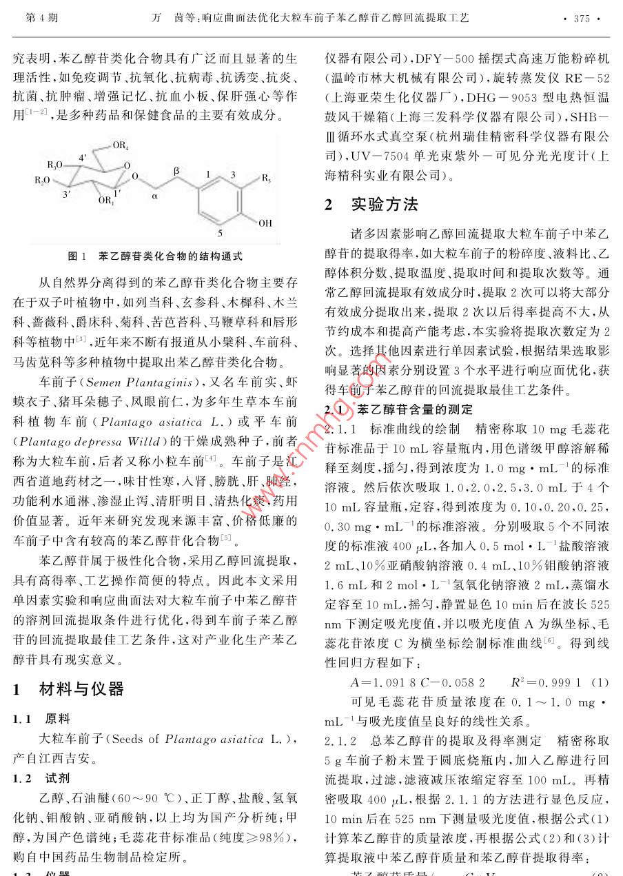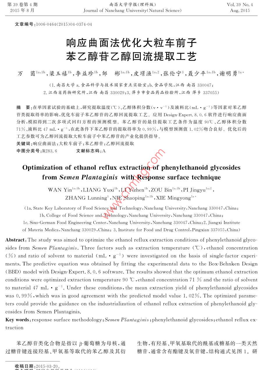 第39卷第4期南昌大學(xué)學(xué)報(bào)(理科版)Vol 39 No 42015年8月Journal of Nanchang University( Natural Science)Aug.2015文章編號(hào):1006-0464(2015)04037404響應(yīng)曲面法優(yōu)化大粒車前子苯乙醇苷乙醇回流提取工藝萬(wàn)茵,梁玉禧,李益珍ψ,鄒彬·,皮璟漁1:2,張倫寧3,聶少平l,謝明勇1(1.南昌大學(xué)a.食品科學(xué)與技術(shù)囯家重點(diǎn)實(shí)驗(yàn)室;b.食品學(xué)院2.江西省藥物研究所,江西南昌330029;3.萍鄉(xiāng)市食品藥品檢驗(yàn)所,江西萍鄉(xiāng)337055)摘要:在單因素試驗(yàn)的基礎(chǔ)上,研究提取溫度(℃)、乙醇體積分?jǐn)?shù)(v·v1)及液料比(mL·g1)等因素對(duì)苯乙醇苷類提取得率的影響,優(yōu)化車前子苯乙醇苷的乙醇回流提取工藝。應(yīng)用 Design-Expert.8.0.6軟件進(jìn)行響應(yīng)曲面分析,模擬得到二次多項(xiàng)式回歸方程的預(yù)測(cè)模型。苯乙醇苷的最佳提取工藝條件為溫度90℃、乙醇體積分?jǐn)?shù)71%、液料比47mL·g-1,在此條件下苯乙醇苷的提取得率為0.99%,與模型預(yù)測(cè)值1.02%吻合良好。優(yōu)化后的工藝參數(shù)可為乙醇回流提取大粒車前子中苯乙醇苷的產(chǎn)業(yè)化提供指導(dǎo)關(guān)鍵詞:響應(yīng)曲面法;大粒車前子;苯乙醇苷;乙醇回流提取中圖分類號(hào):R283.6文獻(xiàn)標(biāo)志碼:AOptimization of ethanol reflux extraction of phenylethanoid glycosidesfrom Semen Plantaginis with Response surface techniqueWAN YinlaIb LIANG Yuxi b. LI Yizhen b, ZOU Bina, Ib. PI Jingyu,2ZHANG Lunning, NIE Shaopinga, XIE Mingyong(la. State Key Laboratory of Food Science and Technology. Nanchang University, Nanchang 330047. China;1b. College of Food Science and Technology, Nanchang University, Nanchang 330047, ChinaIc Sino-German Food Engineering Center, Nanchang University, Nanchang 330047, China; 2. Jiangxi Instituteof Materia Medica, Nanchang 330029, China; 3. Institute for Food and Drug Control, Pingxian 337055, China)Abstract: The study was aimed to optimize the ethanol reflux extraction conditions of phenylethanoid glycosides from Semen Plantaginis. Three factors such as extraction temperature (C), ethanol concentration(%)and ratio of solvent to material (mL .g) were investigated on the basis of single-factor experiments. The predictive equation was obtained by fitting the experimental data to the box-Behnken Design( BBD)model with Design- Expert.8.0. 6 software. The results showed that the optimum ethanol extractionconditions were optimized extraction temperature 90C, ethanol concentration 71 and the ratio of solventto material 47 mL .g. Under these conditions, the mean extraction yield of phenylethanoid glycosideswas0.99%, which was in good agreement with the predicted model value 1. 02%. The optimized parame-ters could provide the guidance on the industrialization of ethanol reflux extraction of phenylethanoid glycosides from Semen plantaginisKey words: response surface methodology Semen Plantaginis; phenylethanoid glycosides; ethanol reflux extraction苯乙醇苷類化合物是指以β葡萄糖為母核,通生物,有羥基、甲氧基取代的酰基或糖基的一類天然過(guò)糖苷鍵連接羥基、甲氧基等取代的苯乙醇及其衍糖苷,通常含有酯鍵及氧苷鍵,結(jié)構(gòu)通式見(jiàn)圖1。研稿日期:2015-03-20。第4期萬(wàn)茵等:響應(yīng)曲面法優(yōu)化大粒車前子苯乙醇苷乙醇回流提取工藝究表明,苯乙醇苷類化合物具有廣泛而且顯著的生儀器有限公司),DFY-500搖擺式高速萬(wàn)能粉碎機(jī)理活性,如免疫調(diào)節(jié)、抗氧化、抗病毒、抗誘變、抗炎、(溫嶺市林大杋械有限公司),旋轉(zhuǎn)蒸發(fā)儀RE-52抗菌、抗腫瘤、增強(qiáng)記憶、抗血小板、保肝強(qiáng)心等作(上海亞榮生化儀器廠),DHG-9053型電熱恒溫用-2,是多種藥品和保健食品的主要有效成分鼓風(fēng)干燥箱(上海三發(fā)科學(xué)儀器有限公司),SHBⅢ循環(huán)水式真空泵(杭州瑞佳精密科學(xué)儀器有限公司),UV-7504單光束紫外一可見(jiàn)分光光度計(jì)(上R海精科實(shí)業(yè)有限公司)。2實(shí)驗(yàn)方法諸多因素影響乙醇回流提取大粒車前子中苯乙圖1苯乙醇苷類化合物的結(jié)構(gòu)通式醇苷的提取得率,如大粒車前子的粉碎度、液料比、乙從自然界分離得到的苯乙醇苷類化合物主要存醇體積分?jǐn)?shù)、提取溫度、提取時(shí)間和提取次數(shù)等。通在于雙子葉植物中,如列當(dāng)科、玄參科、木樨科、木蘭常乙醇回流提取有效成分時(shí),提取2次可以將大部分科、薔薇科、爵床科、菊科、苦芭苔科、馬鞭草科和唇形有效成分提取出來(lái),提取2次以后得率提高不大,從節(jié)約成本和提高產(chǎn)能考慮,本實(shí)驗(yàn)將提取次數(shù)定為2科等植物中3,近年來(lái)不斷有報(bào)道從小檗科、車前科馬齒莧科等多種植物中提取出苯乙醇苷類化合物。次。選擇其他因素進(jìn)行單因素試驗(yàn),根據(jù)結(jié)果選取影響顯著的因素分別設(shè)置3個(gè)水平進(jìn)行響應(yīng)面優(yōu)化,獲車前子( Semen plantaginis),又名車前實(shí)、蝦蟆衣子、豬耳朵穗子、鳳眼前仁,為多年生草本車前得車前子苯乙醇苷的回流提取最佳工藝條件2.1苯乙醇苷含量的測(cè)定科植物車前( Plantago asiatica L.)或平車前2.1.1標(biāo)準(zhǔn)曲線的繪制精密稱取10mg毛蕊花( Plantago depressa willd的干燥成熟種子,前者稱為大粒車前,后者又稱小粒車前。車前子是江釋至刻度,搖勻,得到濃度為1.0mg,mL的標(biāo)準(zhǔn)西省道地藥材之一,味甘性寒,入腎、膀胱、肝、肺經(jīng),溶液。然后