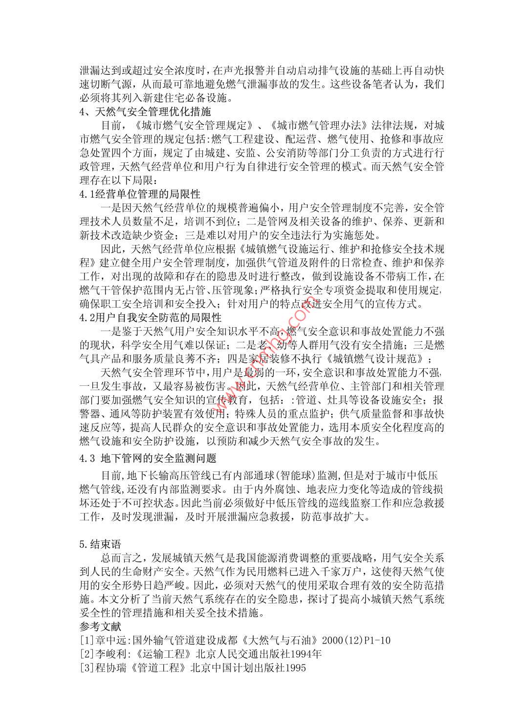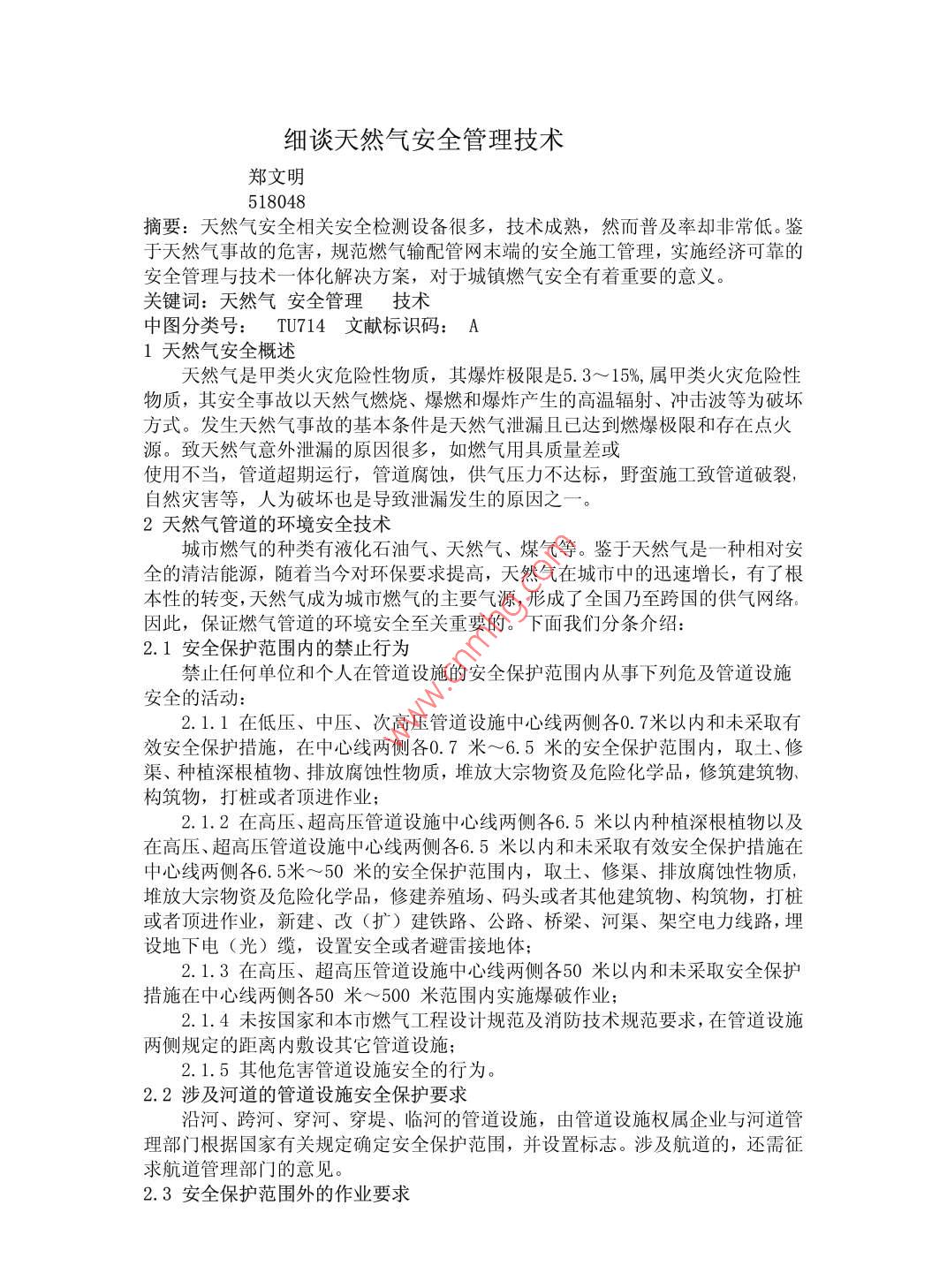 細(xì)談天然氣安全管理技術(shù)鄭文明518048摘要:天然氣安全相關(guān)安全檢測(cè)設(shè)備很多,技術(shù)成熟,然而普及率卻非常低。鑒于天然氣事故的危害,規(guī)范燃?xì)廨斉涔芫W(wǎng)末端的安全施工管理,實(shí)施經(jīng)濟(jì)可靠的安全管理與技術(shù)一體化解決方案,對(duì)于城鎮(zhèn)燃?xì)獍踩兄匾囊饬x。關(guān)鍵詞:天然氣安全管理技術(shù)中圖分類號(hào):TU714文獻(xiàn)標(biāo)識(shí)碼:A1天然氣安全概述天然氣是甲類火災(zāi)危險(xiǎn)性物質(zhì),其爆炸極限是5.3~15%,屬甲類火災(zāi)危險(xiǎn)性物質(zhì),其安全事故以天然氣燃燒、爆燃和爆炸產(chǎn)生的高溫輻射、沖擊波等為破壞方式。發(fā)生天然氣事故的基本條件是天然氣泄漏且已達(dá)到燃爆極限和存在點(diǎn)火源。致天然氣意外泄漏的原因很多,如燃?xì)庥镁哔|(zhì)量差或使用不當(dāng),管道超期運(yùn)行,管道腐蝕,供氣壓力不達(dá)標(biāo),野蠻施工致管道破裂,自然災(zāi)害等,人為破壞也是導(dǎo)致泄漏發(fā)生的原因之2天然氣管道的環(huán)境安全技術(shù)城市燃?xì)獾姆N類有液化石油氣、天然氣、煤氣等。鑒于天然氣是一種相對(duì)安全的清潔能源,隨著當(dāng)今對(duì)環(huán)保要求提高,天然氣在城市中的迅速增長,有了根本性的轉(zhuǎn)變,天然氣成為城市燃?xì)獾闹饕獨(dú)庠?形成了全國乃至跨國的供氣網(wǎng)絡(luò)。因此,保證燃?xì)夤艿赖沫h(huán)境安全至關(guān)重要的。下面我們分條介紹:2.1安全保護(hù)范圍內(nèi)的禁止行為禁止任何單位和個(gè)人在管道設(shè)施的安全保護(hù)范圍內(nèi)從事下列危及管道設(shè)施安全的活動(dòng)2.1.1在低壓、中壓、次高壓管道設(shè)施中心線兩側(cè)各0.7米以內(nèi)和未采取有效安全保護(hù)措施,在中心線兩側(cè)各0.7米~6.5米的安全保護(hù)范圍內(nèi),取土、修渠、種植深根植物、排放腐蝕性物質(zhì),堆放大宗物資及危險(xiǎn)化學(xué)品,修筑建筑物、構(gòu)筑物,打樁或者頂進(jìn)作業(yè)2.1.2在高壓、超高壓管道設(shè)施中心線兩側(cè)各6.5米以內(nèi)種植深根植物以及在高壓、超高壓管道設(shè)施中心線兩側(cè)各6.5米以內(nèi)和未采取有效安全保護(hù)措施在中心線兩側(cè)各6.5米~50米的安全保護(hù)范圍內(nèi),取土、修渠、排放腐蝕性物質(zhì),堆放大宗物資及危險(xiǎn)化學(xué)品,修建養(yǎng)殖場(chǎng)、碼頭或者其他建筑物、構(gòu)筑物,打樁或者頂進(jìn)作業(yè),新建、改(擴(kuò))建鐵路、公路、橋梁、河渠、架空電力線路,埋設(shè)地下電(光)纜,設(shè)置安全或者避雷接地體;2.1.3在高壓、超高壓管道設(shè)施中心線兩側(cè)各50米以內(nèi)和未采取安全保護(hù)措施在中心線兩側(cè)各50米~500米范圍內(nèi)實(shí)施爆破作業(yè):2.1.4未按國家和本市燃?xì)夤こ淘O(shè)計(jì)規(guī)范及消防技術(shù)規(guī)范要求,在管道設(shè)施兩側(cè)規(guī)定的距離內(nèi)敷設(shè)其它管道設(shè)施2.1.5其他危害管道設(shè)施安全的行為。2.2涉及河道的管道設(shè)施安全保護(hù)要求沿河、跨河、穿河、穿堤、臨河的管道設(shè)施,由管道設(shè)施權(quán)屬企業(yè)與河道管理部門根據(jù)國家有關(guān)規(guī)定確定安全保護(hù)范圍,并設(shè)置標(biāo)志。涉及航道的,還需征求航道管理部門的意見。2.3安全保護(hù)范圍外的作業(yè)要求在管道設(shè)施安全保護(hù)范圍外進(jìn)行爆破、打樁、修筑大型建筑物或者構(gòu)筑物等施工,可能損壞或危害管道設(shè)施安全的,應(yīng)由建設(shè)單位與相關(guān)管道設(shè)施權(quán)屬企業(yè)雙方協(xié)商一致,并采取相應(yīng)安全保護(hù)措施后方可進(jìn)行。2.4禁止的解除對(duì)于所禁止的管道安全保護(hù)范圍內(nèi)的作業(yè),如確需進(jìn)行作業(yè),需經(jīng)規(guī)劃、消防等行政主管部門同意,由建設(shè)單位與相關(guān)管道設(shè)施權(quán)屬企業(yè)雙方協(xié)商一致,并對(duì)管道設(shè)施采取相應(yīng)安全保護(hù)措施后方能進(jìn)行。2.5違法占?jí)何锏牟鸪龑?duì)占?jí)汗艿涝O(shè)施上的違法建筑物或者構(gòu)筑物,區(qū)、縣人民政府可以組織有關(guān)規(guī)劃管理部門、市燃?xì)夤芾硖幓蛘呖h(區(qū))燃?xì)庑姓芾聿块T拆除,所需費(fèi)用由違法建設(shè)的單位或者個(gè)人承擔(dān)。2.6備案施工避讓新建、改建、擴(kuò)建的建設(shè)工程確實(shí)需要管道設(shè)施改道的、搬遷或者增加安全防護(hù)設(shè)施的,由建設(shè)單位與管道設(shè)施權(quán)屬企業(yè)訂立協(xié)議和采取相應(yīng)的補(bǔ)救措施,并將協(xié)議報(bào)市燃?xì)夤芾硖巶浒?.7施工征詢建設(shè)單位在開工前,應(yīng)當(dāng)向管道設(shè)施權(quán)屬企業(yè)征詢地下管道設(shè)施的情況及施工保護(hù)要求,并組織向施工單位進(jìn)行交底。管道設(shè)施權(quán)屬企業(yè)應(yīng)當(dāng)在三日內(nèi)給予書面答復(fù)2.8維修和搶險(xiǎn)發(fā)生管道設(shè)施事故時(shí),管道設(shè)施權(quán)屬企業(yè)應(yīng)當(dāng)根據(jù)應(yīng)急處理預(yù)案,迅速采取相關(guān)的安全措施,組織不間斷的搶修、搶險(xiǎn)作業(yè),直至搶修、搶險(xiǎn)完畢。涉及道路交通的,需同時(shí)通報(bào)公安交通管理部門。3天然氣的使用安全技