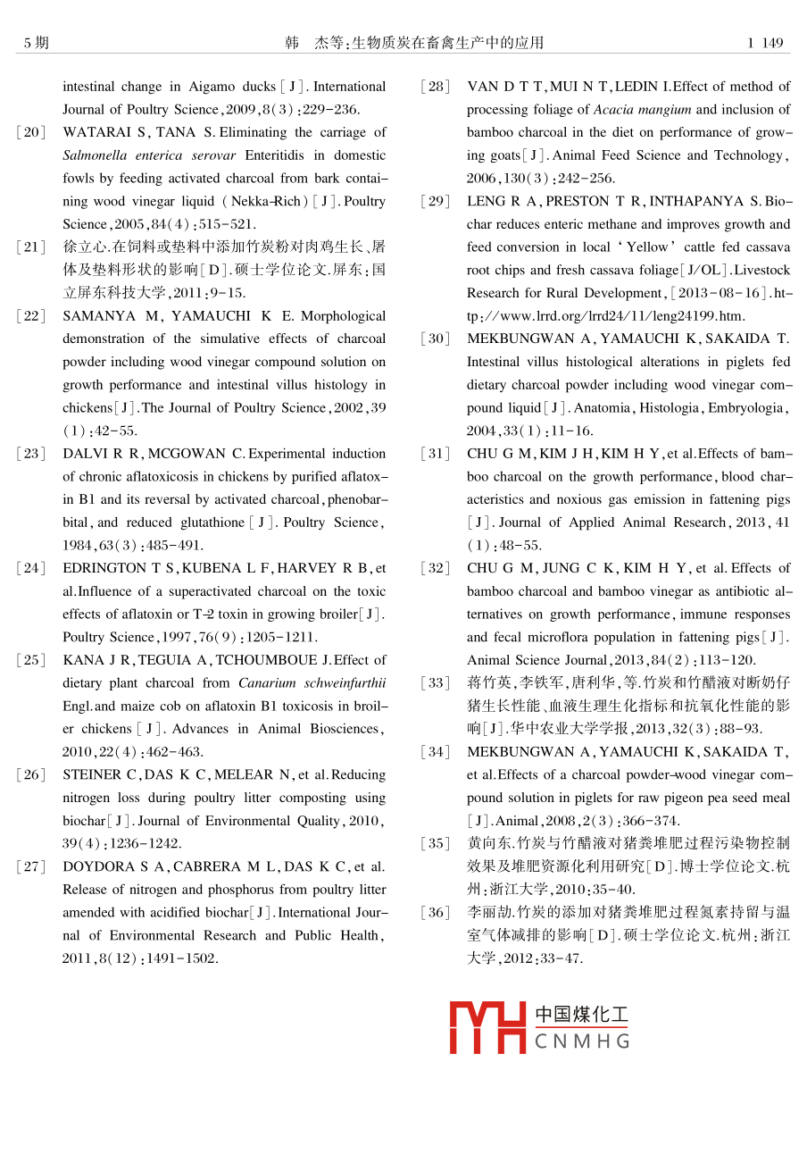 動物營養(yǎng)學(xué)報2014,26(5):1145-1150Chinese journal of Animal Nutritiondoi:10.3969/ ). Issn.1006267X,2014.05003生物質(zhì)炭在畜禽生產(chǎn)中的應(yīng)用韓杰孟軍(1.沈陽農(nóng)業(yè)大學(xué)畜牧獸醫(yī)學(xué)院,沈陽10161;2沈陽農(nóng)業(yè)大學(xué)遼寧省生物炭工程技術(shù)研究中心,沈陽110161)摘要:生物質(zhì)炭是農(nóng)林業(yè)廢棄的生物質(zhì)在缺氧條件下熱解形成的富碳產(chǎn)物。近年來,隨著全球?qū)ι镔|(zhì)炭科學(xué)研究的加強,生物質(zhì)炭在畜禽生產(chǎn)中改善動物腸道健康、促進生長性能、提高飼糧利用效率、減少糞尿污染環(huán)境等作用正在引起有關(guān)方面的廣泛關(guān)注。本文綜述了國內(nèi)外學(xué)者在畜禽生產(chǎn)中應(yīng)用生物質(zhì)炭的最新研究成果。關(guān)鍵詞:生物質(zhì)炭;農(nóng)業(yè)廢棄物;畜禽;生長中圖分類號:S816文獻標(biāo)識碼:A文章編號:1006-267X(2014)05-1450用農(nóng)林廢棄物生產(chǎn)的生物質(zhì)炭具有微孔結(jié)構(gòu)產(chǎn)生的作物和森林殘茬木材加工廢料、畜禽糞便豐富、比表面積大、高、吸附力和抗分解能力強等,工業(yè)和城鎮(zhèn)生活產(chǎn)生的有機固體廢棄物、工業(yè)等獨特的結(jié)構(gòu)和理化性質(zhì)。生物質(zhì)炭的概念在20廢水和生活污泥等也可作為原料來源。科學(xué)研世紀(jì)末被提出后,將其應(yīng)用于土壤改良和環(huán)境治究和生產(chǎn)實踐中一般以原料名稱命名生物質(zhì)炭理等領(lǐng)域的研究迅速升溫。特別是近年來,生物如秸稈炭、玉米芯炭、稻稈炭、竹炭、木炭等。質(zhì)炭潛在的應(yīng)用價值和應(yīng)用空間被進一步拓展,1.2理化特性國內(nèi)外學(xué)者發(fā)現(xiàn)在畜禽飼糧、墊料或堆肥糞便中生物質(zhì)炭主要由芳香烴和單質(zhì)碳或具有類石直接添加生物質(zhì)炭能起到改善動物腸道健康、促墨結(jié)構(gòu)的碳組成,般含有60%以上碳元素,還含進畜禽生長、提高養(yǎng)分利用效率、降低飼糧毒性、有氫、氧、氮、磷、鉀、鈣、鈉、鎂等元素。其元素組調(diào)控反芻動物瘤胃微生物發(fā)酵減少畜禽糞便污成與制炭過程中的炭化溫度密切相關(guān),具體表染環(huán)境等有益作用。此作用已經(jīng)引起政府2、科現(xiàn)為在一定范圍內(nèi)炭化溫度越高,碳、磷含量越研組織3及企業(yè)等廣泛關(guān)注。本文綜述了國內(nèi)高,氧氫含量越少。生物質(zhì)炭的礦物元素通常以外學(xué)者在畜禽生產(chǎn)中應(yīng)用生物質(zhì)炭的最新研究成氧化物或碳酸鹽形式存在,水溶液呈堿性(pH>果,對當(dāng)前生物質(zhì)炭的應(yīng)用現(xiàn)狀提出建議,旨在為7),且堿性隨熱解溫度升高而增強"。生物質(zhì)炭生物質(zhì)炭更好地服務(wù)于畜禽養(yǎng)殖業(yè)提供參考的可溶性極低,熔沸點極高,具有高度羧酸酯化資料。芳香化結(jié)構(gòu)和脂肪族鏈狀結(jié)構(gòu)”,使生物質(zhì)炭表現(xiàn)出一定的親、疏水特性和很高的生物化學(xué)和熱生物質(zhì)炭的概念及理化特性穩(wěn)定性,還使其具備了極強的吸附能力和抗氧1.1概念化能力。此外,生物質(zhì)炭化后能保持其原有的生物質(zhì)炭( biochar)也稱生物炭、生物焦炭,是良好孔隙結(jié)構(gòu),使其具有較大的孔隙度和比表生物質(zhì)在無氧或近無氧狀態(tài)下高溫(<700℃)熱面積解炭化產(chǎn)生的一類穩(wěn)定的富碳物質(zhì),大多為粉13與活性炭黑炭的關(guān)系狀顆粒。制備生物質(zhì)炭的原料主要為農(nóng)業(yè)活動中中國煤化工黑炭同屬于生物質(zhì)CNMHG收稿日期:2013-11-29基金項目:農(nóng)業(yè)部公益性行業(yè)(農(nóng)業(yè))科研專項(201303095);遼寧省高校重大科技平臺建設(shè)計劃項目作者簡介:韓杰(1978—),女,遼寧撫順人博士研究生,從事生物炭畜禽生產(chǎn)研究E—mail: hanjiell30@163com通訊作者:孟軍,教授,博士生導(dǎo)師, E-mail: mengjun1217@163,com1146動物營養(yǎng)學(xué)報26卷高溫?zé)峤猱a(chǎn)物,具有相似的理化和生物學(xué)特性。等2發(fā)現(xiàn)飼糧添加1%木炭與木醋液混合物使來活性炭是生物質(zhì)炭或黑炭在化學(xué)制劑激活下產(chǎn)生航雞十二指腸、空腸、回腸絨毛頂端上皮細胞輪廓的,其比表面積(超過1000m/g)遠大于生物質(zhì)清晰度顯著提高,細胞突起明顯,其效果比單獨添炭(30m3/g),售價為生物質(zhì)炭的5~10加%木炭或0.1%木醋液對來航雞腸功能的激活倍。黑炭涵蓋了生物質(zhì)略微炭化到燃燒后黑煙作用明顯。 Ruttanavut等研究表明,1%竹炭與顆粒的炭化物質(zhì),生物質(zhì)炭和活性炭均屬于廣義竹醋液混合物能顯著提高日本合鴨腸絨毛高度概念上黑炭的一種類型。但它們在應(yīng)用范疇上面積、上皮細胞面積,促進上皮細胞有絲分裂,使不盡相同。生物質(zhì)炭更多被定位于農(nóng)業(yè)土壤、環(huán)腸絨毛頂端出現(xiàn)了很多隆起的細胞,提示竹炭與境生態(tài)等領(lǐng)域,強調(diào)保護環(huán)境和固碳減排。而黑竹醋液混合物能改善鴨的腸道功能。炭側(cè)重強調(diào)隨地質(zhì)年代變遷逐漸形成的自然產(chǎn)2.1.3降低飼糧毒素毒性物,主要用于工業(yè)和能源領(lǐng)域。國外很多試驗表明,生物質(zhì)炭能吸附飼糧中的黃曲霉毒素(AF),降低飼糧毒素對機體的損2生物質(zhì)炭在畜禽生產(chǎn)中的應(yīng)用傷美國塔斯克基