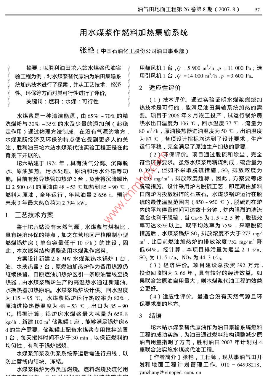 油氣田地面工程第26卷第8期(2007.8)57用水煤漿作燃料加熱集輸系統(tǒng)張艷(中國石油化工股份公司油田事業(yè)部)摘要:以勝利油田坨六站水煤漿代油實用鼓風機1臺,Q=5900m3/h,p=11000Pa;選驗工程為例,對水煤漿替代原油為油田集輸系用引風機1臺,Q=14000m3/h,p=3600Pa統(tǒng)加熱技術進行了探索,并從工藝技術、經濟2適應性評價性、環(huán)保等方面對其可行性進行了評價。關鍵詞:燃料;水煤;可行性1)技術評價。通過實驗證明水煤漿燃燒加熱技術是可行的,能滿足油田集輸系統(tǒng)加熱的需水煤漿是一種清潔能源,由65%~70%的精要。項目于2006年8月竣工投產,試運行鍋爐房洗煤粉與30%~35%的水及少量的添加劑(起穩(wěn)熱水出囗溫度為106℃,回水溫度77℃,流量為定作用)通過物理方法制成。在沒有氣源的地方,80m/h,原油換熱器進油溫度為50℃,出油溫度水煤漿既經濟又環(huán)保的特點使它受到更多人的關為87℃,各項設計指標均達到了設計要求,生產注,勝利油田坨六站水煤漿代油實驗工程正是在此運行平穩(wěn),完全滿足了原油生產加熱的需要。背景下開展的。(2)環(huán)保評價。項目通過脫硫和除塵,完全坨六站建于1974年,具有油氣分離、沉降脫符合環(huán)保要求。雖然水煤漿用精煤制成,硫含量為水、原油加熱、污水處理、原油和污水外輸?shù)裙?.39%,但如不采取脫硫措施,SO2排放濃度為能。目前有超導熱管加熱爐2臺,負責將沉降罐出1093mg/m3,排放濃度超標,因此,方案要考慮口2500υd的原油由48~53℃加熱到85~90℃,脫硫措施。設計采用爐內脫硫工藝,即定期由加料燃料為原油,全年運行,年耗油量2656t。預計口向爐內投放粉碎的石灰石。水煤漿鍋爐運行在脫未來3年最大熱負荷為2794kW。硫的最佳溫度范圍內(850~950℃),脫硫劑在爐1工藝技術方案內的平均停留時間可達數(shù)十分鐘,爐內強烈的湍流混合也利于脫硫,當Ca/S為1.5~2.5時,脫硫效鑒于坨六站沒有天然氣源,水煤漿與煤相比,率可達85%以上。取平均效率為75%,采取脫硫具有經濟環(huán)保的特點,加之東營地區(qū)嚴格限制小型措施后,水煤漿鍋爐SO2排放濃度不大于273mg燃煤鍋爐房(單臺容量低于10th)的建設,因m,比目前燃油加熱爐的排放濃度752mg/m3降此,本次燃料結構調整選用水煤漿作燃料。低64%。經計算,本項目排污量為煙塵2.1t/a方案設計新建28MW水煤漿熱水鍋爐1臺,SO2為1.5va、NOx為44.3va油、水換熱器3臺,原燃油加熱爐作為備用熱源仍(3)經濟評價。項目建設總投資392萬元繼續(xù)保留。自原燃油加熱爐區(qū)引一條原油管線至換投資回收期為3.66年,具有較好的經濟效益。如熱器,由水煤漿鍋爐生產的高溫熱水通過新建油、果聯(lián)合站原油自用量大,則水煤漿代油工程的效益水換熱器加熱原油。水煤漿鍋爐設計供、回水溫度會更好。為115~95℃。水煤漿鍋爐運行熱效率為82%(4)適應性評價。最適合沒有天然氣源且環(huán)原油進換熱器溫度為48~53℃,出口為85~90保要求高的地方?!妗8鶕?jù)計算,鍋爐房水煤漿最大耗量為659.83結語kg/h,新建100m3儲漿罐1座,能夠滿足鍋爐房6d的生產需要。儲漿罐上配備水煤漿專用攪拌裝置坨六站水煤漿替代原油作為油田集輸系統(tǒng)燃料1臺,每天攪拌時間不少于30min,以保證燃料的工程的成功實施,為油田通過燃料結構調整減少原均勻性,有利于鍋爐燃燒。油自用量指明了方向,勝利油田2007年計劃對4水煤漿卸漿及供漿系統(tǒng)停運后需進行掃線,以座聯(lián)合站實施水煤漿代油工程。防止管線內結塊、凍結。[作者簡介]張艷,工程師,現(xiàn)從事油氣田開水煤漿鍋爐為微負壓燃燒。燃料燃燒及流化用發(fā)和地面工程計劃管理工作。010-64998218、anzhang sinopec com. cn