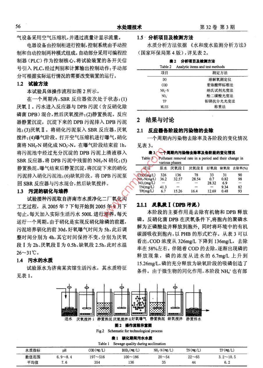 第33卷第3期水處理技術(shù)VoL.33 No.32007年3月TECHNOLOGY OF WATER TREATMENTMar,200755賓館生活污水的脫氮除磷張繼才',胡文容',潘建強(qiáng)2(1.山東大學(xué)環(huán)境科學(xué)與工程學(xué)院,山東濟(jì)南250100;2.濟(jì)南十方環(huán)保有限公司,山東濟(jì)南250101)摘要:在克服常規(guī)脫氮除磷與反硝化除磷技術(shù)缺點(diǎn)的基礎(chǔ) 上將兩者優(yōu)勢(shì)結(jié)合起來(lái),設(shè)計(jì)了具有一個(gè)主反應(yīng)池和兩個(gè)較小污泥池的雙泥SBR新工藝。處理某賓館實(shí)際生活污水,試驗(yàn)結(jié)果表明:COD.TN和TP的去除率達(dá)到90%、82%、93%。出水水質(zhì)指標(biāo)滿足現(xiàn)行的《城鎮(zhèn)污水處理廠污染物排放標(biāo)準(zhǔn)》(GB18918-2002 )-級(jí)標(biāo)準(zhǔn)的要求。同時(shí)討論了DO、污泥齡對(duì)系統(tǒng)運(yùn)行的影響。關(guān)鍵詞:SBR;脫氮除磷;聚磷菌;反硝化除磷菌中團(tuán)分類號(hào):X703.1文獻(xiàn)標(biāo)識(shí)碼:A文編號(hào): 000-3770(200)03055504氮、磷是造成水體富營(yíng)養(yǎng)化的主要原因。在傳統(tǒng)1試驗(yàn)裝置及方法生物脫氮除磷工藝中,脫氮和除磷是彼此獨(dú)立的過(guò)1.1試驗(yàn)裝i程,分別由不同的微生物完成,由于硝化菌、反硝化試驗(yàn)裝置如圖1所示。該試驗(yàn)裝置用工程塑料菌和聚磷菌(Poly-Phosphate Accumulating Organ-制成,由一個(gè)SBR反應(yīng)器和兩個(gè)較小的污泥池組isms,縮寫(xiě)為PAO)之間存在著碳源和泥齡的競(jìng)爭(zhēng)成。SBR反應(yīng)器長(zhǎng)、寬、高各80cm,底部泥斗為四棱等矛盾,工程實(shí)踐中往往出現(xiàn)脫氮效果好而除磷效錐形,傾角為60度,總有效容積為500L。兩個(gè)污泥果差或正好相反的情況。為了同時(shí)取得較好的脫氮池分別用來(lái)存放DPB污泥和硝化污泥,大小相等,除磷效果,污水往往需要在多個(gè)反應(yīng)器之間反復(fù)流長(zhǎng)、寬、高各60cm,底部泥斗為四棱錐形,總有效容積轉(zhuǎn)和補(bǔ)充碳源,從而增加了動(dòng)力消耗和處理成本。為200L。SBR反應(yīng)器內(nèi)設(shè)置曝氣管和攪拌器,轉(zhuǎn)速近年來(lái),許多研究中發(fā)現(xiàn)一類可以在缺氧 (無(wú)100r/min,反應(yīng)器底部設(shè)有污泥排放管,側(cè)壁設(shè)有排O,存在NO;)條件下吸磷的反硝化除磷菌(Denitri-水管。進(jìn)水和污泥的切換分別由水泵和污泥泵控制。fying Phosphorus Removing Bacteria,縮寫(xiě)為DPB)叼,排泥管、污泥回流管和排水管上均安裝電動(dòng)閥門(mén)。曝它們能以NO;為電子受體,利用內(nèi)碳源,可以在反攪拌器硝化的同時(shí)進(jìn)行缺氧吸磷,為污水脫氮除磷工藝的發(fā)展提供了新思路。但反硝化除磷工藝除磷效率比SR反應(yīng)器進(jìn)水泵好氧除磷相對(duì)低- -些, 進(jìn)水中的氮和磷很難恰好滿接水閥' oo足缺氧攝磷的要求,這給系統(tǒng)的控制帶來(lái)了困難印。本試驗(yàn)研究采用雙泥SBR工藝,將常規(guī)除磷原B理和反硝化除磷原理結(jié)合起來(lái),可以消除常規(guī)脫氮空氣壓縮機(jī)| 污泥池除磷工藝存在的碳源和泥齡競(jìng)爭(zhēng)的矛盾,同時(shí)SBR工藝具有投資少、效率高、操作簡(jiǎn)單、可在線控制等優(yōu)點(diǎn),適宜于中小水量的處理,通過(guò)合理地控制系統(tǒng)- t-運(yùn)行,可以有效克服反硝化除磷工藝的缺點(diǎn),從而使河泥回流泵圈1實(shí)驗(yàn)裝置示意圈本工藝更適合低CIN比和高含P污水的處理。Fig.1 Schematic for experimental device收稿日期: 2006-03-10作者簡(jiǎn)介:張繼才(1979-) ,男,碩士研究生,主要從事水處理技術(shù)的研究:聯(lián)系電話: 13455130967; E-mail:zhjcai@126 com.56水處理技術(shù)第32卷第3期氣設(shè)備采用空氣壓縮機(jī),并通過(guò)流量計(jì)顯示流量。1.5.分析項(xiàng)目及檢測(cè)方法電器設(shè)備由控制柜進(jìn)行控制,控制系統(tǒng)由手動(dòng)控水質(zhì)分析方法依據(jù)《水和廢水監(jiān)測(cè)分析方法》制和自動(dòng)控制兩種模式組成。自動(dòng)部分采用可編程控(國(guó)家環(huán)保局第4版) ,詳見(jiàn)表2。制器(PLC)作為控制核心,將試驗(yàn)裝置的各開(kāi)關(guān)信表2分析項(xiàng)目及檢測(cè)方法號(hào)引入PLC,經(jīng)過(guò)判別和計(jì)算輸出控制動(dòng)作;手動(dòng)部Table2 Analytic items and test methods項(xiàng)目測(cè)定方法分可根據(jù)實(shí)際運(yùn)行情況的需要改變裝置的運(yùn)行。)0溶解氧測(cè)定儀1.2 試驗(yàn)方法oD重鉻酸鉀標(biāo)準(zhǔn)法本試驗(yàn)具體操作流程如圖2所示。NH5-N納氏試劑光度法NO:酚二磺酸光度法在一個(gè)周期內(nèi),SBR反應(yīng)器依次處于狀態(tài):(1)TP鉬銻抗分光光度法厭氧I。污水進(jìn)入反應(yīng)器與DPB污泥(含反硝化除MLSS稱重法磷菌DPB)混合,然后厭氧攪拌;(2)靜置換泥。反應(yīng)器靜置沉淀,沉淀下來(lái)的DPB污泥排入DPB污泥2結(jié)果與討論池;(3)厭氧I。將硝化污泥泵入SBR反應(yīng)器,厭氧2.1反應(yīng)器各階段的污染物的去除攪拌;(4)曝氣階段。打開(kāi)空氣壓縮機(jī)進(jìn)行曝氣,硝化一個(gè)周期內(nèi)污染物去除率及各階段的變化情況菌將NHyN硝化成NO;-N。在曝氣階段結(jié)束前l(fā)h,見(jiàn)表3。將污泥池中經(jīng)過(guò)充分沉淀的DPB污泥上清液移入衰3一個(gè)周期內(nèi)污染物去除率及備階段的變化情況SBR反應(yīng)器,將DPB污泥中殘留的NH-N硝