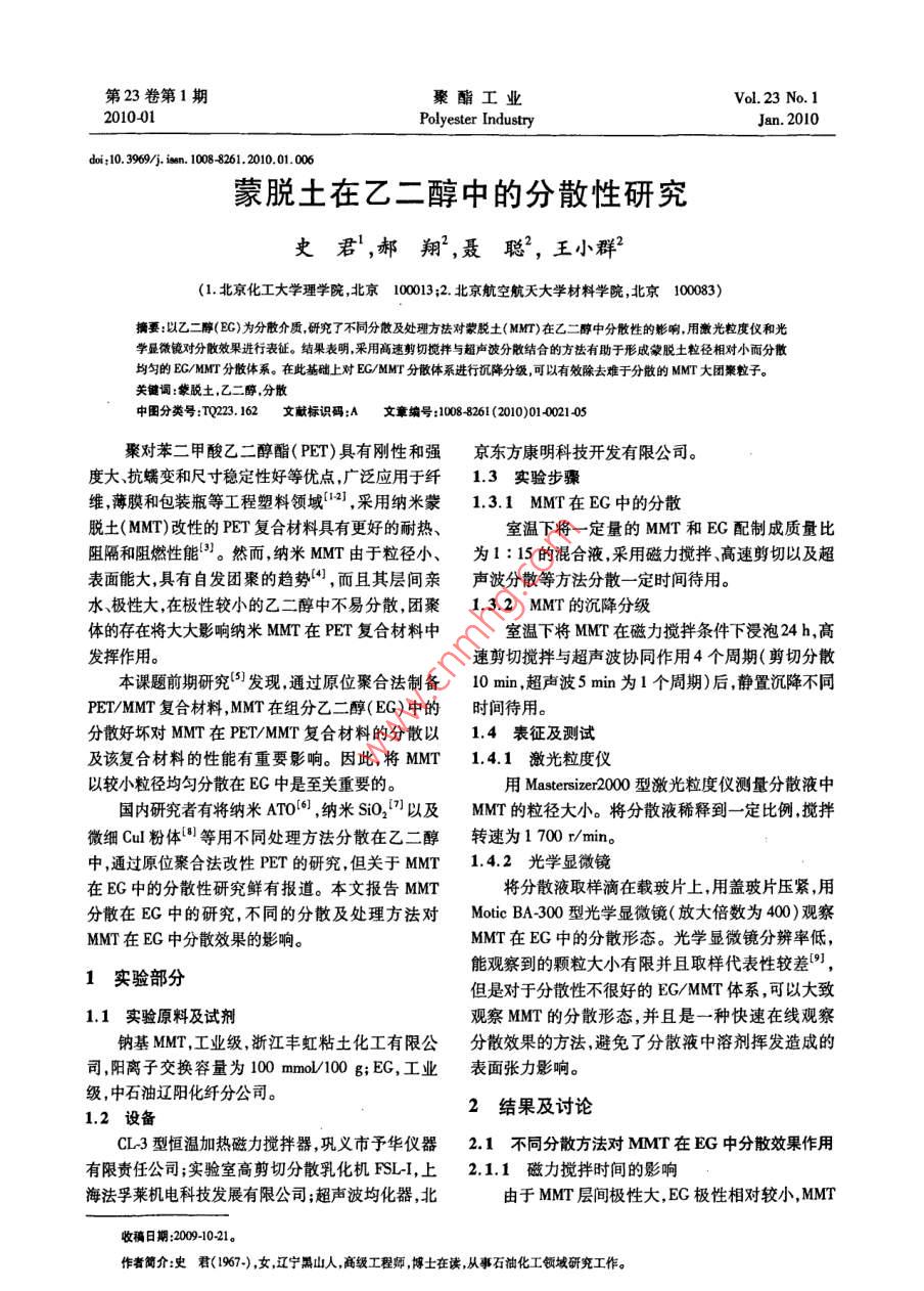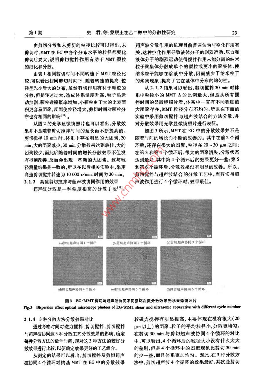 第23卷第1期聚酯工業(yè)VoL 23 No. 1201001Polyester IndustryJan.2010doi:10.3969/j,isn.10088261,2010.01.006蒙脫土在乙二醇中的分散性研究史君,郝翔,聶聰2,王小群(1.北京化工大學理學院北京100013;2.北京航空航天大學材料學院北京100083)摘要:以乙二醇(BG)為分散介質研究了不同分散及處理方法對蒙脫土(MMT)在乙二醇中分散性的彰響用激光粒度儀和光均勻的EGMT分散體系。在此基礎上對EGMM分散體系進行沉降分級可以有效除去難于分散的MMT大團W之散學顯微鏡對分散效果進行表征。結果表明采用高速剪切攪拌與超聲波分散結合的方法有助于形成蒙脫土粒徑相對小關鍵詞:蒙脫土,乙二醇分散中圖分類號:TQ223.162文獻標識碼:A文章編號:10088761(2010)0140021405聚對苯二甲酸乙二醇酯(PET)具有剛性和強京東方康明科技開發(fā)有限公司。度大、抗蠕變和尺寸穩(wěn)定性好等優(yōu)點,廣泛應用于纖13實驗步驟維薄膜和包裝瓶等工程塑料領域12,采用納米蒙1.3.1MMT在EG中的分散脫土(MMT)改性的PET復合材料具有更好的耐熱、室溫下將一定量的MMT和EG配制成質量比阻隔和阻燃性能。然而,納米MMT由于粒徑小、為1:15的混合液采用磁力攪拌高速剪切以及超表面能大,具有自發(fā)團聚的趨勢,而且其層間親聲波分散等方法分散一定時間待用。水極性大在極性較小的乙二醇中不易分散,團聚13.2MMT的沉降分級體的存在將大大影響納米MMT在PET復合材料中室溫下將MMT在磁力攪拌條件下浸泡24h,高發(fā)揮作用。速剪切攪拌與超聲波協(xié)同作用4個周期(剪切分散本課題前期研究發(fā)現(xiàn),通過原位聚合法制備10mn,超聲波5min為1個周期)后靜置沉降不同PET/MMT復合材料,MMT在組分乙二醇(EG)中的時間待用。分散好壞對MMT在 PET/MMT復合材料的分散以1.4表征及測試及該復合材料的性能有重要影響。因此,將MMT1.4.1激光粒度儀以較小粒徑均勻分散在EG中是至關重要的。用 Mastersizer000型激光粒度儀測量分散液中國內(nèi)研究者有將納米AT0,納米SO2以及MMr的粒徑大小。將分散液稀釋到一定比例,攪拌數(shù)細Cu粉體國等用不同處理方法分散在乙二醇轉速為1700r/mino中通過原位聚合法改性PET的研究,但關于MMT1.42光學顯微鏡在EG中的分散性研究鮮有報道。本文報告MMT將分散液取樣滴在載玻片上,用蓋玻片壓緊,用分散在EG中的研究,不同的分散及處理方法對 Motic BA300型光學顯微鏡(放大倍數(shù)為400)觀察MMT在EG中分散效果的影響。MMT在EG中的分散形態(tài)。光學顯微鏡分辨率低1實驗部分能觀察到的顆粒大小有限并且取樣代表性較差但是對于分散性不很好的 EG/MMT體系,可以大致11實驗原料及試劑觀察MMT的分散形態(tài),并且是一種快速在線觀察鈉基MMT,工業(yè)級,浙江豐虹粘土化工有限公分散效果的方法,避免了分散液中溶劑揮發(fā)造成的司,陽離子交換容量為100mmol/100g;EC,工業(yè)表面張力影響。級,中石油遼陽化纖分公司。12設備2結果及討論CL3型恒溫加熱磁力攪拌器,鞏義市予華儀器2.1不同分散方法對MMT在EG中分散效果作用有限責任公司;實驗室高剪切分散乳化機FSLI,上2.1.1磁力攪拌時間的影響海法孚萊機電科技發(fā)展有限公司;超聲波均化器,北由于MMT層間極性大,EG極性相對較小,MMT收稿日期:20091021。作者簡介:史君(1967-),女,江寧黑山人,高級工程師博士在讀,從事石油化工領域研究工作。2聚酯工業(yè)第23卷不能很好地分散在EG中。本實驗采用在磁力攪拌表2不同剪切轉速和時間下MMT在EG中的粒徑分布下浸泡的方式對MM進行預處理期望使MM在T-e2 Particle size distribution of MMT In EG withEG中溶脹更多EG吸附到MMT片層。圖1所示為Ifferent shear rate and time磁力攪拌2h,1d后體系的顯微鏡照片。剪切轉速/剪切時間′D(0.1)/D(0.5)/D(0.9)/從圖1中可以看出,磁力攪拌時間為1d,相比(r·min-1)未攪拌攪拌2h分散效果要好,但是仍有大的團聚。磁力3.179.5932.26攪拌2d時,粒子的分散效果并沒有明顯的改善磁75008.912734力攪拌能一定程度上使分散的更均勻,但由于其攪00050002.9630.拌速率限制,不能使大團聚打開。100022.16100008.7526.100002.85150002.858.5225.61(a)磁力攪拌2ha)剪切攪拌10minb)磁力攪拌1d圖1 EG/MMT磁力攪拌不同時間分散效果光學顯微鏡照片(b剪切攪拌30minFig 1 Dispersion effect optical microscope photoes ofEG/MMT with different magnetic stirring time21.2高速剪切攪拌轉速和時間的作用對于高速剪切攪拌對MMT在EG中的分散效果,采用激光粒度儀測量不同剪切轉速和時間下MMT的粒徑大小,同時也用光學顯微鏡觀察了)剪切攪拌60minMMT的分散形態(tài)。其結果如表1,2所示。表1相同剪切時間不同轉速下MMT在EG中的粒徑分布Table 1 Particle size distribution of mMT血nEGw圖2EG/MMT剪切攪拌不同時間分散效果光學顯微鏡照片same shear time and different shear rateFig. 2 Dispersion effect optical microscope photoes ofEG/MMT with different shear stirring time剪切轉速/剪切時間/D(0.1)′D(0.5)/D(0.9)/表2中所列為不同剪切攪拌時間和轉速下10002.858.1522.16MMT在EG中的粒徑分布,其中D(0.1),D(0.5)和125002.918.74265D(0.9)分別代表累計分布百分數(shù)達到10%,50%和2858.5225690%時所對應的粒徑值,其中D(0.9)為主要參考數(shù)值第1期史君,等:蒙脫土在乙二醇中的分散性研究由剪切分散和未剪切的粒徑比較可以得出,未超聲波分散作用的機理目前普遍認為與空化作用有剪切時,MMT在EG中各個分布水平的粒徑都要比關,這種空化作用導致液體分子的劇烈運動壓力和剪切后要大,說明剪