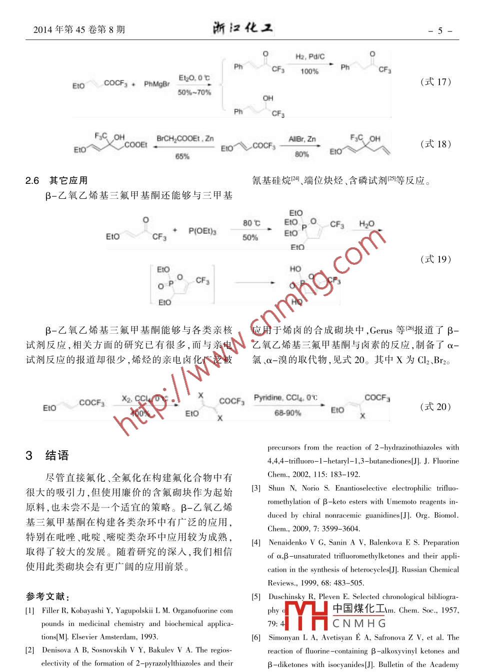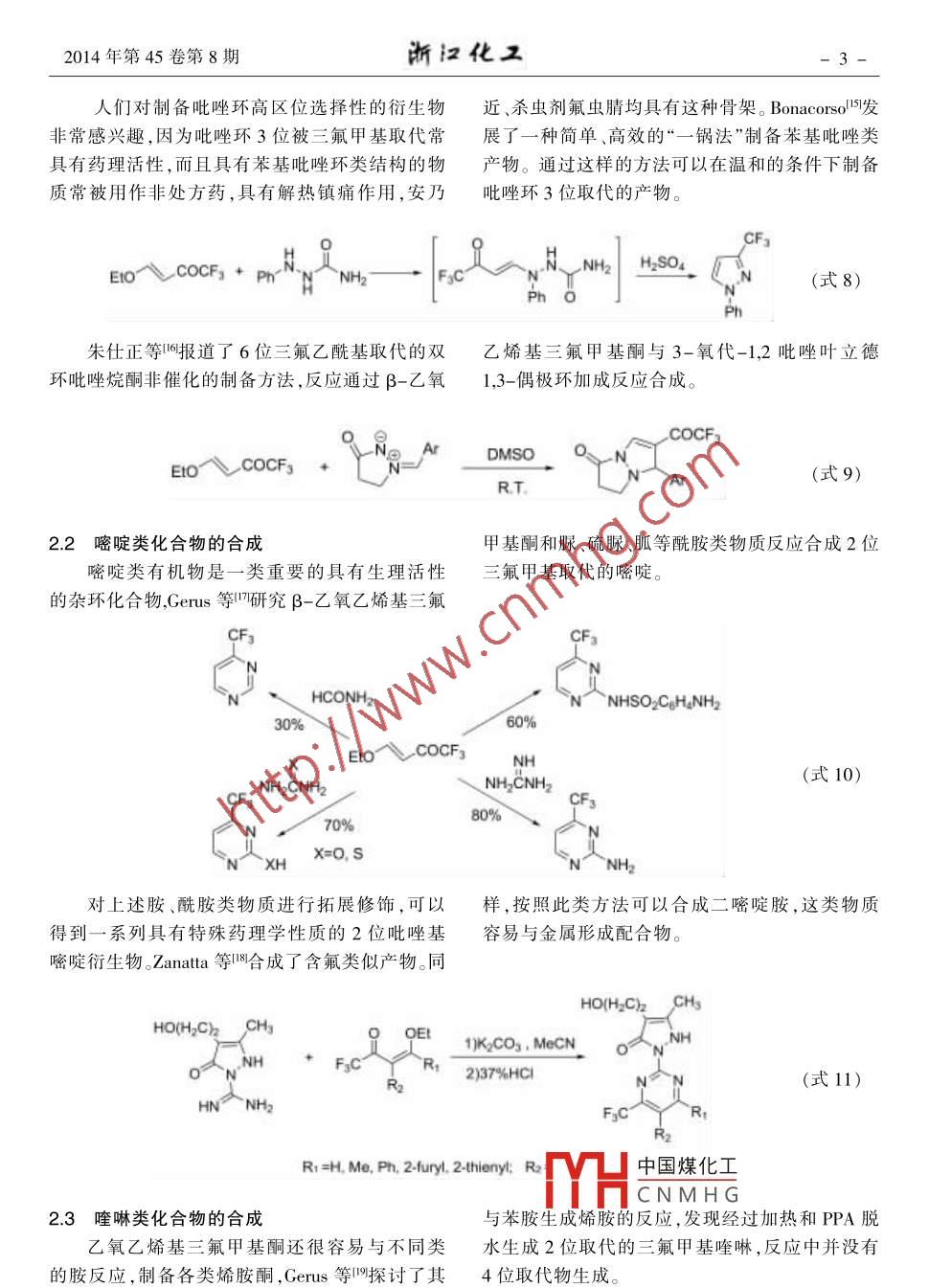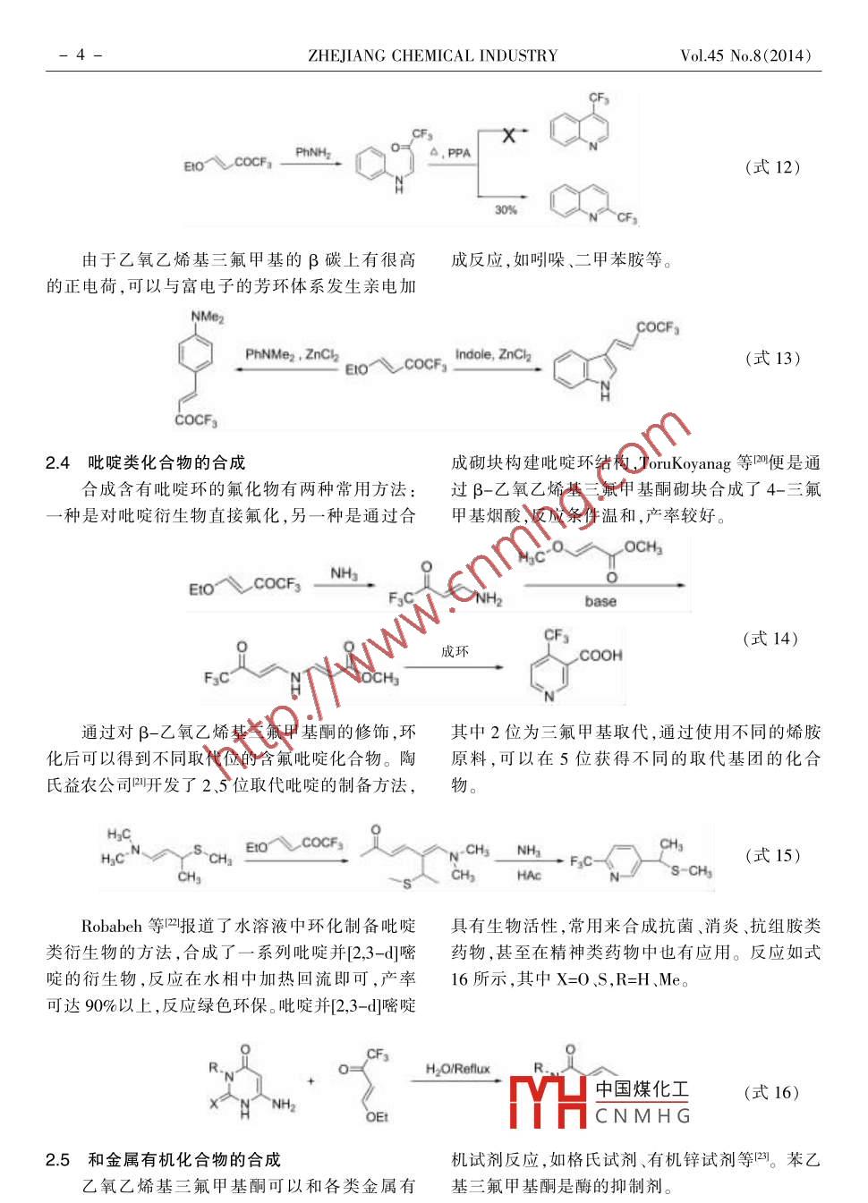 2014年第45卷第8期.浙江化工氟化工β-乙氧乙烯基三氟甲基酮的合成及應(yīng)用陳偉1,羅霞2,李華',徐衛(wèi)國(guó)1(1.浙江省化工研究院有限公司,浙江杭州310023;2.中化藍(lán)天集團(tuán)有限公司,浙江杭州310051)摘要:簡(jiǎn)述了β-乙氧乙烯基三氟甲基酮的合成,以及作為基本的含氟砌塊在含三氟甲基雜環(huán)類(lèi)物質(zhì)合成中的應(yīng)用。關(guān)鍵詞:含氟砌塊;雜環(huán)合成;應(yīng)用文章編號(hào): 1006-4184(2014)8-0001 -06通過(guò)把甲基轉(zhuǎn)化為三氟甲基四是合成具有生個(gè)反應(yīng)位點(diǎn),不僅能夠和常用的化學(xué)試劑醇類(lèi)、胺物活性化合物的有效手段,科研人員開(kāi)發(fā)了許多類(lèi) 、金屬有機(jī)試劑等反應(yīng),還能夠構(gòu)筑雜環(huán)類(lèi)化氟化試劑,可以對(duì)分子的特定位置進(jìn)行氟化,進(jìn)而合物,這在合成農(nóng)藥、醫(yī)藥中間體5時(shí)非常重要。構(gòu)建需要的含氟分子。通過(guò)直接引人三氟甲基基1β-乙氧乙烯基三氟甲基酮的合成團(tuán)也不失為一一個(gè)好策略,典型的如含有三氟甲基的1,3二酮類(lèi)凹β -酮酸酯類(lèi)甲,然而人們對(duì)三氟乙Gambaryan等在1967 年首次合成了β-乙酰乙醛及其衍生物β-烷氧乙烯基三氟甲基酮4氧乙烯基三氟甲基酮,反應(yīng)通過(guò)全氟硝基丙酮和作為二酮類(lèi)合成砌塊的關(guān)注較少,由于其含有多乙基乙烯基醚經(jīng)過(guò)三步合成,總產(chǎn)率52%。EIOCH=CH23ateps.Ero COCFFxC CF:NO2(式1)52%1976年,日本研究人員發(fā)現(xiàn)三氟乙酸酐和乙基乙烯基醚反應(yīng)可以較高產(chǎn)率得到目標(biāo)產(chǎn)物。(CFgCO)2OPy(式2)95%Gorbunova等8發(fā)現(xiàn)通過(guò)乙基乙烯醚和各類(lèi)全氟烷基酮,但是二氟甲基乙?;a(chǎn)率只有全氟烷基酰氯反應(yīng)可以制備多種β-烷氧乙烯基23%,而單氟甲基在同等條件下不能夠發(fā)生反應(yīng)。yrr .COR=E10-● R-Coc60%~90%R:= CF2SO2F. C2Fs. CgFr.中國(guó)煤化工(式3)Yield, % 6377 83MYHCNMHG修回日期:2014-07-29作者簡(jiǎn)介:陳偉(1985-),男,江蘇徐州人,工程師,碩士,從事含氟精細(xì)化學(xué)品研究。E-mail:chenwei17@sinochem.com。2-ZHEJIANG CHEMICAL INDUSTRYVol.45 No.8(2014)Moriguchi等對(duì)此類(lèi)反應(yīng)的機(jī)理進(jìn)行了深人.CFCO0-較為容易脫去,發(fā)生E1或E2消除反應(yīng)探討,在催化劑作用下烯醚與三氟乙酸酐容易形生成乙氧乙烯基三氟甲基酮,第三種是過(guò)渡態(tài)直成式2所示的離子型過(guò)渡態(tài),由于其不穩(wěn)定性,接發(fā)生E1消除,生成目標(biāo)產(chǎn)物。目標(biāo)產(chǎn)物有順?lè)磿?huì)迅速產(chǎn)生三種產(chǎn)物,第一種為烯醚的聚合產(chǎn)異構(gòu)的區(qū)別。物,第二種為三氟乙酸酐和雙鍵的加成產(chǎn)物,PalyOR(CF;CO)20CF:COOQCOCF:A OR(式4)FycOCFyCOC~ ORE1or E2E1β-乙氧乙烯基三氟甲基酮在酸性條件下很狀的形式存在。當(dāng)加人過(guò)渡金屬離子時(shí),很容易容易水解,生成乙醇和三氟乙酰乙醛,由于烯醇和過(guò)渡金屬離子形成相應(yīng)的配合物,這在分析化式有弱氫鍵作用力的存在,所以通常是以六元環(huán)學(xué)中非常有用"。H*, rtM"*E1IO--EtOH"。~CFs(式5)2β-乙氧乙烯基三氟甲基酮在合成甲基酮在構(gòu)建含氟雜環(huán)中有廣泛的應(yīng)用。2.1吡唑和異惡唑類(lèi)化合物的合成中的應(yīng)用含氟吡唑類(lèi)衍生物常被用作農(nóng)藥中間體,雜環(huán)的合成始終是有機(jī)合成中的熱門(mén)領(lǐng)域,Gerus等叫首先報(bào)道了β-乙氧乙烯基三氟甲基酮含氟雜環(huán)化合物由于其潛在的生物藥理活性,引與肼、羥胺等反應(yīng)制備吡唑和異惡唑。起了有機(jī)化學(xué)家廣泛的研究。β-乙氧乙烯基三氟FsCNHNHNH2OHFzC aP2Os心60%EIoVCOCFs100%HO70%(式6)不同的肼類(lèi)取代物和β-乙氧乙烯基三氟甲劑、反應(yīng)速度快,與傳統(tǒng)的使用乙醇作為溶劑的基酮反應(yīng)能夠合成不同生物活性的藥物中間體,反應(yīng)相比更加環(huán)保。β-乙氧乙烯基三氟甲基酮與如抗菌、抗炎、抗氧化劑類(lèi)12-1。Clarisal4報(bào)道了微3-氧代-3-肼基丙酸乙酯在微波下70 C反應(yīng)波法制備含氟吡唑類(lèi)衍生物,該反應(yīng)不使用溶6min即可得到反應(yīng)產(chǎn)物,反應(yīng)產(chǎn)率可達(dá)80%。中國(guó)煤化工0。MYHCNMHGEro COCFg * EO。(式7)0 OEI2014年第45卷第8期.浙江化工-3-人們對(duì)制備吡唑環(huán)高區(qū)位選擇性的衍生物近、殺蟲(chóng)劑氟蟲(chóng)腈均具有這種骨架。Bonacorsol5'發(fā)非常感興趣,因?yàn)檫吝颦h(huán)3位被三氟甲基取代常展了一種簡(jiǎn)單、高效的“一鍋法”制備苯基吡唑類(lèi)具有藥理活性,而且具有苯基吡唑環(huán)類(lèi)結(jié)構(gòu)的物產(chǎn)物。通過(guò)這樣的方法可以在溫和的條件下制備質(zhì)常被用作非處方藥,具有解熱鎮(zhèn)痛作用,安乃吡唑環(huán)3位取代的產(chǎn)物。E1O、COCFs + Ph-^~NH2FsC(式8)Ph朱仕正等呵報(bào)道了6位三氟乙?;〈碾p.乙烯基三氟甲基酮與3-氧代-1,2吡唑葉立德環(huán)吡唑烷酮非催化的制備方法,反應(yīng)通過(guò)β-乙氧1,3-偶極環(huán)加成反應(yīng)合成。COCF:ArDMSOEto COCFs9(式9)R.T.2.2嘧啶類(lèi)化合物的合成甲基酮和脲、硫脲、胍等酰胺類(lèi)物質(zhì)反應(yīng)合成2位嘧啶類(lèi)有機(jī)物是一-類(lèi)重要的具有生理活性三氟甲基取代的嘧啶。的雜環(huán)化合物,Gerus等7研