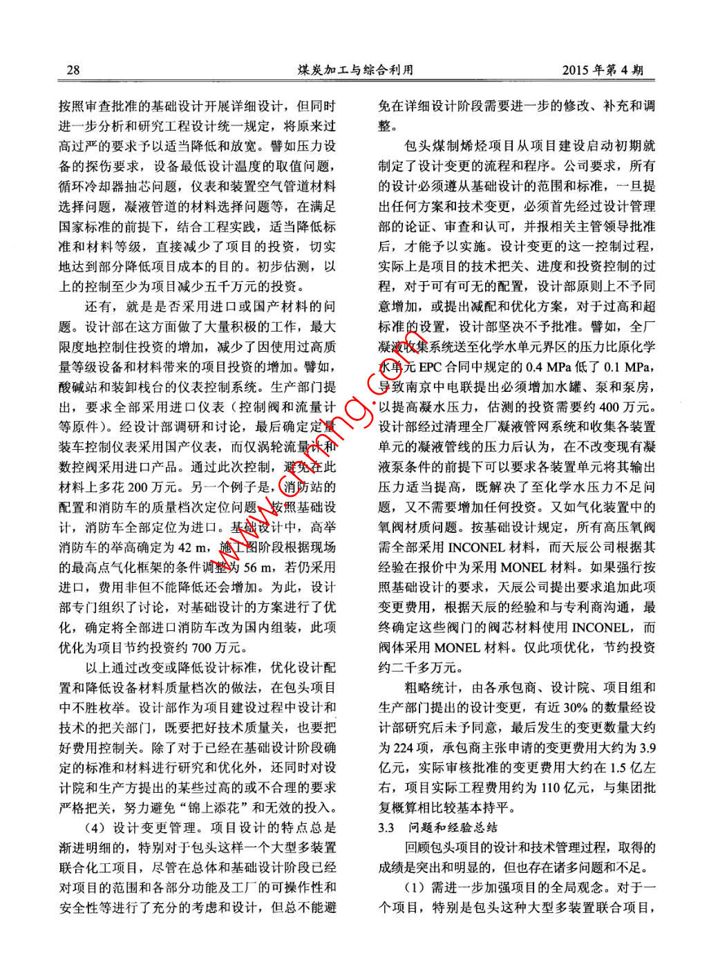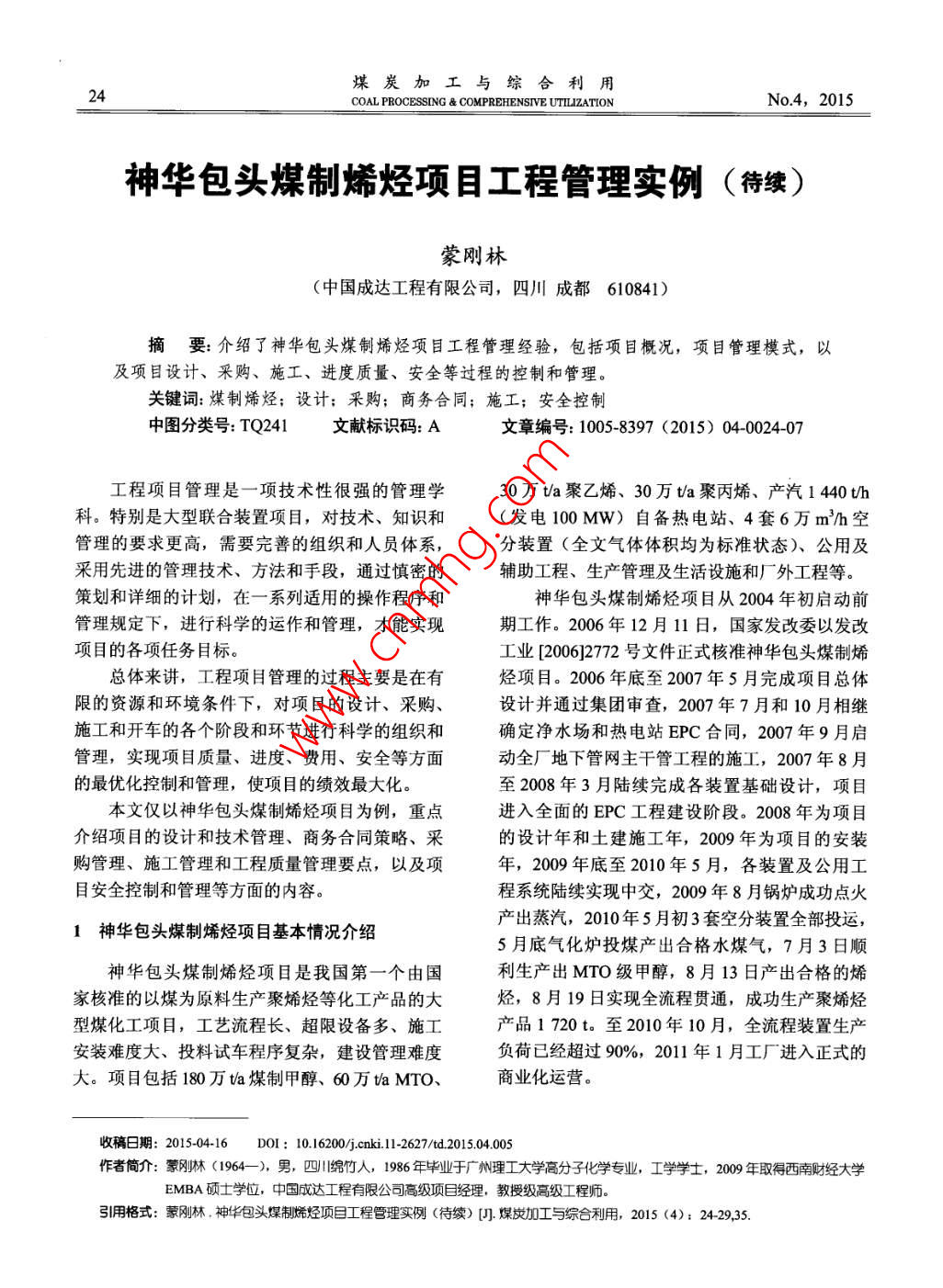 煤炭加工與綜合利用24COAL PROCESSING & COMPREHENSIVE UTILIZATIONNo.4,2015神華包頭煤制烯烴項目工程管理實例(待續(xù))蒙剛林(中國成達(dá)工程有限公司,四川成都610841)摘要: 介紹了神華包頭煤制烯烴項目工程管理經(jīng)驗,包括項目概況,項目管理模式,以及項目設(shè)計、采購、施工、進(jìn)度質(zhì)量、安全等過程的控制和管理。關(guān)鍵詞:煤制烯烴;設(shè)計;采購;商務(wù)合同;施工;安全控制中圖分類號: TQ241文獻(xiàn)標(biāo)識碼: A文章編號: 1005-8397 (2015) 04-0024-07工程項目管理是一項技術(shù)性很強的管理學(xué)30萬ta聚乙烯、30萬tla聚丙烯、產(chǎn)汽1440th科。特別是大型聯(lián)合裝置項目,對技術(shù)、知識和(發(fā)電100 MW)自備熱電站、4套6萬m/h空管理的要求更高,需要完善的組織和人員體系,分裝置(全文氣體體積均為標(biāo)準(zhǔn)狀態(tài))、公用及采用先進(jìn)的管理技術(shù)、方法和手段,通過慎密的輔助工程、生產(chǎn)管理及生活設(shè)施和廠外工程等。策劃和詳細(xì)的計劃,在一系列適用的操作程序和神華包頭煤制烯烴項目從2004年初啟動前管理規(guī)定下,進(jìn)行科學(xué)的運作和管理,才能實現(xiàn)期工作。2006年12月11 日,國家發(fā)改委以發(fā)改項目的各項任務(wù)目標(biāo)。工業(yè)[2006]2772號文件正式核準(zhǔn)神華包頭煤制烯總體來講,工程項目管理的過程主要是在有烴項目。2006年底至2007年5月完成項目總體限的資源和環(huán)境條件下,對項目的設(shè)計、采購、設(shè)計并通過集團(tuán)審查,2007 年7月和10月相繼施工和開車的各個階段和環(huán)節(jié)進(jìn)行科學(xué)的組織和確定凈水場和熱電站EPC合同,2007年9月啟管理,實現(xiàn)項目質(zhì)量、進(jìn)度、費用、安全等方面動全廠地下管網(wǎng)主干管工程的施工,2007年8月的最優(yōu)化控制和管理,使項目的績效最大化。至2008年3月陸續(xù)完成各裝置基礎(chǔ)設(shè)計,項目本文僅以神華包頭煤制烯烴項目為例,重點進(jìn)入全面的EPC工程建設(shè)階段。2008 年為項目.介紹項目的設(shè)計和技術(shù)管理、商務(wù)合同策略、采的設(shè)計年和土建施工年,2009 年為項目的安裝購管理、施工管理和工程質(zhì)量管理要點,以及項年,2009 年底至2010年5月,各裝置及公用工目安全控制和管理等方面的內(nèi)容。程系統(tǒng)陸續(xù)實現(xiàn)中交,2009 年8月鍋爐成功點火產(chǎn)出蒸汽,2010年5 月初3套空分裝置全部投運,1神華包頭煤制烯烴項 目基本情況介紹5月底氣化爐投煤產(chǎn)出合格水煤氣, 7月3日順神華包頭煤制烯烴項目是我國第一個由國利生產(chǎn)出MTO級甲醇,8月13日產(chǎn)出合格的烯家核準(zhǔn)的以煤為原料生產(chǎn)聚烯烴等化工產(chǎn)品的大烴,8月19日實現(xiàn)全流程貫通,成功生產(chǎn)聚烯烴型煤化工項目,工藝流程長、超限設(shè)備多、施工產(chǎn)品1 720t。至2010年10月,全流程裝置生產(chǎn)安裝難度大、投料試車程序復(fù)雜,建設(shè)管理難度負(fù)荷已經(jīng)超過90%,2011 年1月工廠進(jìn)入正式的大。項目包括180萬ta煤制甲醇、60萬taMTO、商業(yè)化運營。收稿日期: 2015-04-16D0I: 10.16200/.nki.11-2627/td.2015.04.005作者簡介:蒙剛林(1964- -), 男,四川綿竹人,1986 年畢業(yè)于廣州理工大學(xué)高分子化學(xué)專業(yè),工學(xué)學(xué)士,2009 年取得西南財經(jīng)大學(xué)EMBA碩士學(xué)位,中國成達(dá)工程有限公司高級項目經(jīng)理,教授級高級工程師。引用格式:蒙剛林.神華包頭煤制烯烴項目工程管理實例(待續(xù)) [].煤炭加工與綜合利用,2015 (4): 24-29.35.2015年第4期蒙剛林:神華包頭煤制烯烴項目工程管理實例(待續(xù))252項目管理模式管理,重大的技術(shù)方案的管理和決定,以及負(fù)責(zé)神華包頭煤化工有限公司成立之初,項目各項目提出的方案調(diào)整、變化的設(shè)計變更審查管管理組織以工廠技術(shù)和生產(chǎn)操作管理人員為主組理,負(fù)責(zé)全項目的報批報建工作,負(fù)責(zé)設(shè)計管理成,在項目前期的工藝技術(shù)選擇、考察、交流和的程序和規(guī)定的制定、發(fā)布和督促實施及根據(jù)需工藝包的技術(shù)談判和合同簽訂等方面,都能夠較要進(jìn)行更新等工作。設(shè)計部還適時地召開設(shè)計部好地進(jìn)行管理和推進(jìn)。但是,工程進(jìn)入建設(shè)階段全體人員會議,或針對某個項目組的設(shè)計管理問后,這些管理力量和管理經(jīng)驗就明顯不能適應(yīng)I題組織討論,或組織某項管理技能的培訓(xùn)等,從程管理的需要。于是,在項目基礎(chǔ)設(shè)計階段和項部門的高度指導(dǎo)項目設(shè)計經(jīng)理和專業(yè)工程師更好目EPC啟動前,公司對項目管理組織構(gòu)架進(jìn)行地做好設(shè)計和技術(shù)管理工作,從業(yè)務(wù).上提高設(shè)計了周密的策劃,成立包頭煤制烯烴項目部。組建部人員的管理水平。同時,設(shè)計部還充分依托北了以項目主任組為領(lǐng)導(dǎo)核心的神華包頭煤制烯烴京工程公司工程技術(shù)部,在行政上接受工程技術(shù)項目部,下設(shè)包括商務(wù)、設(shè)計、采購、施工、質(zhì)部的領(lǐng)導(dǎo),在技術(shù)和人員上得到工程技術(shù)部的大量、安全、綜合辦公室和項目管理等在內(nèi)的各項力支持。另外,項目的設(shè)計管理還充分利用了本項目目職能部門,