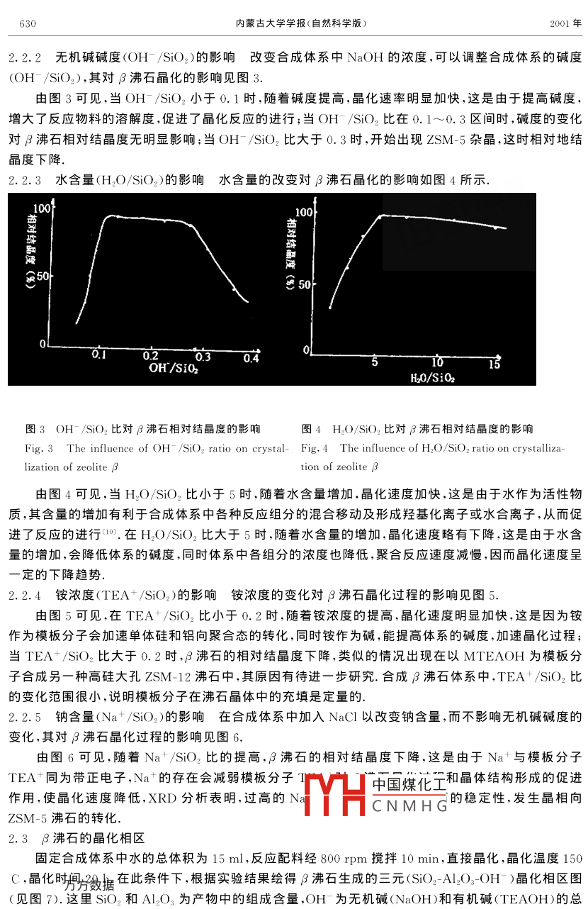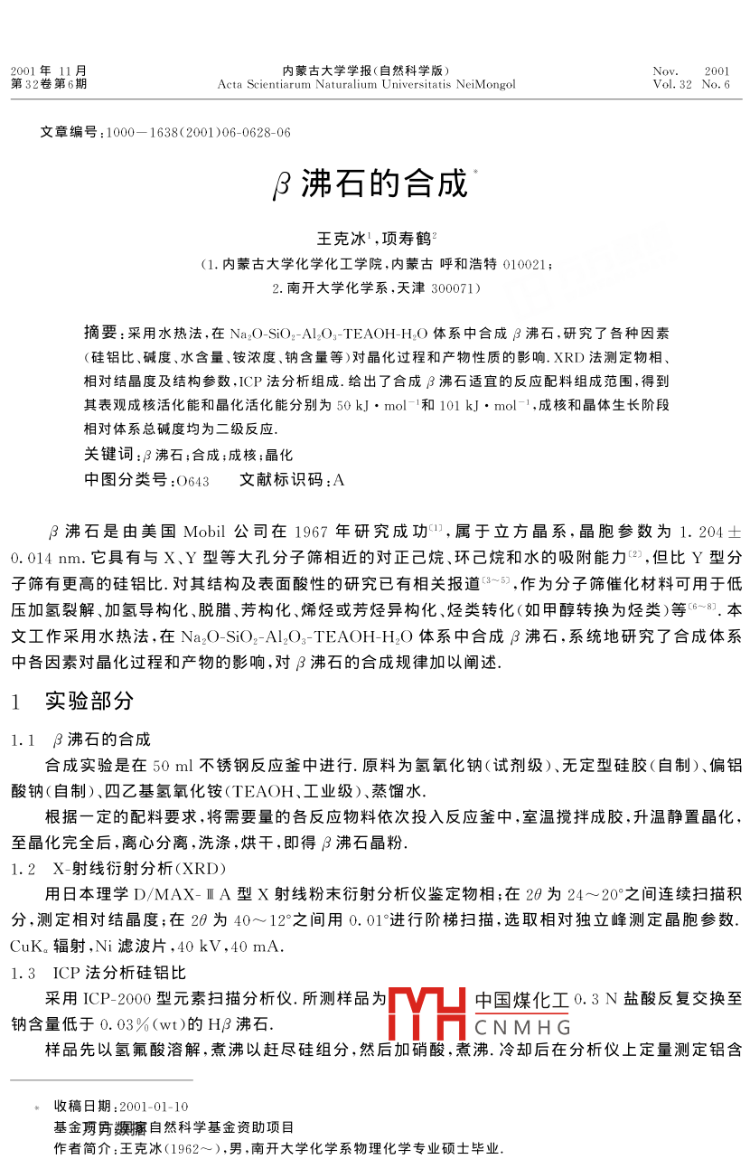 2001年11月內(nèi)蒙古大學(xué)學(xué)報(自然科學(xué)版)Noy2001第32卷第6期Acta Scientiarum Naturalium U niversitatis NeiMongolVol.32 No. 6文章編號:1000- 1638(2001 )06- 0628 -06β沸石的合成王克冰1 ,項壽鶴2(1.內(nèi)蒙古大學(xué)化學(xué)化工學(xué)院,內(nèi)蒙古呼和浩特010021;2.南開大學(xué)化學(xué)系,天津300071)摘要:采用水熱法,在Na2O-SiO2-Al2O-TEAOH-H2O體系中合成β沸石,研究了各種因素(硅鋁比、堿度、水含量.銨濃度、鈉含量等)對晶化過程和產(chǎn)物性質(zhì)的影響.XRD法測定物相、相對結(jié)晶度及結(jié)構(gòu)參數(shù),ICP法分析組成.給出了合成β沸石適宜的反應(yīng)配料組成范圍,得到其表觀成核活化能和晶化活化能分別為50kJ●mol-'和101kJ●mol-',成核和晶體生長階段相對體系總堿度均為二級反應(yīng).關(guān)鍵詞:p沸石;合成;成核;晶化中圖分類號:0643文獻(xiàn)標(biāo)識碼:Aβ沸石是由美國Mobil 公司在1967年研究成功”),屬于立方晶系,晶胞參數(shù)為1. 204士0.014 nm.它具有與X、Y型等大孔分子篩相近的對正己烷、環(huán)己烷和水的吸附能力22 ,但比Y型分子篩有更高的硅鋁比.對其結(jié)構(gòu)及表面酸性的研究已有相關(guān)報道^3~5),作為分子篩催化材料可用于低壓加氫裂解、加氫導(dǎo)構(gòu)化、脫臘、芳構(gòu)化、烯烴或芳烴異構(gòu)化、烴類轉(zhuǎn)化(如甲醇轉(zhuǎn)換為烴類)等6~8].本文工作采用水熱法,在Na2O- SiO2-Al2O3-TEAOH-H2O體系中合成β沸石,系統(tǒng)地研究了合成體系中各因素對晶化過程和產(chǎn)物的影響,對β沸石的合成規(guī)律加以闡述.1實驗部分1.1β沸石的合成合成實驗是在50ml不銹鋼反應(yīng)釜中進(jìn)行.原料為氫氧化鈉(試劑級)、無定型硅膠(自制)、偏鋁酸鈉(自制)、四乙基氫氧化銨(TEAOH、I業(yè)級)、蒸餾水.根據(jù)一定的配料要求,將需要量的各反應(yīng)物料依次投入反應(yīng)釜中,室溫攪拌成膠,升溫靜置晶化,至晶化完全后,離心分離,洗滌,烘干,即得β沸石晶粉.1.2X-射線衍射分析(XRD)用日本理學(xué)D/MAX- IA型X射線粉末衍射分析儀鑒定物相;在20為24~20°之間連續(xù)掃描積分,測定相對結(jié)晶度;在20為40~12°之間用0.01進(jìn)行階梯掃描,選取相對獨立峰測定晶胞參數(shù).CuK。輻射,Ni濾波片,40 kV ,40 mA.1.3 ICP法分析硅鋁比采用ICP- 2000型元素掃描分析儀.所測樣品為中國煤化工0.3N鹽酸反復(fù)交換至鈉含量低于0. 03%(wt)的Hβ沸石.MHCNM HG樣品先以氫氟酸溶解,煮沸以趕盡硅組分,然后加硝酸,煮沸.冷卻后在分析儀上定量測定鋁含收稿日期:2001-01-10基金頂勇娛樁自然科學(xué)基金資助項目作者簡介:王克冰(1962~),男,南開大學(xué)化學(xué)系物理化學(xué)專業(yè)碩士畢業(yè).第6期王克冰,項壽鶴β 沸石的合成629量,減量法求得硅含量,進(jìn)而求得硅鋁比(SiO2/Al2O3).2結(jié)果與討論2.1 β 沸石的物相取晶化樣品作XRD分析,其XRD譜圖如圖1所示,根據(jù)文獻(xiàn)[1]數(shù)據(jù)可確定為β沸石.(圖1樣品合成配料摩爾比為:TEA+ /SiO2=0. 28,OH- /SiO2 =0.24,SiO2/Al2O3= 100,H2O/SiO2=14,晶化溫度為150 C ,晶化時間為14.5 h).2.2β沸石合成過程中的影響因素2.2.1 投料硅鋁比(SiO2/Al2O3)的影響 取投料硅鋁比分別為60、100和250,晶化溫度均為150C,其相應(yīng)的晶化動力學(xué)曲線如圖2所示.1002色502. 1003. 60101520T8040晶化時間(h)20/*圖2不同投料SiO2/Al2O,比β沸石的晶化動力學(xué)曲線圖1β沸石的XRD圖Fig.2 The curves of crystallization kinetics of zeotite βFig. 1 XRD pattern of zeolite βwith various SiO2/Al2O3 ratios in the gel由圖2可見,隨著投料硅鋁比的提高,誘導(dǎo)期和晶化期都縮短,硅鋁比主要影響誘導(dǎo)期,如投料硅鋁比分別為60和250時,它們的誘導(dǎo)期分別為12.5h和4.0h,晶化期分別為5.5h和2.8 h,高硅鋁比更有利于成核.不同投料硅鋁比與相應(yīng)產(chǎn)物的性質(zhì)列于表1.表1投料硅鋁比對產(chǎn)物硅鋁比和晶胞參數(shù)的影響Table 1 Influence of SiO2/ Al2O3 ratios on cell parameter投料SiO2/Al.O3比25602505004500產(chǎn)物物相β無定形產(chǎn)物SiO2/Al.O3比120165203248150晶胞參數(shù)ao(nm)1.2111.1981.1971.1951.1751.172.由表1可得,投料硅鋁比在25~4500范圍內(nèi),均可合成出β沸石.投料硅鋁比低時(25~100),物硅鋁比高于投料硅鋁比;投料硅鋁比高時(250~4500),產(chǎn)物硅鋁比低于投料硅鋁比,說明低硅鋁比投料時,硅的利用率高,而在高硅鋁比投料時,硅的禾中國煤化工∞,即合成體系中無鋁時,得不到β沸石,即純硅β沸石不能形成,這一點YHCNMHG純硅ZSM-5沸石有明顯不同C9);隨著產(chǎn)物硅鋁比的提高,晶胞參數(shù)ao逐漸減小,這是因為Si-O鍵和Al-O鍵的鍵長不同(Ys:o=0.161 nm,YA.o=0. 175 nm),硅鋁比提高,晶胞中鋁的相對量減少,即Al-O鍵減少,相應(yīng)的Si-O鍵增加,導(dǎo)致晶胞發(fā)生收縮現(xiàn)象.在以天考竅愈成體系中各種因素對β沸石晶化過程的影響時,如無特別說明,均采用投料硅鋁比為100, 晶化溫度150 C,晶化時間14.5 h.630內(nèi)蒙古大學(xué)學(xué)報(自然科學(xué)版)2001年2.2.2無機(jī)堿堿度(OH-/SiO2)的影響改變合成體系中NaOH的濃度,可以調(diào)整合成體系的堿度(OH- /SiO2),其對 β沸石晶化的影響見圖3.由圖3可見,當(dāng)OH- /SiO2小于0.1時,隨著堿度提高,晶化速率明顯加快,這是由于提高堿度,增大了反應(yīng)物料的溶解度,促進(jìn)了晶化反應(yīng)的進(jìn)行;當(dāng)OHT/SiO2比在0.1~0.3區(qū)間時,堿度的變化對β沸石相對結(jié)晶度無明顯影響;當