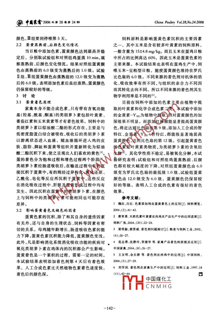 網(wǎng)中國家禽2006年第28巷第24期China Poultry VoL.28,No.24.2006不同色素添加劑對蛋黃著色效果的影響*冒國祥,李亮,蘇衍菁,張 雪,龔道清**(揚州大學(xué)動物科學(xué)與技術(shù)學(xué)院,江蘇揚州225009)摘要:以150只35周齡海蘭褐殼蛋雞 為試驗素材,隨機分為5組, V組為對照組,其余4組在基礎(chǔ)日糧的基礎(chǔ)上分別添加0.15%金黃素- -Y( I )、0.02%智特紅( II )、0.15%金黃素-Ya)+0.02%智特紅(皿)和0.3%紅辣椒(V)。研究了不同色素添加劑對蛋黃著色與褪色情況、蒸熟后蛋黃顏色變化情況。試驗結(jié)果:3、4、5組蛋黃顏色達羅氏比色扇12.0.13.2、8.5級,均極顯著高于對照組的6.0級;雞蛋蒸熟后,對照組和試驗組蛋黃顏色分別下降5和6個等級,為羅氏比色扇 的1.0和6.0級。 研究表明人工合成色素添加 劑有較好的著色效果。關(guān)鍵詞:色素;蛋黃;著色Effect on the Different Pigment Additions to the Yolk Pigmentattion*Mao Guoxiang,Li Liang , Su Yanjing ,Zhang Xue ,Gong Daoqing "(College of Animal Science and Technology , Yangzhou University , Yangzhou Jiangsu 225009)Abstract:150 35-week Hyline eg-brown layers were used as subject -matter and divided into five groups ranomly.V wascontol group and other four groups were respectively supplemented 0.15% Jinhuangsu-Y a( I ).0.02% Zhitehong ( II ).0.15%Jinhuangu-Yx+0.02% hitehong( m )and 0.39% chili(IV ). The dfferent pigment adinios were sudied on the stuaiono of pigmentaionand depigmentation ,changes of the yolk color after being cooked. The result showeo that:the yolk color of 3,4,5 grouprespectively atain 12.0、13.2.8.5 level of yolk color fan. All of them were remarkably higher than the control group that was6.0 level. The yolk color of control group and experimental group respetively descended five and six levels that were 1.0 and 6.0level afer brasing That showed artificial synthesized pigment additions had better pigmentation effect.Key words:pigment;yolk ;pigmentation隨著人們生活水平的提高,在對禽蛋產(chǎn)品消料中攝人2,其外觀顏色取決于所采食的飼料中費時,對其產(chǎn)品質(zhì)量也提出了新的更高的要求。長的色素含量。而飼料產(chǎn)品中色素的含量受到原料期以來人們普遍喜好鮮艷的深色蛋黃,認為蛋黃來源、貯存時間等因素的影響,其著色效果不穩(wěn)的顏色是雞蛋品質(zhì)的--個非常重要的特征",因定,因此開發(fā)此類產(chǎn)品具有生產(chǎn)實際意義。本研究此生產(chǎn)出來蛋黃顏色較深的禽蛋產(chǎn)品更容易被消通過比較不同色素添加劑對蛋黃的著色效果,為費者接受。由于家禽自身無法合成色素,必須從飼蛋雞飼料生產(chǎn)中色套添加劑的使用提供了依據(jù)。中國煤化工收稿日期:2005- -12-141.1YHCNMHG修回日期:2006-08-20本試驗采用單因子隨機試驗設(shè)計。選擇體重*揚州大學(xué)2005年大學(xué)生科技創(chuàng)新基金資助* *通訊作者接近、健康的35周齡海蘭褐殼蛋雞150只,隨機分-140-網(wǎng)中國家禽2006年第28巷第24期China Poultry Vol.28,No.24.2006為5組,每組設(shè)3個重復(fù),每個重復(fù)10只。試驗雞分組情況見表1。試驗基礎(chǔ)日糧見表2。表1試驗分組情況組別N’飼料基礎(chǔ)日糧基礎(chǔ)日糧+0. 15%金黃素-Y(20)基礎(chǔ)組成+o. 15%金黃素-Y(2)+0.02%智特紅+0. 3%紅辣椒注:金黃素一Y(2)和智特紅由廣州市智特奇飼料有限公司提供;其中金黃素-Y20)從植物中提取,智特紅為人工合成色素:紅辣椒市售,粉碎后添加。期開始,各處理組每2天打開4個雞蛋測定蛋黃表2基礎(chǔ)日糧配比及其營養(yǎng)水平顏色。當?shù)包S顏色穩(wěn)定時,各試驗組日糧中停喂日糧配比營養(yǎng)水平色素添加劑,測定蛋黃褪色情況。并取蛋黃顏色玉米(%)62代謝能(MJ/kg)11.51麩皮(%)3蛋白質(zhì)(%)16.00穩(wěn)定時試驗組和對照組的雞蛋,在沸水鍋里蒸10豆粕(%)22賴氨酸(%)0.79min,測定蒸熟后蛋黃的顏色。貝殼粉(%)8蛋氨酸+胱氨酸(%) 0. 60預(yù)混料(%)鈣(%)4.001.4 數(shù)據(jù)分析有效磷(%)0.44.數(shù)據(jù)采用Excel建庫,SPSS11.5軟件One-1.2飼養(yǎng)管理way ANOVA進行方差分析,LSD法進行組間差試驗雞籠養(yǎng),飼喂粉狀飼料,自由采食、飲異顯著性檢驗。水,自然光照加人工補光至16h。各組飼養(yǎng)管理2結(jié)果與分析條件一致。2.1蛋黃顏 色隨飼喂和停喂天數(shù)的變化情況.3 測定指標及方法.蛋黃顏色隨日糧中色素添加劑添加和停喂用羅氏比色扇測定雞蛋蛋黃的顏色。從正試天數(shù)的變化情況分別見表3和圖1。蛋黃顏色隨飼喂和停喂天數(shù)的變化情況N飼喂前6.0士0.006. 0士0.00*6.0士0.00*6.0士0. 00飼喂第2天6. 0士0.006. 5士0.00-飼喂第4天6.8士1.06*11. 7+0.35°12. 0士0.71°6. 5士0. 71*6. 0士0.00°飼喂第6天7.5士0.71"12.0+1.41*13. 2士0.35°6. 5士0.71"飼喂第8天6. 5士0.71*12. 0士0.008. 0士2.83°飼喂第10天11. 5士0.71*11. 5士0, 71*8.5士0.67.停喂第2天11.5士0.71<12. 0士0.00f7. 0士0.74*6. 0土0.00*停喂第3天6.0士0.00"11. 0士0.00r11. 0士0.00f停喂第4天6.0士0。008. 5士0.71°停喂第5天6. 0士0.00m6. 0士0.00P注:同行數(shù)字,肩標字母相同者表示差異不顯著(P>0.05),字母相鄰者表示差異顯著(P<0.05),字母相間者表示差異極顯著(P<0.01)。由表3和圖1可知:對照組蛋黃顏色在整個12試驗期內(nèi)都為羅氏比色扇的6級;添加色素后兩天各組蛋黃顏色都沒有顯著變化;飼喂色素第4天開始,I、I、I、IV組蛋黃顏色都有不同程度的提高,其中I、組與對照組差異極顯著,但兩者之間差異不顯著;飼喂色素第6天,I、I、皿組,中國煤化工在飼喂第10天時8n (吸)2犬4大 6天8天 10天(停1