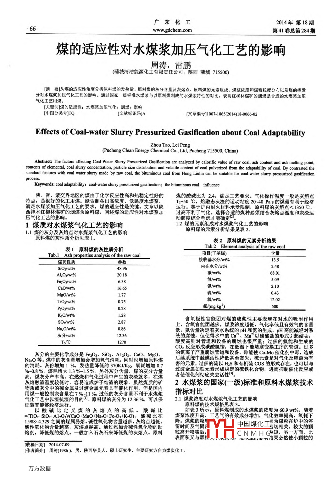 廣東化工2014年第18期www.gdchem.com第41卷總第284期煤的適應(yīng)性對水煤漿加壓氣化工藝的影響周濤,雷鵬(蒲城清潔能源化工有限責(zé)任公司,陜西蒲城715500[摘要]從煤的適應(yīng)性角度分析原料煤的發(fā)熱量、原料煤的灰分含量及灰熔點(diǎn)、原料煤的元素組成、煤漿濃度和煤粉粒度分布以及煤的揮發(fā)分對水煤漿加壓氣化工藝的影響。通過國家一級標(biāo)準(zhǔn)水煤漿與以原料煤制成的水煤漿特性的對比,表明紅柳林煤礦的煙煤是合適的水煤漿加壓氣化工藝用煤。[關(guān)鍵詞]煤的適應(yīng)性;水煤漿加壓氣化:煙煤;影響[中圖分類號TQ[文獻(xiàn)標(biāo)識碼]A[文章編號]1007-1865(2014)18-006602Effects of Coal-water Slurry Pressurized Gasification about Coal AdaptabilityZhou Tao, Lei PengPucheng Clean Energy Chemical Co, Ltd, Pucheng 715500, China)Abstract: The factors affecting Coal-Water Slurry Pressurized Gasification are analyzed by calorific value of raw coal, ash content and ash melting point,contents of elemental, coal slurry concentration, particle size distribution and volatile content of coal pulverized from the adaptability of coal. By contrasted thestandard features with coal water slurry made by raw coal, the bituminous coal from Hong Liulin can be suitable for coal-water slurry pressurized gasificationprocessKeywords: coal adaptability: coal-water shurry pressurized gasification; the bituminous coal: influence陜、晉、蒙交界地區(qū)的煤由于化學(xué)反應(yīng)性高和熱穩(wěn)定性好的煤的酸堿比為24,滿足工藝要求。氣化操作般是灰熔點(diǎn)特點(diǎn),是很好的化工用煤。能否制備出高濃度、低黏度水煤漿,T3+50℃,熔融態(tài)灰渣的運(yùn)動粘度2040Pas的煤最有利于經(jīng)濟(jì)滿足水煤漿加壓氣化工藝的要求,煤的適應(yīng)性是關(guān)鍵。文章以陜運(yùn)行。鑒于爐內(nèi)耐火材料承受限制,原料煤的灰熔點(diǎn)<1350℃,西神木紅柳林煤礦的煙煤為原料煤,闡述煤的適應(yīng)性對水煤漿加過高不利于氣化。選擇合適的煤種必須結(jié)合灰熔點(diǎn)溫度和灰渣運(yùn)壓氣化工藝的影響動黏度綜合考慮才能確定。1煤質(zhì)對水煤漿氣化工藝的影響1.2煤的元素組成對水煤漿氣化工藝的影響1.1煤的灰分及灰熔點(diǎn)對水煤漿氣化工藝的影響原料煤的元素分析結(jié)果見表2。原料煤的灰性質(zhì)分析見表1表2原料煤的元素分析結(jié)果表1原料煤的灰性質(zhì)分析Tab 2 Element analysis of the raw coalTab. I Ash properties analysis of the raw coal項(xiàng)目(干基煤)煤灰性質(zhì)接收基水分/wt%內(nèi)在水分/wt%AlOy/wt%.18碳/wt%6801Fe2O,/w氫/wt%CaO/wt%1665氮/wt%2.10Mgo/wt%硫/wt%043TiO/wt%氧/wtPrOs/wt%0.28氯/mgkg)K,O/wt%SOy/wt%2.87含氧極性官能團(tuán)對煤的成漿性主要表現(xiàn)在對水的吸附作用上,含氧官能團(tuán)越多,煤漿濃度越低,氣化率低且有效氣的含量NayO/wt%0.86低。氮含量決定著灰水系統(tǒng)的pH和氨的生成。pH高能減輕對系統(tǒng)的腐蝕,但使得水中的Ca2、Mg2以碳酸鹽的形式引起結(jié)垢Ty℃酸度高則對管道和設(shè)備的腐蝕也很嚴(yán)重;過多的氨能和生成的CO2反應(yīng)形成碳酸氫銨,在低溫下能堵塞變換工序的管道。過多灰分的主要化學(xué)成分是Fe2O3、SiO2、A12O3、CaO、MgO的氯離子嚴(yán)重腐蝕管道和設(shè)備。砷能使 Co-Mo催化劑中毒,造成NaO等。煤中的灰含量增加會增加氧氣消耗,同時也增加原料煤后續(xù)系統(tǒng)中觸媒活性降低甚至喪失。硫元素是對氣化反應(yīng)最為有害的元素,過多的硫以H2S和有機(jī)硫COS的形式存在,也可以與%08%,煤耗增大13%15%另外灰分含量,煤的灰分含量過渡金屬如鐵元素形成穩(wěn)定的硫鐵化合物,進(jìn)而抑制催化反應(yīng)或高,煤灰分產(chǎn)率高,在燃燒和氣化過程中產(chǎn)生的灰渣就多,在煤灰熔融渣溫度較低時,容易造成爐子結(jié)渣的現(xiàn)象。雖然煤質(zhì)的礦2水煤漿的國家(一級)標(biāo)準(zhǔn)和原料水煤漿技術(shù)物質(zhì)或灰分中的堿金屬及過渡金屬元素具有催化作用,但是國內(nèi)用煤一般控制灰含量在7%-11%,過低的灰分含量不利于水煤漿指標(biāo)對比氣化工藝中以渣抗渣的目的。原料煤的灰分為1236%,可以保21煤漿濃度對水煤漿氣化工藝的影響證裝置能夠經(jīng)濟(jì)運(yùn)行原料煤的技術(shù)規(guī)格見表3以酸堿比定義煤的灰熔點(diǎn)的高低。酸堿比如表3所示,原料煤制成的水煤漿的濃度為609w%。隨著=(TO2+iO2+A12O3(CaO+MgO+Na2O+Fe2O3+K2O),酸堿比在煤漿濃度升高,工藝氣的有效成分增加,氣化效率提高,氧耗下1.988-4.329之間的煤屬易熔。堿性氧化物含量越多,灰熔點(diǎn)越低降。煤漿的?!顾嵝匝趸锖吭礁?灰熔點(diǎn)越高。通過添加含堿性氧化物的助中國煤化工為媒粒在爐中的停密切相關(guān)。較大的顆熔劑,降低煤的熔點(diǎn)。一般加入石灰石來降低煤的灰熔點(diǎn)。原料料粒離開噴嘴后,表面積又與顆料CNMH或拉短,另一方面,比,以墨叮廓啊結(jié)果必然使小顆粒的[收稿日期]201407-09[作者簡介]周濤(1986),男,陜西華縣人,碩土研究生,主要研究方向?yàn)槊禾炕ぁ?014年第18期廣東化工第41卷總第284期www.gdchem.com轉(zhuǎn)化率高于大顆粒。煤漿濃度增加1%,工藝氣體含量增加05%以上向。表3水煤漿的國家(一級標(biāo)準(zhǔn)和原料水煤漿技術(shù)指標(biāo)對比Tab3 Standards of coal water slurry(level D)and indicators technical of coal water shut the raw coal國標(biāo)要求原料水煤漿的技
