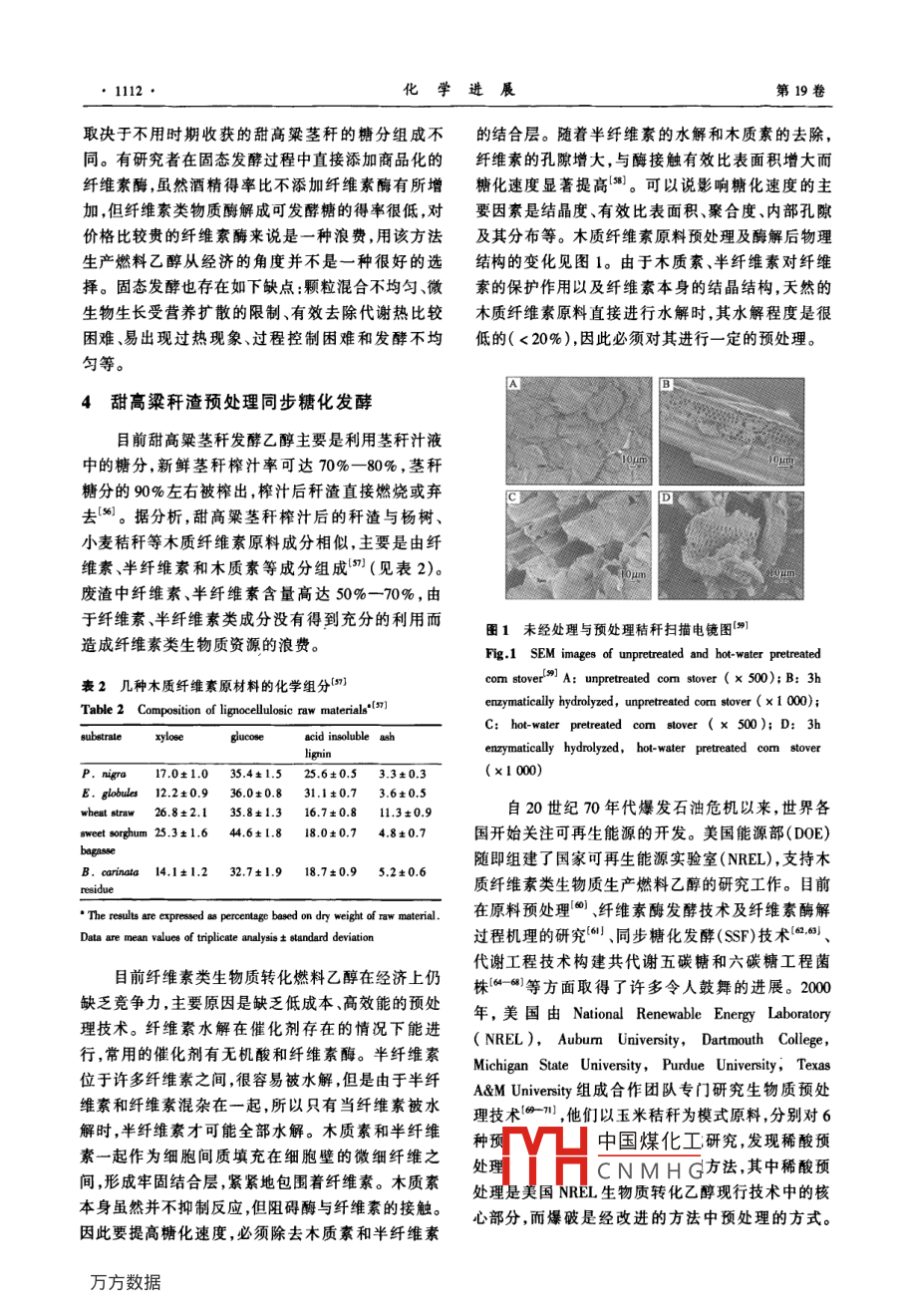 第19卷第7/8期化學(xué)進(jìn)展Vol 19 No. 7/82007年8月PROGRESS IN CHEMISTRYAug.,2007甜高粱莖稈生產(chǎn)燃料乙醇劉莉?qū)O君社康利平劉萍(中國農(nóng)業(yè)大學(xué)食品科學(xué)與營養(yǎng)工程學(xué)院北京100083)摘要本文對甜高梁莖稈原料的貯藏、汁液液態(tài)發(fā)酵、莖稈直接粉碎固態(tài)發(fā)酵以及榨汁后剩余的稈渣預(yù)處理同步糖化發(fā)酵4個方面的研究情況進(jìn)行了綜述,重點(diǎn)論述了甜高粱莖稈生產(chǎn)燃料乙醇的瓶頸問題即原料的貯藏和稈渣木質(zhì)纖維素預(yù)處理技術(shù)。提出了一種更經(jīng)濟(jì)合理的甜高粱莖稈生產(chǎn)燃料乙醇工藝流程。關(guān)鍵詞甜髙梁莖稈乙醇液態(tài)發(fā)酵固態(tài)發(fā)酵預(yù)處理中圖分類號:TK6;S216.2文獻(xiàn)標(biāo)識碼:A文章編號:1005-81X(2007)0/8-110907The Fuel Ethanol Production from Sweet Sorghum StalkLiu Li Sun Junshe Kang Liping Liu PingCollege of Food Science and Nutritional Engineering, China Agricultural University, Beijing 100083, China)Abstract The progress of fuel ethanol production from sweet sorghum stalk is introduced in this paper, includingmethods of preserving raw materials, liquid-state fermentation of juice, solid-stated fermentation of smashed stalkpretreatment of stalk bagasse and simultaneous saccharification and fermentation (SSF ). The key technologies ofconverting sweet sorghum stalks into fuel ethanol are discussed in detail, which are raw materials preservation andpretreatment of stalk bagasse. A more economical and feasible process flow, found promising for further investigation issuggestKey words sweet sorghum; ethanol; liquid-state fermentation; solid-state fermentation; pretreatments隨著經(jīng)濟(jì)和社會的高速發(fā)展,能源的需求量越燃料乙醇勢必會出現(xiàn)“車與人爭糧”“車與糧爭地”的來越大能源短缺和溫室氣體效應(yīng)已經(jīng)成為各國問題。從我國的國情出發(fā),大量使用糧食為原料生面臨的重大問題。在國際國內(nèi)石油價格不斷上漲的產(chǎn)燃料乙醇也必將帶來嚴(yán)重的現(xiàn)實(shí)問題,而利用生情況下,世界各國都在積極探素利用可再生能物質(zhì)為原料生產(chǎn)燃料乙醇是符合可持續(xù)發(fā)展的最理源24。發(fā)展可再生的石油替代燃料勢在必行。燃想的選擇。目前研究最多的是以玉米秸稈和甘蔗料乙醇是來源于可再生生物質(zhì)的重要能源之一,從為原料,國內(nèi)外正在積極研究開發(fā)利用其他生物質(zhì)國家安全和可持續(xù)發(fā)展的角度出發(fā),發(fā)展燃料乙醇生產(chǎn)燃料乙醇的技術(shù),包括木薯、小麥秸稈、甜高是一項重要的措施6。粱莖稈、速生楊、柳枝稷、生活垃圾等。我國燃料在美國和巴西,利用糖和淀粉生產(chǎn)燃料乙醇已乙醇生產(chǎn)也應(yīng)建立多元結(jié)構(gòu)的原料體系。經(jīng)達(dá)到工業(yè)化規(guī)模。“十五”期間,國家批準(zhǔn)河南天甜高粱屬于C4作物,光合效率高,抗旱、耐澇冠、黑龍江華潤、吉林燃料乙醇和安徽豐原4家企業(yè)耐鹽堿,在一般耕地、荒地、山地、鹽堿地均可種植。加工燃料乙醇,年產(chǎn)能力達(dá)102萬噸。但這些燃料在不適宜種植其他糧食作物和糖料作物的地區(qū)種植乙醇主要是由糧食(包括陳化糧)轉(zhuǎn)化而來生產(chǎn)成甜高粱既不與糧爭地.又可糧糖雙收,因而引起了本高需要國家補(bǔ)貼企業(yè)才能運(yùn)轉(zhuǎn)。使用糧食生產(chǎn)許多中國煤化工和大力推廣田。CNMHG收稿:2006年5月國家自然科學(xué)基金項目(N20436020)資助通訊聯(lián)系人 e-mail: punish61@163,。m1110化學(xué)進(jìn)展第19卷甜高粱同普通高粱一樣,每畝地也能產(chǎn)出200定適合甜高粱莖稈發(fā)酵酒精的方式(21500kg的糧食籽粒,但甜高粱的精華在于它畝產(chǎn)1甜高粱莖稈貯藏400-500kg富含18%-24%糖分的莖稈2。目前甜高粱莖稈發(fā)酵生產(chǎn)乙醇主要是利用莖稈中的甜高粱的收割期約半個月左右,由于莖稈富含糖分,其糖分組成主要是蔗糖,最高達(dá)79%,其次是糖分,含水量高,收獲后極易受微生物感染,容易發(fā)葡萄糖和果糖,這兩種單糖含量差別不大。不同生霉?fàn)€和干化2,影響酒精的后續(xù)發(fā)酵。粉碎的莖品種成分含量有所差別。甜高粱莖稈中各成分含量稈貯藏4-6天,糖分損失高達(dá)50%。壓榨后的汁液如表1所示。也不能長時間貯存,汁液如果貯藏不好,極易酸敗,也會影響到后續(xù)的酒精發(fā)酵。在甜高粱莖稈生產(chǎn)燃表1甜高粱莖稈化學(xué)組分料乙醇過程中,莖稈的貯藏問題并沒有得到很好的Table 1 Chemical composition of sweet sorghum, pith and解決,成為制約該技術(shù)發(fā)展的瓶頸。為了延長加工bark is周期,采取了各種措施如冷凍、莖稈去葉切成短段冷whole sorghum藏)、用塑料薄膜覆蓋并充以二氧化硫貯藏叫、窖cellulose12hemicellulose藏、氣調(diào)、干燥等貯藏方法2,然而對于數(shù)量巨大的甜高粱莖稈來說,這些方法不僅難以實(shí)施,更主要的55.0674是大大增加了成本和能耗,因而是不可取的。幽030205最初關(guān)于貯藏的研究主要集中在考察自然貯藏The results are expressed as pereentage(%)of dry weight. Mean t SD條件下出汁率和含糖量的變化情況。收割后扎捆置tween duplicates were less than 10%于田間的甜高粱莖稈,自然貯藏一段時間出汁率會逐日降低,隨著莖稈失水,汁液所含糖分濃度明顯增巴西政府自1975年開始用甜高粱生產(chǎn)酒精,并加)。 Eland?)