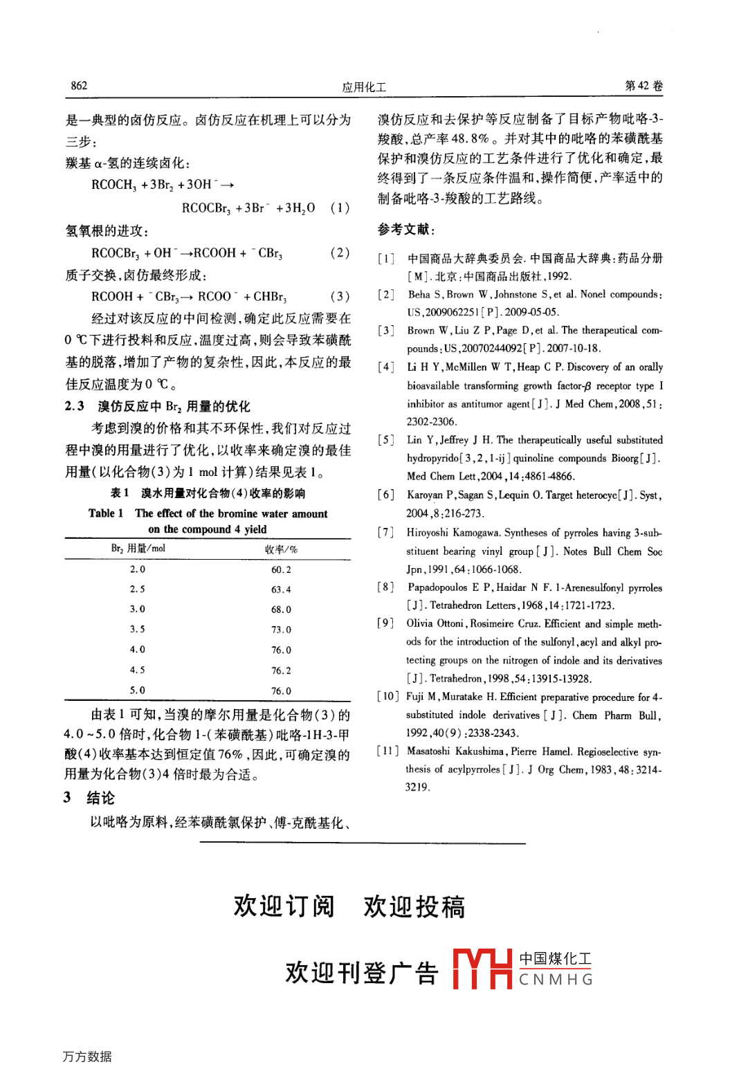 第42卷第5期應(yīng)用化工Vol. 42 No. 52013年5月Applied Chemical IndustryMay 2013吡咯-3-羧酸的合成劉志達(dá),滕大為(青島科技大學(xué)化工學(xué)院,山東青島266042)摘要:以吡略為原料 ,經(jīng)苯磺酰氯保護(hù)、傅-克?;?、溴仿反應(yīng)和去保護(hù)等反應(yīng)制備了吡咯3-羧酸,總產(chǎn)率48. 8%。并對溴仿反應(yīng)的工藝條件進(jìn)行了優(yōu)化,最佳溴仿反應(yīng)條件是:Br,:底物=4:1(摩爾比),反應(yīng)溫度0 C,反應(yīng)時(shí)間2 h,收率可達(dá)82%。關(guān)鍵詞:吡咯3-甲酸;溴仿反應(yīng);合成中圖分類號: TQ 062.1文獻(xiàn)標(biāo)識碼:A文章編號:1671 -3206(2013)05 -0860 -03Synthesis of pyrrole-3-carboxylic acidLIU Zhi-da , TENG Da-wei(College of Chemical Engineering, Qingdao University of Science and Technology ,Qingdao 266042 ,China)Abstract : Pyrrole-3-carboxylic acid was synthesized by the reaction of benzenesulfonyl chloride protec-tion , Friedel-Crafts acylation , the bromoform reaction and deprotection from the starting material pyrrolewith a total yield of 48.8% . And the optimized conditions of bromoform reaction were obtained as follows:Br2: substrate = 4:1 ( molar ratio) ,reaction temperature 0 C, reaction time2 h, the yield can be up toKey words :pyrrole-3-carboxylic acid; bromoform reaction; synthesis吡咯類化合物是重要的化工原料”,由于該類的吡咯為原料,與苯磺酰氯反應(yīng)得1-( 苯磺?;?-化合物的親電取代反應(yīng)基本都發(fā)生在2位,所以有1H-吡咯(2)[891 ,(2)經(jīng)?;磻?yīng)得1-(1-(苯磺酰關(guān)其研究大都集中在2-取代吡咯。近年來,3-取代基)-IH-吡咯-3-基)乙酮(3)01),(3)經(jīng)溴仿反應(yīng)的吡咯類化合物日益受到重視而有很大發(fā)展,有關(guān)生成1-(苯磺酰基)吡咯-1H-3-甲酸(4),(4)脫苯吡咯3-羧酸的應(yīng)用也漸有報(bào)道,如3-吡咯羧酸(1) .磺?;?-吡咯甲酸(1)。并對其中的苯磺?;?捎糜诤铣?-乙烯基芐基-1H-吡咯-3.羧酸乙酯和護(hù)反應(yīng)和溴仿反應(yīng)的工藝條件進(jìn)行了反復(fù)驗(yàn)證和優(yōu)N-(4-乙烯基苯基)-1H-吡咯-3-甲酰胺等化合物及化,得到一條反應(yīng)條件溫和、后處理簡便、收率高的術(shù)生物,還可以用于合成鎮(zhèn)痛藥物,抗高血壓藥物和制備吡咯3.羧酸的方法。精神神經(jīng)藥物吡咯烷3羧酸甲酯(26i等。1實(shí)驗(yàn)部分3-取代吡咯的合成方法可以分為三類°":①在.1 試劑與儀器吡咯環(huán)2位上引人一個(gè)可離去的鈍化基團(tuán)(一般是吡咯、苯磺酰氯、液溴和乙酰氯均為分析純。乙?;? ,然后再在4-位引人基團(tuán);②酸誘導(dǎo)的2-取WRS2IB型數(shù)字熔點(diǎn)儀(溫度未校正);AV 500代吡咯的異構(gòu)化,得到的產(chǎn)物是2.取代和3-取代異型核磁共振儀(CDC],為溶劑,TMS為內(nèi)標(biāo))。構(gòu)體的混合物;③直接苯磺?;谋Wo(hù)后的傅克酰1.2合成方法基化。吡咯-3羧酸的合成路線如下:吡咯3-羧酸的合成報(bào)道很少,本文以廉價(jià)易得收稿日期:201303-11修改稿日期:2013-0401中國煤化工基金項(xiàng)目:山東省重點(diǎn)實(shí)驗(yàn)室開放基金資助項(xiàng)目(200903 )CNMH G,作者簡介:劉志達(dá)(1987 -) ,男,山東青島人,青島科技大學(xué)碩士研究生,師從際人力以役,八于情地兒I方面研究。電話:13853257137 ,E - mail:liuzhida841 17602@ 126. com通訊聯(lián)系人:滕大為,男,教授。E-mail:dtengw@ qust. edu. cn第5期劉志達(dá)等:吡咯-3-羧酸的合成861-0H)+)心 !_Br:+NaOHP、!(4)OHNaOH (1.2.1 1-(苯基磺?;?-1H-吡咯(2)的合成 將合并有機(jī)相,無水硫酸鈉干燥,得灰色固體(4)KOH顆粒加入到溶有吡咯50 g(0. 746 mol) 的53.53 g, 收率76.0% ,m.p. 146~148 C。500 mL乙醇溶液中,蒸出乙醇。加200 mL丙酮,冰'H NMR ( CDCl,-DMS0-d,8):6.1(1H,d,J=浴下慢慢滴加苯磺酰氯144. 95 g(0. 821 mol) ,滴加3.5 Hz) ,6.7(1H,d,J=1.5 Hz), 7.2(2H,d,J=完成后,常溫反應(yīng)20 min。加人400 x2 mL乙酸乙3 Hz) ,7.3(1H,s) ,7.6(1H,s) ,7.7~7.8(3H,m),酯進(jìn)行萃取,再用飽和食鹽水沖洗2遍,分液,有機(jī)12. 5(1H, Brs,D20交換后消失)。相加入無水硫酸鈉進(jìn)行干燥,過濾,蒸干,得淺棕色1.2.4 吡咯3-甲酸(1)的合成將(4)40 g固體(2)138. 86 g,收率90% ,m.p.88~91 C。(0.159mol)溶于200mL甲醇中,加16%的氫氧化'H NMR(500 MHz, CDCl,8):6. 1(2H,t,J=鈉溶液150 mL,加熱至回流,反應(yīng)4 h。用旋轉(zhuǎn)蒸發(fā)2.5 Hz) ,6. 6(2H,d,J=3.2 Hz),7.3 ~7.93(5H,儀蒸出甲醇,加入6%的稀鹽酸調(diào)節(jié)pH=1 ,析出大m)。量固體。過濾,干燥后在石油醚/乙酸乙酯中結(jié)晶,1.2.2 1-(1-(苯磺?;?-1H-吡咯~3-基)乙酮(3)得灰色固體(1)12.92 g,收率82%。的合成將AlCl3 96.74 g(0.724 6 mol)和1,2-二氯'H NMR (CDCI-DMSO-d. ,8):6.4(1H,S) ,6.8 .乙烷500mL加至2L的三口瓶中,在常溫下緩緩加(1H,d,J=1.5),7. 35(1H,d,J=2.5),11.3(1H,人乙酰氯37. 93 g(0. 4831 mol)加入到反應(yīng)液中,s),11.7(1H,Brs,D20交換后消失)。攪拌30 min,常溫下緩緩滴加溶有(2)50 g 2 結(jié)果與討論(0.241 5 mol)的1,2-二氯乙烷溶液,滴加完畢后,2.1保護(hù)基及 其反應(yīng)方法的選擇反應(yīng)3 h。將反應(yīng)液倒人到冰水混合物中,攪拌吡咯結(jié)構(gòu)中氨基的保護(hù)基有很多,如Boc Cbz、15 min。加人200 x2 mL二氯乙烷進(jìn)行萃取,分液,三苯甲基、三異丙基硅基和苯磺酰基,但考慮到保護(hù)有機(jī)相進(jìn)行干燥,蒸干得到白色固體(3)52.32 g,收基在后續(xù)反應(yīng)中的穩(wěn)定性,保護(hù)條件的苛刻性,工業(yè)率87%,m.p.97~99 C。生產(chǎn)中的成本.反應(yīng)溫度以及操作過程的簡便,我們'H NMR (500 MHz, CDCl3.δ):3.27(3H,s),選用了苯磺?;