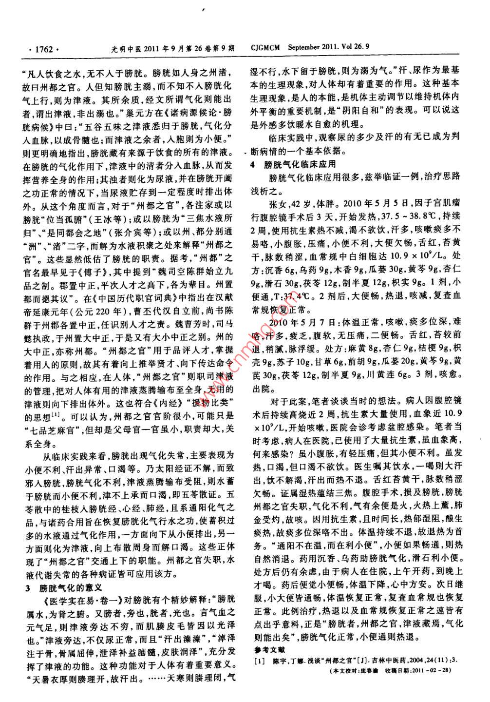●1762●光明中醫(yī)2011年9月第26卷第9期CJCMCM September 2011. Vol 26.9“凡人飲食之水,無(wú)不入于膀胱。膀胱如人身之州諸,濕不行,水下留于膀胱,則為溺為氣。”汗、尿作為最基故日州都之官。人但知膀胱主溺,而不知不人膀胱化本的生理現(xiàn)象,對(duì)人體卻有著重要的作用。這種基本氣上行,則為津液。其所余質(zhì),經(jīng)文所謂氣化則能出生理現(xiàn)象,是人的本能,是機(jī)體主動(dòng)調(diào)節(jié)以維持機(jī)體內(nèi)者,謂出津液,非出溺也?!背苍皆凇吨T病源候論●膀外平衡的重要機(jī)制,是“陰陽(yáng)自和”的表現(xiàn)??梢哉f(shuō)這胱病候》中日:“五谷五味之津液悉歸于膀胱,氣化分是外感多飲暖水自愈的機(jī)理。入血脈,以成骨髓也;而津液之余者,人胞則為小便?!迸R床實(shí)踐中,觀察尿的多少及汗的有無(wú)已成為判則更明確地指出,膀胱藏有來(lái)源于飲食的所有的津液。.斷病情的一個(gè)基本依據(jù)。在膀胱的氣化作用下,津液中的清者分入血脈,從而發(fā)4膀胱氣化臨床 應(yīng)用揮營(yíng)養(yǎng)全身的作用;其濁者則化為尿液,并在膀胱開闔膀胱氣化臨床應(yīng)用很多,茲舉臨證- -例, 治療思路:之功正常的情況下,當(dāng)尿液貯存到一定程度時(shí)排出體淺析之。外。從這個(gè)角度而言,對(duì)于“州都之官”,各注家或以張女,42歲,體胖。2010年5月5日,因子宮肌瘤膀胱“位當(dāng)孤腑"(王冰等);或以膀胱為“三焦水液所行腹腔鏡手術(shù)后3天,開始發(fā)熱,37.5 ~ 38.8C,持續(xù)歸"、“是同都會(huì)之地"(張介賓等);或以州、都分別通2 周,使用抗生素?zé)岵粶p,渴不欲飲,汗多,咳嗽痰多不“洲”、“渚”二字,而解為水液積聚之處來(lái)解釋“州都之易咯,小腹脹,壓痛,小便不利,大便欠暢,舌紅,苔黃官”。這些顯然低估了膀胱的職責(zé)。據(jù)考,“州都”之干,脈數(shù)稍澀,血常規(guī)中白細(xì)胞達(dá)10.9x10*/L。處官名最早見于《傅子>,其中提到“魏司空陳群始立九方:沉香6g, 烏藥9g,木香9g,瓜蔞30g,黃芩9g,杏仁品之制??ぶ弥姓?,平次人才之高下,各為輩目。州置9g,滑石30g,茯苓12g,制半夏12g,枳實(shí)9g。1劑,小都而摁其議”。在《中國(guó)歷代職官詞典》中指出在漢獻(xiàn)便通,T:37.4C。2劑后,大便暢,熱退,咳減,復(fù)查血.帝延康元年(公元220年),曹丕代漢自立前,尚書陳常規(guī)恢復(fù)正常。群于州郡各置中正,任識(shí)別人才之責(zé)。魏曹芳時(shí),司馬2010年5月7日:體溫正常,咳嗽,痰多位深,難懿執(zhí)政,于州置大中正,于是又有大小中正之別。州的咯,汗多,疲乏,腹軟,無(wú)壓痛,二便暢。舌紅,苔較前大中正,亦稱州都。“州都之官”用于品評(píng)人才,掌握退,稍膩.脈浮緩。處方:麻黃8g,杏仁9g,桔梗9g,枳著用人的原則,故其有著向上推舉賢才、向下傳達(dá)命令殼9g,蘇子10g,甘草6g,前胡9g,瓜蔞20g,黃芩9g,黃的作用。與之相應(yīng),在人體,“州都之官"則職司津液芪30g,茯苓12g, 制半夏9g,川黃連6go 3劑,咳愈。的管理,把對(duì)人體有用的津液蒸騰輸布至全身,無(wú)用的出院。津液則向下排出體外。這也符合《內(nèi)經(jīng)》“援物比類”對(duì)于此案,筆者談?wù)劗?dāng)時(shí)的想法。病人因腹腔鏡的思想"??梢哉J(rèn)為,州都之官官階很小,可能只是術(shù)后持續(xù)高燒近2周,抗生素大量使用,血象近10.9“七品芝麻官”,但卻是父母官一官雖小,職責(zé)卻大,關(guān)x10*/L,開始咳嗽,醫(yī)院會(huì)診考慮盆腔感染。筆者當(dāng)時(shí)考慮,病人在醫(yī)院,已使用了大量抗生素,雖血象高,系全身。從臨床實(shí)踐來(lái)看,膀胱出現(xiàn)氣化失常,主要表現(xiàn)為何來(lái)感染?雖小腹脹,有輕壓痛,但其小便不利。雖發(fā)小便不利、汗出異常、口渴等。乃太陽(yáng)經(jīng)證不解,而致熱,口渴,但口渴不欲飲。醫(yī)生囑其飲水,一喝則大汗邪入膀胱,膀胱氣化不利,津液蒸騰輸布受阻,則水蓄出,飲不解渴,汗出而熱不退。舌紅苔黃干,脈數(shù)稍澀于膀胱而小便不利,津不上承而口渴,即五苓散證。五欠暢。證屬濕熱蘊(yùn)結(jié)三焦。腹腔手術(shù),損及膀胱,膀胱苓散中的桂枝入膀胱經(jīng)、心經(jīng)、肺經(jīng),且系通陽(yáng)化氣之州都之官失職,氣化不利,氣有余便是火,火熱上薰,肺品,與諸藥合用旨在恢復(fù)膀胱化氣行水之功,使蓄積過(guò)金受灼,故咳。因用抗生素,且時(shí)間長(zhǎng),熱郁濕阻,釀生多的水液通過(guò)氣化作用,一-方面向下從小便排出,另一痰熱,故痰多位深咯不出。體溫持續(xù)不退,故退熱為首方面則化為津液,向上布散周身而解口渴。這些正體務(wù)?!巴?yáng)不在溫,而在利小便",小便如果暢通,則熱現(xiàn)了“州都之官”交通上下的職能。州都之官失職,水自然消退。藥用沉香、烏藥助膀胱氣化,滑石利小便。液代謝失常的各種病證皆可應(yīng)用該方。處方后仍有余慮,由于病人在住院,上午開藥,到晚上3膀胱氣化的意義 .才喝。藥后便覺小便暢,體溫下降,心中方安。次日繼《醫(yī)學(xué)實(shí)在易.卷- -》對(duì)膀胱有個(gè)精妙解釋:“膀胱服,小大便皆通暢,體溫恢復(fù)正常,復(fù)查血常規(guī)也恢復(fù)屬水,為腎之腑。又膀者,旁也,胱者,光也。言氣血之正常。此例治療,熱退以及血常規(guī)恢復(fù)正常之速皆有元?dú)庾?則津液旁達(dá)不窮,而肌腠皮毛皆因以光澤點(diǎn)出乎意料,正是“膀