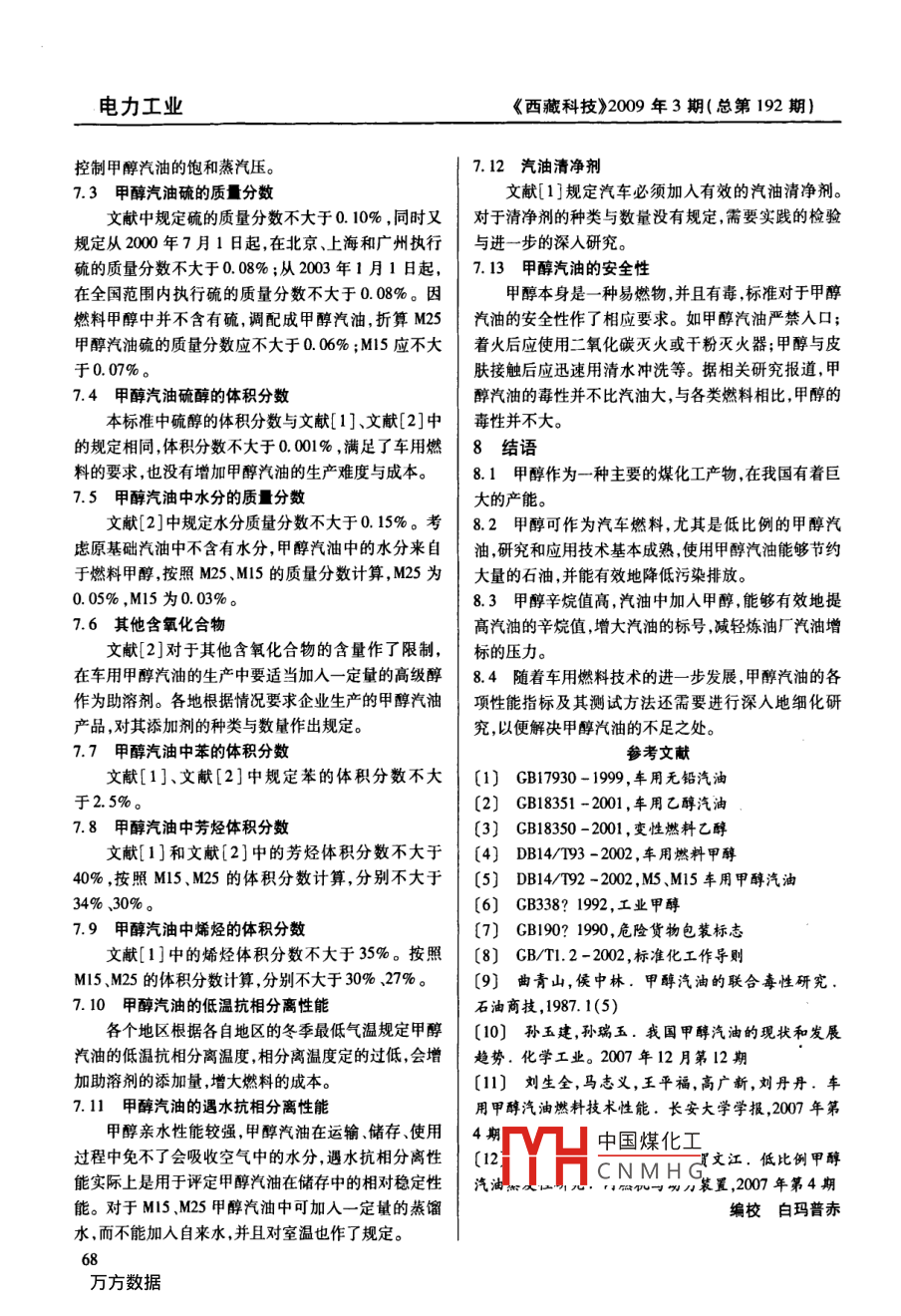 電力工業(yè)《西藏科技》2009年3期(總第192期)車(chē)用甲醇汽油分析李林震(西藏自治區(qū)質(zhì)量技術(shù)監(jiān)督局,西藏拉薩850008)摘要:能源枯竭和環(huán)境污染是世界面臨的嚴(yán)重問(wèn)題,隨著世界汽車(chē)保佑量的增長(zhǎng),在世界范圍內(nèi)石油系燃料的供需矛盾日益突出,汽車(chē)發(fā)動(dòng)機(jī)消耗石油總量巨大,廢氣的排放也成為大氣污染的主要來(lái)源之。從資源、經(jīng)濟(jì)、實(shí)用等方面來(lái)考慮,開(kāi)發(fā)新的清潔代用燃料成為重要的研究諜題。甲醇燃料來(lái)源豐富,能夠節(jié)約汽車(chē)運(yùn)營(yíng)成本,節(jié)約大量的石油資源。本文以M、Ml5甲醇汽油為例分析了使用甲醇汽油的經(jīng)濟(jì)性和推廣性。關(guān)鍵詞:汽車(chē)甲醇汽油分析中圖分類號(hào):U473.14“富煤貧油”是我國(guó)一個(gè)重要的資源特點(diǎn)決定了|甲醇裝置已積累了足夠的技術(shù)基礎(chǔ);水煤漿為原料的在今后較長(zhǎng)的一段時(shí)間內(nèi)我國(guó)仍將呈現(xiàn)以煤為主的能大型氣化爐已運(yùn)行多年可實(shí)現(xiàn)長(zhǎng)周期運(yùn)轉(zhuǎn);新型水煤源消耗結(jié)構(gòu)。因此發(fā)展煤基車(chē)用替代燃料不失為一|漿氣化爐與干煤加壓氣化爐正在積極開(kāi)發(fā)中;各種低種較好的策略。甲醇作為一種主要的煤化工產(chǎn)物在能耗的天然氣蒸汽轉(zhuǎn)化技術(shù)均已掌握;低成本以空氣我國(guó)有著巨大的產(chǎn)能200年底陜北甲醇的生產(chǎn)能為氣化劑的天然氣轉(zhuǎn)化制合成氣技術(shù)已經(jīng)開(kāi)發(fā);多種力達(dá)到年產(chǎn)100萬(wàn)噸,其產(chǎn)品具有明顯的價(jià)格、質(zhì)量?jī)?yōu)的脫碳、脫硫工藝已成熟用于工業(yè)生產(chǎn);變換精脫硫、勢(shì)若能得到大規(guī)模應(yīng)用將能夠節(jié)省大量石油資源。甲醇合成催化劑均已國(guó)產(chǎn)化;新型甲醇合成反應(yīng)器已甲醇(CHOH是一種輕質(zhì)無(wú)色略有臭味低污染的形成專利技術(shù);精餾裝備已達(dá)到節(jié)能和優(yōu)化水平。目可燃液體,甲醇只含一個(gè)C原子沒(méi)有C一C鍵,并含前國(guó)內(nèi)已掌握了建設(shè)10-30萬(wàn)噸年,單系列甲醇裝有50%的氧CH原子量比為3是一種燃燒后生成的置的設(shè)計(jì)技術(shù)。排氣較清潔的含氧燃料,甲醇可以以一定比例添加在2甲醇與汽油的互溶性汽油中成為甲醇汽油。甲醇汽油燃料本身含氧,在汽車(chē)發(fā)動(dòng)機(jī)中燃燒更加完全,效率高排放污染少,并且汽車(chē)要求甲醇與汽油必須溶合使用,互溶性除受燃料辛烷值提高,發(fā)動(dòng)機(jī)抗爆震性能增強(qiáng),是一種性能甲醇與汽油各自的物化性能的影響外,還與儲(chǔ)存、使用優(yōu)良的汽車(chē)燃料。的溫度、燃料中水分的含量、助溶劑的種類與數(shù)量等密1甲醇的現(xiàn)狀,生產(chǎn)技術(shù)的成熟性與可靠性切相關(guān)。低比例甲醇和較高比例甲醇與汽油相對(duì)容易2006年,我國(guó)甲醇生產(chǎn)874.7萬(wàn)噸,進(jìn)口甲醇溶合,而中等比例的甲醇汽油則較難以溶合。112.7萬(wàn)噸,出口19萬(wàn)噸,表觀消費(fèi)量968.4萬(wàn)噸,共3甲醇的腐蝕性有甲醇生產(chǎn)企業(yè)167家產(chǎn)能合計(jì)為13444萬(wàn)噸/年。甲醇對(duì)汽車(chē)發(fā)動(dòng)機(jī)的銅、鋁等金屬部件和橡膠、塑據(jù)統(tǒng)計(jì),“十一五”期間我國(guó)新建擬建甲醇項(xiàng)目共42料等彈性體具有一定的腐蝕作用并且隨著甲醇汽油個(gè)(不包括二甲醚、甲醇制烯烴生產(chǎn)企業(yè)自穿配套的中甲醇體積分?jǐn)?shù)的增加腐蝕性能增強(qiáng)。而通過(guò)對(duì)材甲醇生產(chǎn)裝置)。其中,“十一五”期間可以投產(chǎn)的項(xiàng)料的選擇可以減少這種侵害。胺類、有機(jī)磷酸酯類、有目為35個(gè)產(chǎn)能合計(jì)18萬(wàn)噸年。預(yù)計(jì)到“十一機(jī)羧酸類氮雜環(huán)類、屏蔽酚類五種防腐劑進(jìn)行復(fù)配,五"末期,我國(guó)甲醇生產(chǎn)企業(yè)將為20家左右,產(chǎn)能將制成的甲醇燃料金屬腐蝕抑制劑對(duì)銅鋁45號(hào)鋼、達(dá)到2500萬(wàn)噸/年~4850萬(wàn)噸/年鋅中國(guó)煤化工好的腐蝕抑制能力,我國(guó)甲醇的合成裝置基本上使用煤油、天然氣三且溶CNMHG腐蝕性能的要求。種原料;現(xiàn)代甲醇生產(chǎn)技術(shù)幾乎均為低壓法。英國(guó)CI4甲畔汽油燃后甲睡時(shí)排放污染公司和LURG公司的低壓甲醇生產(chǎn)技術(shù)占全世界甲汽車(chē)發(fā)動(dòng)機(jī)燃燒甲醇汽油時(shí),CO、HC、NOx等常醇總量的70%以上。我國(guó)自行設(shè)計(jì)制造和運(yùn)行大型規(guī)排放物質(zhì)大幅度減少,而甲醛的排放量有所上升?!段鞑乜萍肌?009年3期(總第192期)電力工業(yè)甲醛是甲醇汽油在發(fā)動(dòng)機(jī)中燃燒時(shí)所產(chǎn)生的一種中間|的標(biāo)志因而與汽車(chē)發(fā)動(dòng)機(jī)的設(shè)計(jì)密切相關(guān)燃料的辛產(chǎn)物甲醛對(duì)人體也有較大的危害低比例甲醇汽油的烷值必須執(zhí)行國(guó)家標(biāo)準(zhǔn)。90#甲醇汽油主要供化油器甲醛排放可以采用特效的催化轉(zhuǎn)化器處理可以降低式汽車(chē)使用;93排甲醇汽油供部分電控汽油噴射式供油排放氣體的污染系統(tǒng)的汽車(chē)使用95#甲醇汽油供對(duì)燃料質(zhì)量要求較高5甲醇汽