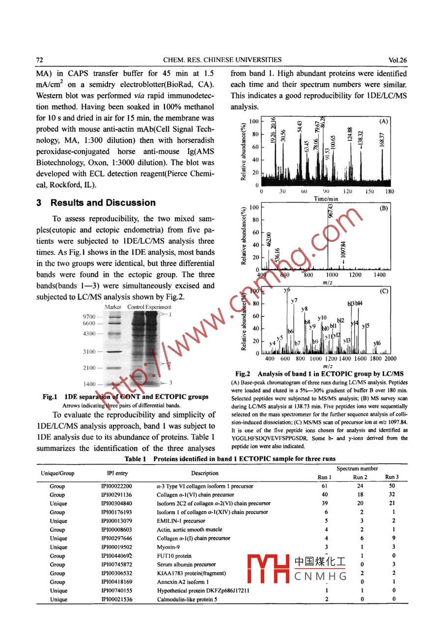 CHEM. RES. CHINESE UNIVERSITIES 2010, 26(1), 70- 74Differential Proteomic Analysis of EndometriosisZHANG Li-hui', LIU Hong-yan', LI He-lian', ZHANG Xing-yi2 and SUN Mei'*1. Department of Gynecology & Obstetrics, 2. Department of Thoracic Surgery, 3. Department of Pathologythe Second Hospital of Jilin Universit, Changchun 130041, P. R. ChinaAbstract Differential proteins expressing in ectopic and eutopic endometria were investigated by means of proteo-mic analysis. Five patients in secretary phase were diagnosed as endometriosis by laparoscopy. The five ectopic en-domctria(two at stage II, two at stage Ill and one at stage IV) and five cutopic endometria were surgically excised.Onc-dimensional electrophoresis coupled with liquid chromatography and mass spectrometry was used to screen andidentify differential proteins. Three differential bands in one-dimensional electrophoresis were resolved by liquidchromatography and mass spectrometry and 14 up-regulated proteins were identified, including collagen a-1, a-2, .a-3(VI), a-l(XIV) chain, actin, annexin A2, EMILIN-I, frritin light polypeptide variant, fucosyltransfcrase 10myosin-9, protin S100-A9, KIAA1783 protein, and two hypothetical proteins. Our data provides a list of potentialbiomarkers for endometriosis. The identifications may be used to develop new diagnoses for endometriosis.Keywords Endometriosis; Onc-dimensional electrophoresis; Liquid chromatography; Mass spectrometry; ProteomicsArticle ID 1005-9040(2010)-01-070-051 Introductionmetry. They have identified some differential proteinsEndometriosis is a gynecological disease andin endometriosis patients' tissues and sera.Studies'8] have shown that despite the high-presents endometrial-like glands and stroma outsideresolution capability, the 2DE approach has the draw-the uterine cavity. The ectopic endometrium resultsbacks of labor-intensive and irresolvable for very ba-from intermittent variation when it is affected by thesic or acidic, and very large or small proteins. Moreo-ovarian hormone, which also has the same effect onver, surface enhance laser desorption/ionizationnormal endometra. Endometriosis is characterized byhyperplasia, infiltrate, disseminate and transfuse ma-time-of-flight mass spectrometry can merely analyzelignant behavior, which is similar to malignant tumors.low molecular weight proteins and it is difficult for itThe typical sign and symptom of endometriosis areto make protein identification. To avoid technicalpersistent algomenorrhea, dysgenesia, pelvic cavitydisadvantages, in the study, a novel approach withcombination of one dimensional electrophoresis,purple nodules, and chocolate cyst of ovary. Althoughliquid chromatography, and mass spectrometrylaparoscopy has emerged as one of the specific and(IDE/LC/MS) was adopted for diferential proteomicsensitive methods for the diagnosis of endometriosis,analysis of patients with endometriosis. Such an ap-inevitably it brings surgical stress and risks. Therefore,proach has not been applied to the study of endome-it is the urgent need to develop non-invasive diagnosistriosis to date. However, there still exists a potential toapproaches such as biochemistry.Over the years, an advance in proteomics hasprovide useful tools for the study of endometriosisopened a new avenue for discovering disease bio-pathogenesis and its diagnosis.markers. Recently,related proteomic analysis2 Experimentalrepresents the most important development for thestudy of diseases- 0!. Researchers have accomplished2.1 Tissue Preparationthe investigation of endometriosis with proteomicFive women with endometriosis submitted to la-analysis approaches. Zhang et al,!" have successfullyparoscopy were selected. Endomtriosis was con-analyzed the differential proteins in patients withfirmed by histology, and the extent of the disease wasendometriosis versus normal controls using two-stagAmerican Fertilitydimensional electrophoresis(2DE) and mass spectro- Sc中國(guó)煤化工puts Iw weeTYHCNMHG*Corresponding author. E-mail: sun.mci55@yahoo.comReceived May 20, 2009; accepted June 28, 2009.Supported by the National Natural Science Foundation of China(Nos.30670301, 30870354).No.1ZHANG Li-hui et al.7classified as stage II, two as stage II, and one as stageexcised from the gel and cut into pieces of 1 mm' inIV, respectively. Five patients' menstrual cycles weresize. In-gel digestion was performed as described pre-all at proliferative stage. The eutopic and ectopic en-viouslyl'l. Brifly, the gel pieces were dehydrated bydometrium tissues(Chocolate cyst) were obtained viaacetonitrile, rehydrated by 25 mmol/L ammoniumlaparoscopy and stored at- -80 。C. Except endometri-bicarbonate. In-gel proteins were digested by 0.5osis, no other diseases have been diagnosed on physi-μmoIL trypsin and twice extracted from the gel undercal examination and biochemical tests for the fivemicrowave iradiation. Gel was microwaved for 5 minwomen. None had received any hormonal treatmentfor each digestion and extraction step. Extractedwithin three months prior to study. This study waspeptides were lyophilized before mass spectrometryapproved by the Ethics Committee on the Clinicalanalysis.Study of Second Hospital of Jjilin University, China.2.5 LC/MS/MS and Database Searching2.2 Protein Sample PreparationThe lyophilized samples were re-dissolved inThe frozen biopsies were washed with phos-0.1% formic acid(buffer A containing 0. 1% formicphate-buffered saline in sterile Petri dishes to removeacid and 99.9% :H2O) before LC/MS analysis. Pep-any adhered hemoglobin and other proteins from he-tides were loaded onto self-packed C18 RP capillarymolysis at the time of sample collction. Tissues werecolumns( 100 mmx0.17 mm, i.d. 5 μum) with buffer A,cut into 1 mm' pieces, ground into powders in liquidand eluted with 5%- -30%(volume fraction) buffer Bnitrogen and dissolved in lysis buffer containing 7for 180 min. Eluted peptides were detected in a surveymol/L urea, 2 mol/L thiourea, 2%(mass frac
