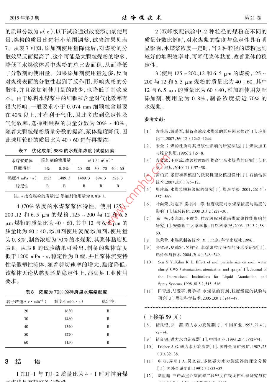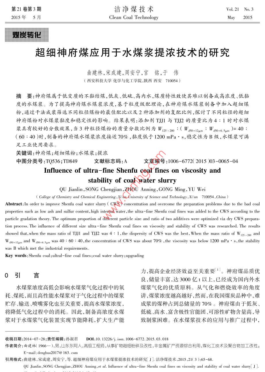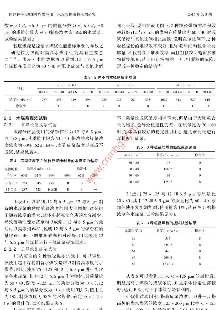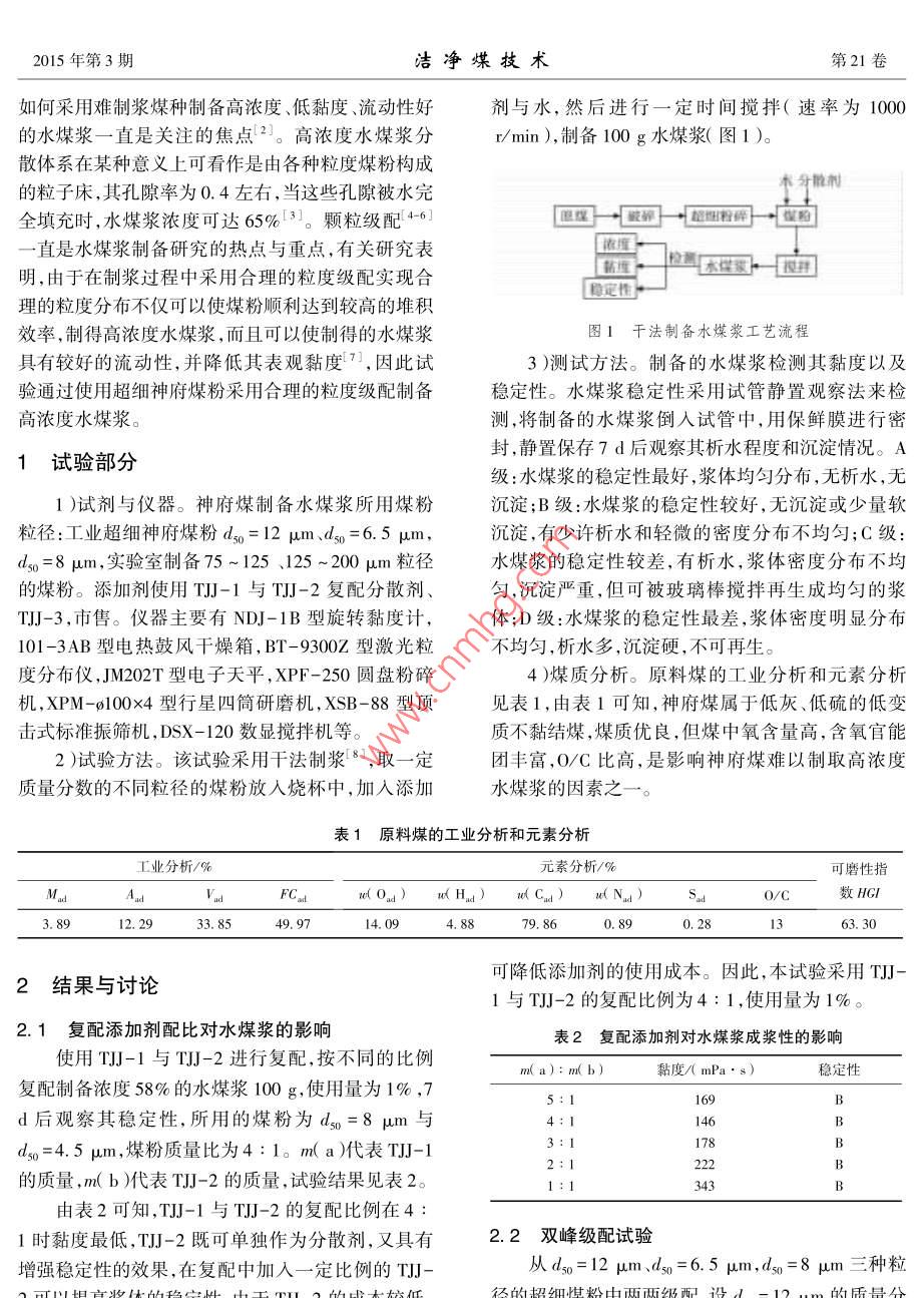 第21卷第3期潔凈煤技術(shù)Vol 21 No. 32015年5月Clean Coal Technology爆度轉(zhuǎn)世超細(xì)神府煤應(yīng)用于水煤漿提濃技術(shù)的研究曲建林,宋成建,周安寧,宮銘,于偉(西安科技大學(xué)化學(xué)與化工學(xué)院,陜西西安710054)摘要:神府煤屬于低變質(zhì)的不黏結(jié)煤,低灰、低硫、髙內(nèi)水,煤質(zhì)特性致使其難以制備成高濃度、低黏度的水煤漿。為了提高神府煤水煤漿濃度,基于粒度級(jí)配理論,在神府煤水煤漿制備中加入超細(xì)煤粉,通過干法成漿篩選不冋粒徑煤粉的最佳配比以及2種添加劑的復(fù)配比例,探討了不同粒徑的超細(xì)神府煤粉對(duì)水煤漿黏度和穩(wěn)定性的影響。結(jié)果表明:添加劑TJ與們J!的質(zhì)量比為4:1時(shí)對(duì)水煤漿具有較好的分散效果,當(dāng)3種粒徑煤粉的質(zhì)量分?jǐn)?shù)比例為W1-2m0:(W0=1m:W6065m)=40(60:40)時(shí),制備的神府煤水煤漿濃度接近70%,黏度低于1200mPa·s,穩(wěn)定性為B級(jí),水煤漿可滿足工業(yè)使用要求。關(guān)鍵詞:神府煤;超細(xì)煤粉;水煤漿;提濃中圖分類號(hào):TQ536;TD849文獻(xiàn)標(biāo)志碼:A文章編號(hào):1006-6772(2015)03-0065-04Influence of ultra-fine Shenfu coal fines on viscosity andstability of coal water slurryQU Jianlin, SONG Chengjian, ZHOU Anning, GONG Ming, YU Weollege of Chemistry and Chemical Engineering, Xi an University of Science and Technology, Xi'an 710054, ChinaAbstract: In order to improve Shenfu coal water slurry( Cws )concentration and overcome the preparation problems due to the bad coalproperties such as low ash and sulfur content, high internal water, the ultra-fine Shenfu coal fines was added to the Cws according to theparticle gradation theory. The optimum proportion of different particle size and ratio of two additives were optimized via dry Cws prepara-tion process. The influence of different size ultra-fine Shenfu coal fines on viscosity and stability of CWs was researched. The resultsat,when the mass ratio of T JI and TJ.J2 was 4: 1, the dispersity of Cws was the best, When theWaosl2um and Waso=6.sam was 40: 60: 40, the concentration of Cws was about 70%, the viscosity was belowmPa.s, the stabilitywas B which met the industrial requirementsKey words: Shenfu coal; ultral-fine coal fines; coal water slurry; upgrading力,提高企業(yè)經(jīng)濟(jì)效益至關(guān)重要11。神府煤品質(zhì)優(yōu)良,儲(chǔ)量豐富,達(dá)3000億t以上,已經(jīng)成為國(guó)內(nèi)外水水煤漿濃度高低會(huì)影響水煤漿氣化過程中的氧煤漿氣化的優(yōu)質(zhì)原料。從氣化和燃燒效率的角度耗、煤耗,而且高性能水煤漿對(duì)于氣化過程中的煤漿講,煤漿濃度越高越好,然而,在我國(guó)煤炭品種中,難貯存、輸送、噴嘴霧化也至關(guān)重要,提髙水煤漿濃度成漿的煤種占到總儲(chǔ)量的70%。神府煤由于低灰將降低氣化過程中的消耗。因此,制備高濃度水煤低硫、高水、富含極性官能團(tuán)、可溶性礦物含量高,導(dǎo)漿對(duì)于水煤漿氣化裝置實(shí)現(xiàn)節(jié)能降耗,擴(kuò)大生產(chǎn)能致制漿困難。在水煤漿技術(shù)的應(yīng)用與推廣過程中,收稿日期:2014-07-28;責(zé)任編輯:孫淑君DOI:10.13226/j.iss.1006-6772.2015.03.018作者簡(jiǎn)介:曲建林(1966-),男,山東東阿人,高級(jí)工程師,從事礦物超絀粉碎及改性,非金屬礦產(chǎn)資源綜合利用,煤化工技術(shù)及聚合物加工改性。E-mail:denghuo2017@163.com引用格式:曲建林宋成建周安寧,等超細(xì)神府煤應(yīng)用于水煤漿提濃技術(shù)的硏究J].潔凈煤技術(shù),2015.21(3):65-68QU Jianlin, SONG Chengjian, ZHOU Anning, et al. Influence of ultra-fine Shenfu coal fines on viscosity and stability of coal water slurry[ J]2015年第3期潔凈煤技術(shù)第21卷如何采用難制漿煤種制備高濃度、低黏度、流動(dòng)性好劑與水,然后進(jìn)行一定時(shí)間攪拌(速率為1000的水煤漿一直是關(guān)注的焦點(diǎn)2。高濃度水煤漿分r/min),制備100g水煤漿(圖1)。散體系在某種意義上可看作是由各種粒度煤粉構(gòu)成的粒子床,其孔隙率為0.4左右,當(dāng)這些孔隙被水完車分能劑全填充時(shí),水煤漿濃度可達(dá)65%3。顆粒級(jí)配46“好→直是水煤漿制備研究的熱點(diǎn)與重點(diǎn),有關(guān)研究表明,由于在制漿過程中采用合理的粒度級(jí)配實(shí)現(xiàn)合定性理的粒度分布不僅可以使煤粉順利達(dá)到較高的堆積效率,制得高濃度水煤漿,而且可以使制得的水煤漿圖1干法制備水煤漿工藝流程具有較好的流動(dòng)性,并降低其表觀黏度,因此試3)測(cè)試方法。制備的水煤漿檢測(cè)其黏度以及驗(yàn)通過使用超細(xì)神府煤粉采用合理的粒度級(jí)配制備穩(wěn)定性。水煤漿穩(wěn)定性采用試管靜置觀察法來檢高濃度水煤漿。測(cè),將制備的水煤漿倒入試管中,用保鮮膜進(jìn)行密1試驗(yàn)部分封,靜置保存7d后觀察其析水程度和沉淀情況。A級(jí):水煤漿的穩(wěn)定性最好,漿體均勻分布,無析水,無1)試劑與儀器。神府煤制備水煤漿所用煤粉沉淀;B級(jí):水煤漿的穩(wěn)定性較好,無沉淀或少量軟粒徑:工業(yè)超細(xì)神府煤粉do=12μm、d0=6.5μm沉淀,有少許析水和輕微的密度分布不均勻;C級(jí)do=8μm,實(shí)驗(yàn)室制備75~125、125~200μm粒徑水煤漿的穩(wěn)定性較差,有析水,漿體密度分布不均的煤粉。添加劑使用TJ-1與TJ-2復(fù)配分散劑勻,沉淀嚴(yán)重,但可被玻璃棒攪拌再生成均勻的漿們J-3,市售。儀器主要有NDJ-1B型旋轉(zhuǎn)黏度計(jì)體;D級(jí
