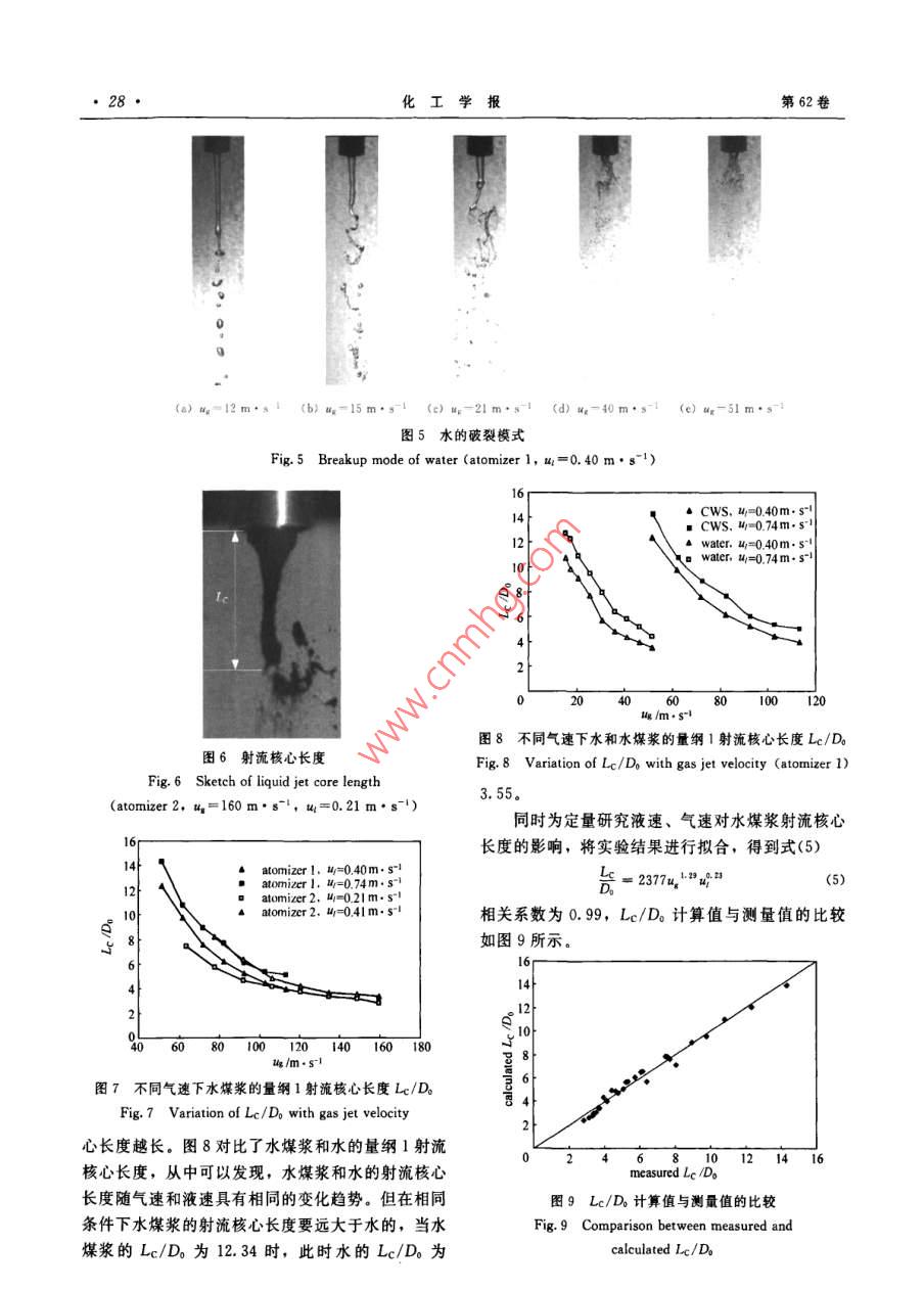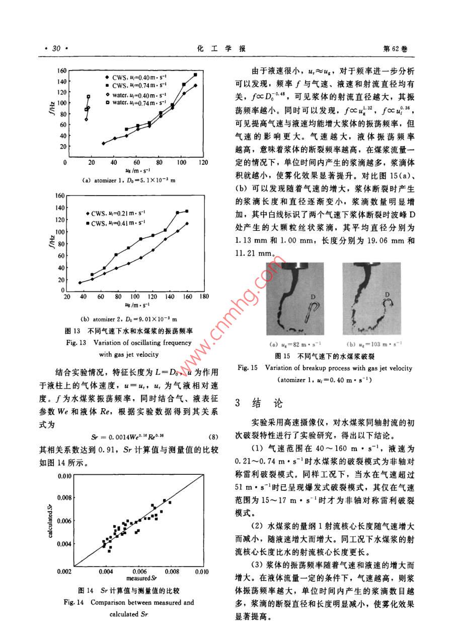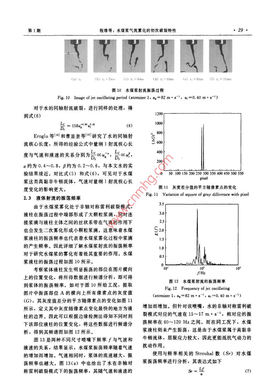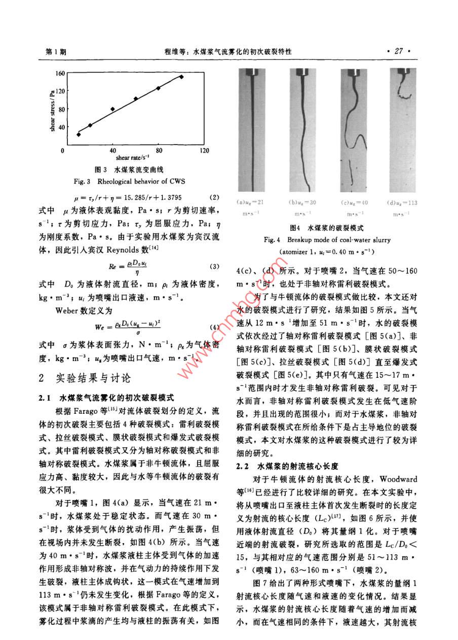第62卷第1期化工學報Vol. 62 No. 12011年1月CIESC JournalJanuary 2011研究論文水煤漿氣流霧化的初次破裂特性程維,趙輝,孟沁瑋,李偉鋒,許建良,劉海峰(華東理工大學煤氣化教育部重點實驗室,上海200237)摘要:以水煤漿和空氣作為實驗介質,利用高速擾像儀對同軸雙通道噴嘴水煤漿氣流霧化的初次破裂過程進行了實驗研究,重點考察了在噴嘴出口附近水煤漿的射流核心長度和振蕩頻率等特征。研究結果顯示,實驗中水煤漿的破裂模式為非軸對稱雷利破裂模式,根據(jù)實驗結果,得到了漿體的量綱1射流核心長度與氣速和液速之間的關系式。霧化過程中漿滴的產(chǎn)生與水煤漿射流振蕩有關,研究了其 Strouhal數(shù)與 Weber數(shù)和液體 Reynolds數(shù)之間的關系關鍵詞:氣流霧化;水煤漿;射流核心長度;振蕩頻率中圖分類號:TQ022.4文獻標志碼:A文章編號:0438-1157(2011)01-0025-07Primary breakup characteristics of air-blast atomizationof coal-water slCHENG Wei, ZHAO Hui, MENG Qinwei, LI Weifeng, xU Jianliang, LIU Haifeng(Key Laboratory of Coal Gasification of Ministry of Education, East China University of Science andTechnology, Shanghai 200237, China)Abstract: The primary breakup process of coal-water slurry (CWS)of the coaxial air-blast atomizer hasbeen studied by a high-speed camera. The jet core length and oscillating frequency of coal-water slurry inthe near-fieldigated. The results showed that the breakup process of Cws wasperformed in the non-axisymmetric Rayleigh-type breakup regime in the experiment. The equation ofdimensionless liquid jet core length with gas jet velocity and liquid jet velocity was obtained. The oscillatingfrequency was characterized by the Strouhal number. The relationship between the Strouhal number andWeber number & Reynolds number of liquid was investigatedKey words: air-blast atomization; coal-water slurry; liquid jet core length; oscillating frequency對工程實踐有明確的指導意義氣流霧化效率高、能耗低,應用極為廣泛,大水煤漿(CWS)具有便于輸運等優(yōu)點,廣泛量的學者對其進行了理論研究3和實驗研究應用于氣化爐、鍋爐燃燒等領域中口2。但水煤漿氣流霧化分為初次破裂和二次破裂兩個過程。初次為非牛頓流體,濃度高、黏度大,霧化較為困難。破裂是指氣、液間相互作用引起液體表面不穩(wěn)定波對水煤漿霧化的研究不僅具有重要的學術價值,還的增長,導致液體射流破裂的過程,其產(chǎn)生的液滴2010—05-28收到初稿,2010-08-14收到修改稿Received date: 2010-05-28.聯(lián)系人:劉海峰。第一作者:程維(1985-),男,碩士研Corresponding author: Prof. LIU Haifeng, hfliuGecust. edu. cn究生Foundation item: supported by the National Natural Science基金項目:國家自然科學基金項目(50776033);國家重點基 Foundation of China(50776033), the National Basic Research礎研究發(fā)展計劃項目(2010CB227004);教育部新世紀優(yōu)秀人才支 Program of China(2010B227004) and the New Century Excellent持計劃項目(NCET08-0775)Talents in University(NCET-08-0775)化工學報第62卷在氣動力作用下繼續(xù)發(fā)生變形和破碎的過程稱為二次破裂。初次破裂控制著液滴的延伸范圍,并為二次破裂提供初始條件,因此對于液體霧化有十分重要的意義。對于液體初次破裂特性的研究主要是利用高速攝像儀等實驗手段并結合理論分析。Marmottant等10研究了液體射流近端的表面波長對初次破裂的影響。 Villermaux等{研究了射流表面拉絲破裂對于初次破裂滴徑的影響。但當前對于水煤漿氣流霧化的研究大多集中在二次破裂后液滴滴徑的大小與分布特征。 Shirley等山2研究了操作參數(shù)對水煤漿霧化滴徑的影響,并總結了相應的經(jīng)驗圖2實驗流程公式。Yu等山對大型撞擊式水煤漿噴嘴不同氣液Fig 2 Flow chart of experimental process流量下的霧化滴徑分布進行了研究??偟膩碚f,針I(yè)-blower: 2-nitrogen gas steel bottle 3-pressure reducingvalve 4-flow meter: 5-pressure gauge: 6-CwS tank,對水煤漿初次破裂的研究還很少。本文以水煤漿為experimental atomizer 8-CwS collecting tank工作介質,采用高速攝像儀對同向氣流作用下液體9-high-speed camera: 10-computes射流近端的初次破裂進行了實驗觀察和分析,通過研究液體射流核心長度、振蕩頻率等特征,為同軸漿體的溫度升高,影響漿體的物理性質,因此在本射流水煤漿氣流霧化噴嘴的設計開發(fā)和結構優(yōu)化提文實驗中采用壓力輸送的方式。調節(jié)鋼瓶氣體壓力供相應的依據(jù)。小于5%。環(huán)隙氣流由鼓風機供給,通過氣體流量1實驗系統(tǒng)計計量。水煤漿的初次破裂過程通過高速攝像儀記1.1實驗流程與工況錄,傳輸至計算機以供分析。本實驗采用同軸式噴嘴,由氣體通道和液體通1.2實驗相關參數(shù)的確定道組成,如圖1所示,具體尺寸和實驗工況見表實驗采用 Photron公司生產(chǎn)的 Fastcam APX1,實驗流程如圖2所示,由于常用的離心泵、螺S型高速攝像儀進行拍攝,拍攝速度為3000幀桿泵等與輸送漿體間因摩擦會產(chǎn)生大量的熱從而使秒,曝光時間為1/20000。使用 Mastersizer2000馬爾文激光測粒儀測量所用煤粉的表面積平均粒徑Dx為24.6m,中值粒徑dsy=92.90gm。所制水煤漿固含率為580%,密度p=1211kg·m3。通過美國Cahn公司的DCA315表面張力儀測得表面張力a為0.108N·m-1。使用NXS4C型水煤漿黏度計對13℃時的水煤漿的流變性進行測定,結果如圖3所示。該水煤漿屬于賓漢流體,對剪切應力和剪切速率擬合得到式(1)圖1實驗噴嘴結構r=t;+丌=1.3795r+15.285(1)Fig 1 Experimental atomizer configuration其表觀黏度