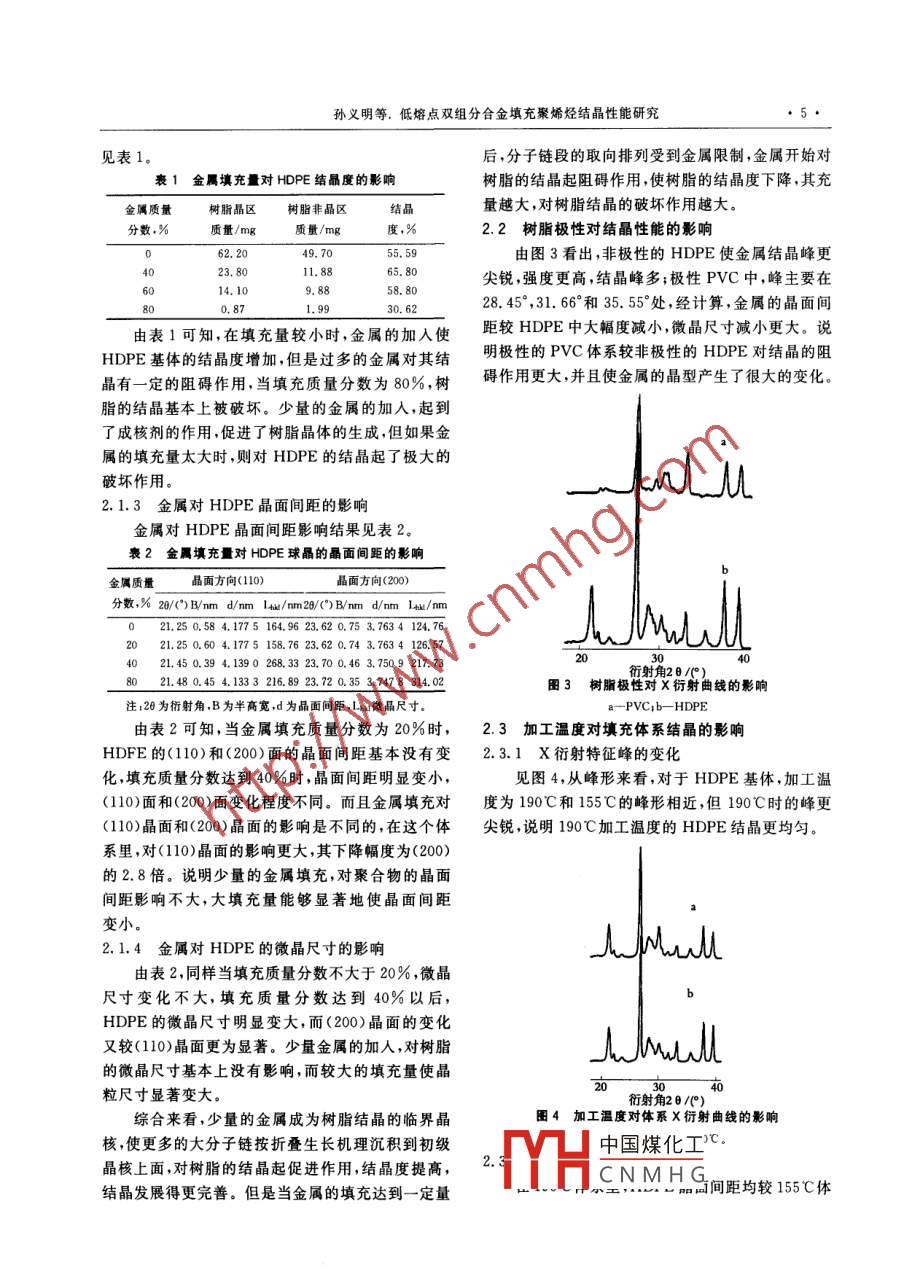 Modern Plastics Processing and Applications第16卷第4期低熔點(diǎn)雙組分合金填充聚烯烴結(jié)晶性能研究孫義明孟慶浩彭少賢楊宇紅劉偉(湖北工業(yè)大學(xué)化工系,武漢,430068)摘要:利用廣角X射線衍射分析儀對(duì)低熔點(diǎn)金屬及合金填充聚合物材料體系的結(jié)晶行為進(jìn)行了研究,試驗(yàn)結(jié)果表明,少量的金屬提高了樹(shù)脂的結(jié)晶度,大量的金屬加人破壞聚合物的結(jié)晶,極性聚合物阻礙合金結(jié)晶;較高的成型加工溫度有利于體系的結(jié)晶性能的提高;第3組分加入使體系的結(jié)晶度減少、韌性變好關(guān)鍵詞:低熔點(diǎn)金屬合金金屬填料聚合物廣角X射線衍射結(jié)晶性低熔點(diǎn)金屬及合金相對(duì)于剛性填料具有許多的優(yōu)點(diǎn),本試驗(yàn)利用廣角Ⅹ射線衍射儀,討論低熔點(diǎn)金屬及合金填充聚合物材料體系中的高密度聚乙烯(HDPE)結(jié)晶性能的變化,樹(shù)脂極性、加工溫度對(duì)結(jié)晶性的影響和第3組分對(duì)結(jié)晶行為的影響。試驗(yàn)部分1原料HDPE,7000F,日本三井石油化學(xué)工業(yè)公司;聚丙烯(PP),0721,韓國(guó)三星綜合開(kāi)發(fā)公司;聚氯乙烯(PVC),S1000,齊魯石化公司;Bi與Pb(質(zhì)量比56.5:43.5)混配的第3組分30行射角2(°)1.2廣角X衍射儀(WAXD)分析圖1金屬填充HDPE的X衍射曲線將樣品(如未說(shuō)明,合金填充質(zhì)量分?jǐn)?shù)為40%)注:ab,e,d,e金屬填充質(zhì)量分?jǐn)?shù)依次為0,20%,40%,80%,91%置于載玻片上,加熱,待樹(shù)脂熔化,然后在最大結(jié)晶速度溫度Tm處保溫?cái)?shù)分鐘,取出,自然冷卻至室溫。儀器: Rigaku3015Ⅹ一射線衍射儀,CuKa靶,Ni濾波,電壓35kV,25mA。2試驗(yàn)結(jié)果與討淪2.1HDPE的結(jié)晶性能的變化2.1.1樹(shù)脂X衍射特征峰的變化1214t6182024衍射角20/°)金屬填充HDPE的X衍射曲線見(jiàn)圖1,金屬填圖2金屬填充PP的X衍射曲線充PP的X衍射曲線見(jiàn)圖2注:a,b分別表示金屬填充質(zhì)量分?jǐn)?shù)為0和40%圖1、圖2上可以看到,隨著金屬填充量的增2.1.2金屬填充量對(duì)HDE結(jié)晶度的影響加,聚合物基體無(wú)論是PP還是HDPE,其峰強(qiáng)迅速通過(guò)剪紙稱(chēng)重法測(cè)量HDPE結(jié)晶度,測(cè)試結(jié)果衰減。這是由下面的2個(gè)原因造成:(1)隨著金屬的期:2004-03-19。加人,對(duì)樹(shù)脂的結(jié)晶起到了破壞的作用,使結(jié)晶度大中國(guó)煤化工工系副教授,主要從事幅度下降;(2)隨著金屬填充量的增加,單位體積內(nèi)高分CNMHG樹(shù)脂的含量迅速減少,引起峰強(qiáng)度的衰減。國(guó)冢目然樣字基筮壩日,壩目漏號(hào)z44013孫義明等.低熔點(diǎn)雙組分合金填充聚烯烴結(jié)晶性能研究見(jiàn)表1。后,分子鏈段的取向排列受到金屬限制,金屬開(kāi)始對(duì)表1金屬填充量對(duì)HDPE結(jié)晶度的影響樹(shù)脂的結(jié)晶起阻礙作用,使樹(shù)脂的結(jié)晶度下降,其充金屬質(zhì)量樹(shù)脂晶區(qū)樹(shù)脂非晶區(qū)結(jié)品量越大對(duì)樹(shù)脂結(jié)晶的破壞作用越大分?jǐn)?shù),%質(zhì)量/mg質(zhì)量/mg2.2樹(shù)脂極性對(duì)結(jié)晶性能的影響55.59由圖3看出,非極性的HDPE使金屬結(jié)晶峰更23.11.8865.80尖銳,強(qiáng)度更高,結(jié)晶峰多;極性PVC中,峰主要在28.45°,31.66°和35.55°處,經(jīng)計(jì)算,金屬的晶面間由表1可知,在填充量較小時(shí),金屬的加入使距較HDPE中大幅度減小,微晶尺寸減小更大。說(shuō)HDPE基體的結(jié)晶度增加,但是過(guò)多的金屬對(duì)其結(jié)明極性的PVC體系較非極性的HDPE對(duì)結(jié)晶的阻晶有一定的阻礙作用,當(dāng)填充質(zhì)量分?jǐn)?shù)為80%,樹(shù)礙作用更大,并且使金屬的晶型產(chǎn)生了很大的變化脂的結(jié)晶基本上被破壞。少量的金屬的加入,起到了成核劑的作用,促進(jìn)了樹(shù)脂晶體的生成,但如果金屬的填充量太大時(shí),則對(duì)HDPE的結(jié)晶起了極大的破壞作用。2.1.3金屬對(duì)HDPE晶面間距的影響金屬對(duì)HDPE晶面間距影響結(jié)果見(jiàn)表2。表2金屬填充量對(duì)HDPE球晶的晶面間距的影響金屬質(zhì)量晶面方向(110)晶面方向(200)分?jǐn)?shù)%20()B/md/mmlh/m2/()B/nmd/mlh/m021.250.584.175164.9623.620.753.7634124.762021.250.604.1775158.7623.620.743.7634126.574021.450.394.1390268.3323.700.463.7509217.738021.480.454.1333216.8923.720.353.7478314.02射角28/°)圖3樹(shù)脂極性對(duì)X衍射曲線的影響注:26為衍射角,B為半高寬,d為品面間距,LM微晶尺寸由表2可知,當(dāng)金屬填充質(zhì)量分?jǐn)?shù)為20%時(shí),2.3加工溫度對(duì)填充體系結(jié)晶的影響HDFE的(110)和(200)面的晶面間距基本沒(méi)有變2.3.1X衍射特征峰的變化化,填充質(zhì)量分?jǐn)?shù)達(dá)到40%時(shí),晶面間距明顯變小見(jiàn)圖4,從峰形來(lái)看,對(duì)于HDPE基體,加工溫(110)面和(200)面變化程度不同。而且金屬填充對(duì)度為190℃和155℃的峰形相近,但190℃時(shí)的峰更(110)晶面和(200)晶面的影響是不同的,在這個(gè)體尖銳,說(shuō)明190℃加工溫度的HDPE結(jié)晶更均勻。系里,對(duì)(110)晶面的影響更大,其下降幅度為(200)的2.8倍。說(shuō)明少量的金屬填充,對(duì)聚合物的晶面間距影響不大,大填充量能夠顯著地使晶面間距變小。2.1.4金屬對(duì)HDPE的微晶尺寸的影響由表2同樣當(dāng)填充質(zhì)量分?jǐn)?shù)不大于20%,微晶尺寸變化不大,填充質(zhì)量分?jǐn)?shù)達(dá)到40%以后HDPE的微晶