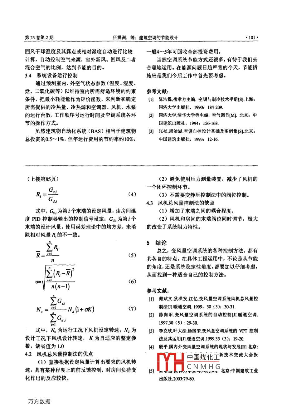 第23卷第2期制冷與空調(diào)Vol 23 No. 2200年4月Refrigeration and Air ConditioningApr200998~101文章編號:16716612(2009)0209804建筑空調(diào)的節(jié)能設(shè)計伍震洲1李小華2(1長沙市規(guī)劃設(shè)計院有限責任公司長沙4100012,湖南工程學院長沙411104【擴要】從建筑空調(diào)節(jié)能的角度出發(fā),在建筑構(gòu)造、空調(diào)系統(tǒng)設(shè)計及其自動控制等幾方面進行了一些有益的探討,同時提出了一些有效空調(diào)節(jié)能措施【關(guān)鍵詞】建筑;空調(diào)設(shè)計;自動控制:節(jié)能中圖分類號TU83文獻標識碼BThe Economical Design of Architectural Air Condition(1. Changsha Planning &Design Insititute Co, ctd, Changsha, 410000; 2. Hunan Engineer College, Changsha, 411104[Abstract] Effective economical measures have been put forward, based on the economy of architectural air condition intructure, designing system and automatic controL.( Keywords] architectural; design of air condition: automatic control; economical0引言建筑物體形應(yīng)避免狹長,細高和過多的凹凸,世界性的能源危機,對建筑業(yè)發(fā)展帶來了很大盡量避開東西朝向的影響。能源的合理利用和新能源的開發(fā)日益得到1.2窗的性能和外墻隔熱泛的重視。世界各地正投入大量的人力、物力、玻璃窗的主要目的是采光。玻璃的熱阻要比墻財力來研究節(jié)能建筑,也對建筑供暖、通風和空調(diào)體的熱阻小得多,故因傳熱而從玻璃窗損失的熱量的節(jié)能提出了更高的要求。為改善居住環(huán)境,公寓、也就大得多。一般統(tǒng)計可知,夏季通過玻璃窗的照別墅及外事用房等住宅區(qū)已開始采用集中空調(diào)但射得熱占制冷機最大負荷損0~30%,冬季單層玻高級住宅區(qū)、商辦樓、賓館等建筑區(qū)設(shè)中央空調(diào)將璃的熱損失約占鍋爐負荷的10~20%因而對玻璃越來越多。中央空調(diào)如何提高設(shè)備和系統(tǒng)的效能,窗采取一些措施是節(jié)能的有效途徑,主要措施是減建筑設(shè)計如何有效利用能源,是急需解決的問題。少窗墻的面積比(窗面積與外墻面積之比)。在兼本文從節(jié)能的角度就工程設(shè)計中應(yīng)加以考慮的問顧到室內(nèi)一定自然采光的條件下,盡量減少窗面積作如下的探討比,采用一些不開啟密閉窗框以減少滲透風;采用反射玻璃、吸熱玻璃及雙層玻璃加百葉遮陽簾。建筑節(jié)能適當增加墻體、屋頂?shù)谋嵝阅?減少通過這L1合理的建筑朝向和形狀些圍護結(jié)構(gòu)產(chǎn)生的冷熱負荷模擬研究表明,在滿足相同使用空間的前提13自然光的利用和照明控制下,建筑外表面積越小,空調(diào)負荷也就越小,所以采用一些局部照明、工作點照明,盡量利用自在建筑設(shè)計時應(yīng)盡可能采用外表面積較小的圓形然采光。燈具宜用熒光燈,并有自動開關(guān)裝置。這或方形建筑。些措中國煤化工一方面,也可以CNMHG作者簡介:伍震洲(1973-),男,工程師,長沙市規(guī)劃設(shè)計院有限責任公司收稿日期:200811-16第23卷第2期伍震洲,等:建筑空調(diào)的節(jié)能設(shè)計減少因照明發(fā)熱而引起的空調(diào)負荷起到減少輸送能耗的作用。另外,提高冷凍水供水溫度,也可以降低制冷機的功耗。通過自動控制2空調(diào)系統(tǒng)節(jié)能設(shè)計使露點溫度冬季保持最低值,夏季保持最高值21改變室內(nèi)設(shè)定參數(shù)由于每一個人對舒適感要求標準差別很大,故對民用空調(diào)可有一個范圍較寬的舒適區(qū)。在該舒適范圍內(nèi),夏季降溫時,取較高的干球溫度和相對濕度設(shè)定值。冬季采暖時,取較低的干球溫度和相對濕度的設(shè)定值,可以減少圍護結(jié)構(gòu)的傳熱負荷和新送風風負荷。實測表明,若夏季室溫設(shè)定值從26℃提高到28℃,冷負荷減少約21~23%。冬季室溫設(shè)定值從22℃降至20℃,熱負荷減少約26~31%,效果是明顯的。當然改變室內(nèi)設(shè)定參數(shù),是以不影響房間使用功能以及滿足服務(wù)對象的要求為前提。冷水22室外新風量控制圖1調(diào)節(jié)供回水比例在滿足衛(wèi)生、補償排風、稀釋有害氣體、保證室內(nèi)正壓等要求的前提下,根據(jù)室內(nèi)人員數(shù)量的變b防止再熱損失動及相應(yīng)新風量需求的變化,通過檢測二氧化碳的充分利用室內(nèi)回風的熱量來代替再熱量(如圖濃度,最佳控制室溫新風量,方法如下:在回風管2)。當室內(nèi)顯熱負荷減少時,可以調(diào)節(jié)一、二次道上設(shè)二氧化碳檢測器,根據(jù)二氧化碳氣體濃度自回風聯(lián)動閥門,改變一、二次回風比例。由于通過動調(diào)節(jié)新風閥門;監(jiān)視室內(nèi)人員情況,根據(jù)人數(shù)的噴水室風量變化而引起露點溫度的變化,因此根據(jù)變動,用手動方式預(yù)先把新風閥門開啟到一定的位、二次回風閥的調(diào)節(jié)范圍,有時整個夏季可以省置。使用自動控制二氧化碳濃度的方法,一般可節(jié)去再熱,過度季節(jié)可省去大部分再熱。若這時同時約30%左右的空調(diào)負荷調(diào)節(jié)噴水溫度,改變機器露點溫度,可以同時滿足23熱回收室內(nèi)熱濕變化。在建筑物空調(diào)負荷中,新風負荷的比例很大,變露點調(diào)節(jié)法,即可避免室內(nèi)溫度過冷過熱般占總負荷的20%~30%。利用熱交換器回收排也可以防止過度去濕中的能量,節(jié)約新風負荷是空調(diào)系統(tǒng)節(jié)能的一項有力措