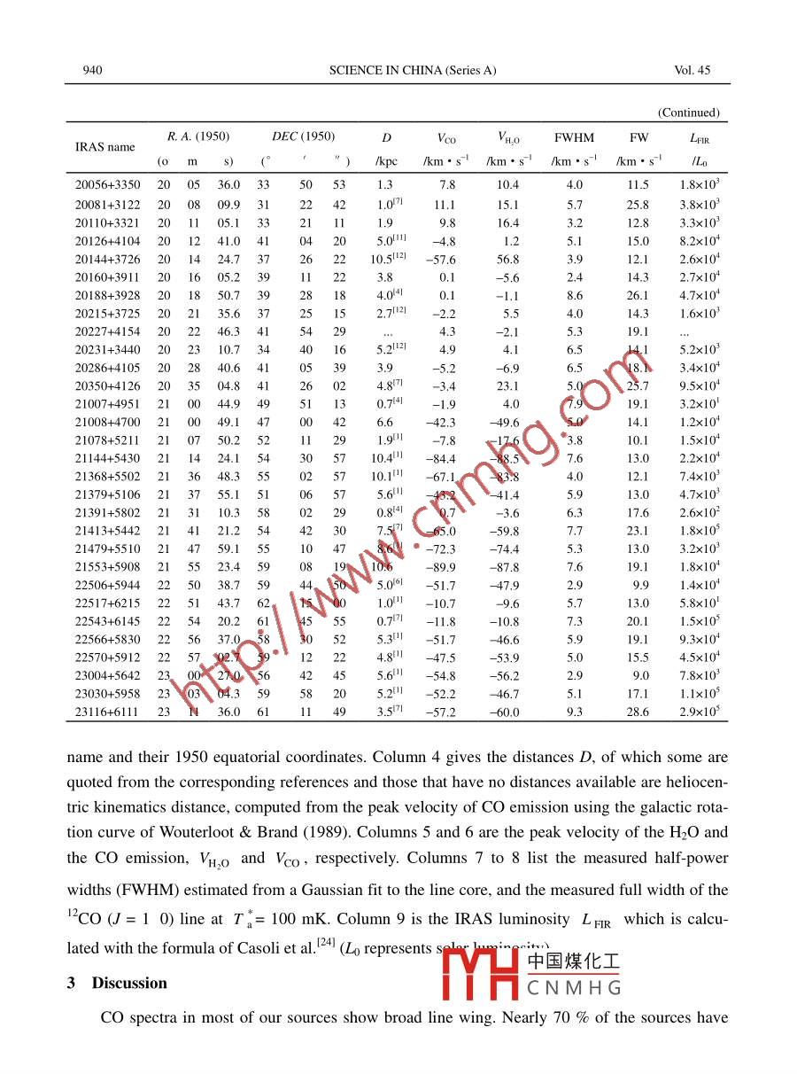 Vol. 45 No. 7SCIENCE IN CHINA(Series A)July 200ASTRONOMYHigh-velocity gas associated ultracompact Hl regionsⅫUYe(徐燁)2, JIANG Dongrong(蔣棟榮)2, YANG Chuanyi(楊傳義)°,ZHENG Xingwu(鄭興武)4, GU Minfeng(顧敏峰)2& PEI Chunchuan(裴春傳)1. Shanghai Astronomical Observatory, Chinese Academy of Sciences, Shanghai 200030, China;2. National Astronomical Observatories, Chinese Academy of Sciences, Beijing 100012, China3. Astronomy Department, Columbia University, New York, NY, 10027, US:4. Department of Astronomy, Nanjing University, Nanjing 210093, China;5. Purple Mountain Observatory, Nanjing 210008, ChinaCorrespondenceshouldbeaddressedtoXuYe(email:xy@center.shaoac.cn)Received August 6, 2001abstract We present the results of a survey for high-velocity 2co(1-0)emission associated H2Omasers and ultracompact(UC)Hll regions. The aim is to investigate the relationship between H2Omasers, Co high-velocity gas(HVG) and their associated infrared sources. Our sample satisfiesWood Churchwell criterion. Almost 70 % of the sources have full widths(FWs)greater than 15km.s at Ta=100 mk and 15% have FWs greater than 30 km.s. In most of our objects thereis excess high velocity emission in the beam. There is a clear correlation between CO line FWsand far-infrared luminosities: thecreases with the FIR luminosity. The relation suggests thatmore luminous sources are likely to be more energetic and able to inject more energy into theirsurroundings. As a result, larger FW of the Co line could be produced. In most of our sources, thevelocities of peak of the H2O emission are in agreement with those of the co cloud, but a numberof them have a large blueshift with respect to the Co peak. These masers might stem from theamplifications of a background source, which may amplify some unobservable weak masers to anobservable levelKeywords: HIl regions, ISM: jets and outflows, stars: formation, masersIt is now generally believed that during the earliest stages of evolution, most, if not all,starundergo a phase of very energetic mass ejection, frequently characterized by the occurrence ofmassive bipolar outflows of cold molecular gas. These outflows appear to be driven by strongstellar disk winds, whose other notable manifestations include rapidly moving Herbig-Haro(HH)objects, high-velocity water maser sources, shock-excited molecular hydrogen emission regionsand optically visible jets appearing to emanate directly from the immediate circumstellar environsof the young driving stars themselvesSome relationships between H2O masers, iraS obiects and outflow properties have beenfound!4,6,8,13-16 For instance. H,o luminosities correl中國(guó)煤化工 d thpeak velocity of the H2O are close to central velocityCNMHGSt of thples were associated with low and intermediate mass formation regions. This is partly becauselow-mass young stellar objects (YSOs) are far more abundant than high-mass ones and massive938SCIENCE IN CHINA (Series A)Vol 45star formation occurs in distant(> 500 pc), dense stellar clusters. So identification of the drivingsource is rather difficultShepherd Churchwell(hereafter SC) surveyed high velocity gas in 122 massive star for-mation regions and found that 90 of their samples were associated with high-velocity gas(fullwidth greater than 15 km.S), which are generally significantly higher than those toward lowmass outflow sources. At the same time, they also found that the full widths are also far less thanose seen inlow star formation regions" 7. Later, by mapping the co line toward a sample of 69luminous iras point sources, Zhang et al. found 90 %o of the sample to possess molecular outflows. This value is also far higher than those seen in low star formation regions 8Based on the far-infrared spectra of the known ultra-compact HIl regions, WoodChurchwell (hereafter wC criterion) evolved a two-color criterion that characterizes themg(F2m/F12m)>0.57 and lg(F6m/F12m)>1319In this paper, we produce a sample to further study the relationships betweeCO HVG and associated IRas objects. We choose a sample of H2O masers for high-velocitymolecular emission 20-22. The whole sample consists of 77 objects and all sources coincide withIRAS point sources. Our selection criteria are the following: (i) Colors satisfy WC criterion;(ii)8>-10ObservationThe observations of the J=1-0 transition of Co were made with the 13. 7 m telescope atthe Qinghai Station of Purple Mountain Observatory, United Radio Astronomy Laboratory of theChinese academy of Sciences, in March and December, 2000. This antenna is located in the gobidesert, a very dry and arid region 3200 m above sea level in western China. The beam size at thefrequency 115 GHz is 54. The pointing and tracing accuracy are better than 10". A cooled superonducting mixer and a FET IF-I were employed. Its double-side band system temperature islower than 250 K. The acoustic-optical spectrometer provides 1024 channels for a total bandwidth of 170 MHz. The frequency resolution is 255 kHz. The antenna efficiency is 45%050%depending on the elevation. The observations were made in position-Switching mode. The integration time is 4 minutes. The rms is about 0.20 K and the absolute calibration for flux density wasabout 202 Results and data reductionData reduction was performed using the Draspec package. In order to increase the signal-to-noise ratio, several spectra of the same source were added to lead the integration time to bemore than 8 minutes for every source. All data were spa中國(guó)煤化工way to a reso-lution of 108". After smoothing, the rms noise was reduCNMHGH,O maser sources and the observationaltabulated in table 1. The first three columns of table I present the corresponding IRAS sourceHIGH-VELOCITY GAS ASSOCIATED ULTRACOMPACT HII REGIONS939Table I Parameters of CO spectra and H2ODEC(1950)FWHMFWm/km·s00211+6542109.66549267.1112.12.7×1000260+5624002600.0563.6389-40.69.014×103-28.716.102232+6138022317.761385822148448.818.19.8×103259+310503255793105