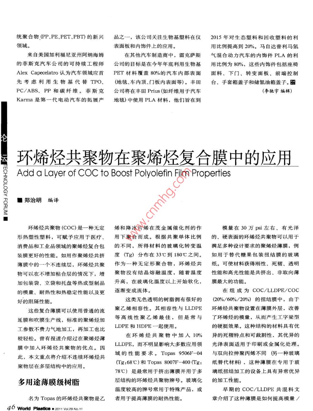 統(tǒng)聚合物,(PP、PE.PET.PBT)的新興品之一,該公司關(guān)注生物基塑料在儀2015年對(duì)生態(tài)塑料和回收塑料的利領(lǐng)域表面板和內(nèi)飾件上的應(yīng)用。用比例提高到20%。馬自達(dá)普利馬氫來自美國(guó)加利福尼亞州阿納海姆在其他汽車制造商中,雷克薩斯氣混合動(dòng)力汽車的內(nèi)飾件PLA的利的菲斯克汽車公司的可持續(xù)工程師公司的目標(biāo)是在今年年底利用生物基用比例為80%,這些內(nèi)飾件包括座椅Alex Capecelatro 認(rèn)為汽車領(lǐng)域應(yīng)首PET材料覆蓋80%的汽車內(nèi)部表面面料、下門、轉(zhuǎn)變面板、前端控制先考慮利用生物基代替TPO、(地毯、車內(nèi)頂.門板內(nèi)表面等)。豐田.臺(tái)、手套箱蓋子和儲(chǔ)氫油箱蓋子。函PC/ABS、PP 和碳纖維。菲斯克公 司將在豐田Prius (如纖維用于汽車(李馳宇編輯)Karma是第--代電動(dòng)汽車的拓展產(chǎn)地毯)中使用PLA材料,他們旨在到侖環(huán)烯烴共聚物在聚烯烴復(fù)合膜中的應(yīng)用Add a Layer of COC to Boost Polyolefin Film Properties馬■鄭治明編譯g環(huán)烯烴共聚物(COC)是一種無(wú)定烯和降冰片烯在茂金屬催化劑的作模量在30萬(wàn)psi左右、有光澤形熱塑性塑料,可賦予應(yīng)用于醫(yī)療、用下聚合而成。根據(jù)共聚單體比例的、硬表面的環(huán)烯烴共聚物可以用于消費(fèi)品和工業(yè)品領(lǐng)域的聚烯烴復(fù)合包的不同,所得材料的玻璃化轉(zhuǎn)變溫滿足多種設(shè)計(jì)要求的聚烯烴薄膜,例裝膜更好的性能。如用作聚烯烴共擠度(Tg) 分布在33C到180C之間。如用于替代糖果包裝扭結(jié)膜的玻璃薄膜中的一個(gè)不連續(xù)層,環(huán)烯烴共聚作為一種無(wú)定形聚合物,環(huán)烯烴共.紙??墒共牧汐@得剛性、死褶、透明物可以在不增加粘合層的情況下,增聚物沒有結(jié)晶熔融溫度,隨著溫度性能和高光性能是共擠出、非取向薄加包裝袋、立袋和托盤等熱成型制品升高,在玻璃化溫度以上開始軟化,膜最大的功能。的模量、耐熱性和熱穩(wěn)定性能以及更逐漸變成流體。在組成為COC/LLDPE/COC好的阻隔性能。這類無(wú)色透明的樹脂擁有很好的(20%/60%/20%)的扭結(jié)膜中,由于這些復(fù)合薄膜可以使用普通的流聚乙烯相容性。其相容性與LLDPE環(huán)烯烴共 聚物設(shè)置在薄膜外層,改善延膜和吹膜生產(chǎn)線,標(biāo)準(zhǔn)的聚烯烴加等高線性聚乙烯最佳,但是常與了環(huán)烯烴的模量,從而產(chǎn)生工字梁型工參數(shù)不費(fèi)力氣地加工,再加工也比LDPE和HDPE一起使用。的硬挺效果。這種結(jié)構(gòu)的材料具有優(yōu)較輕松。曾有報(bào)道介紹過在聚烯烴薄在環(huán)烯烴共聚物中加人10%異的死褶特點(diǎn)和可裁割性,其優(yōu)異的膜中加入環(huán)烯烴共聚物的優(yōu)點(diǎn)。因LLDPE,而不明顯影響大多數(shù)應(yīng)用領(lǐng)光澤表面適用于印刷或金屬化處理。域的性能要求。Topas 9506F-04與雙向拉伸聚丙烯不同(另- -種玻璃此,本文重點(diǎn)將介紹不連續(xù)環(huán)烯烴共(Tg:68C)和Topas 8007F-400 (Tg:紙?zhí)娲牧?,這種薄膜在專用于玻聚物層在多層結(jié)構(gòu)中的應(yīng)用。78C)是最常用于擠出薄膜并用于多璃紙扭結(jié)加工的設(shè)備.上具有異常優(yōu)異多用途薄膜級(jí)樹脂層結(jié)構(gòu)的環(huán)烯烴共聚物牌號(hào)。玻璃化的加工性能。溫度較高的牌號(hào)常用于特殊產(chǎn)品,或早期的COC/LLDPE共混料文名為Topas的環(huán)烯烴共聚物是乙者用于提高薄膜的耐熱性能。章介紹了這種薄膜是如何提高模量/46 World Plastice ■2011 Vol29No.11剛性和熱成型均勻性。取得的成果是在此也順便介紹一- 下,環(huán)烯烴共模頭和螺旋式吹膜模頭即可。擠出機(jī)實(shí)現(xiàn)了用更薄的薄膜生產(chǎn)出更好的熱聚物還是其它非聚烯烴材料的良好共螺桿推薦轉(zhuǎn)速至少為50 rpm。如果成型產(chǎn)品。最近的研究表明使用環(huán)烯擠出組成材料。與PETG層相結(jié)合的為了滿足輸出量的要求必須使用較低烴共聚物的不連續(xù)層獲得所有相同的環(huán)烯烴共聚物層(需要粘合層)能加工速度,那么使用較密的過濾網(wǎng)板,產(chǎn)優(yōu)勢(shì),甚至效率更高,例如含有15%出一種醫(yī)療及其它應(yīng)用領(lǐng)城用的深拉生較高的擠出機(jī)出料壓力(>2000不連續(xù)層環(huán)烯烴共聚物的薄膜性能超型阻隔性托盤所需要的高透明薄膜。psi)來加強(qiáng)混合。過了含有20%環(huán)烯烴共聚物的單層共聚三氟氯乙烯(PCTFE)等其它高潮一般情況下,典型的擠出溫度設(shè)混薄膜。濕阻隔性薄膜在深拉型應(yīng)用領(lǐng)域中表置根據(jù)環(huán)烯烴共聚物的玻璃化轉(zhuǎn)變溫在一個(gè)相當(dāng)?shù)膬r(jià)格基礎(chǔ)上,與同現(xiàn)不佳,而且鹵化聚合物需要特殊的度而定。最常見的情況是,設(shè)定在玻類的EVA/離聚物共擠出薄膜相比,加工條件和環(huán)境條件。璃化溫度以上130C到150C之間。COC/LLDPE多層薄膜擁有更好的成環(huán)烯烴共聚物作為無(wú)定形聚合對(duì)于加料口設(shè)置進(jìn)料槽的擠出機(jī)進(jìn)行型能力、光學(xué)性能、韌性和耐穿刺性物,擁有固有的高收縮潛力和低收縮大量進(jìn)料(歐洲地區(qū)常用),那么對(duì)于能。環(huán)烯烴共聚物/線性低密度聚乙力。優(yōu)異的光學(xué)性能、可定制的收縮擠出環(huán)烯烴共