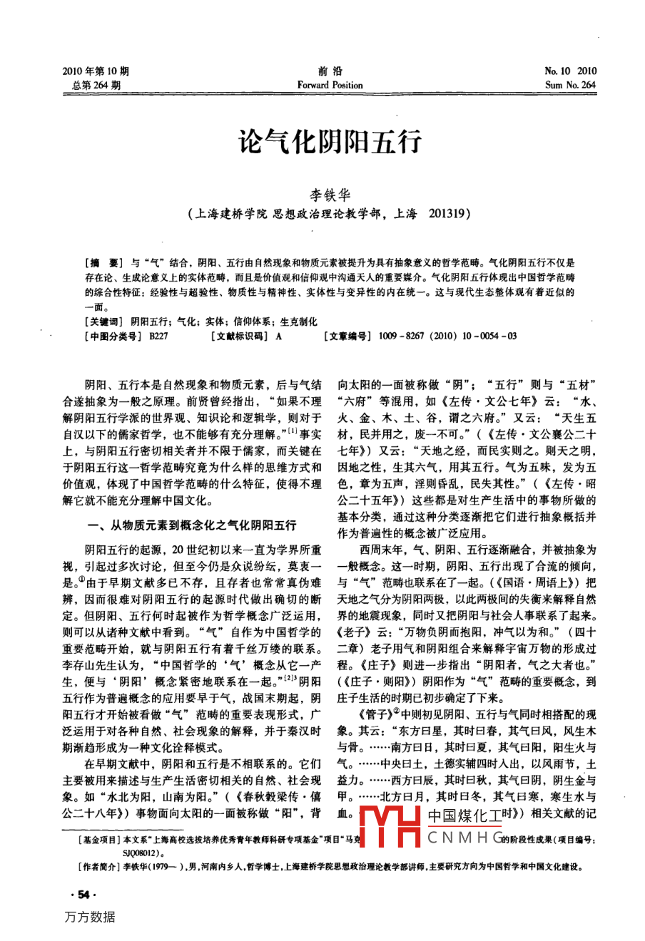 2010年第10期前沿No.102010總第264期Forward positionum No 264論氣化陰陽五行李鐵華(上海建橋學院思想政治理論教學部,上海201319)[摘要]與“氣”結合,陰陽、五行由自然現象和物質元素被提升為具有抽象意義的哲學范疇。氣化陰陽五行不僅是存在論、生成論意義上的實體范疇,而且是價值觀和信仰觀中溝通天人的重要媒介。氣化陰陽五行體現出中國哲學范疇的綜合性特征:經驗性與超驗性、物質性與精神性、實體性與變異性的內在統(tǒng)一。這與現代生態(tài)整體觀有著近似的[關鍵詞]陰陽五行;氣化;實體;信仰體系;生克制化中圖分類號]B227[文獻標識碼]A[文章編號]1009-8267(2010)10-0054-03陰陽、五行本是自然現象和物質元素,后與氣結向太陽的一面被稱做“陰”;“五行”則與“五材合遂抽象為一般之原理。前賢曾經指出,“如果不理“六府”等混用,如《左傳·文公七年》云:“水、解陰陽五行學派的世界觀、知識論和邏輯學,則對于火、金、木、土、谷,謂之六府?!庇衷?“天生五自漢以下的儒家哲學,也不能夠有充分理解?!笔聦嵅?民并用之,廢一不可?!?《左傳·文公襄公二十上,與陰陽五行密切相關者并不限于儒家,而關鍵在七年》)又云:“天地之經,而民實則之。則天之明于陰陽五行這一哲學范疇究竟為什么樣的思維方式和因地之性,生其六氣,用其五行。氣為五味,發(fā)為五價值觀,體現了中國哲學范疇的什么特征,使得不理色,章為五聲,淫則昏亂,民失其性?!?《左傳·昭解它就不能充分理解中國文化公二十五年》)這些都是對生產生活中的事物所做的、從物質元素到概念化之氣化陰陽五行基本分類,通過這種分類逐漸把它們進行抽象概括并作為普遍性的概念被廣泛應用。陰陽五行的起源,20世紀初以來一直為學界所西周末年,氣、陰陽、五行逐漸融合,并被抽象為視,引起過多次討論,但至今仍是眾說紛紜,莫衷一一般概念。這一時期,陰陽、五行出現了合流的傾向,是。由于早期文獻多已不存,且存者也常常真?zhèn)坞y與“氣”范疇也聯(lián)系在了一起。(《國語·周語上》)把辨,因而很難對陰陽五行的起源時代做出確切的斷天地之氣分為陰陽兩極,以此兩極間的失衡來解釋自然定。但陰陽、五行何時起被作為哲學概念廣泛運用,界的地震現象,同時又把陰陽與社會人事聯(lián)系了起來。則可以從諸種文獻中看到?!皻狻弊宰鳛橹袊軐W的《老子》云:“萬物負陰而抱陽,沖氣以為和?!?四十重要范疇開始,就與陰陽五行有著千絲萬縷的聯(lián)系。二章)老子用氣和陰陽組合來解釋宇宙萬物的形成過李存山先生認為,“中國哲學的‘氣’概念從它一產程?!肚f子》則進一步指出“陰陽者,氣之大者也生,便與“陰陽’概念緊密地聯(lián)系在一起?!?)陰陽(《莊子·則陽》)陰陽作為“氣”范疇的重要概念,到五行作為普遍概念的應用要早于氣,戰(zhàn)國末期起,陰莊子生活的時期已初步確定了下來。陽五行才開始被看做“氣”范疇的重要表現形式,廣《管子)》中則初見陰陽、五行與氣同時相搭配的現泛運用于對各種自然、社會現象的解釋,并于秦漢時象。其云:“東方日星,其時曰春,其氣曰風,風生木期漸趨形成為一種文化詮釋模式與骨?!戏皆蝗?其時曰夏,其氣曰陽,陽生火與在早期文獻中,陰陽和五行是不相聯(lián)系的。它們氣?!醒朐煌?土德實輔四時入出,以風雨節(jié),土主要被用來描述與生產生活密切相關的自然、社會現益力?!鞣皆怀?其時曰秋,其氣曰陰,陰生金與象。如“水北為陽,山南為陽春秋穀梁傳·僖甲?!狈饺赵?其時日冬,其氣曰寒,寒生水與公二十八年》)事物面向太陽的一面被稱做“陽”,背血。中國煤化工時》)相關文獻的記[基金項目]本文系“上海高校選拔培養(yǎng)優(yōu)秀青年教師科研專項基金”項目“馬CNMHG的階段性成果(項目編號SJQo8012)[作者簡介]李鐵華(1979—),男河南內鄉(xiāng)人哲學博士,上海建橋學院思想政治理論教學部講師主要研究方向為中國哲學和中國文化建設載表明,春秋戰(zhàn)國時期,道家已經開始把陰陽作為為言化也,陽氣用事,萬物變化也。金在西方。西方“氣”的具體范疇來理解??梢钥隙ǖ氖?從《管子》者,陰始起,萬物禁止。金之為言禁也。土在中央開始,古人已經試圖把氣與陰陽、五行融合到一起來解者,主吐含萬物。土之為言吐也?!?《白虎通義·封釋各種自然社會現象。這樣陰陽、五行就由早期單純的公侯》)此種認識被后來的正史《五行志》延用。蕭生產經驗中的物質歸類式的現象描述,漸趨轉化成為具吉《五行大義·序》亦云:“萬有森羅,以五為度有抽象意義的哲學概念,并與具有動態(tài)性和媒介性的過其五者,數則變焉。實資五氣,均和四序,孕育百“氣”范疇聯(lián)系了起來。這就為陰陽五行的結合、溝通品,陶鑄萬物?!焙髞?宋明理學家則進行了更系統(tǒng)創(chuàng)造了條件,也使得陰陽五行以普遍概念和原理的形式化的整合,如朱熹云:“數只是算氣之節(jié)候。大率只為人們廣泛接受成為可能。是一個氣。陰陽播而為五行,五行中各有陰陽?!崩畲嫔较壬赋?“戰(zhàn)國時期,陰陽五行家明確(《朱子語類·理氣上》)因而,組成萬物的單純物質提出‘五行’是‘氣’之所生,五行’失去了原有的或五種元素的“五行”,在與陰陽思想的交流過程中形質而成為‘五行之氣’,這說明早期的五行學說被容成了使人事和自然發(fā)生變動的力